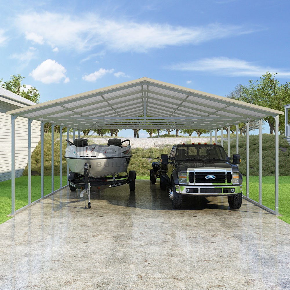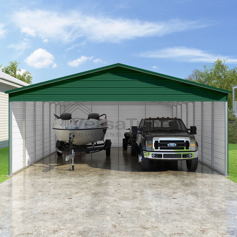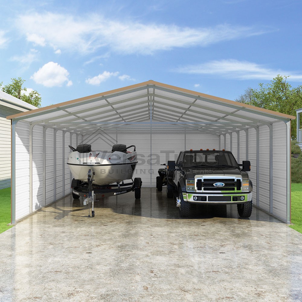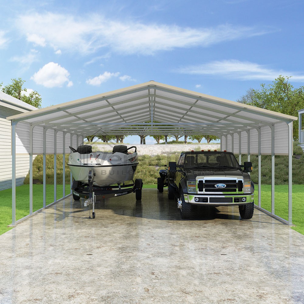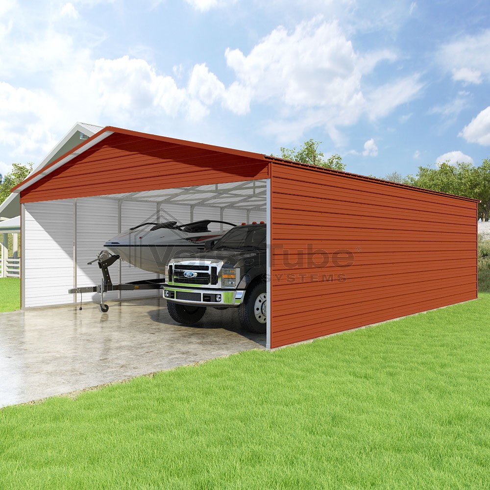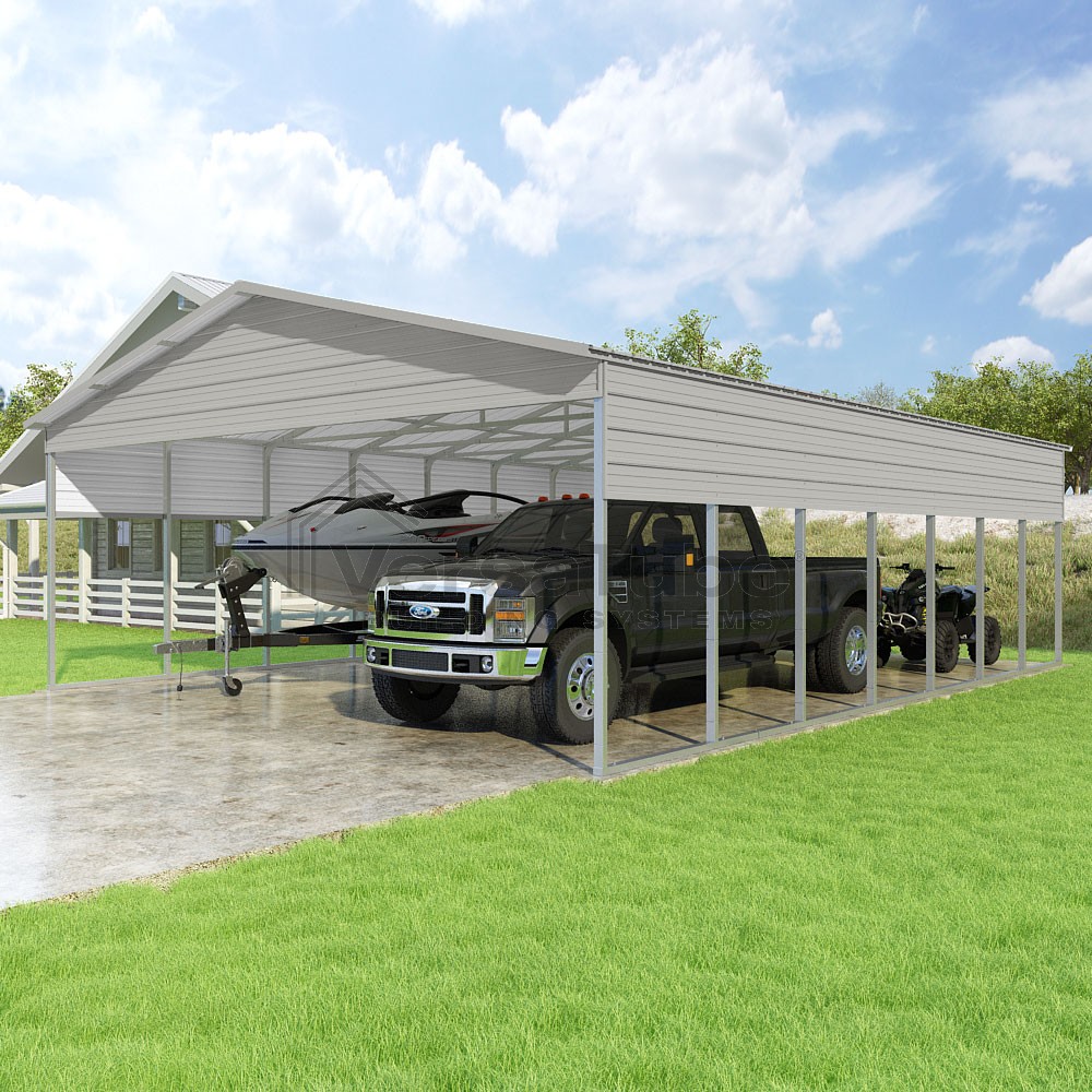 Pinnacle Series DIY carport kit features vertical sheet metal roof panels with ridge cap, gable and eave trim for an A-frame roof style and extended coverage on both ends.