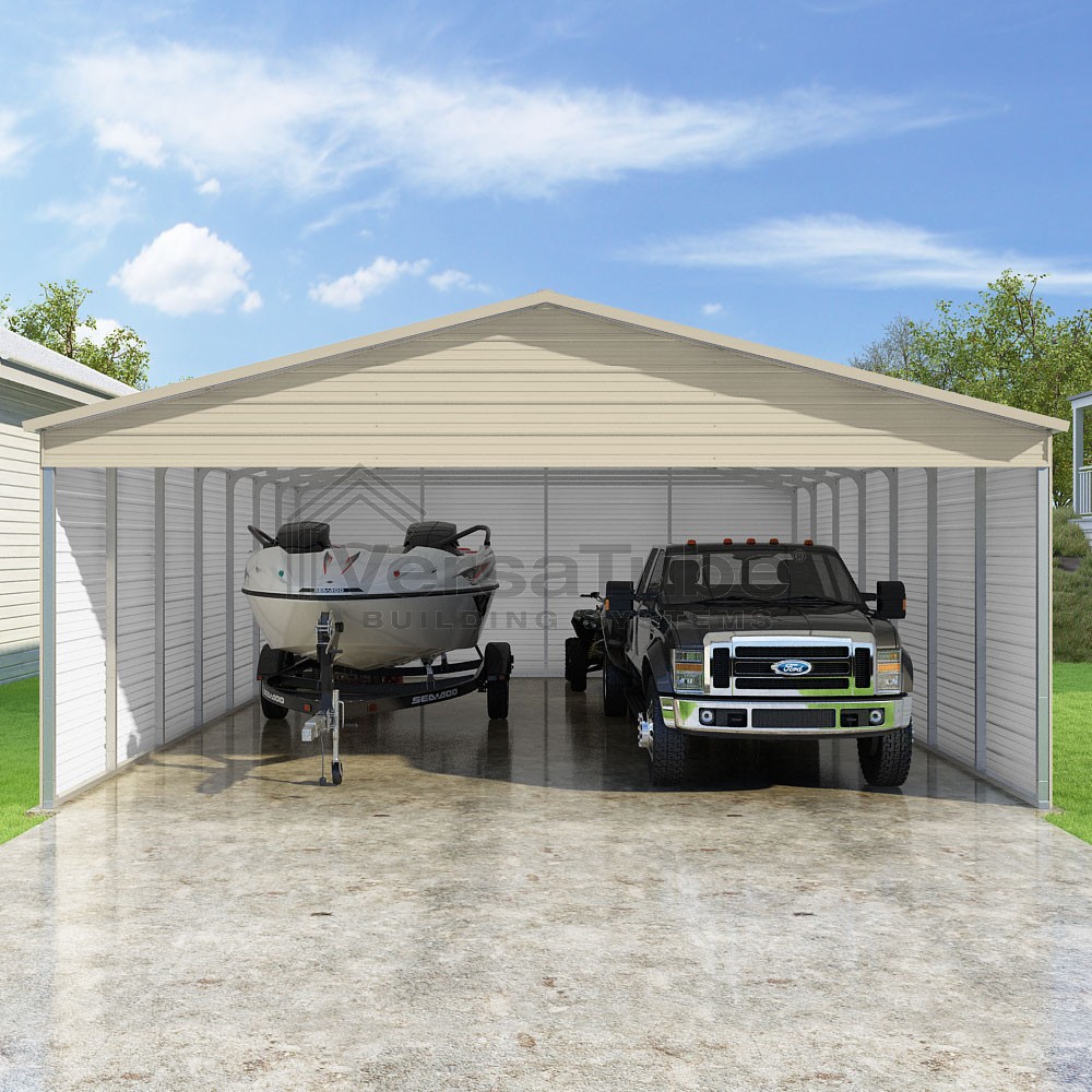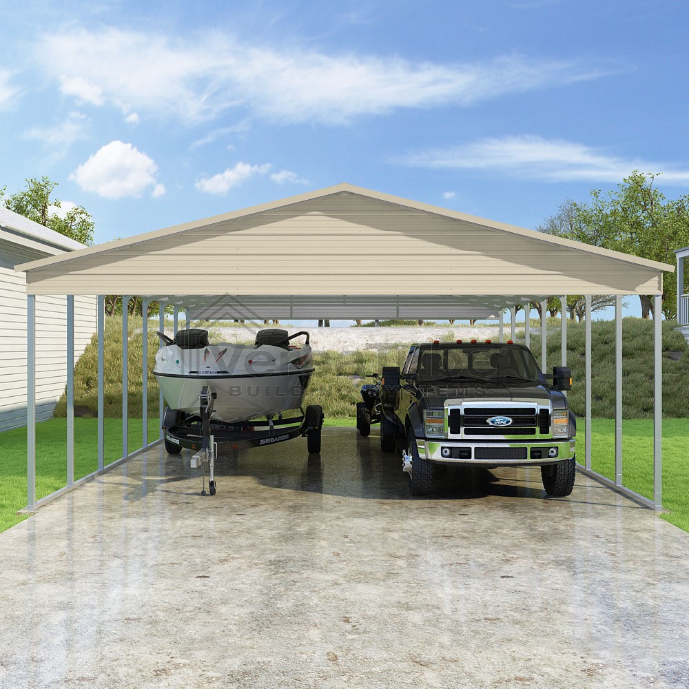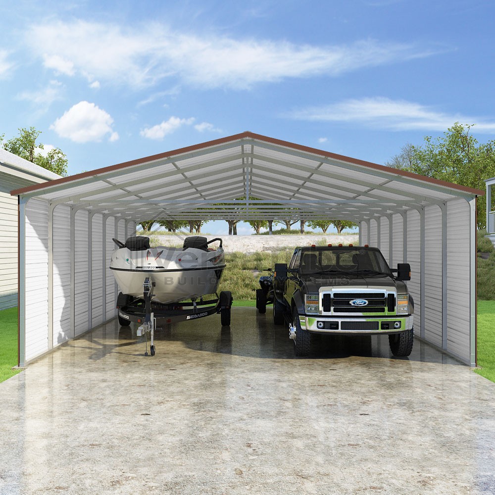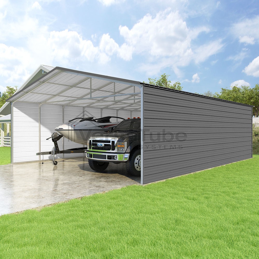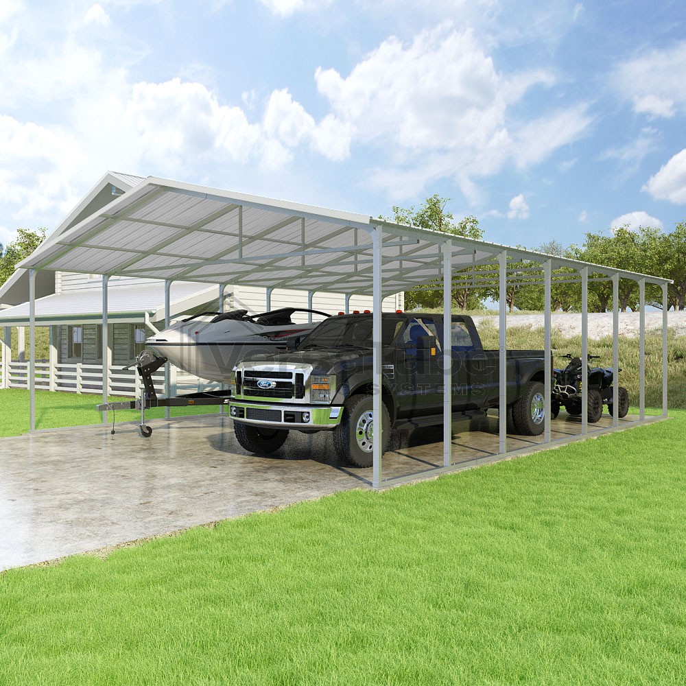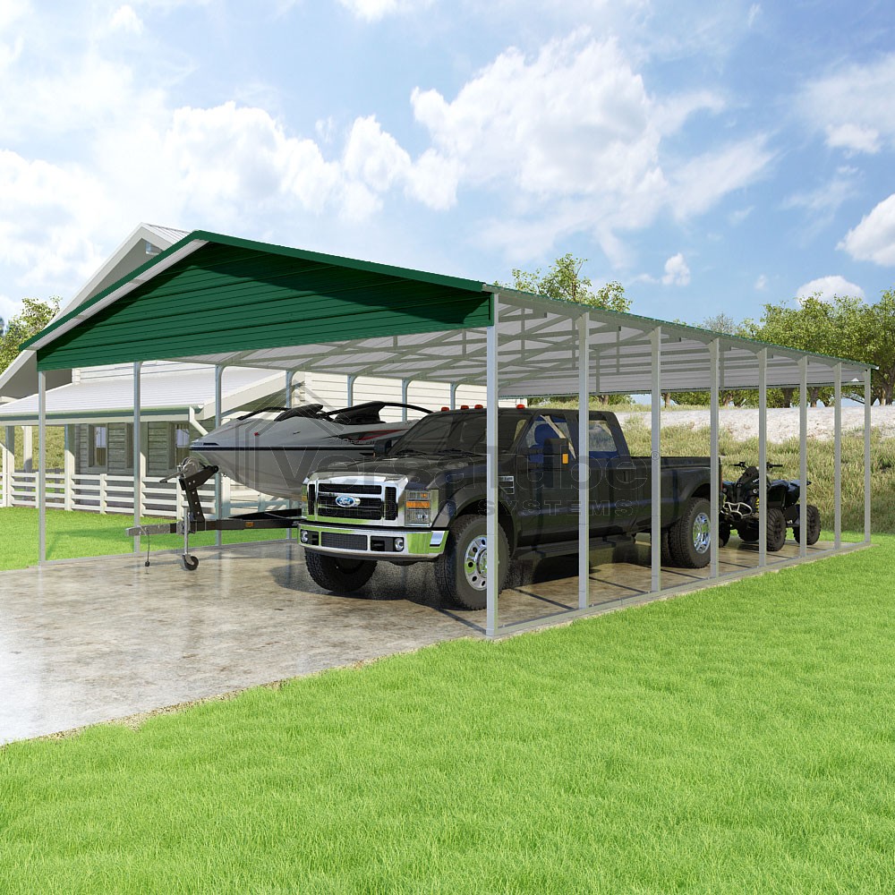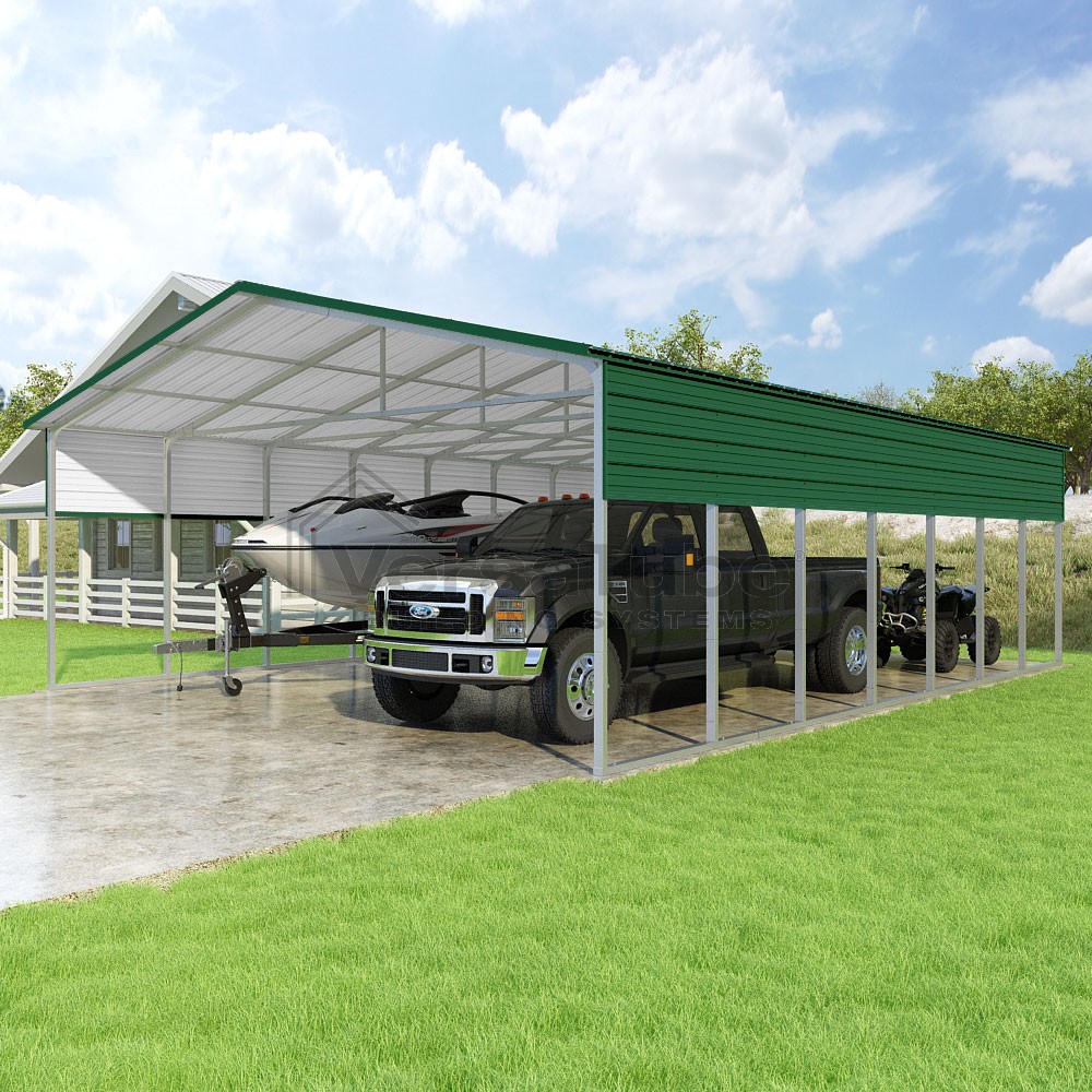 Pinnacle Series DIY carport kit features vertical sheet metal roof panels with ridge cap, gable and eave trim for an A-frame roof style and extended coverage on both ends.