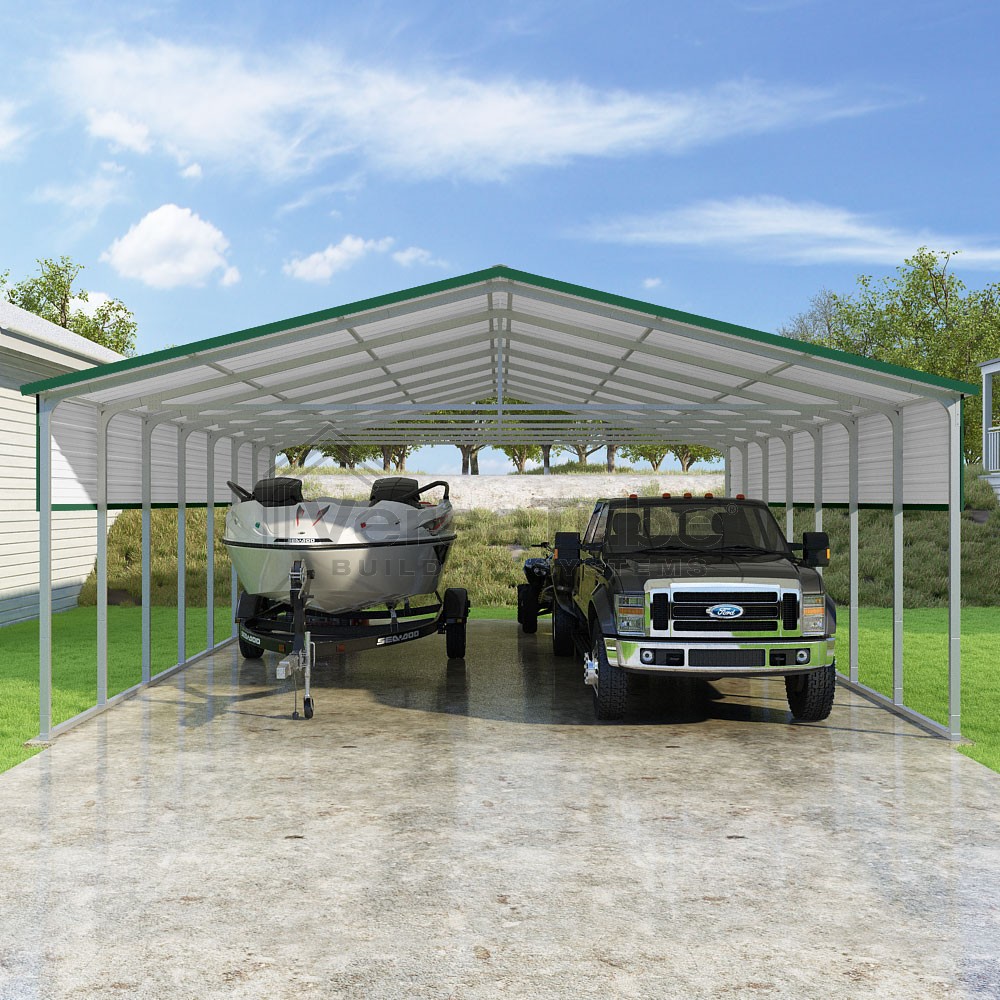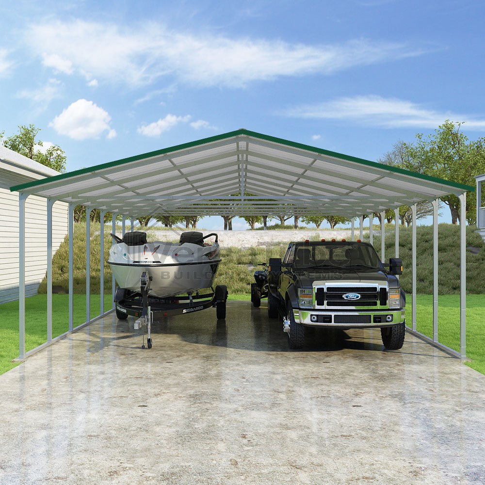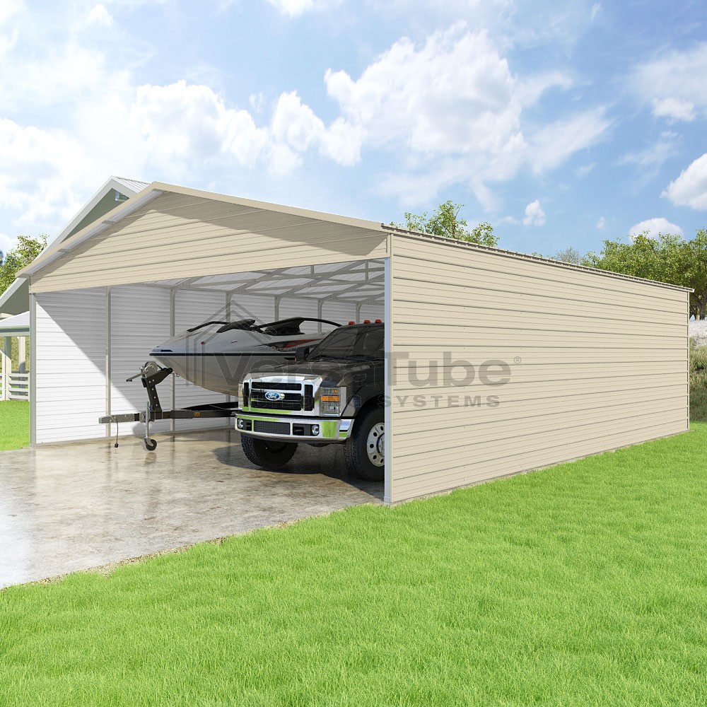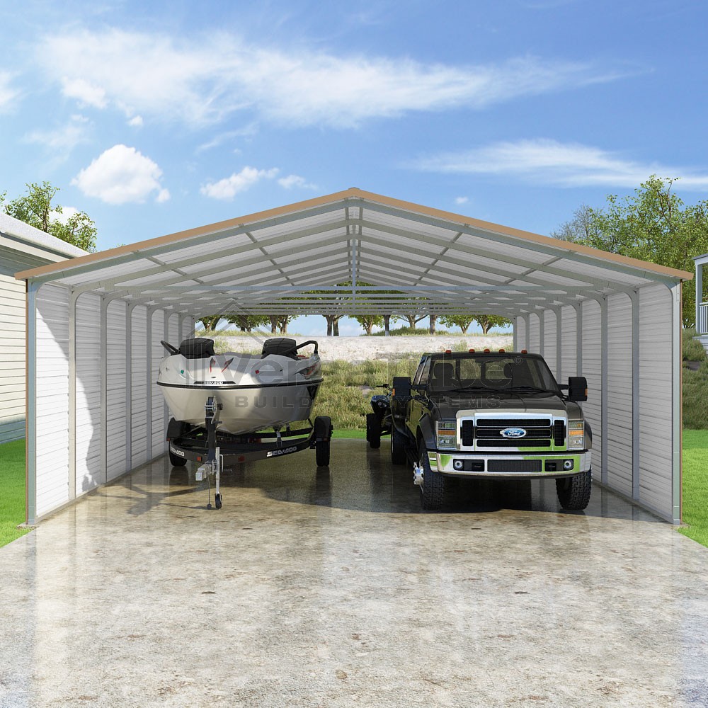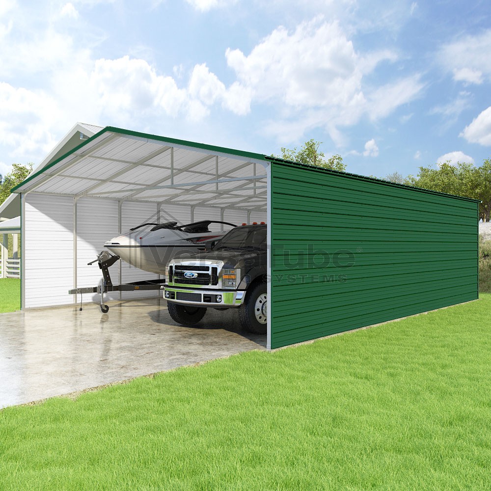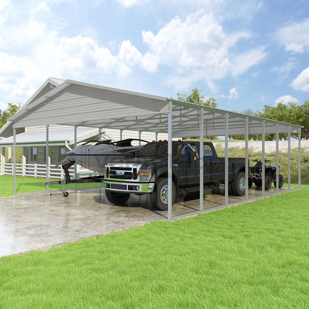 Pinnacle Series DIY carport kit features vertical sheet metal roof panels with ridge cap, gable and eave trim for an A-frame roof style and extended coverage on both ends.