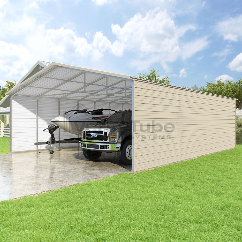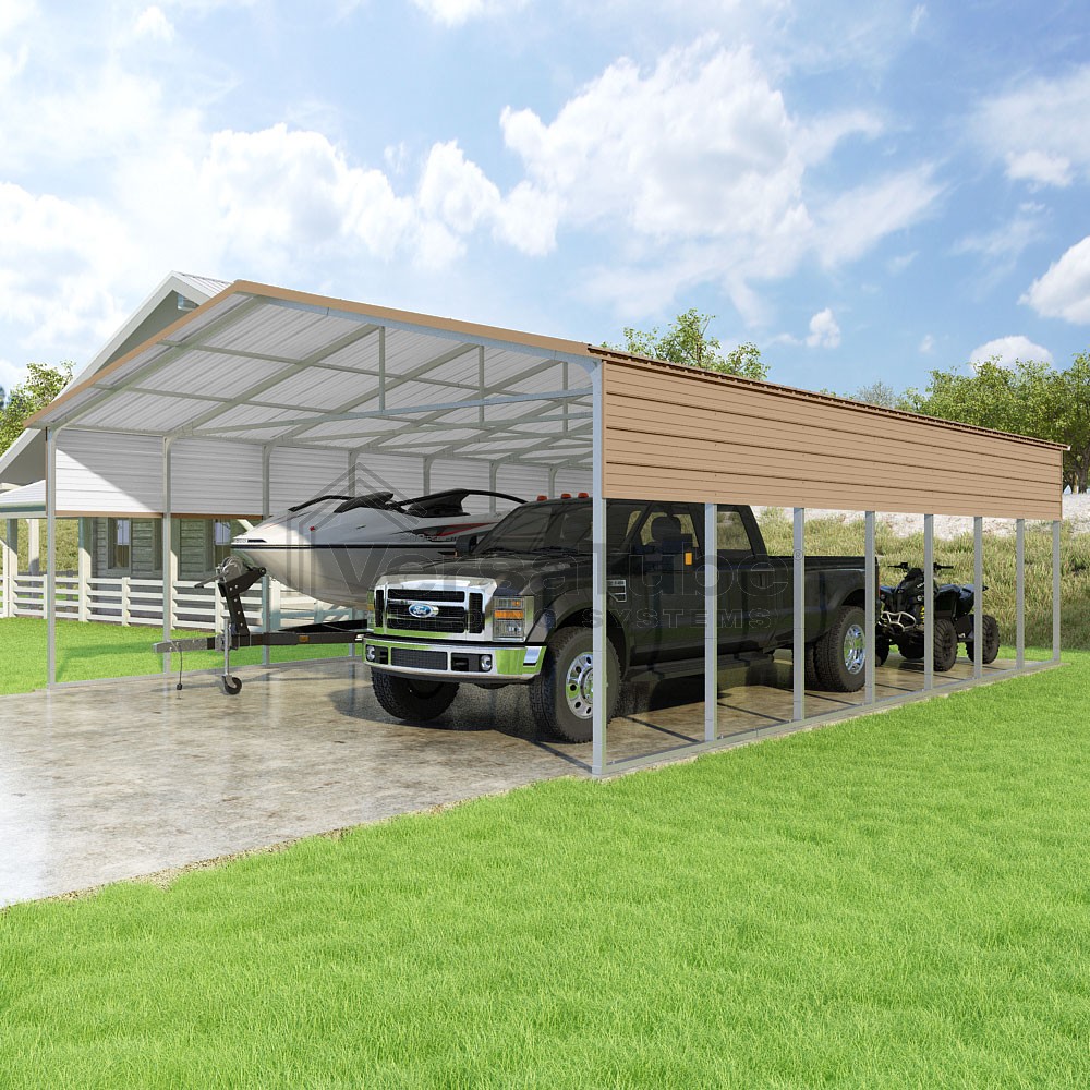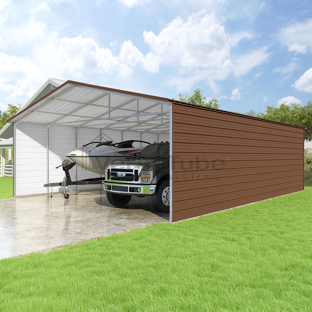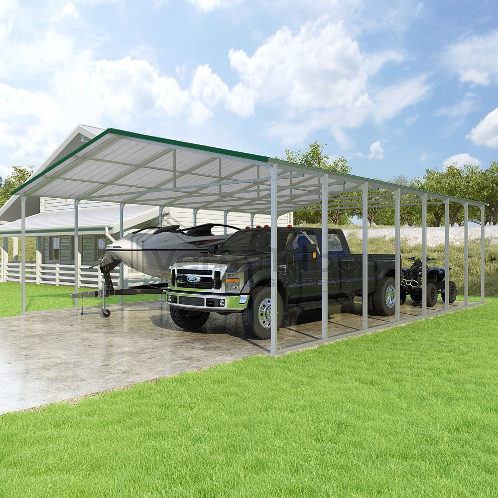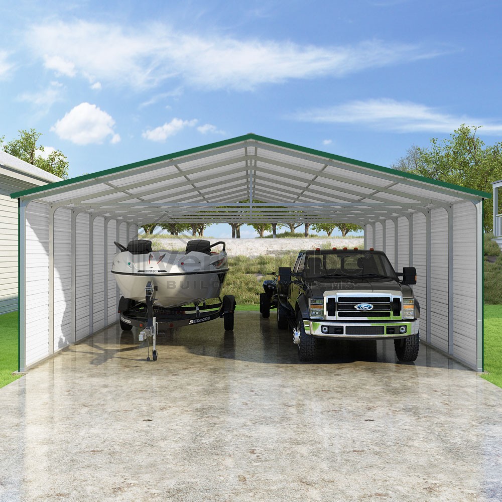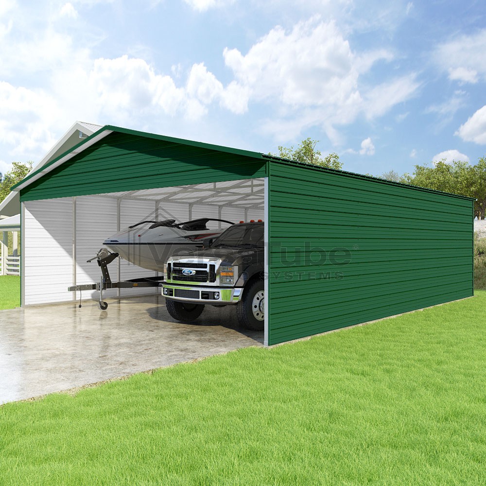 Pinnacle Series DIY carport kit features vertical sheet metal roof panels with ridge cap, gable and eave trim for an A-frame roof style and extended coverage on both ends.