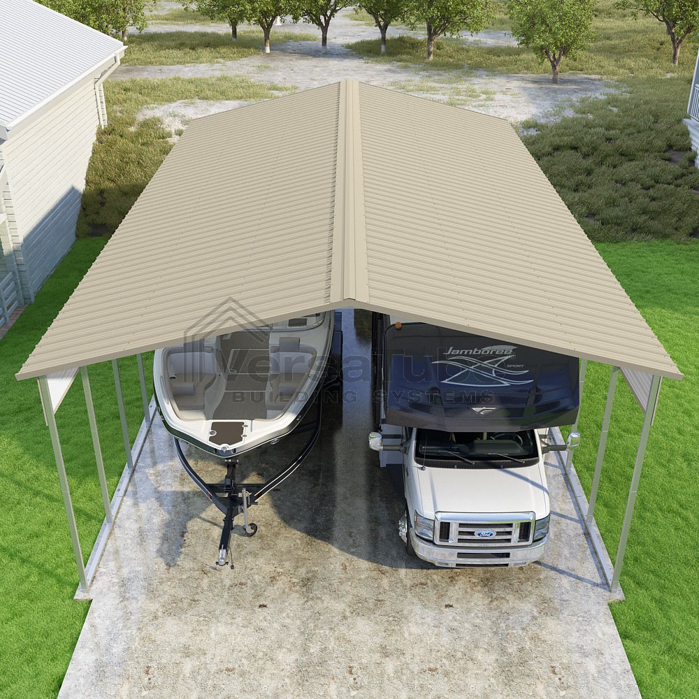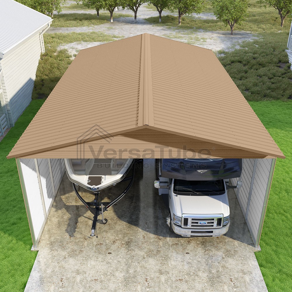 Pinnacle Series DIY carport kit features vertical sheet metal roof panels with ridge cap, gable and eave trim for an A-frame roof style and extended coverage on both ends.