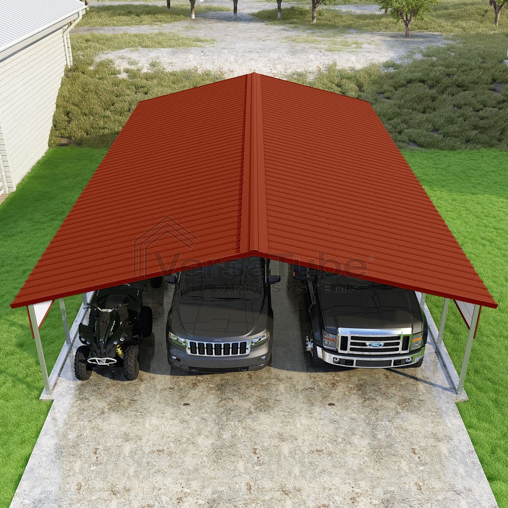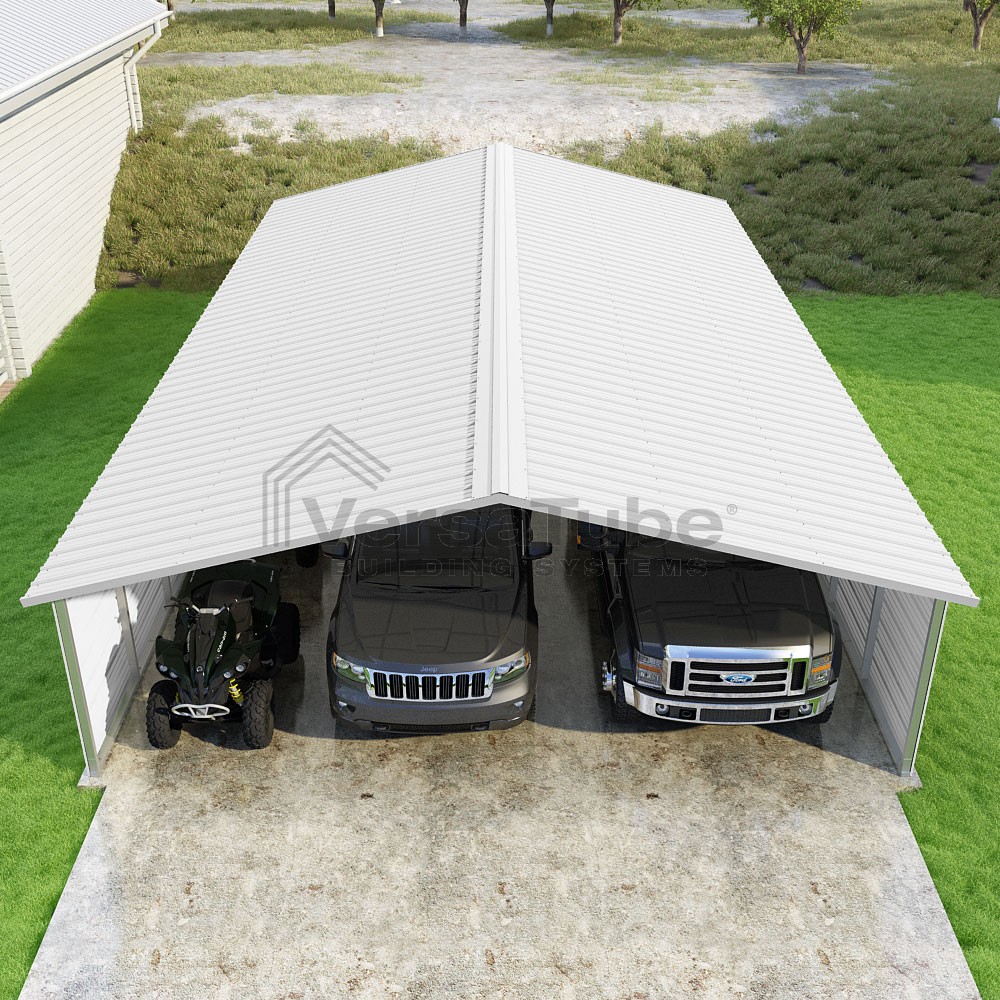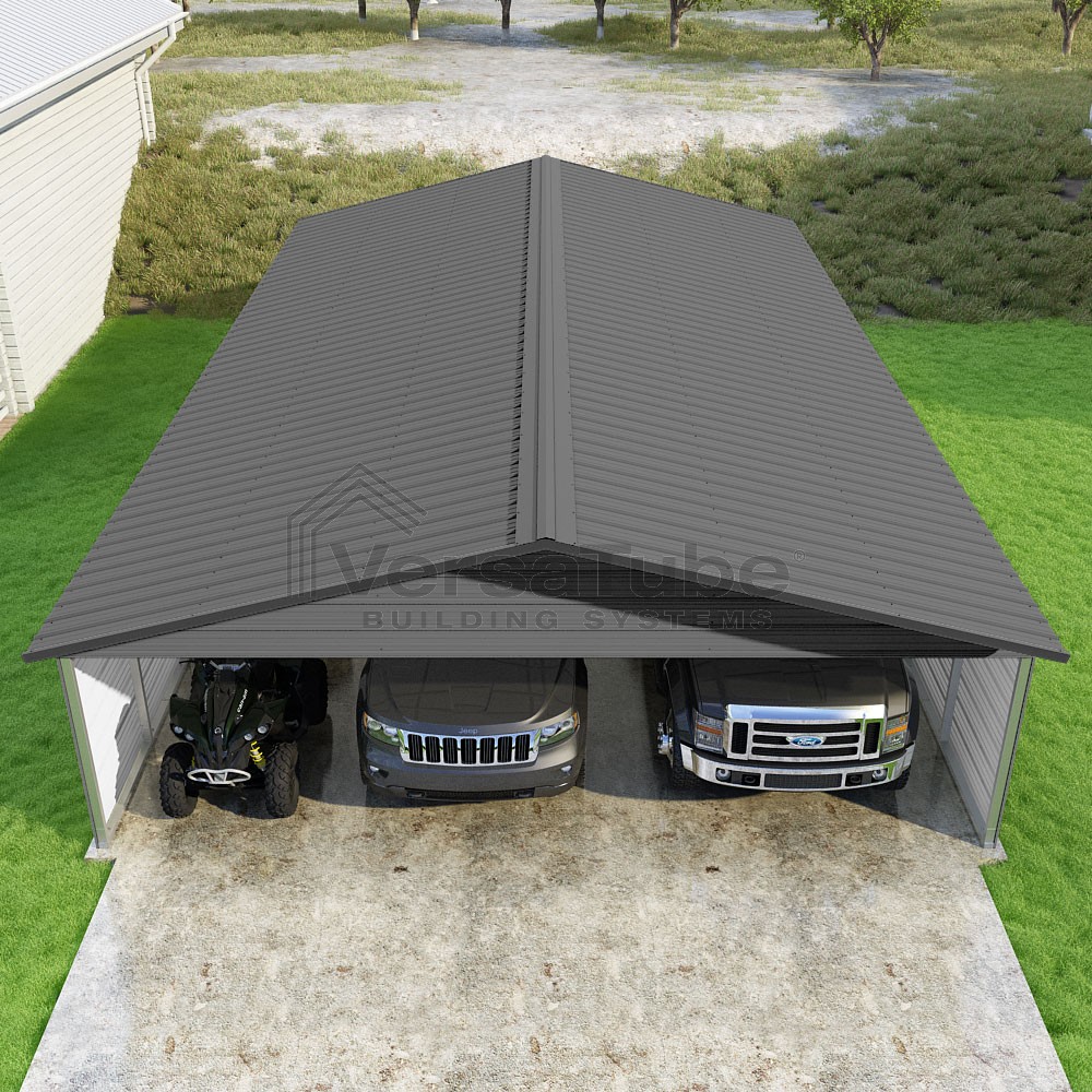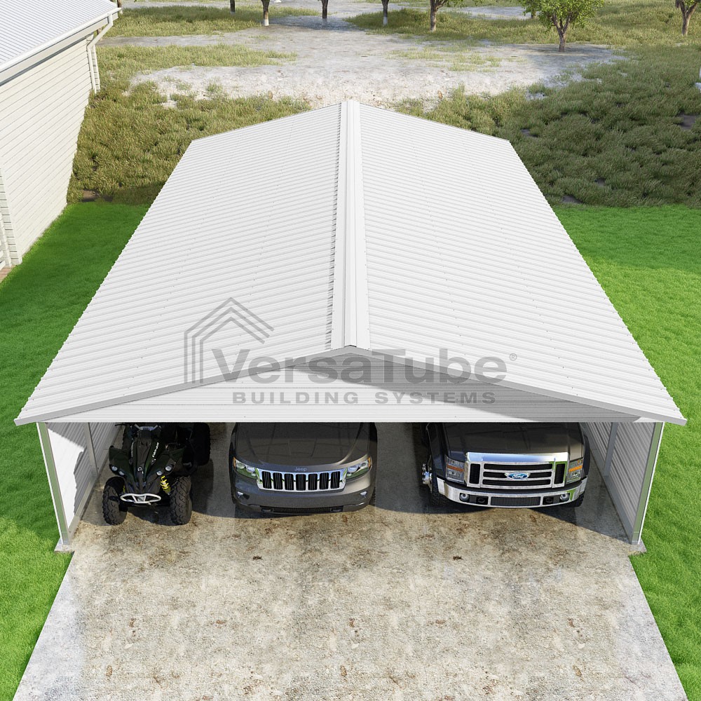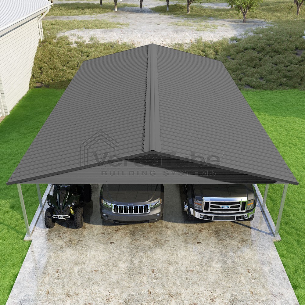 Pinnacle Series DIY carport kit features vertical sheet metal roof panels with ridge cap, gable and eave trim for an A-frame roof style and extended coverage on both ends.
