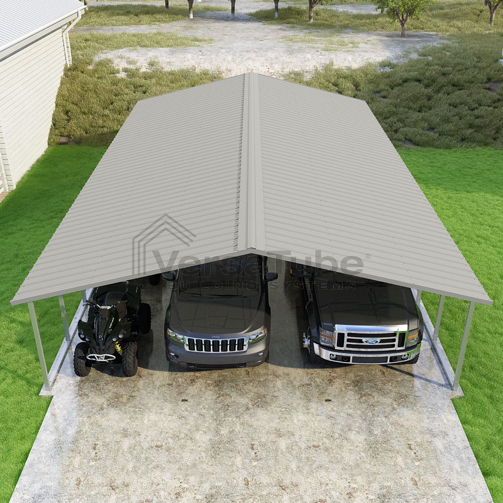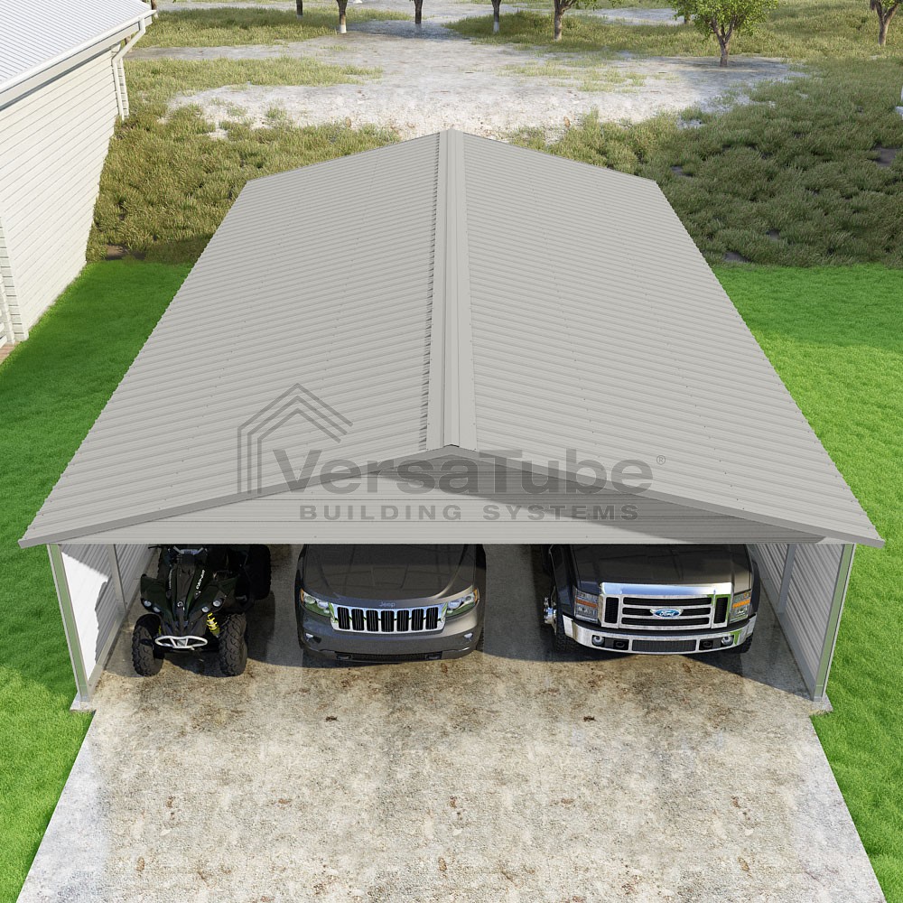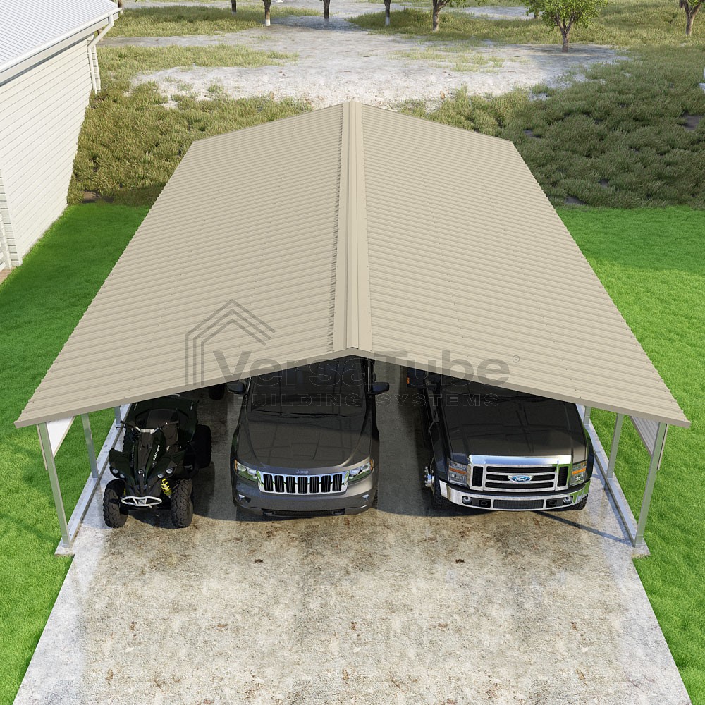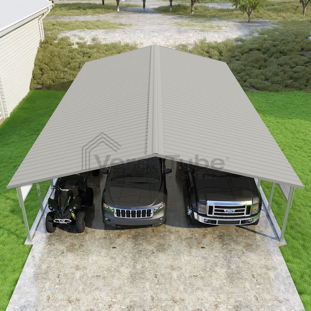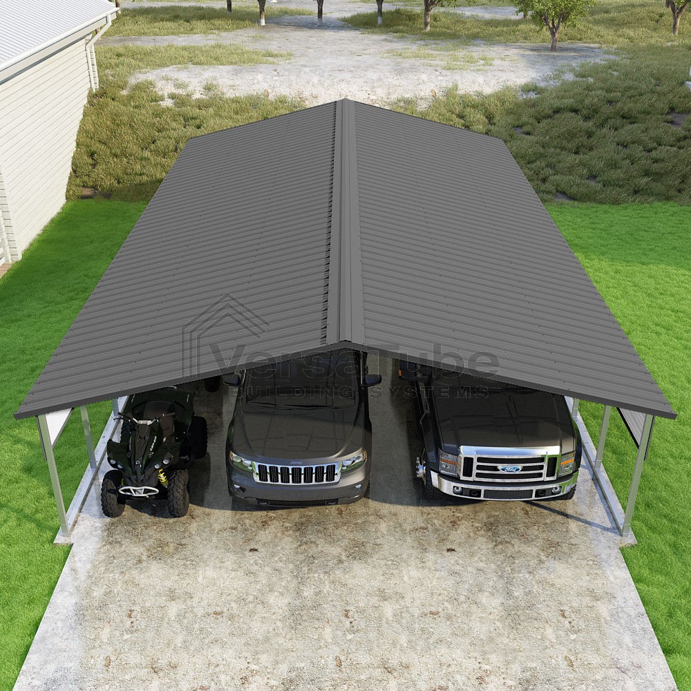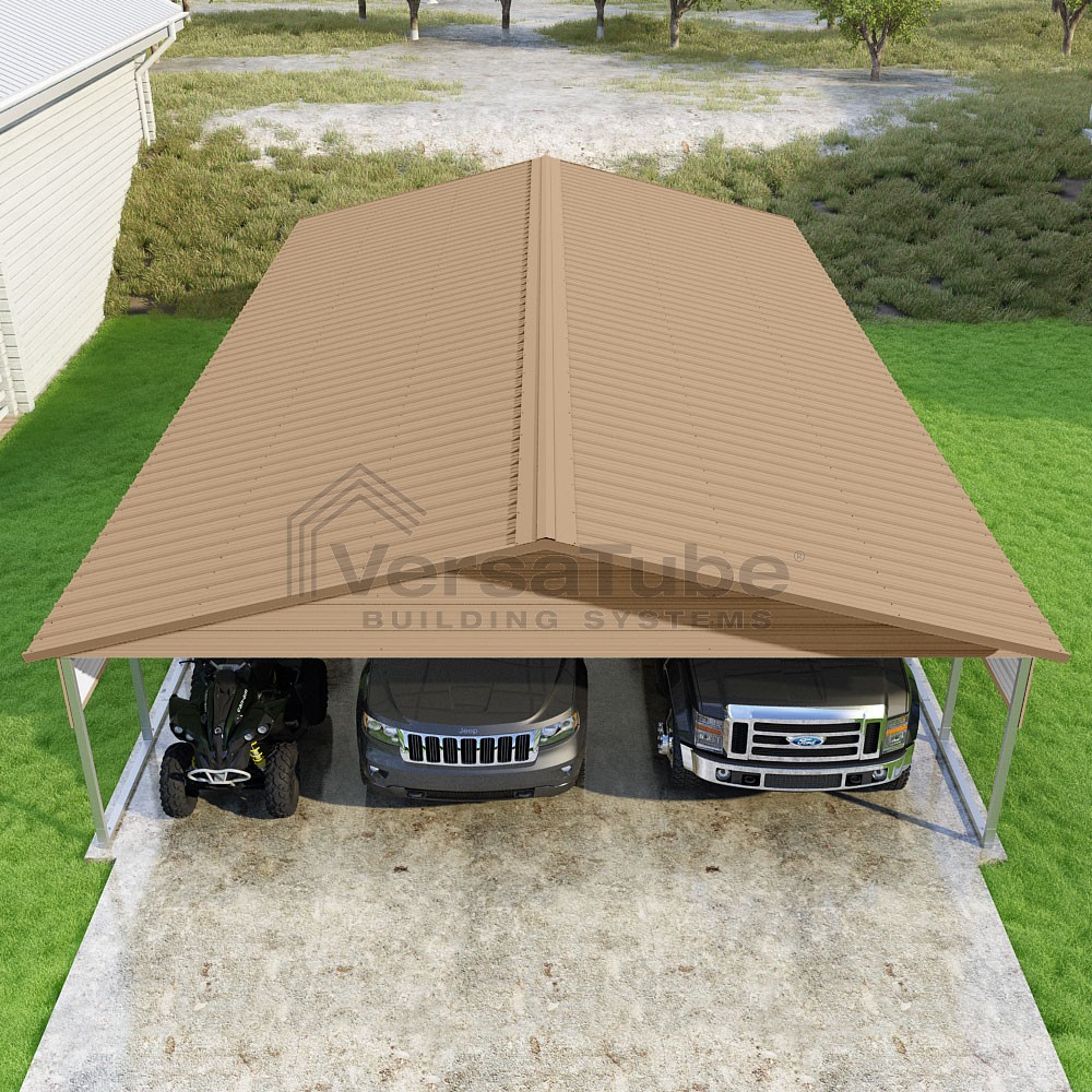 Pinnacle Series DIY carport kit features vertical sheet metal roof panels with ridge cap, gable and eave trim for an A-frame roof style and extended coverage on both ends.