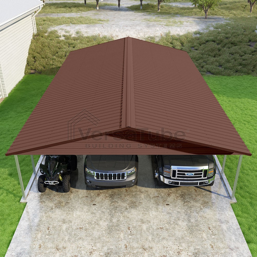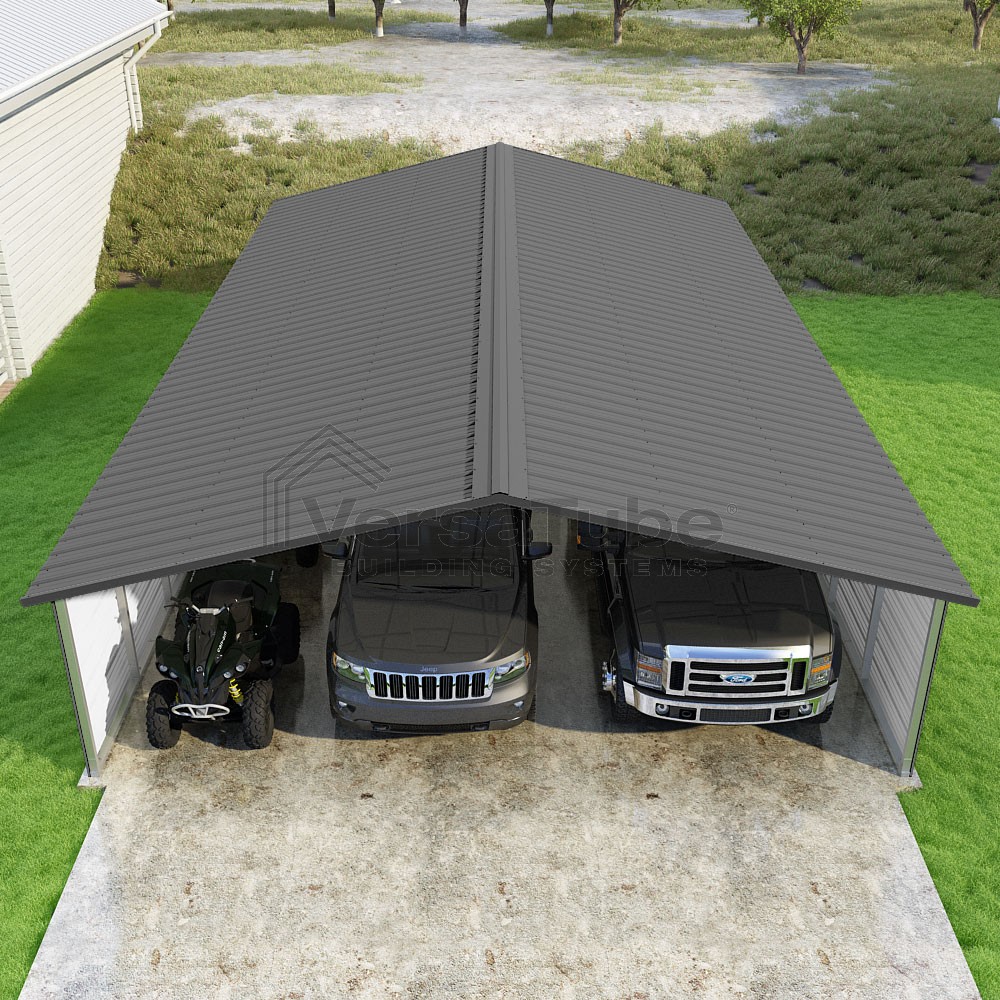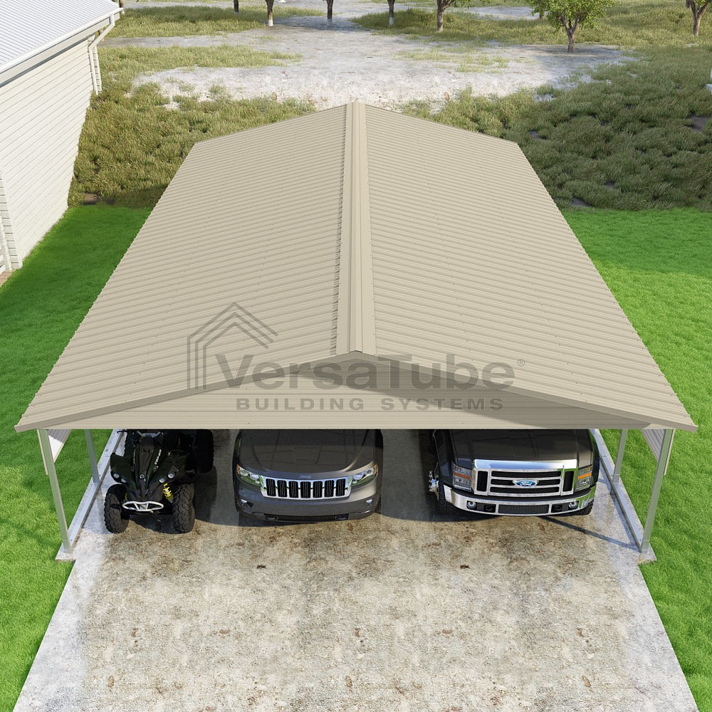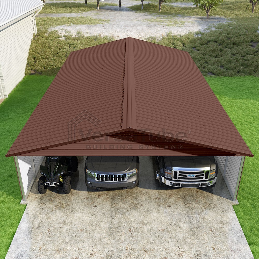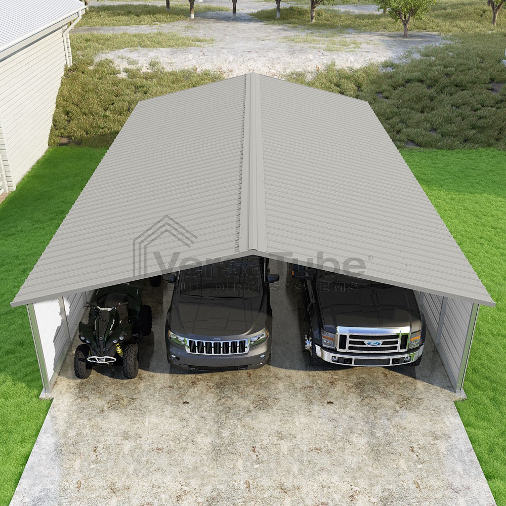 Pinnacle Series DIY carport kit features vertical sheet metal roof panels with ridge cap, gable and eave trim for an A-frame roof style and extended coverage on both ends.