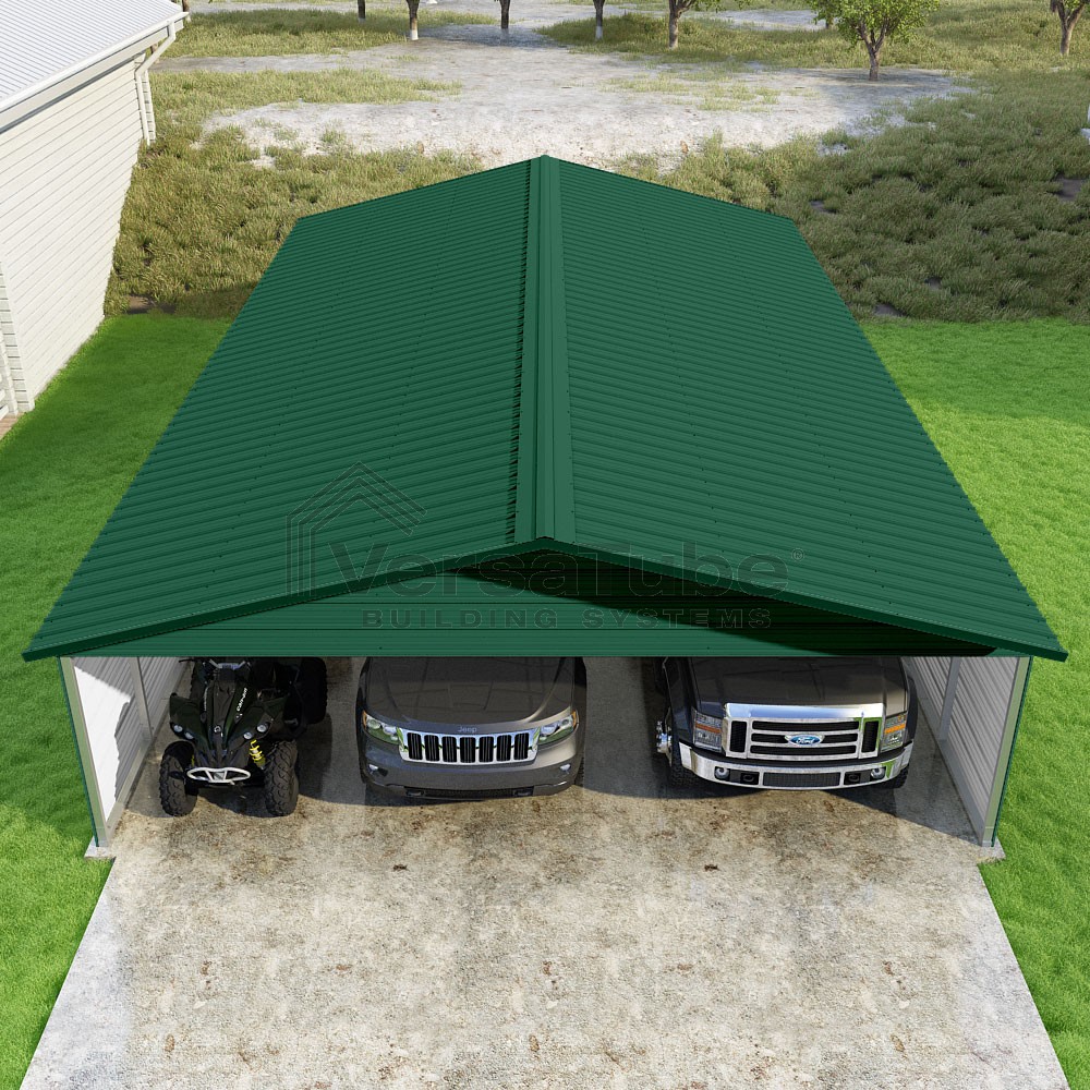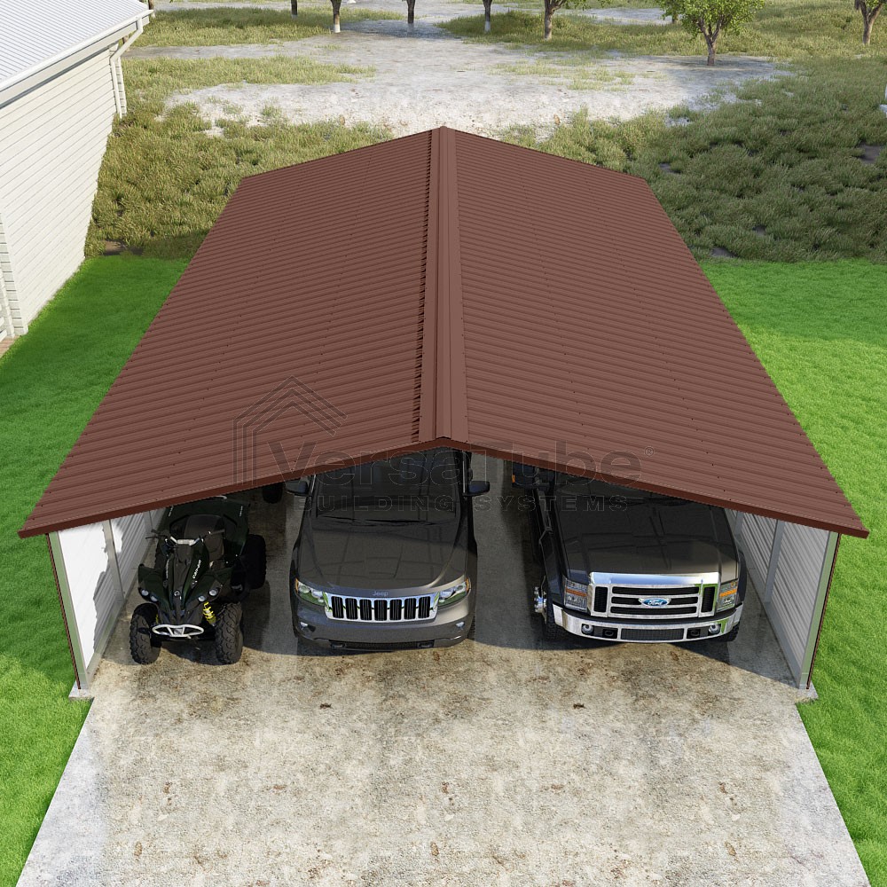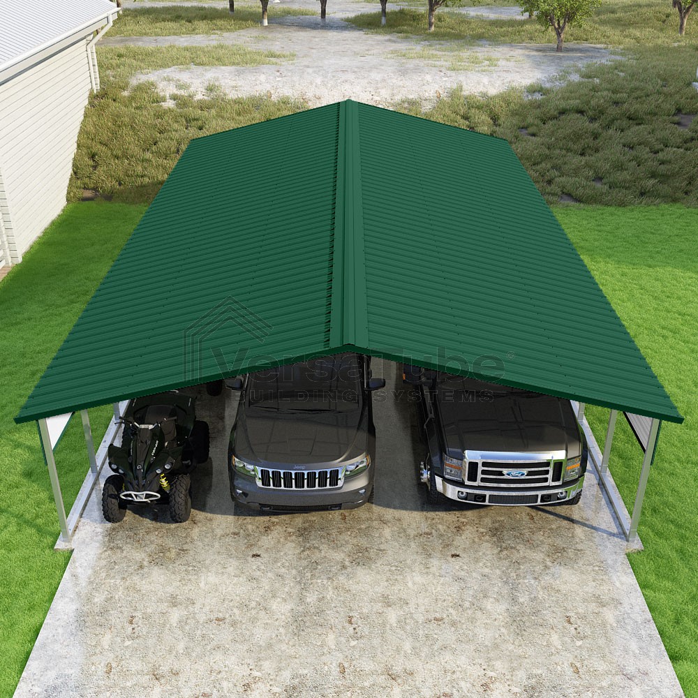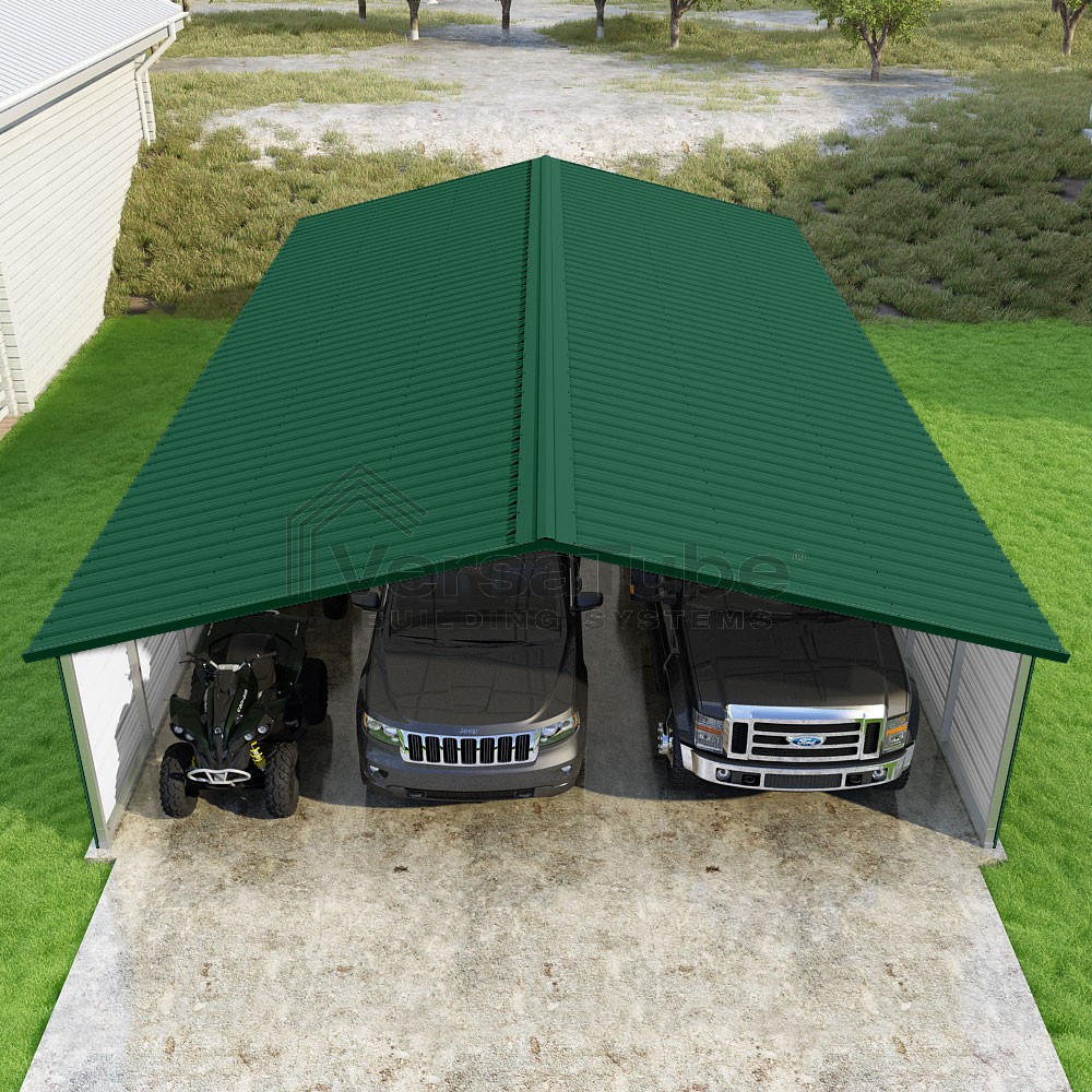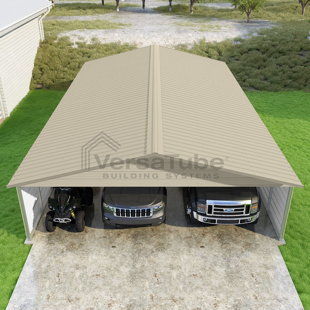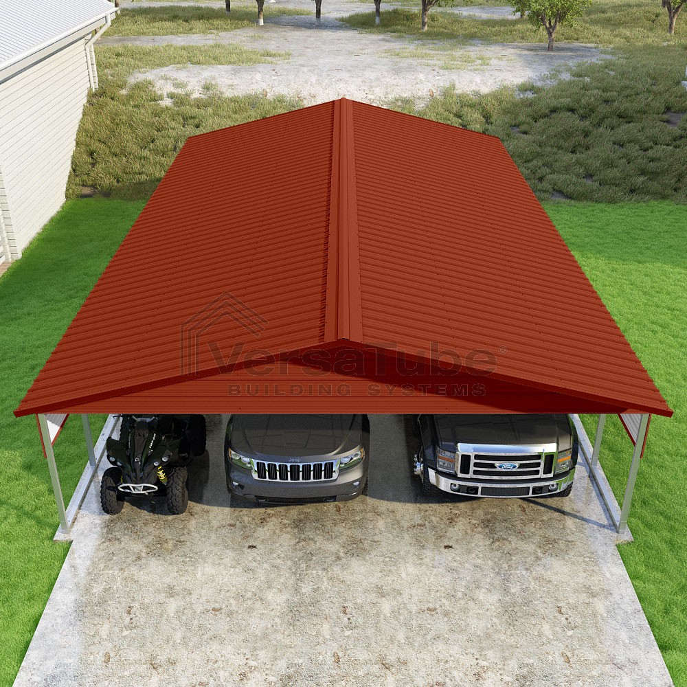 Pinnacle Series DIY carport kit features vertical sheet metal roof panels with ridge cap, gable and eave trim for an A-frame roof style and extended coverage on both ends.