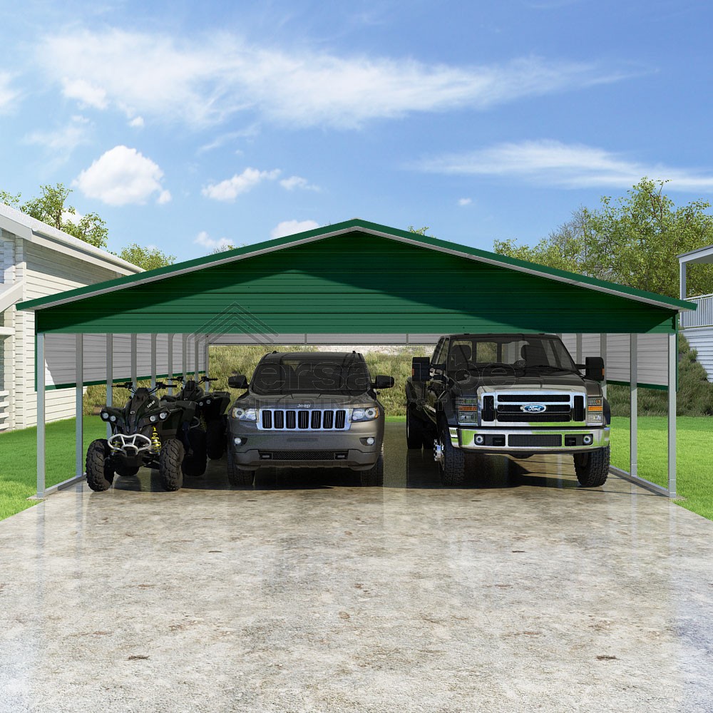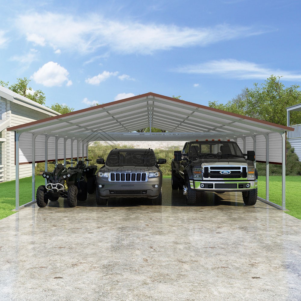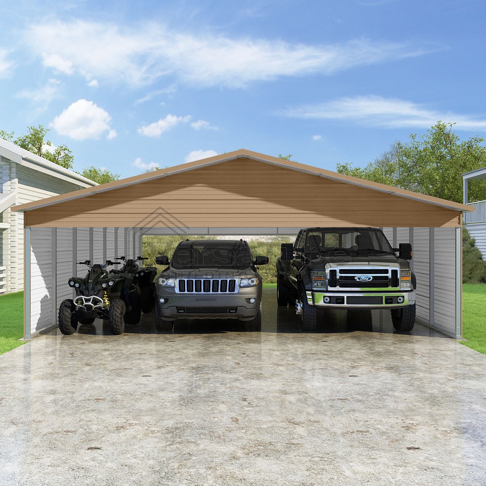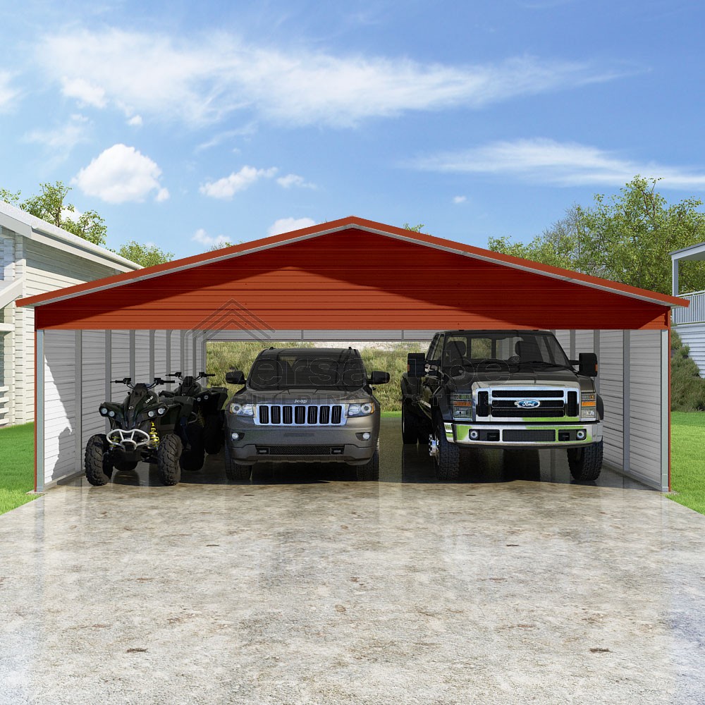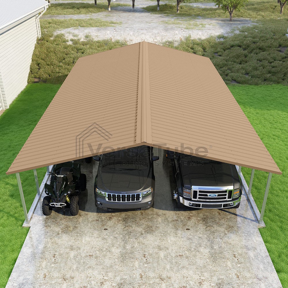 Pinnacle Series DIY carport kit features vertical sheet metal roof panels with ridge cap, gable and eave trim for an A-frame roof style and extended coverage on both ends.