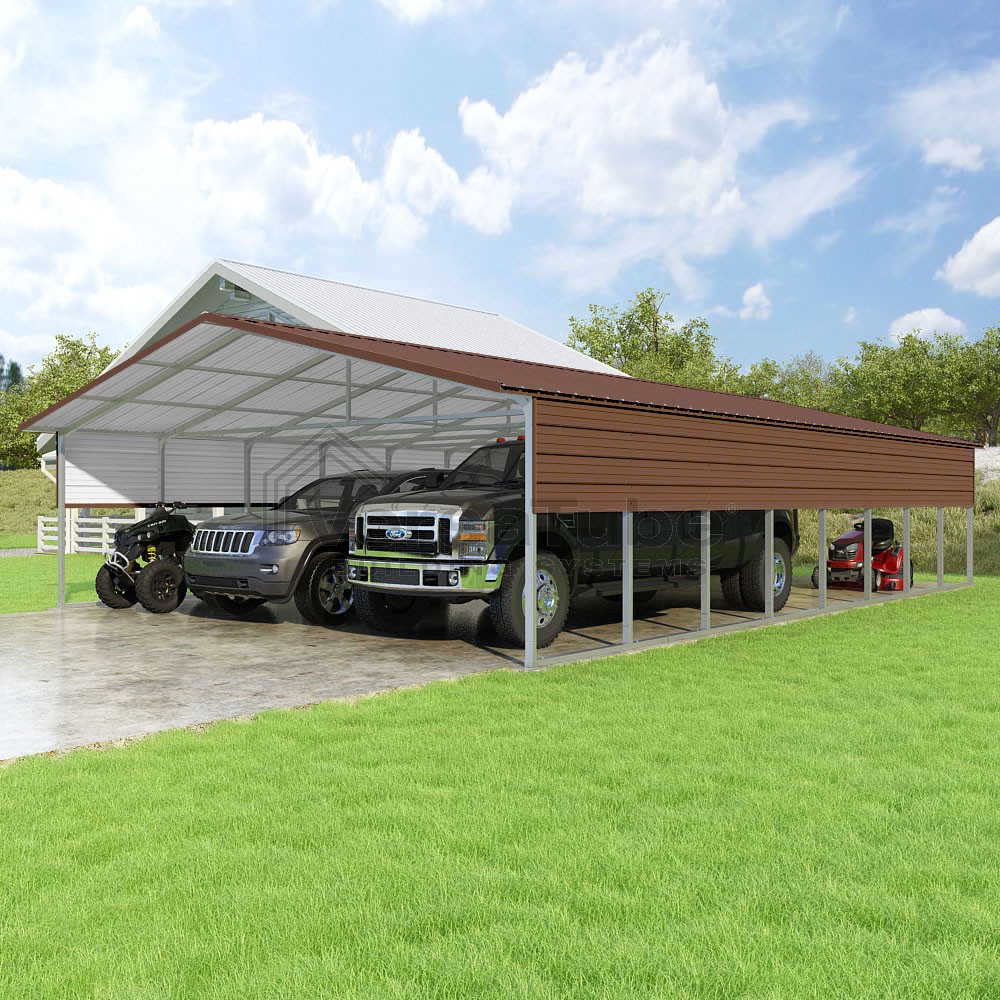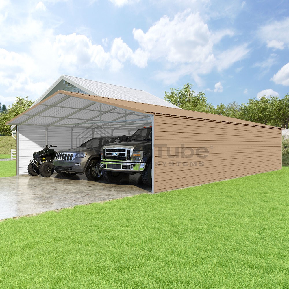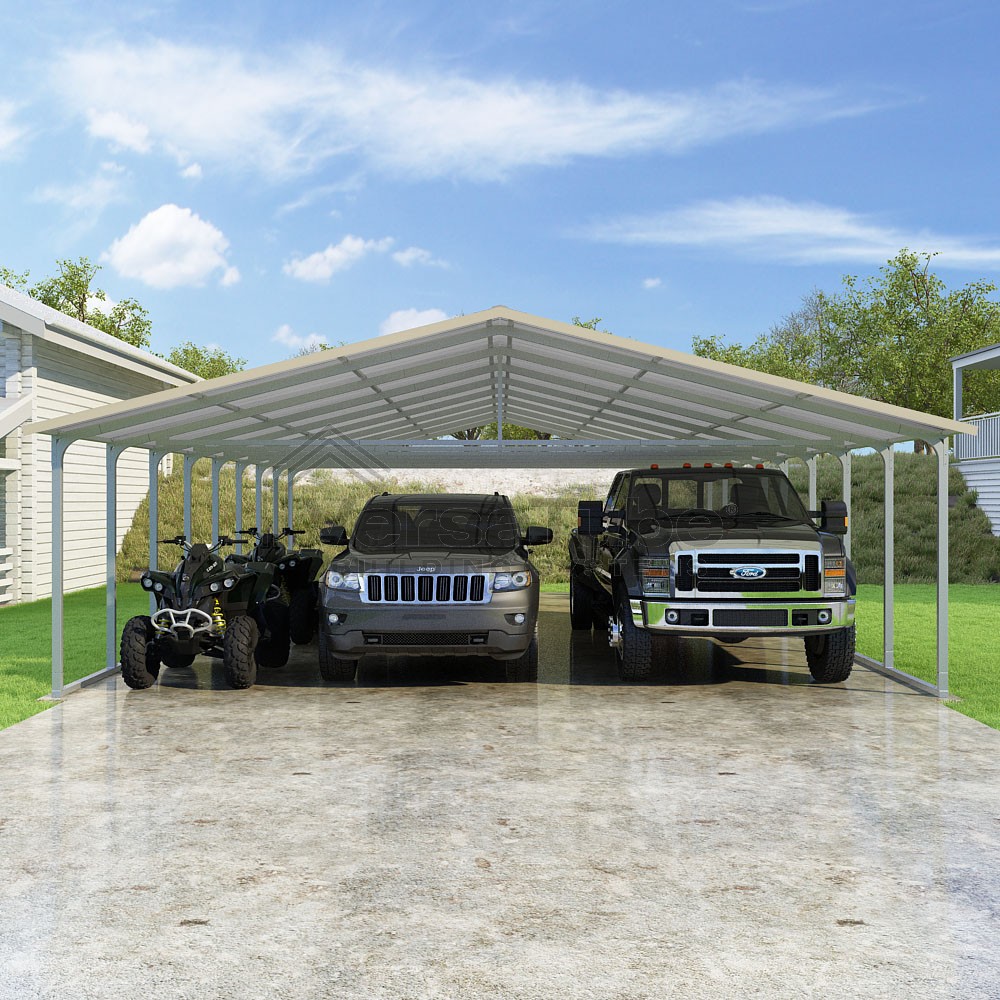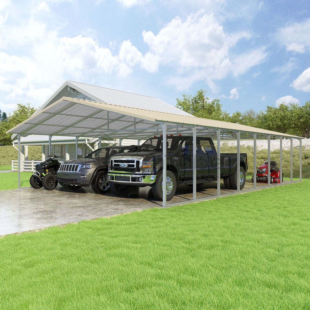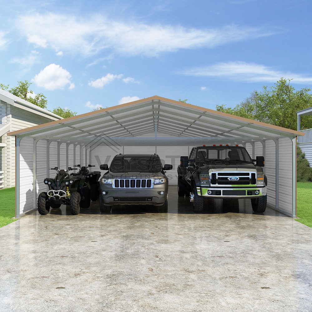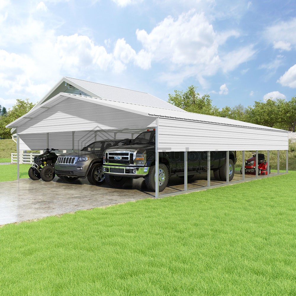 Pinnacle Series DIY carport kit features vertical sheet metal roof panels with ridge cap, gable and eave trim for an A-frame roof style and extended coverage on both ends.