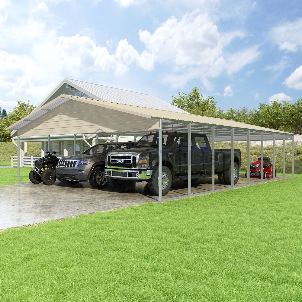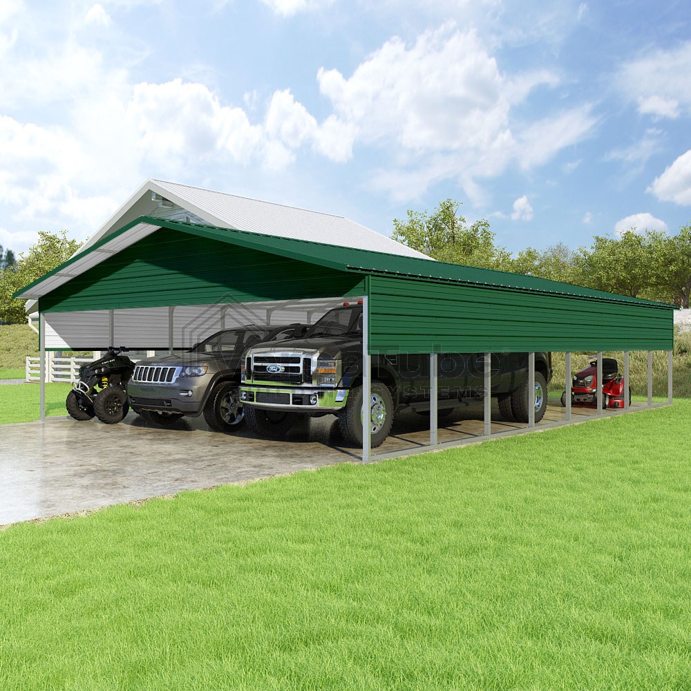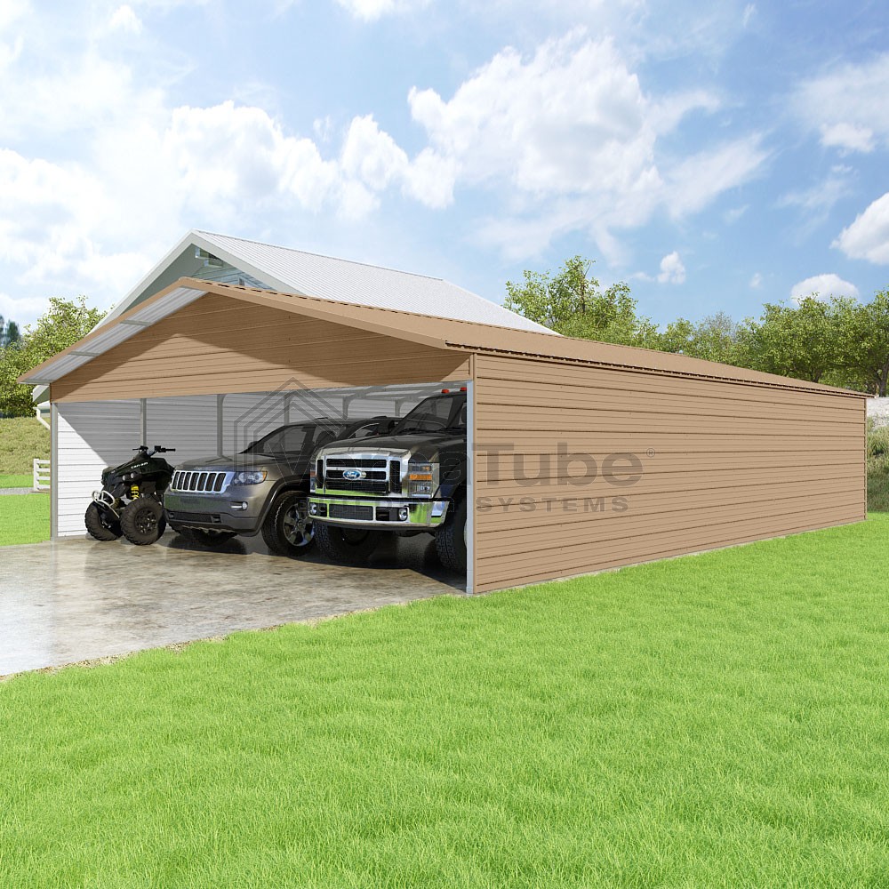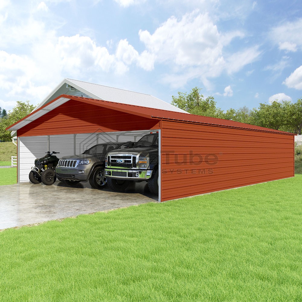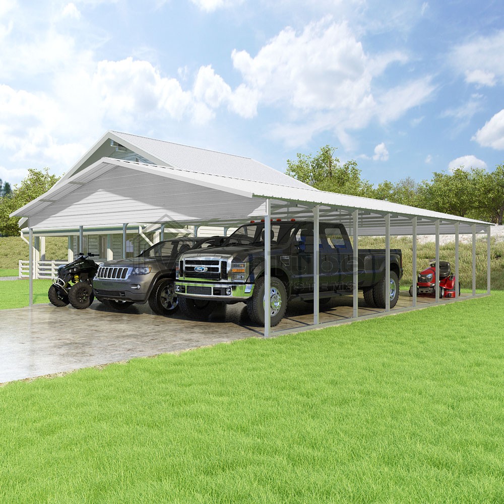 Pinnacle Series DIY carport kit features vertical sheet metal roof panels with ridge cap, gable and eave trim for an A-frame roof style and extended coverage on both ends.