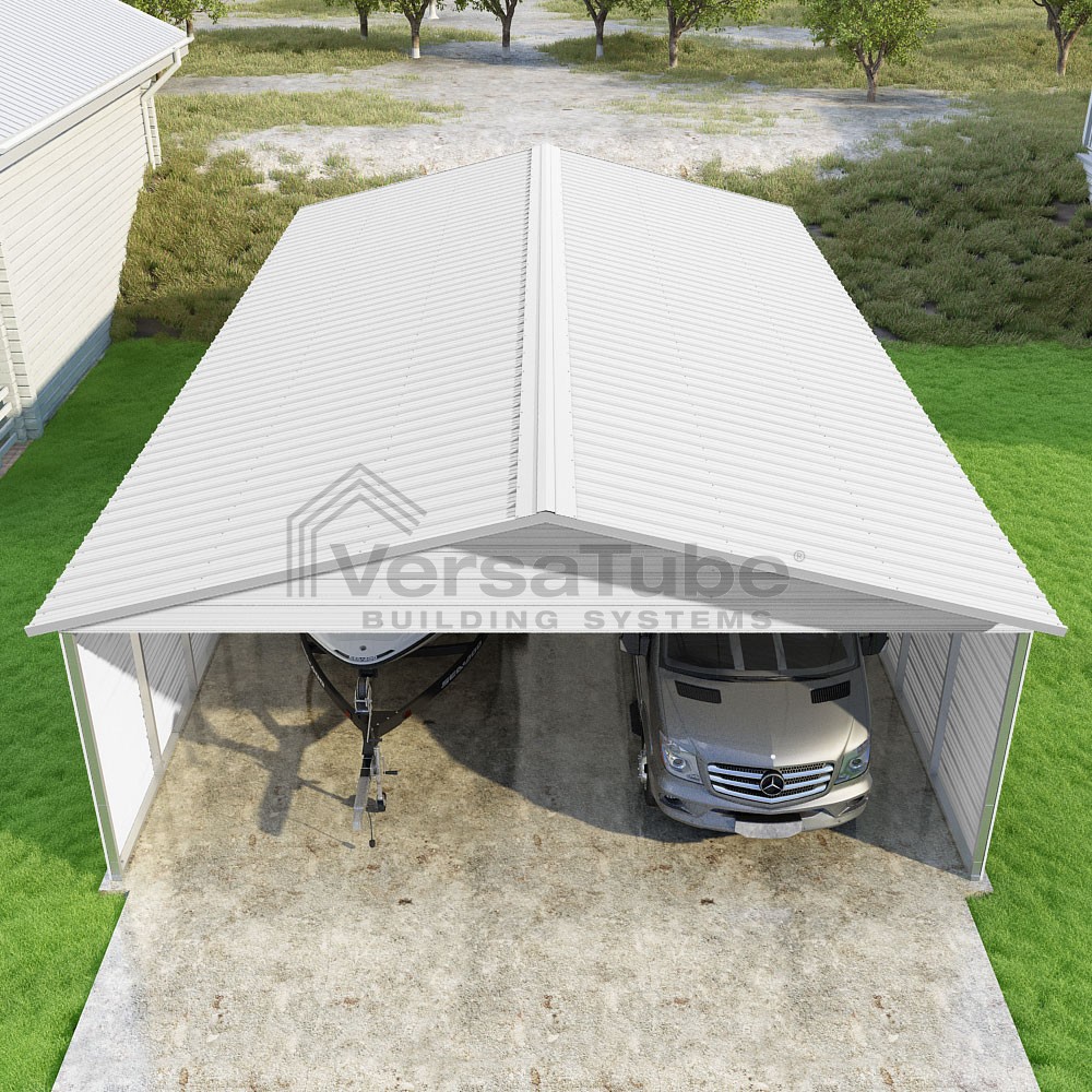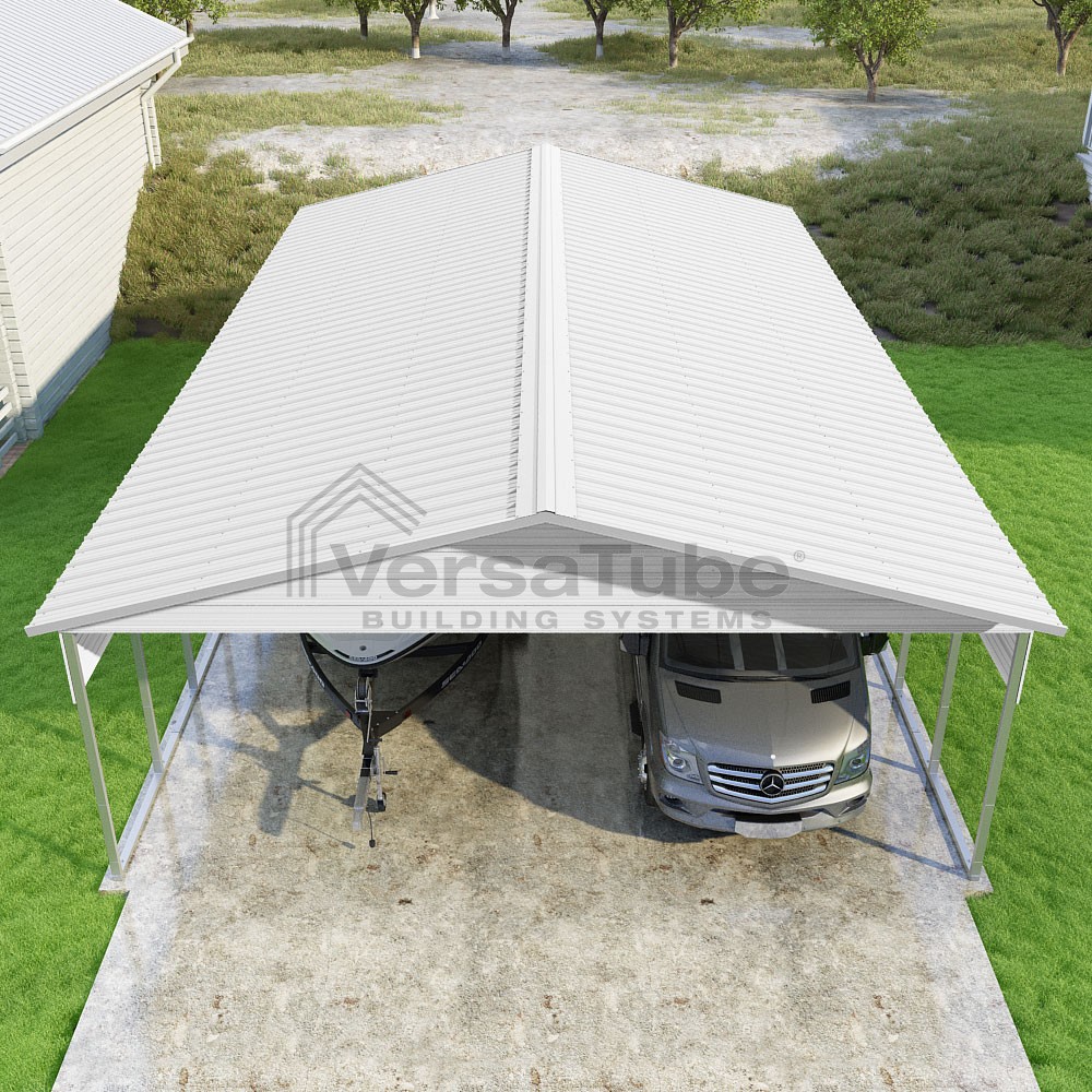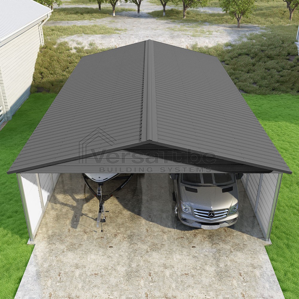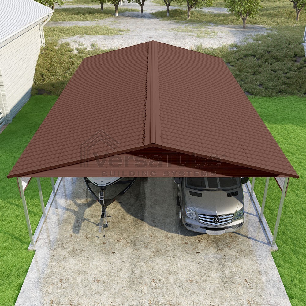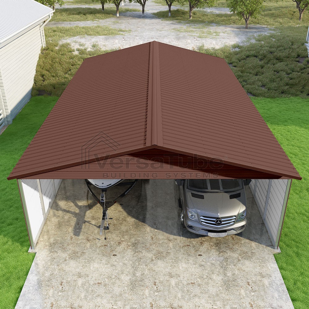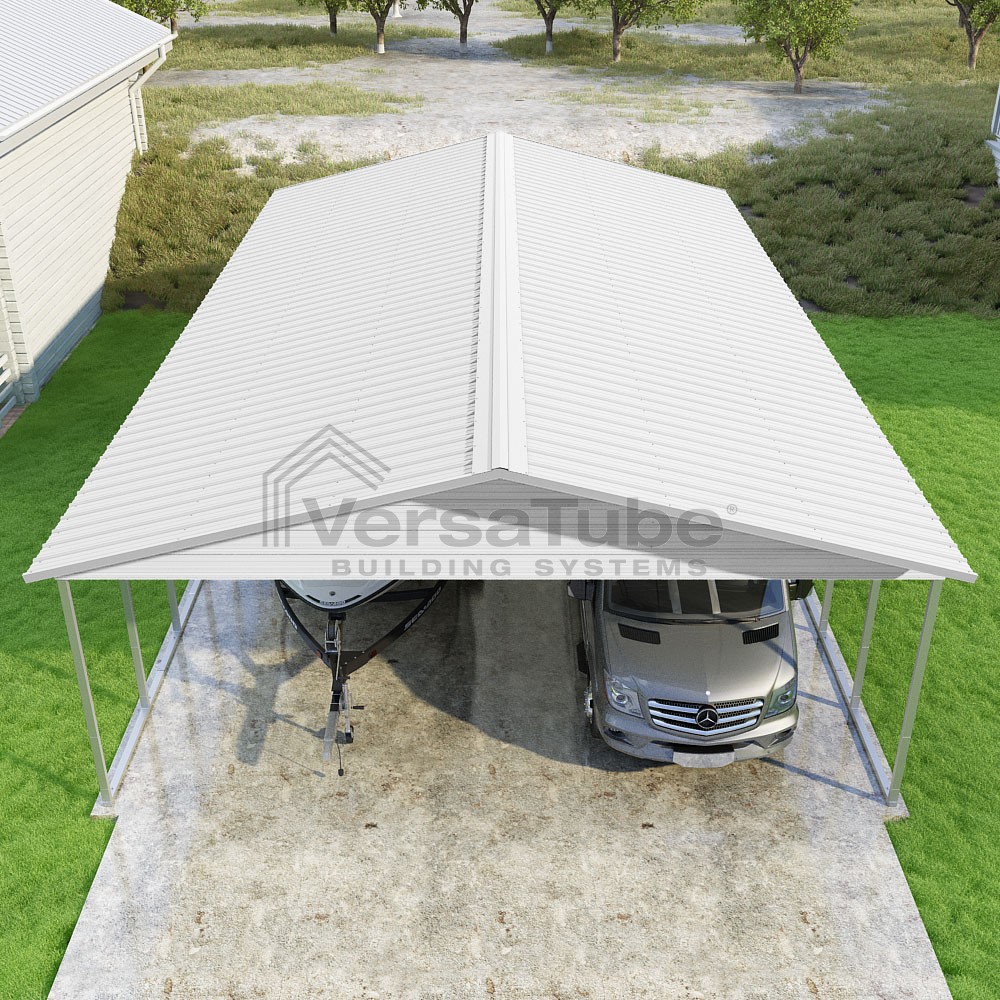 Pinnacle Series DIY carport kit features vertical sheet metal roof panels with ridge cap, gable and eave trim for an A-frame roof style and extended coverage on both ends.