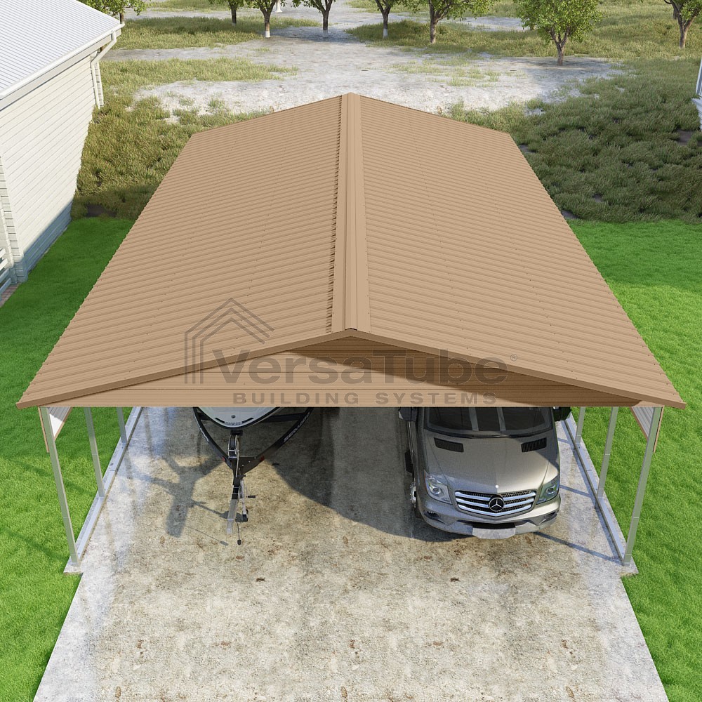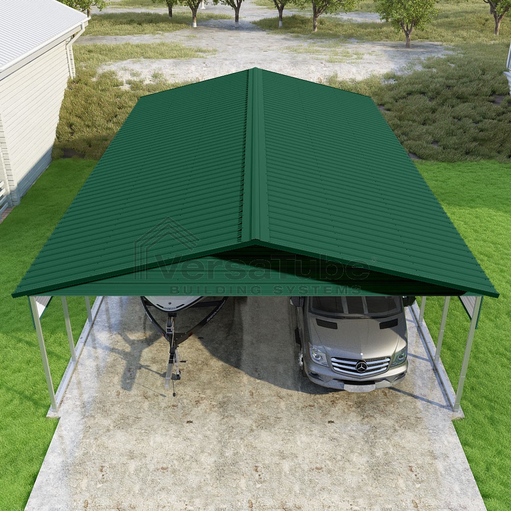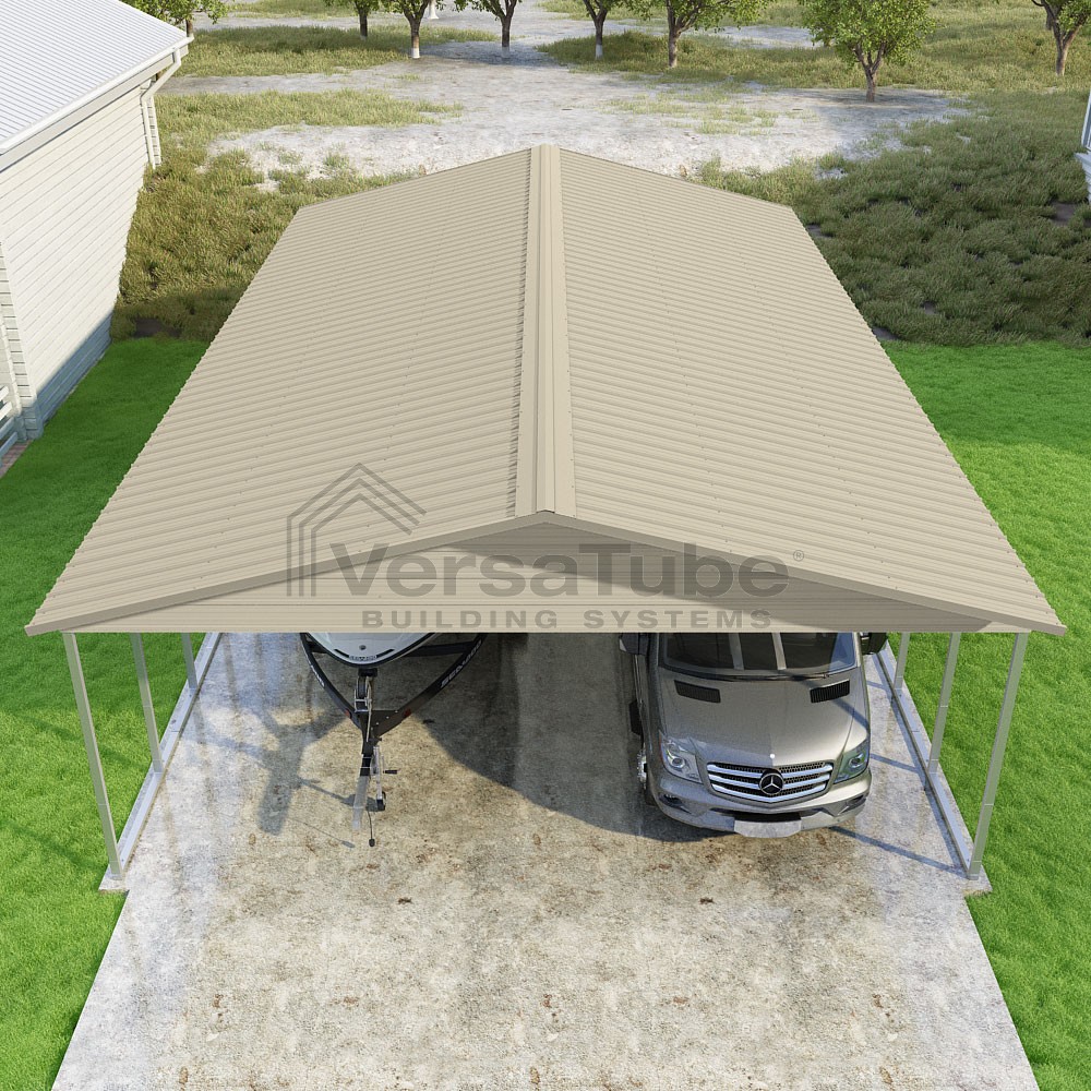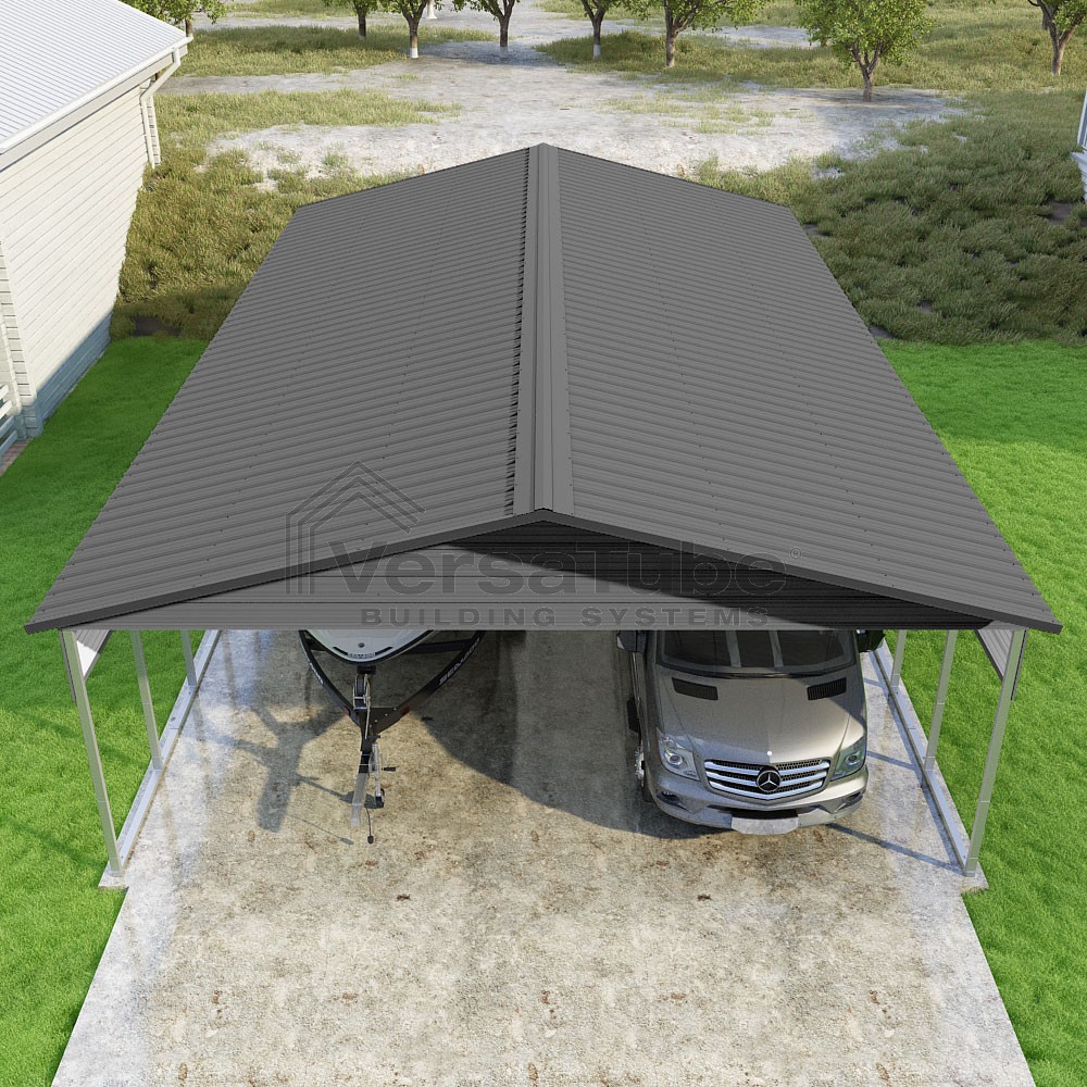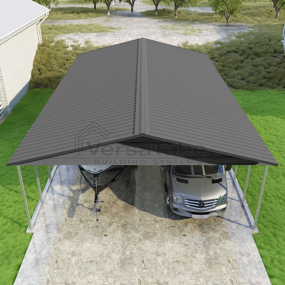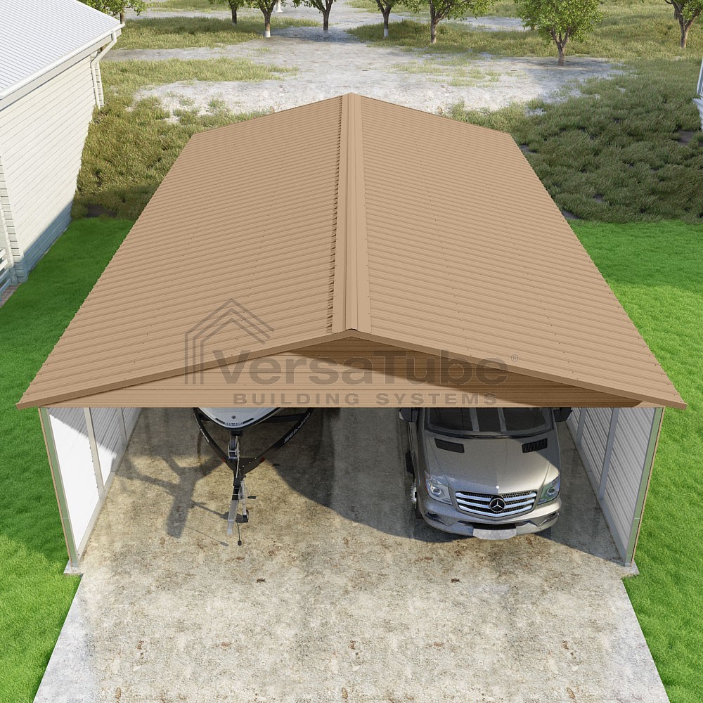 Pinnacle Series DIY carport kit features vertical sheet metal roof panels with ridge cap, gable and eave trim for an A-frame roof style and extended coverage on both ends.