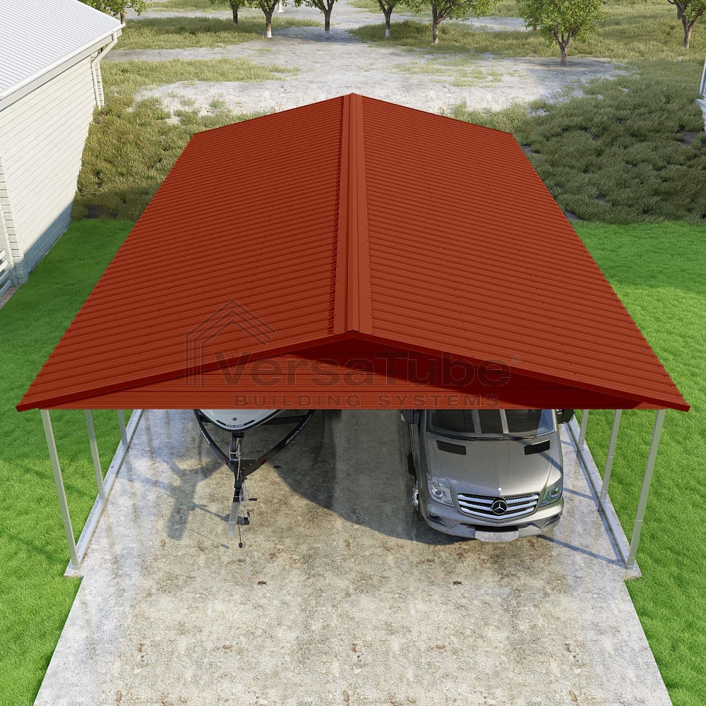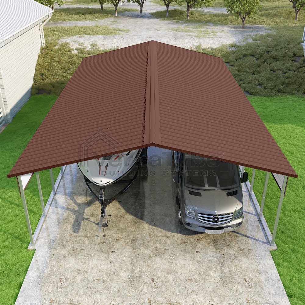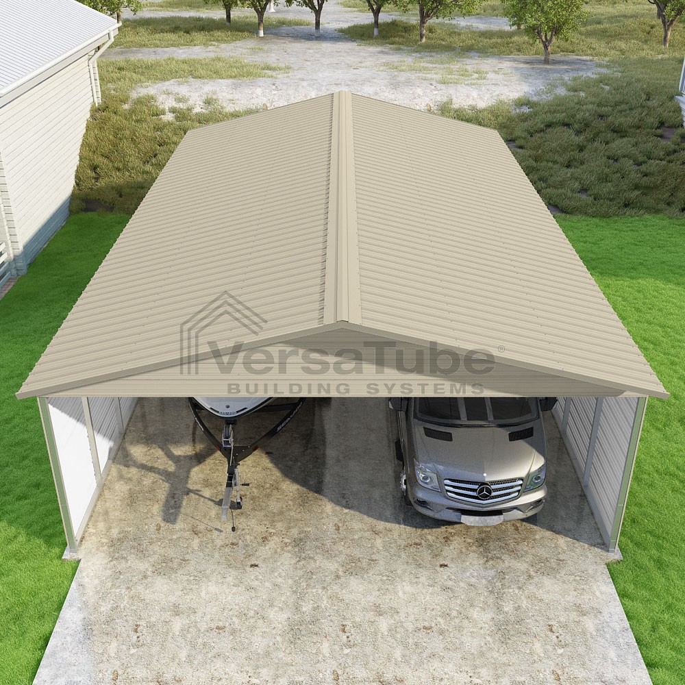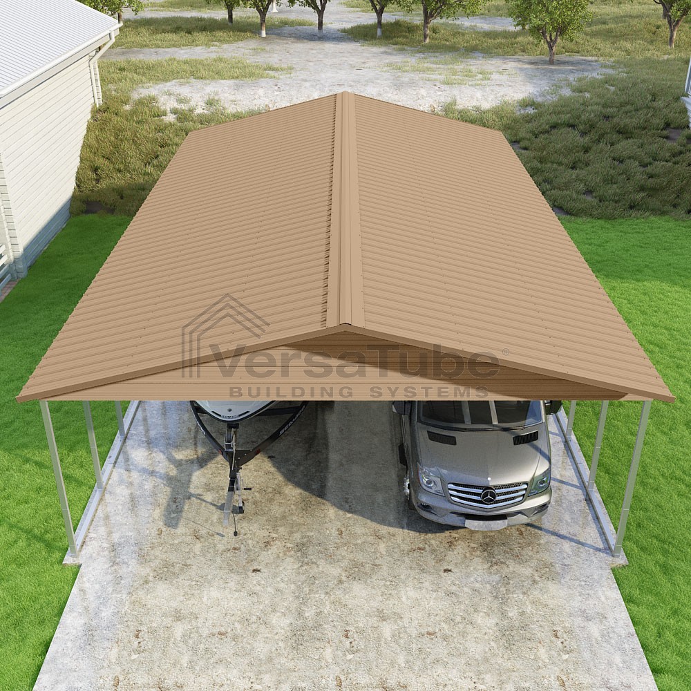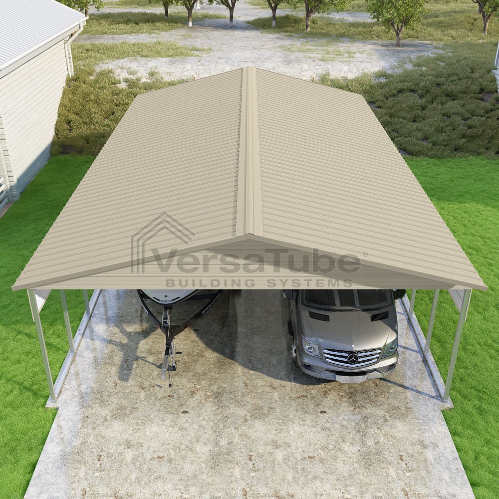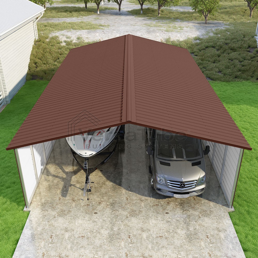 Pinnacle Series DIY carport kit features vertical sheet metal roof panels with ridge cap, gable and eave trim for an A-frame roof style and extended coverage on both ends.