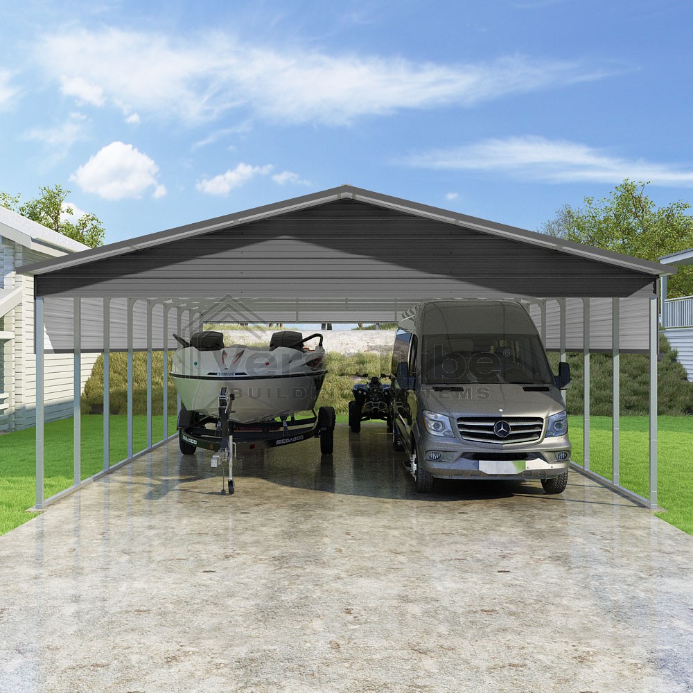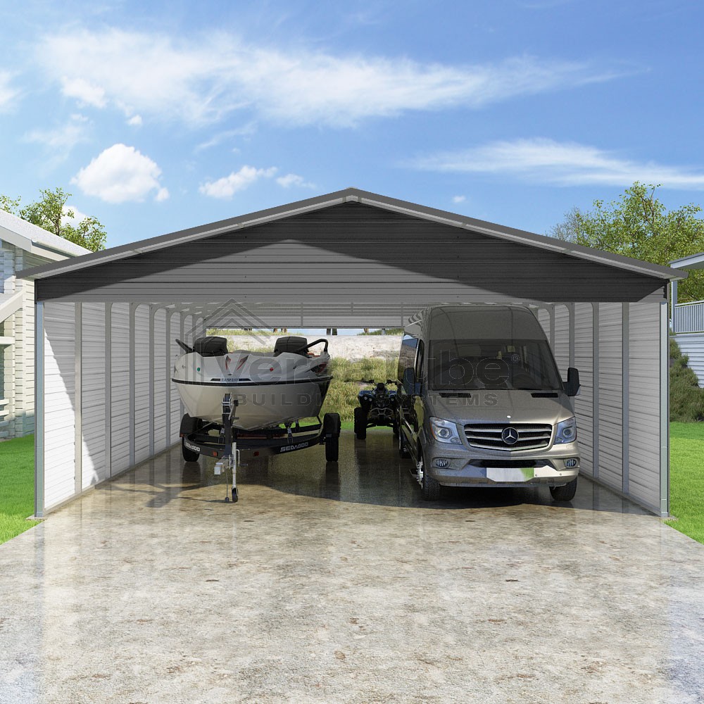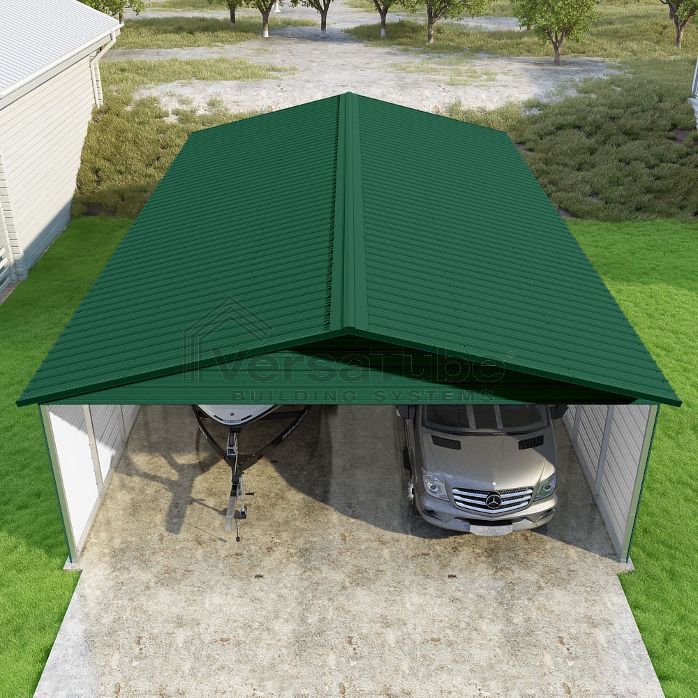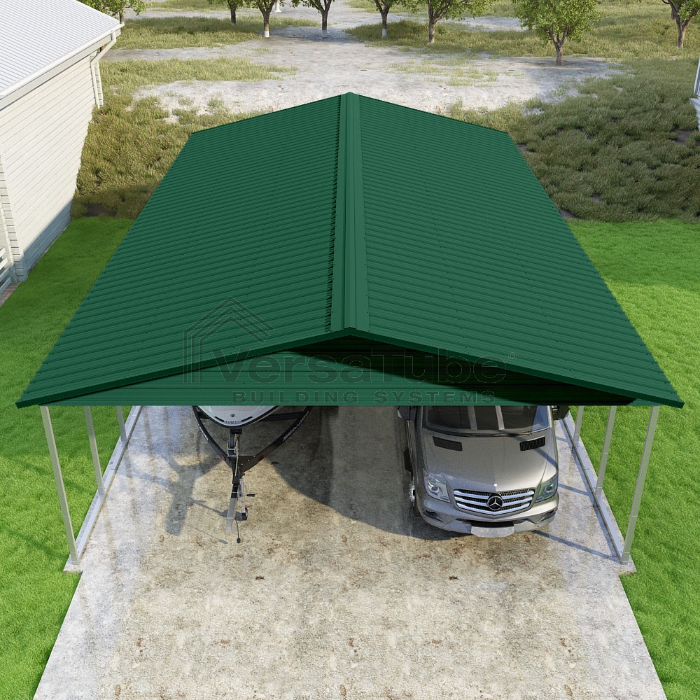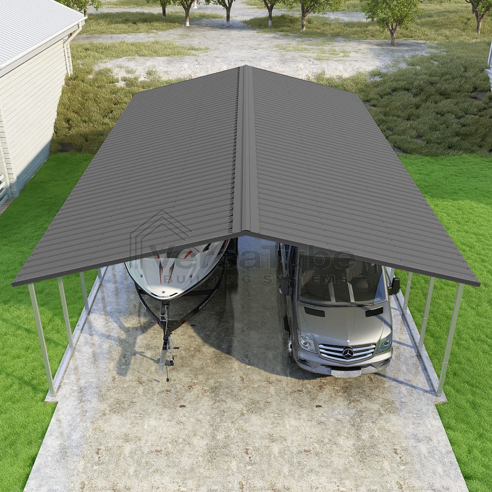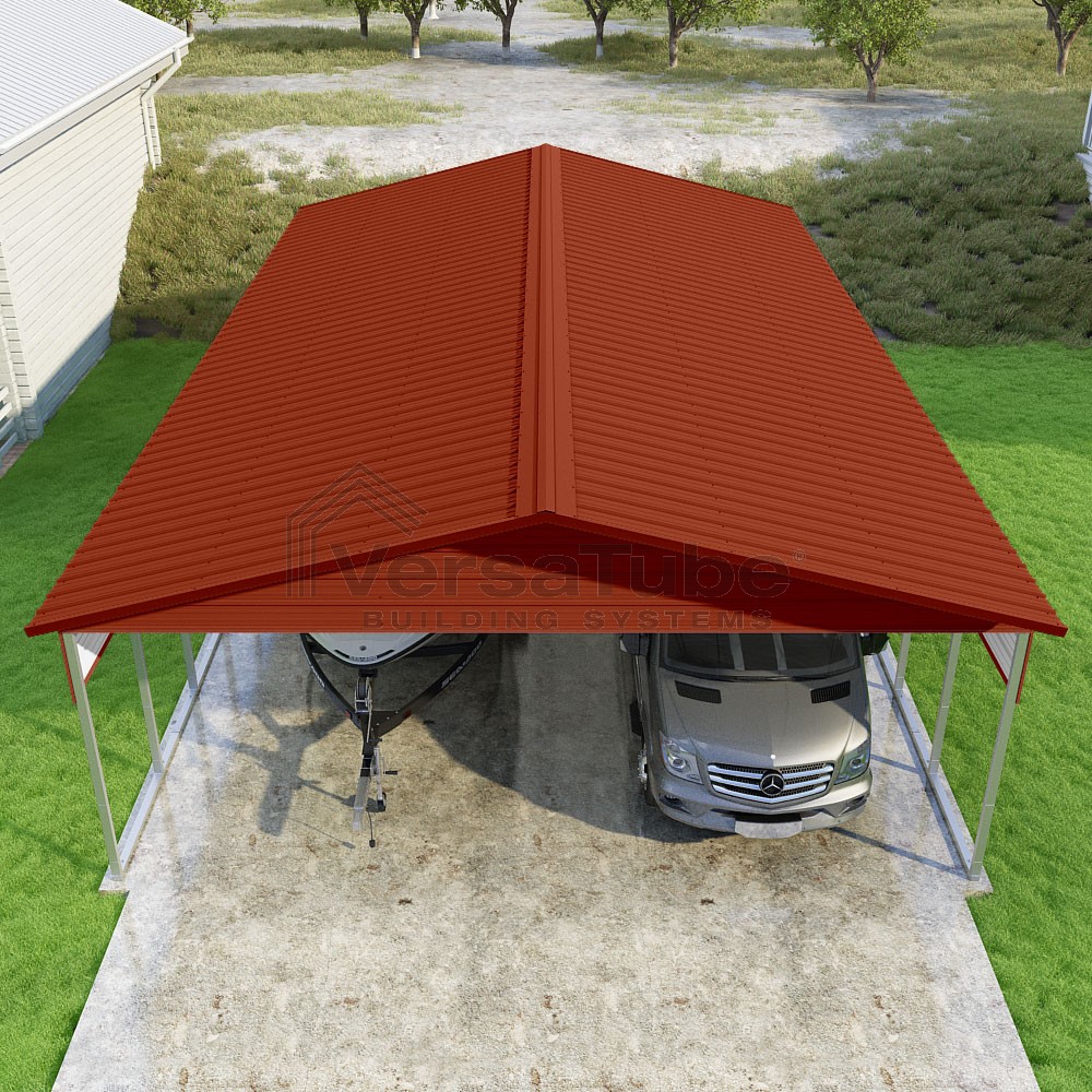Pinnacle Series DIY carport kit features vertical sheet metal roof panels with ridge cap, gable and eave trim for an A-frame roof style and extended coverage on both ends.