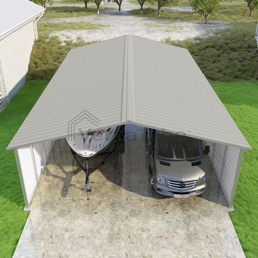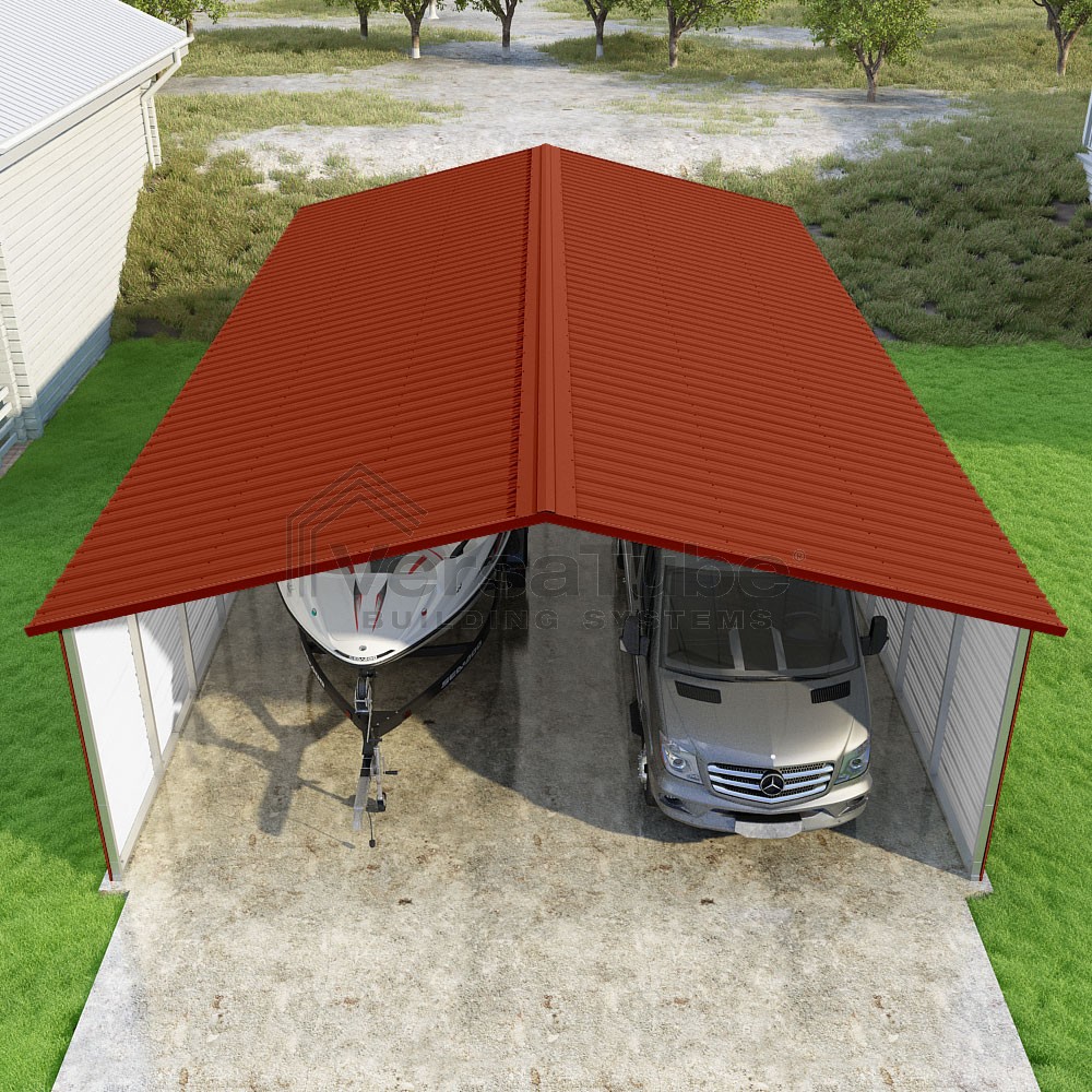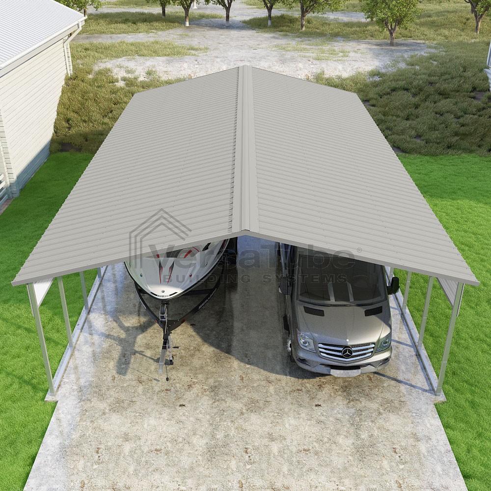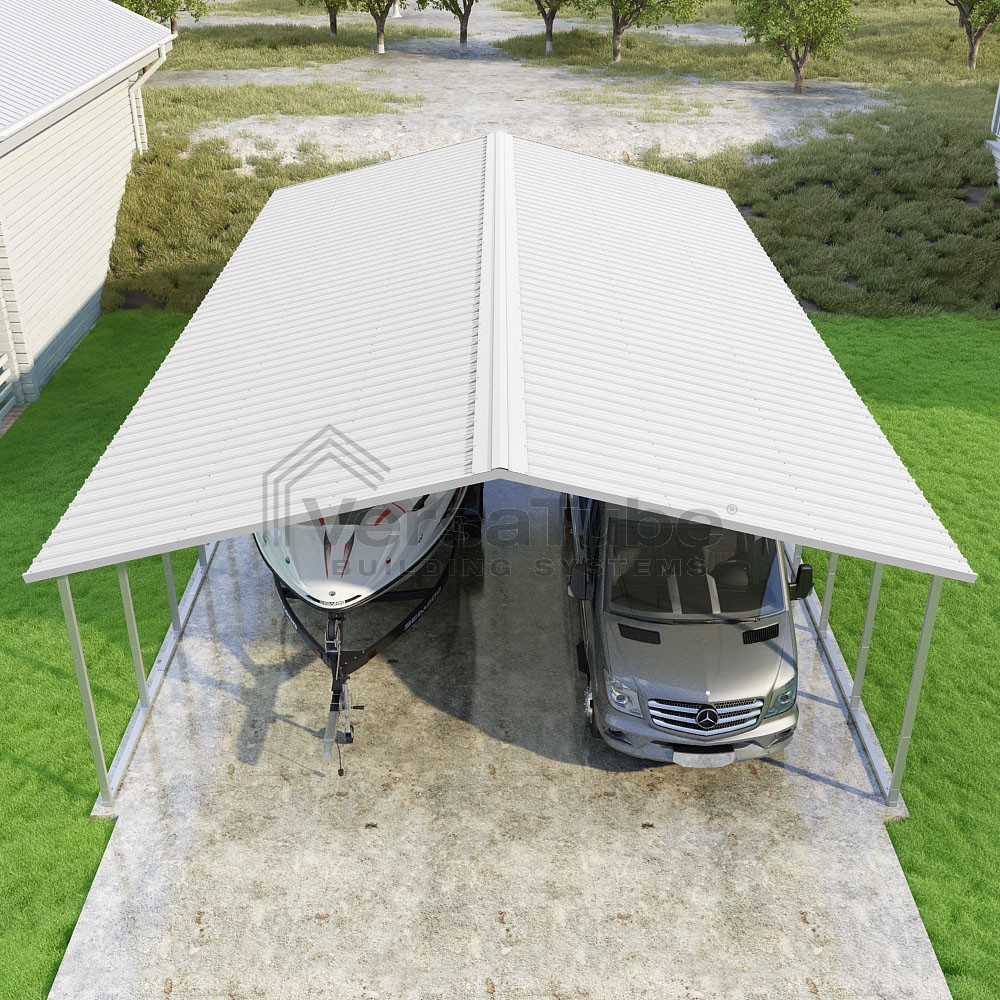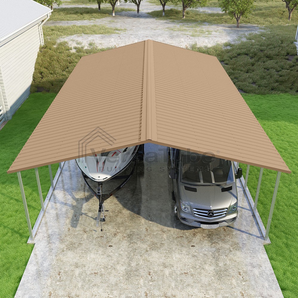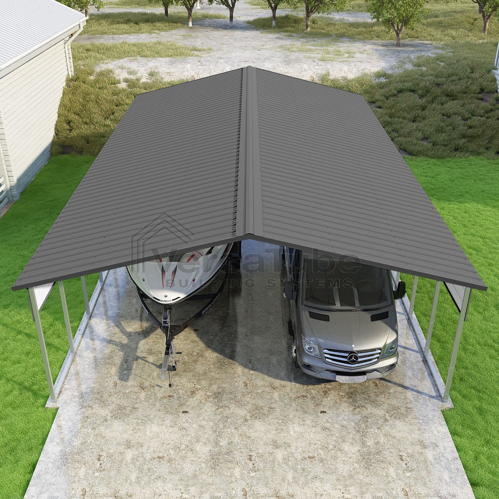 Pinnacle Series DIY carport kit features vertical sheet metal roof panels with ridge cap, gable and eave trim for an A-frame roof style and extended coverage on both ends.