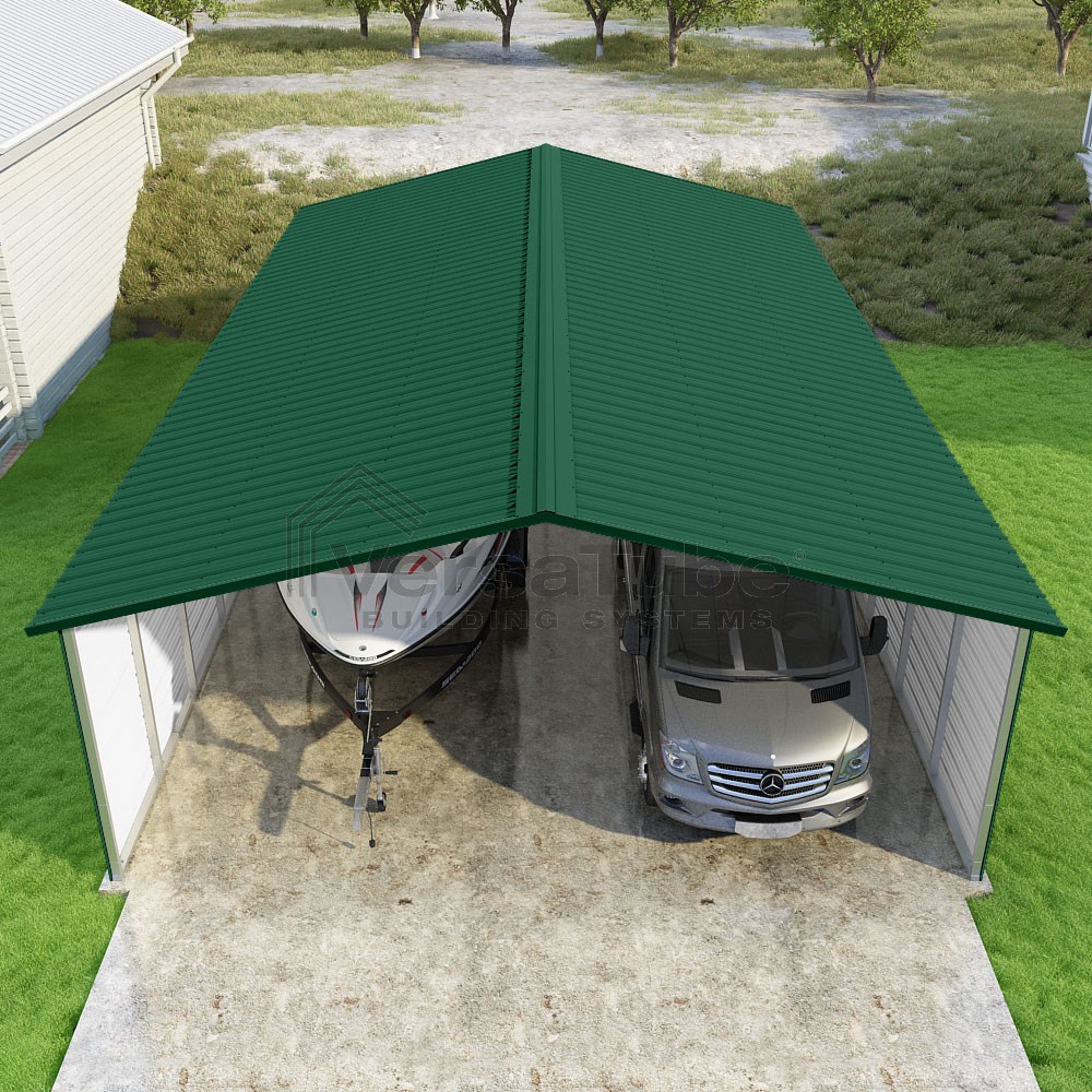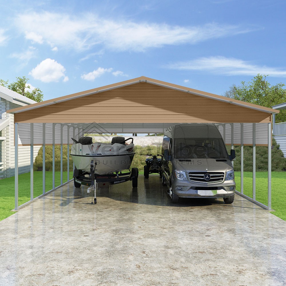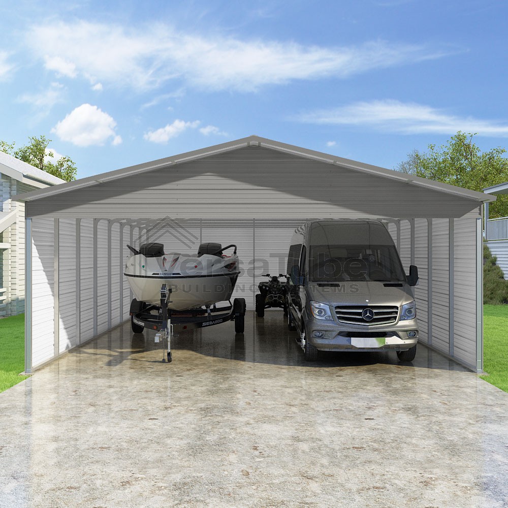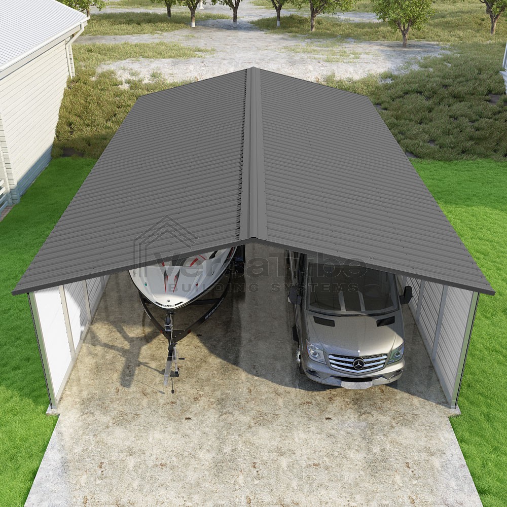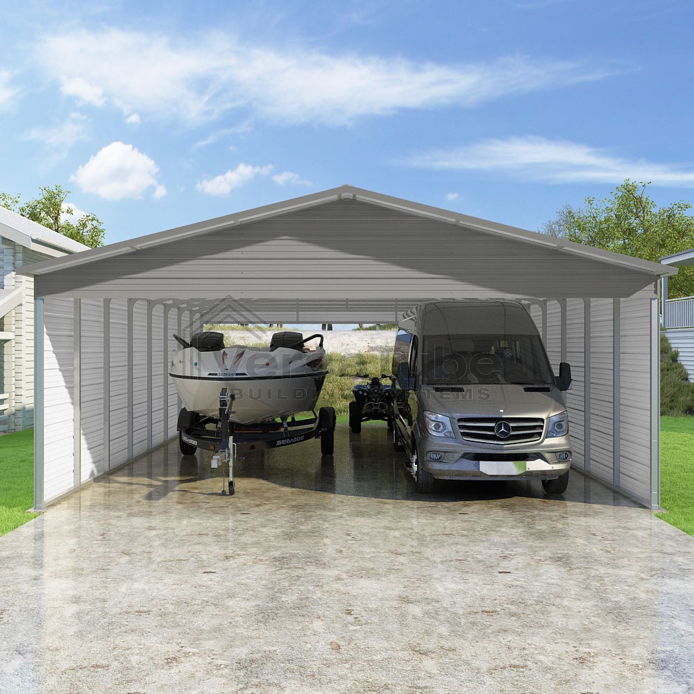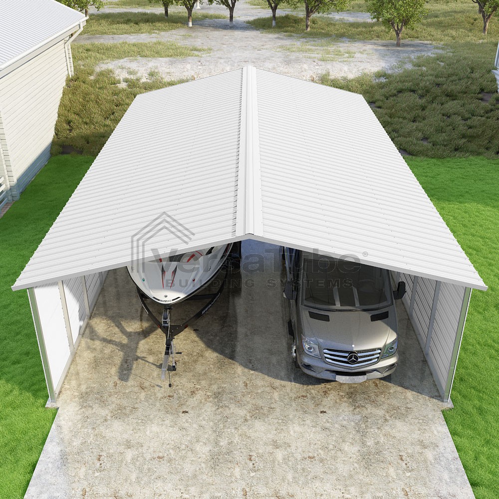 Pinnacle Series DIY carport kit features vertical sheet metal roof panels with ridge cap, gable and eave trim for an A-frame roof style and extended coverage on both ends.