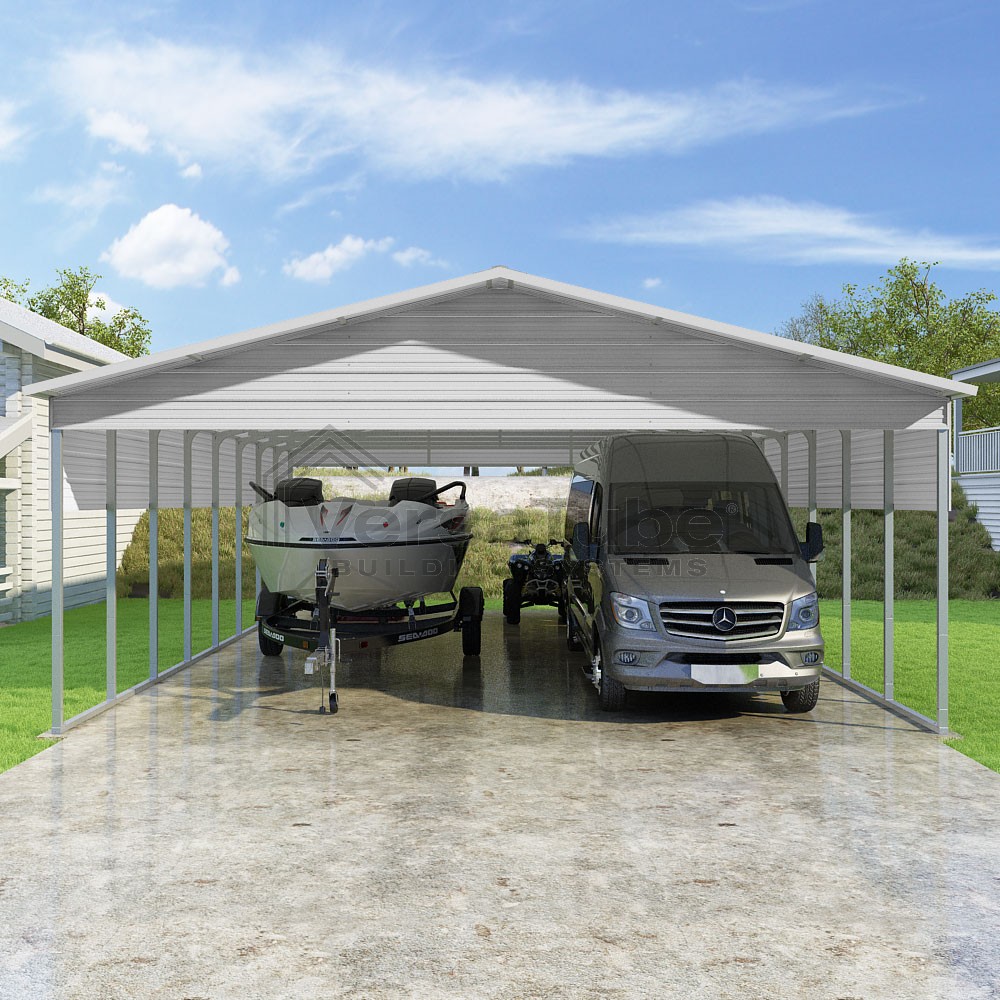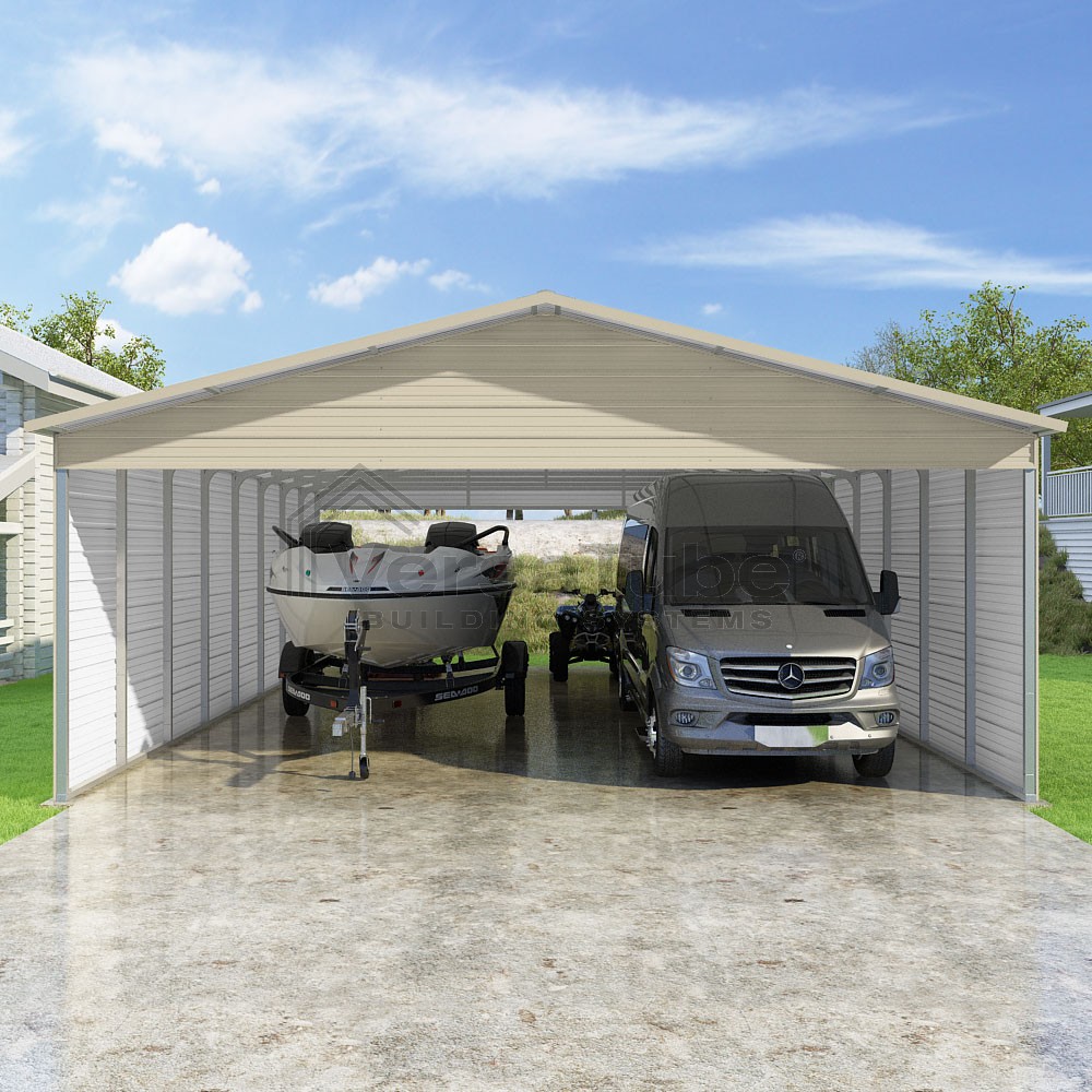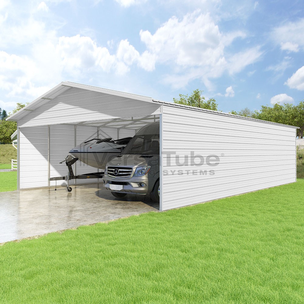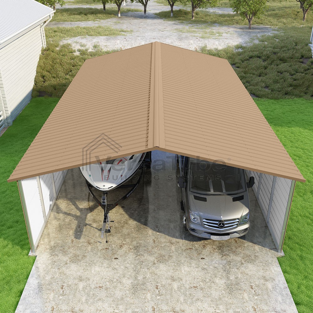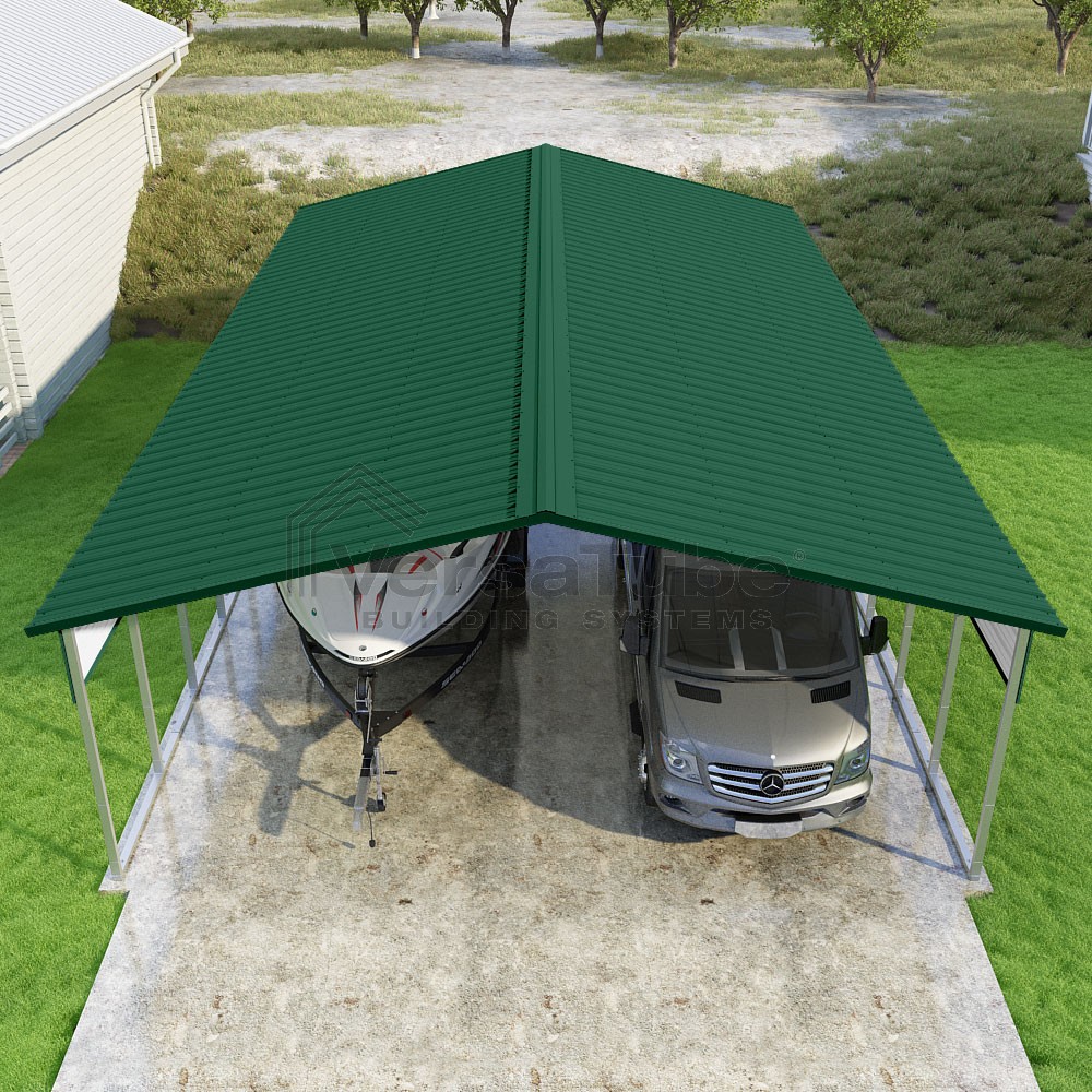 Pinnacle Series DIY carport kit features vertical sheet metal roof panels with ridge cap, gable and eave trim for an A-frame roof style and extended coverage on both ends.