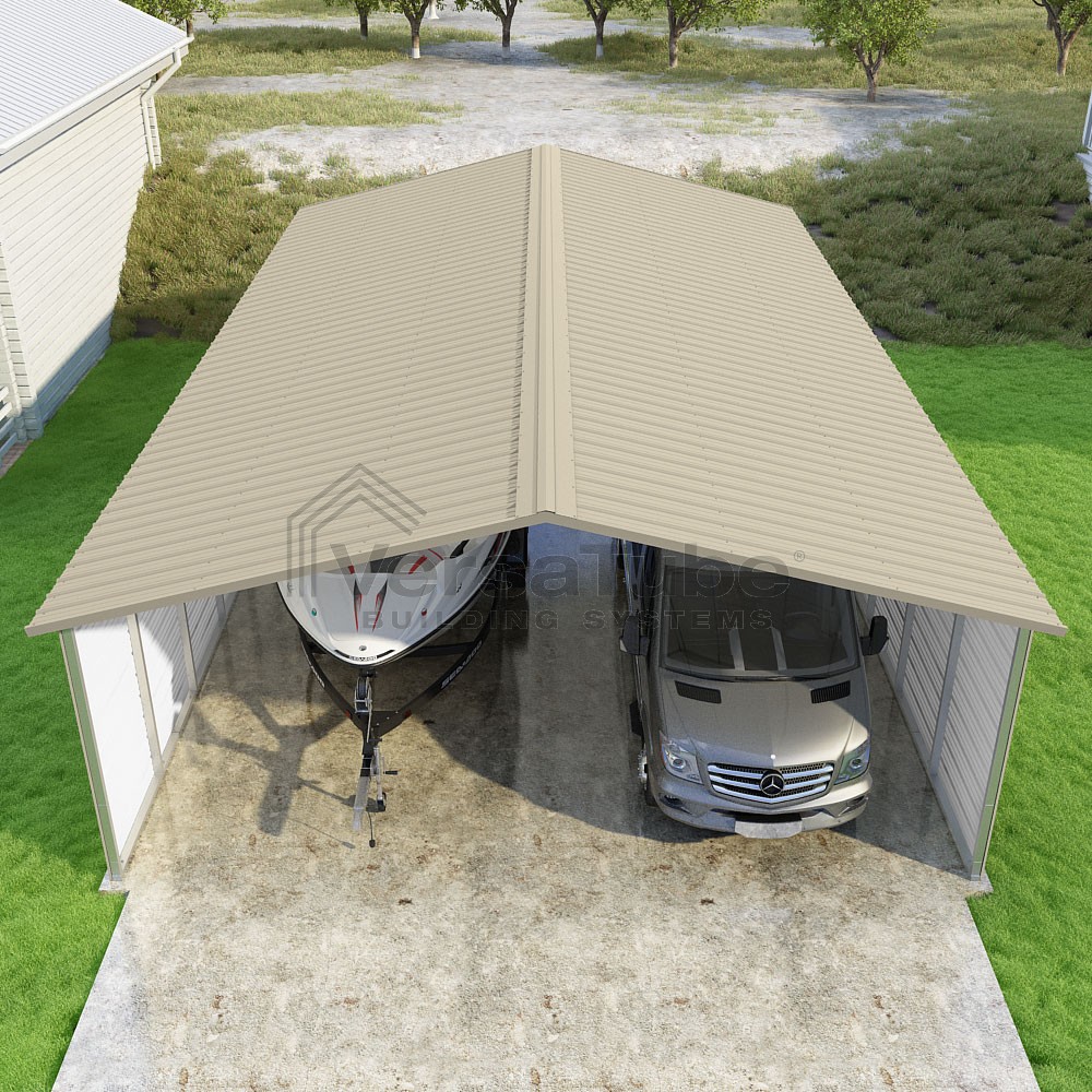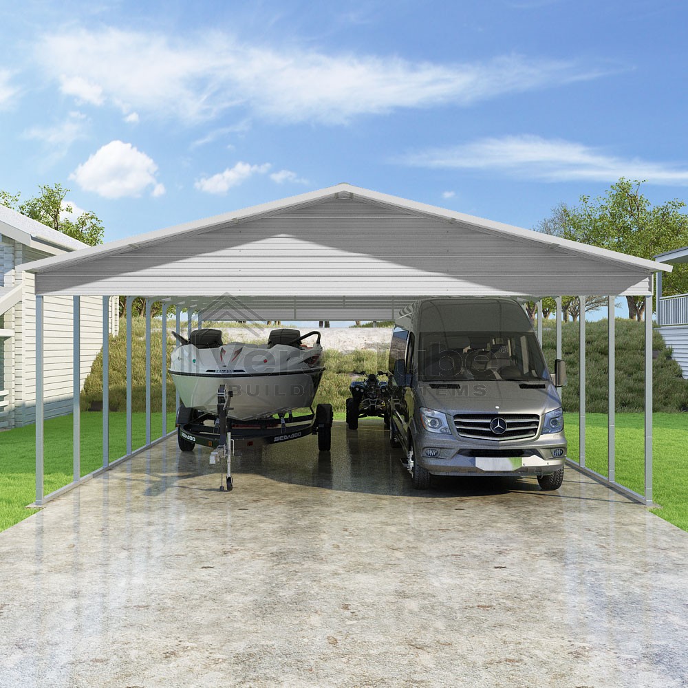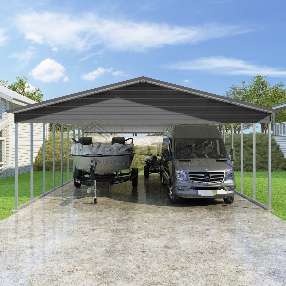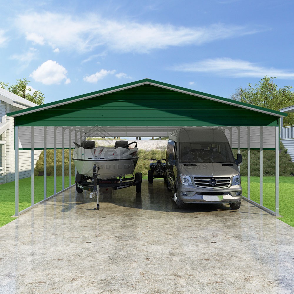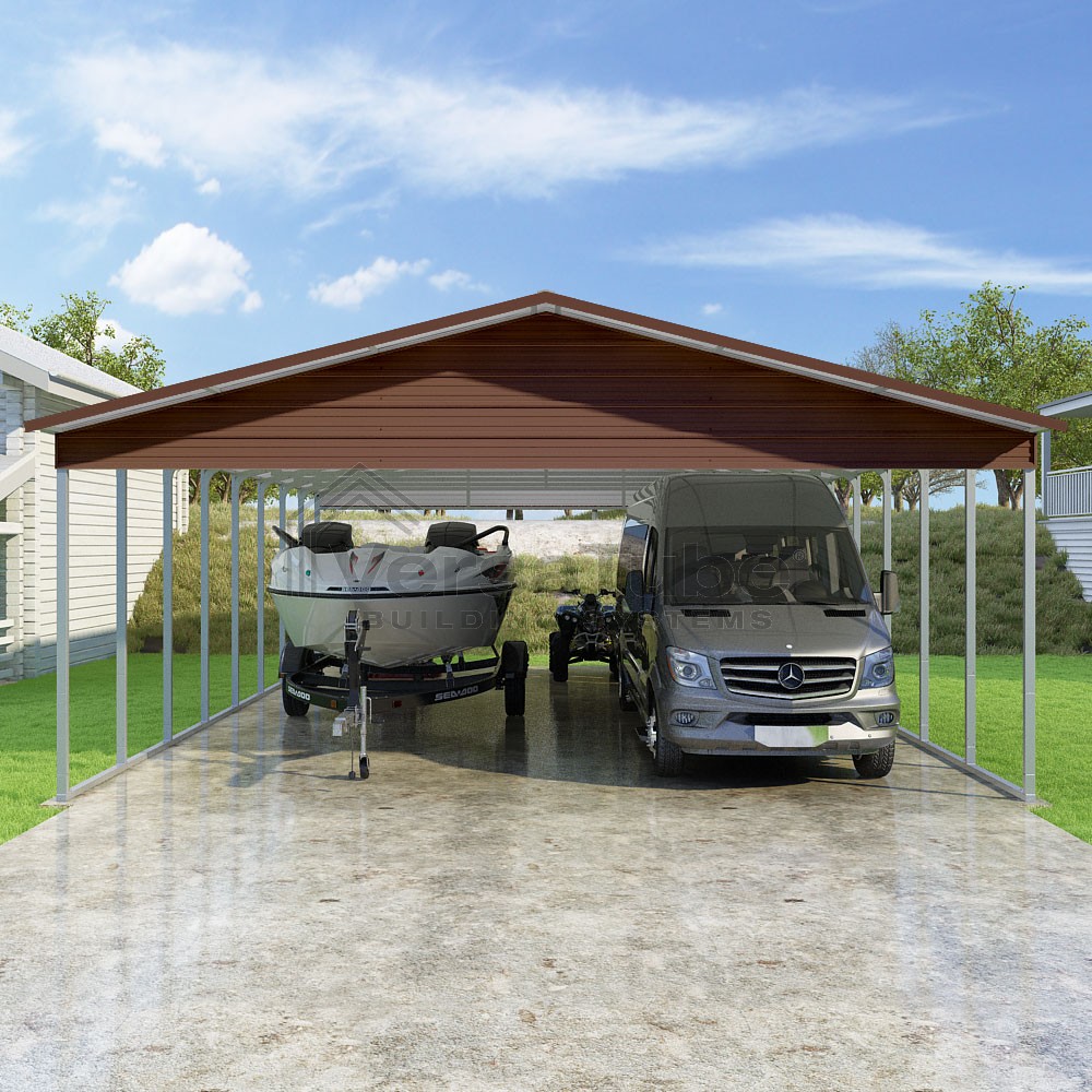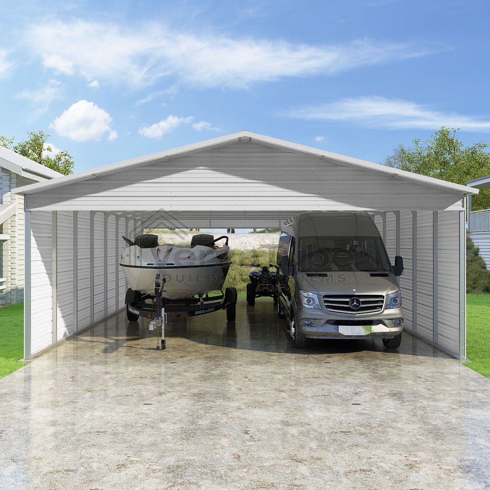 Pinnacle Series DIY carport kit features vertical sheet metal roof panels with ridge cap, gable and eave trim for an A-frame roof style and extended coverage on both ends.