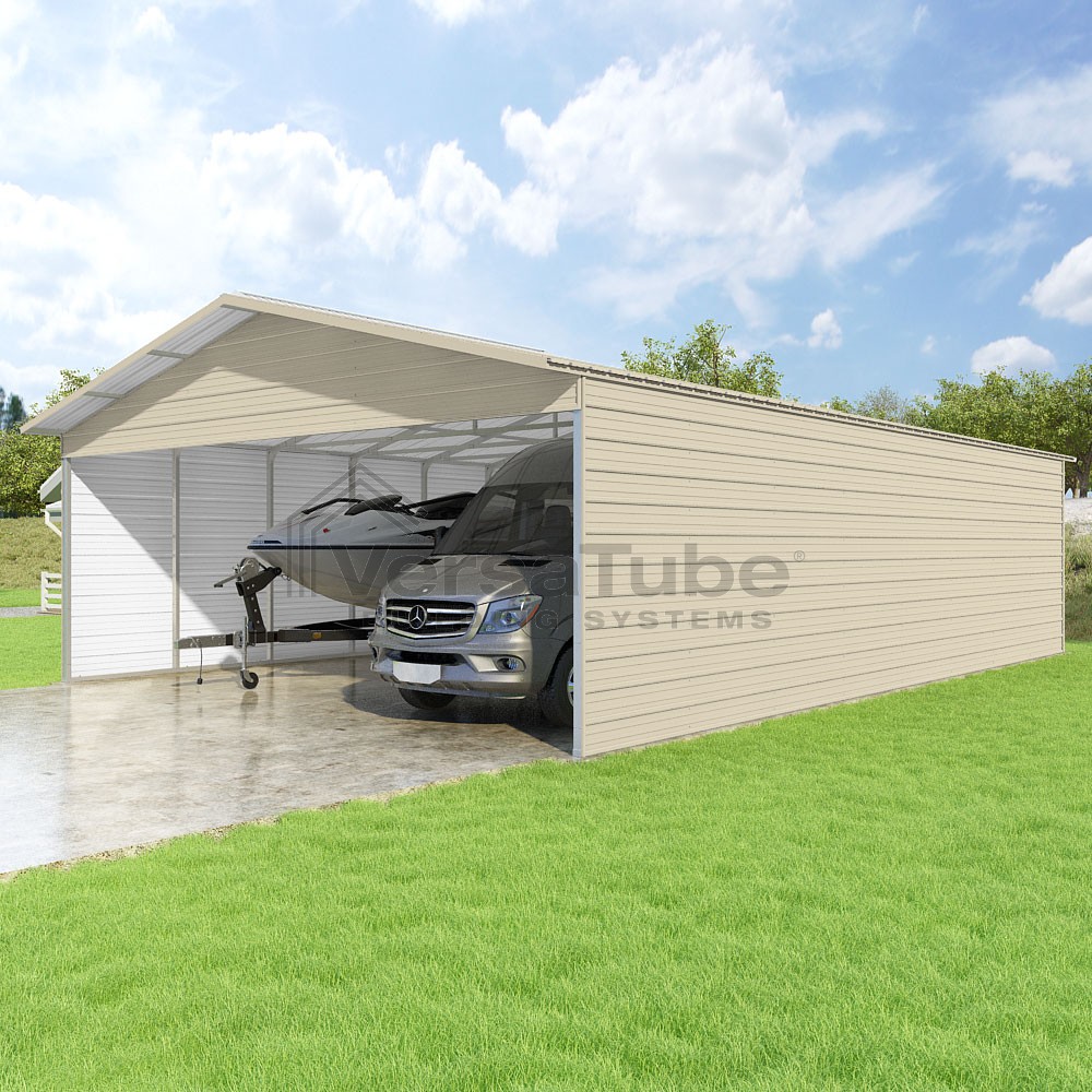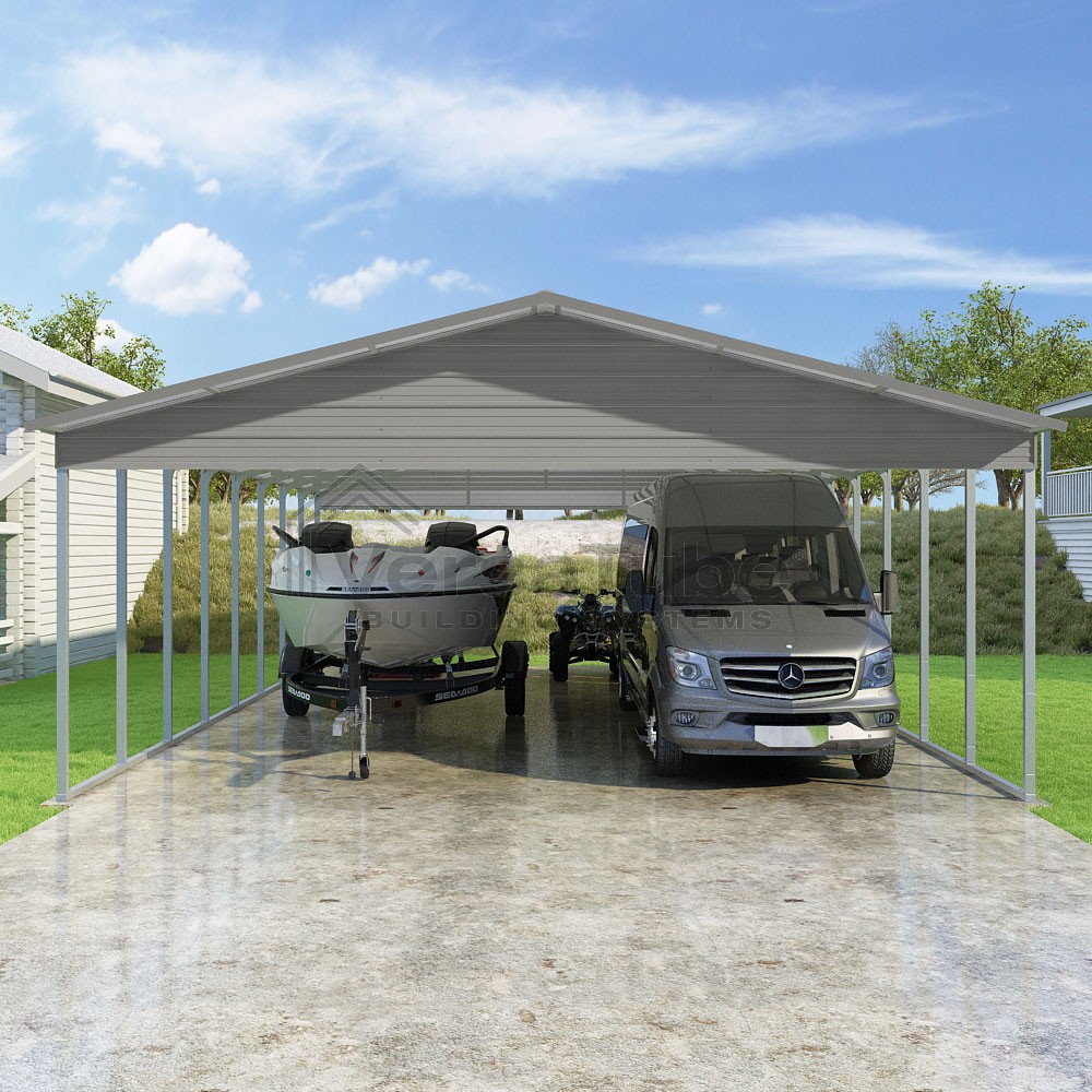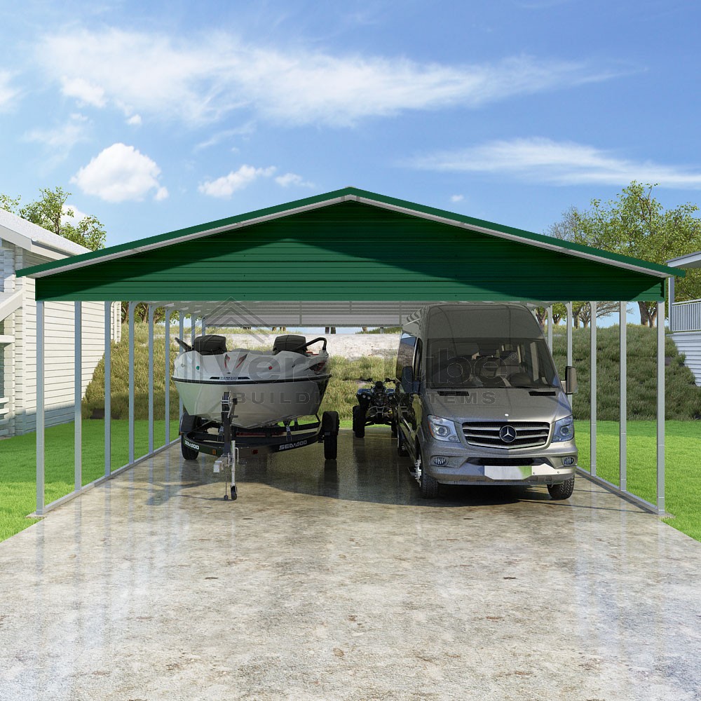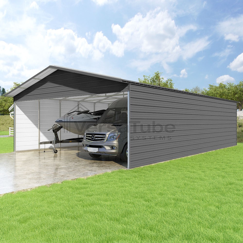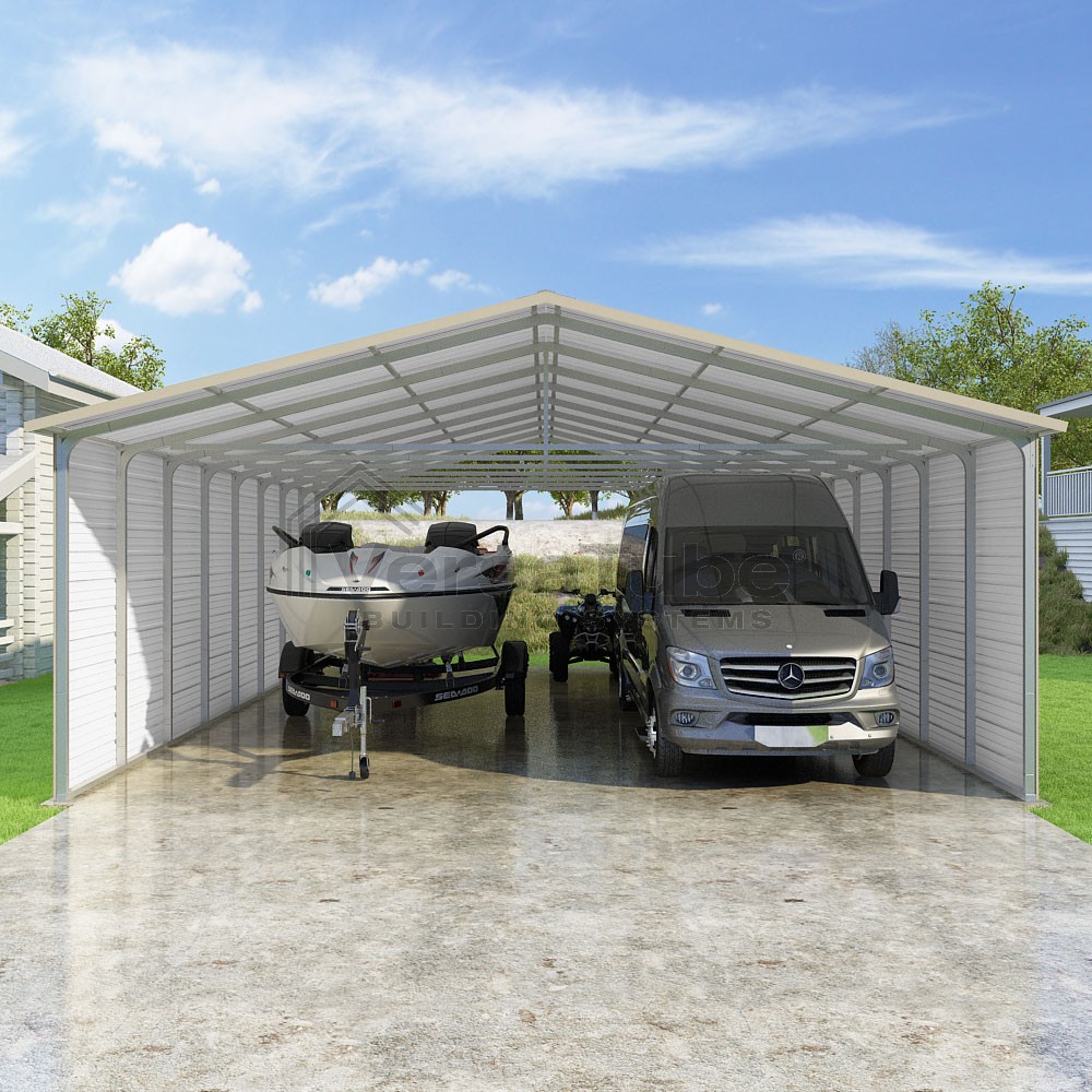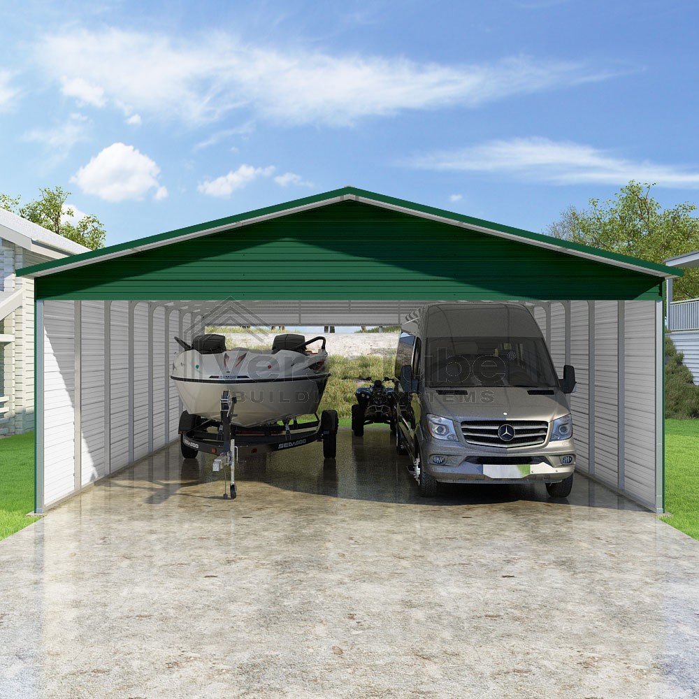 Pinnacle Series DIY carport kit features vertical sheet metal roof panels with ridge cap, gable and eave trim for an A-frame roof style and extended coverage on both ends.