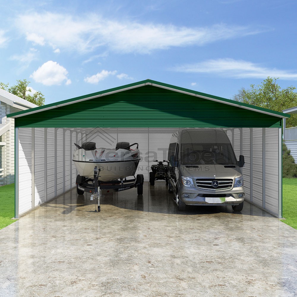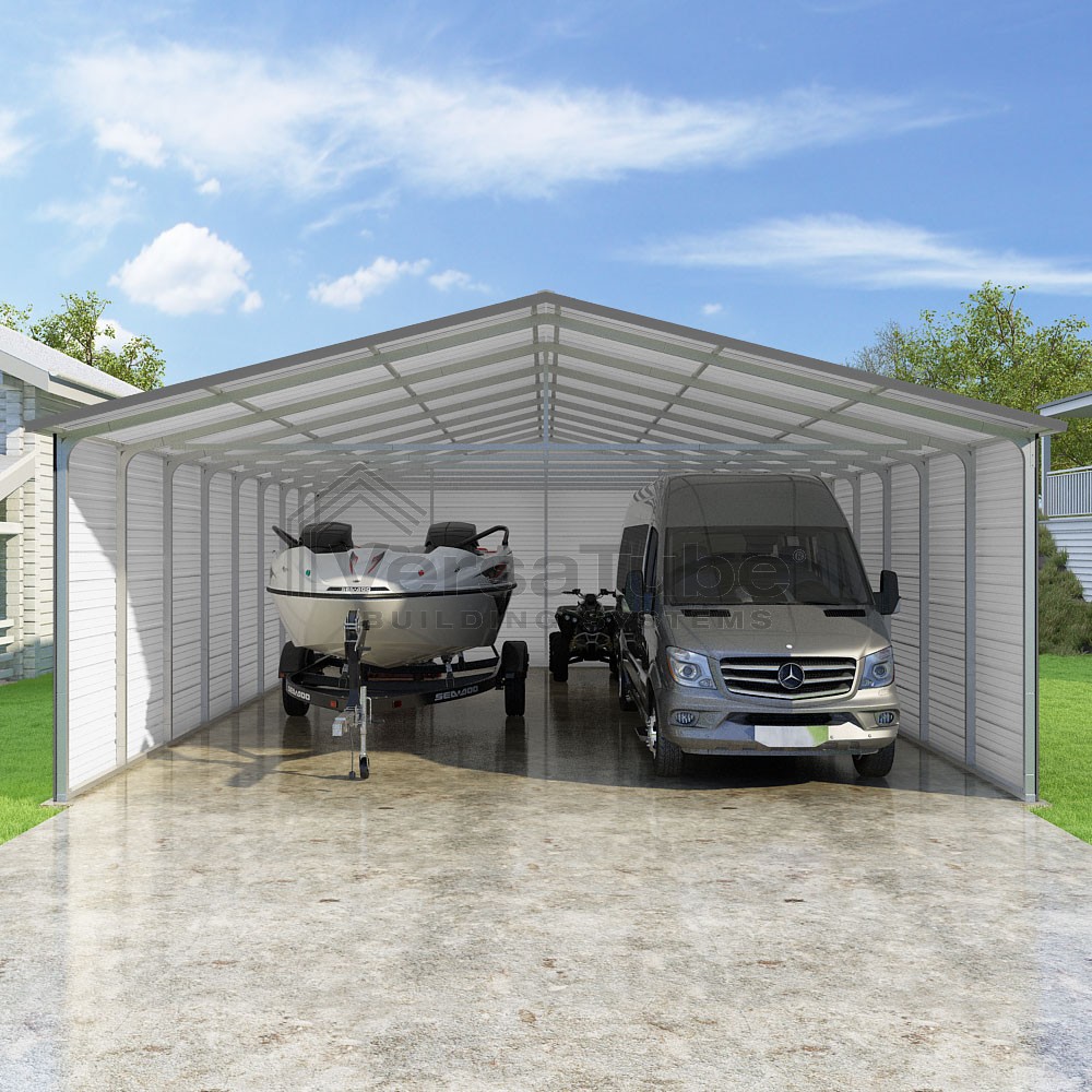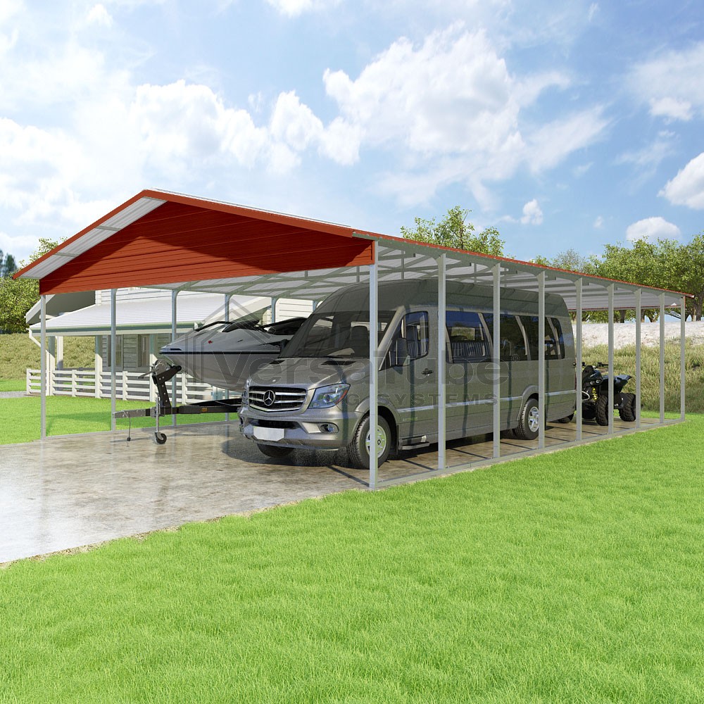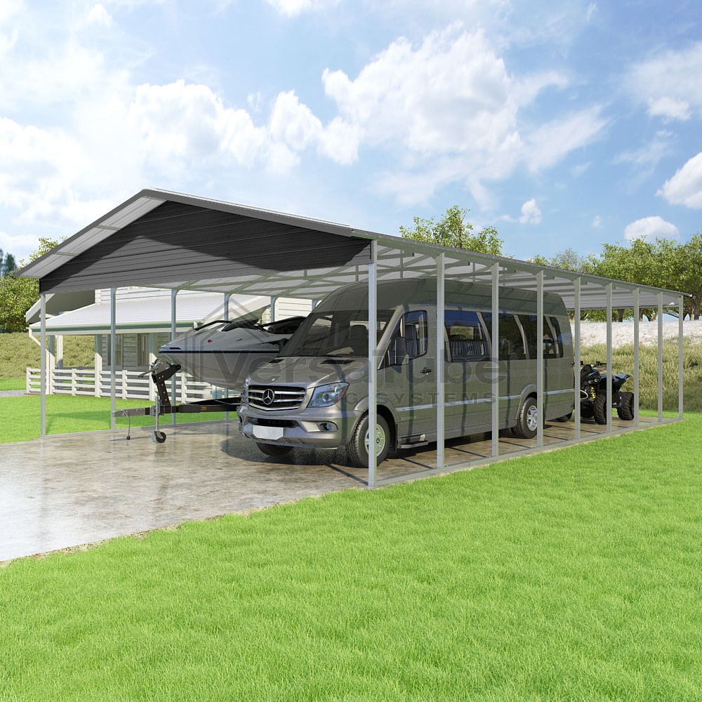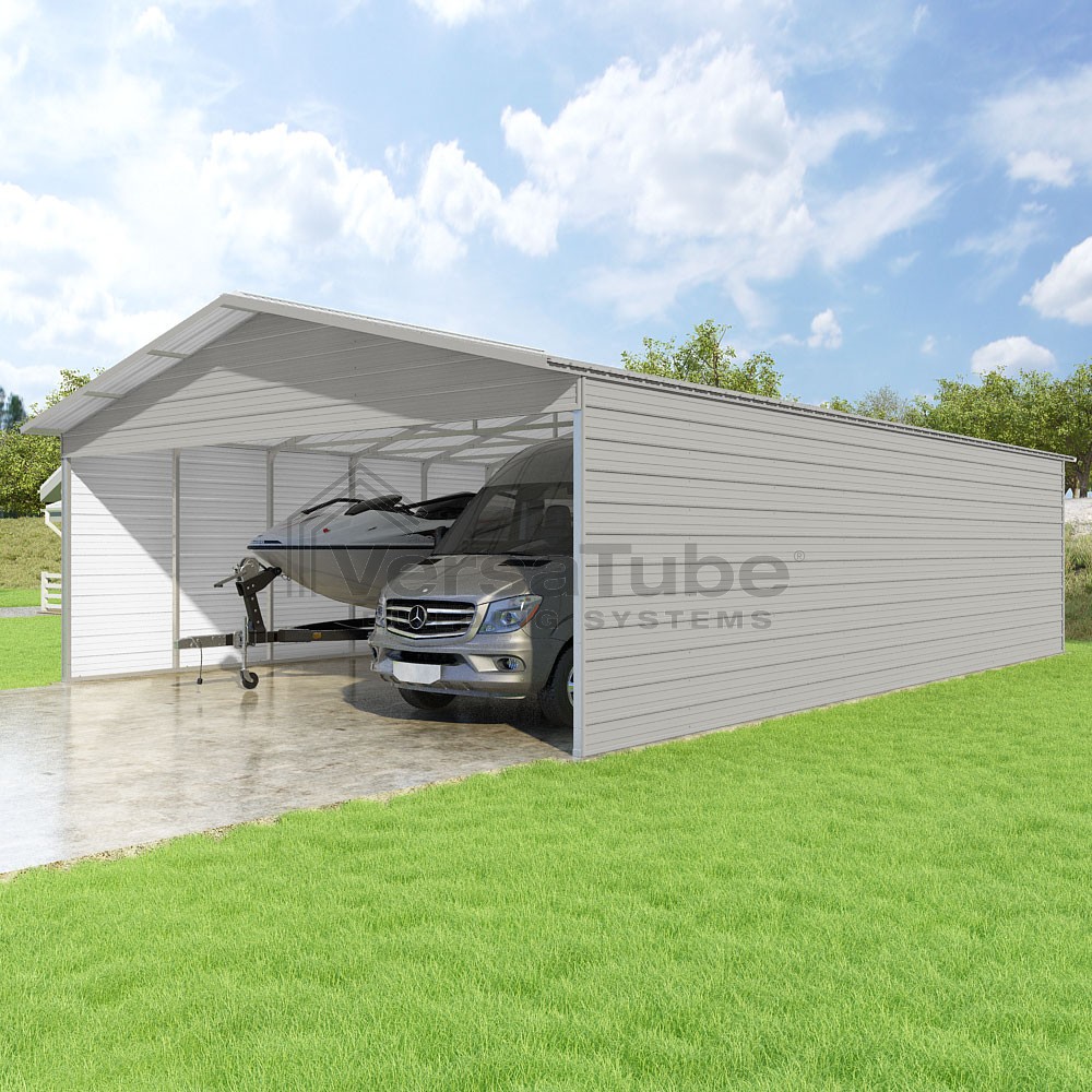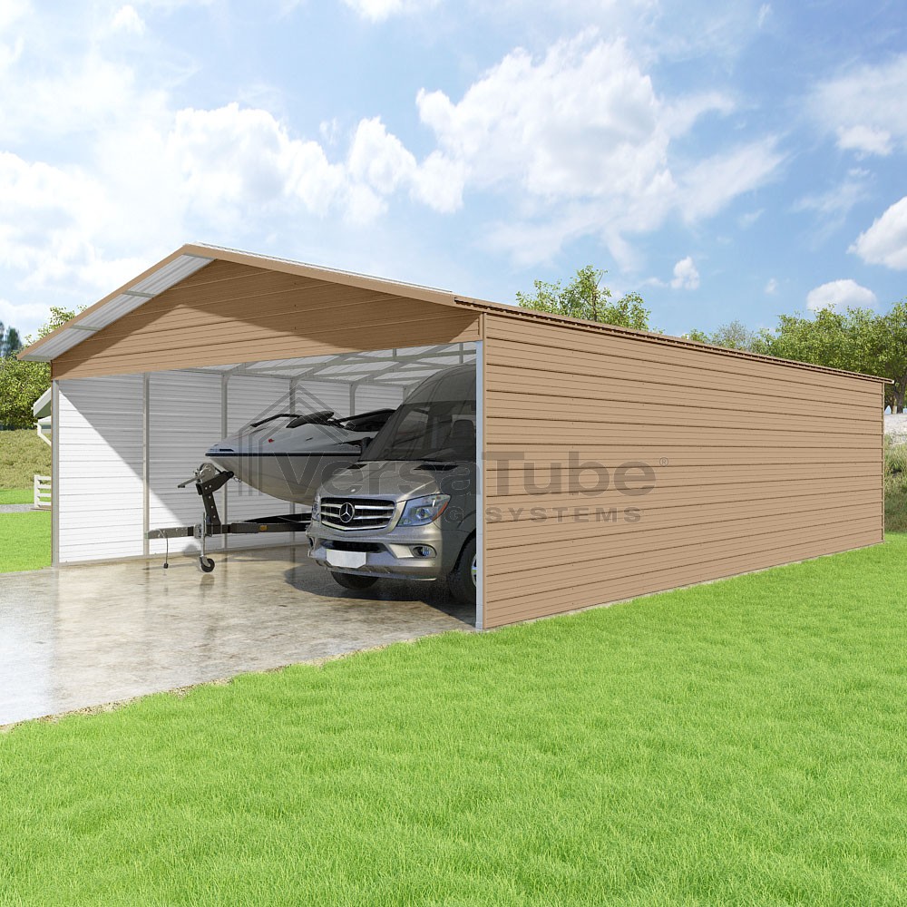 Pinnacle Series DIY carport kit features vertical sheet metal roof panels with ridge cap, gable and eave trim for an A-frame roof style and extended coverage on both ends.