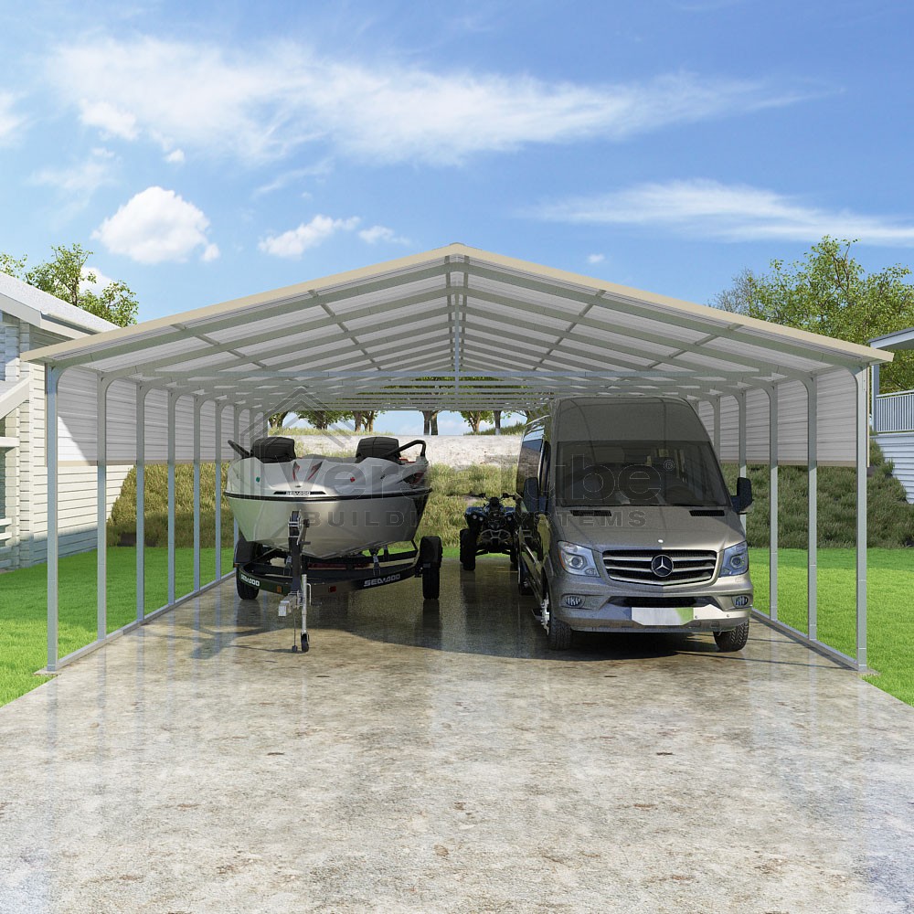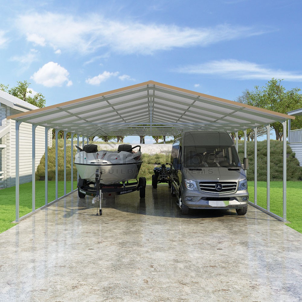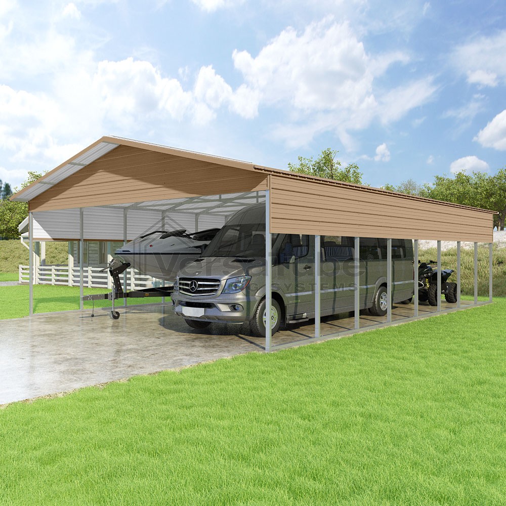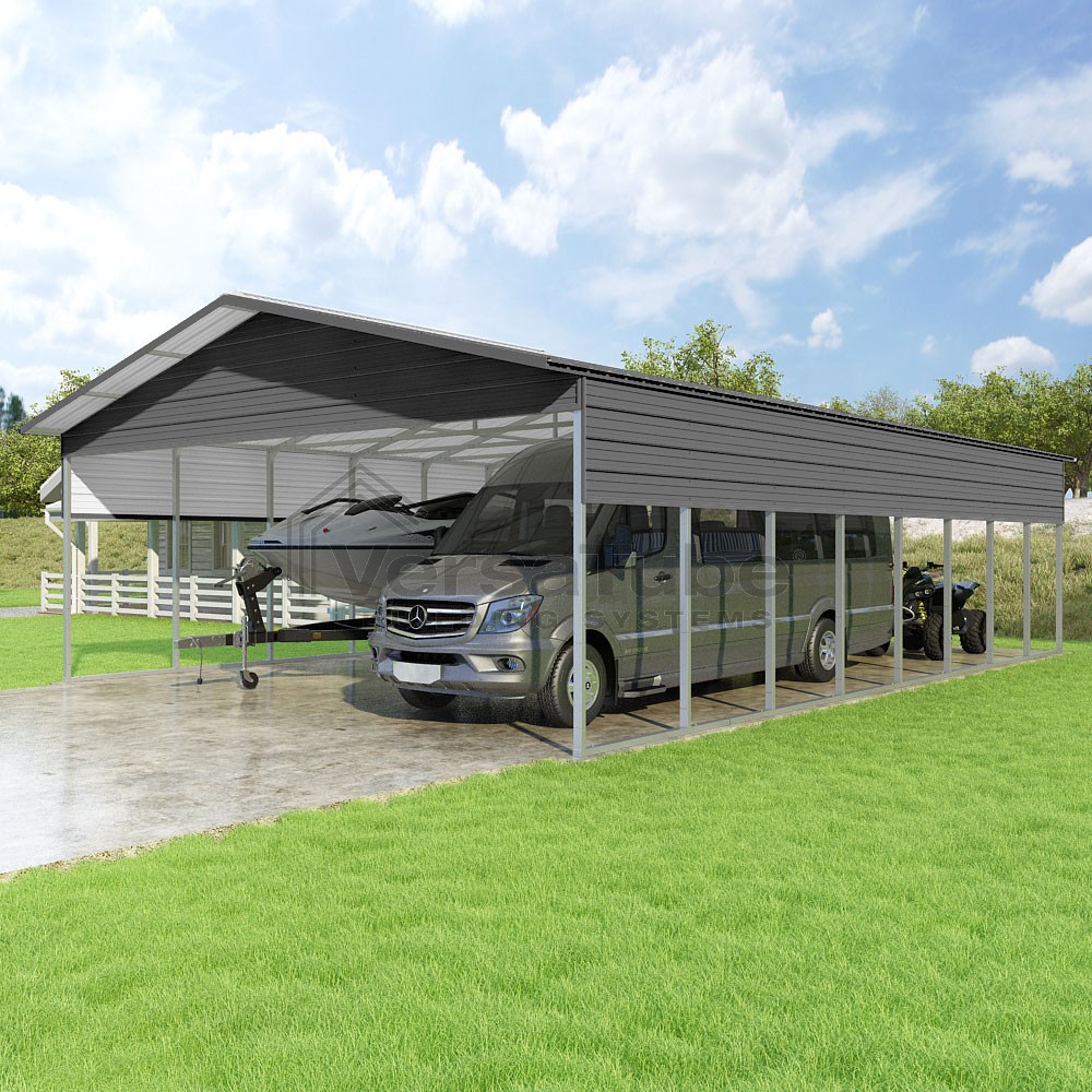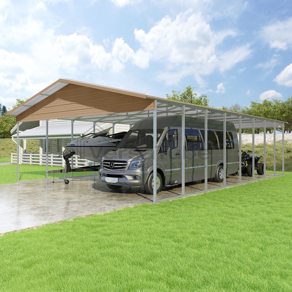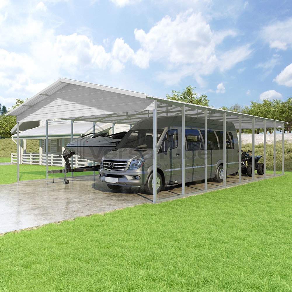 Pinnacle Series DIY carport kit features vertical sheet metal roof panels with ridge cap, gable and eave trim for an A-frame roof style and extended coverage on both ends.