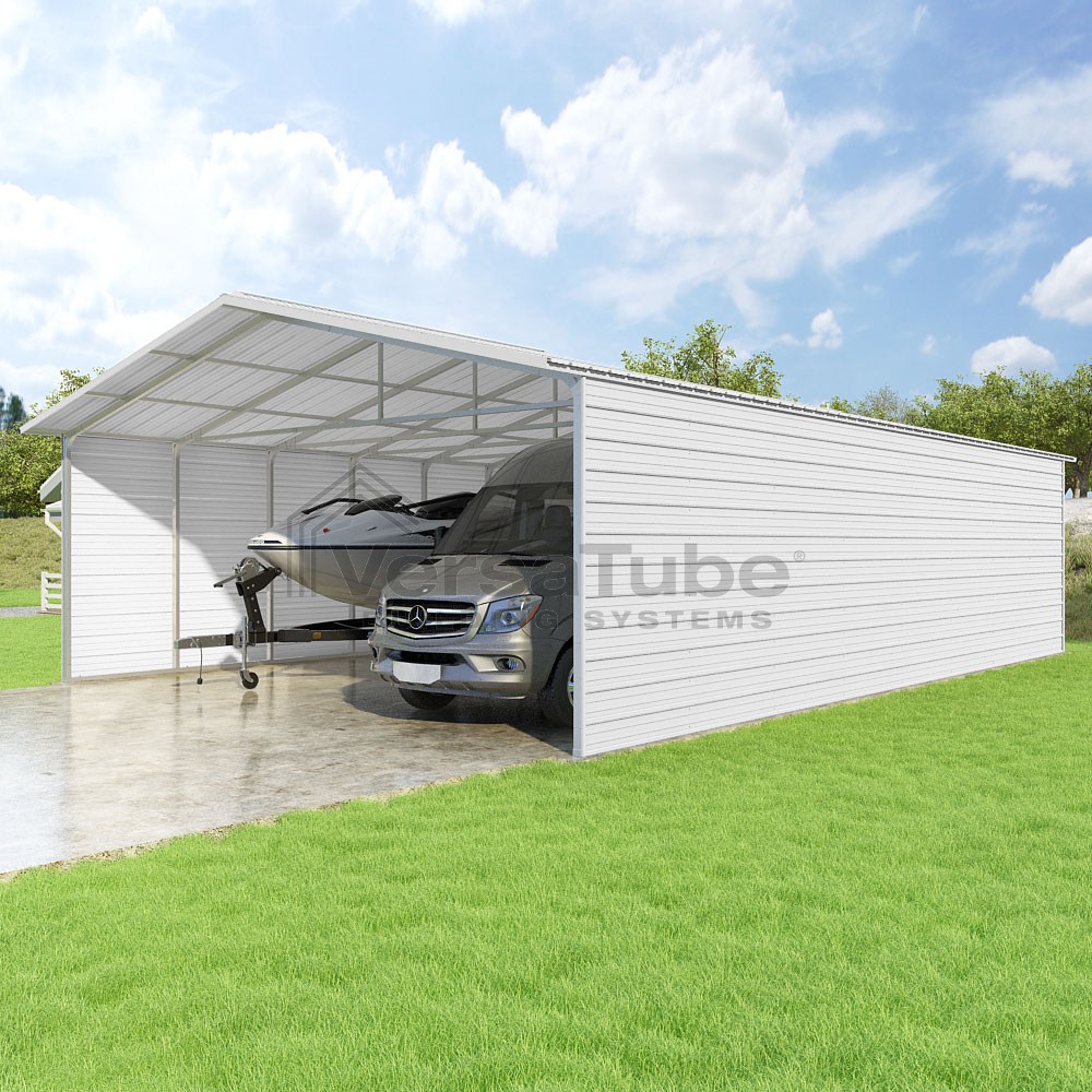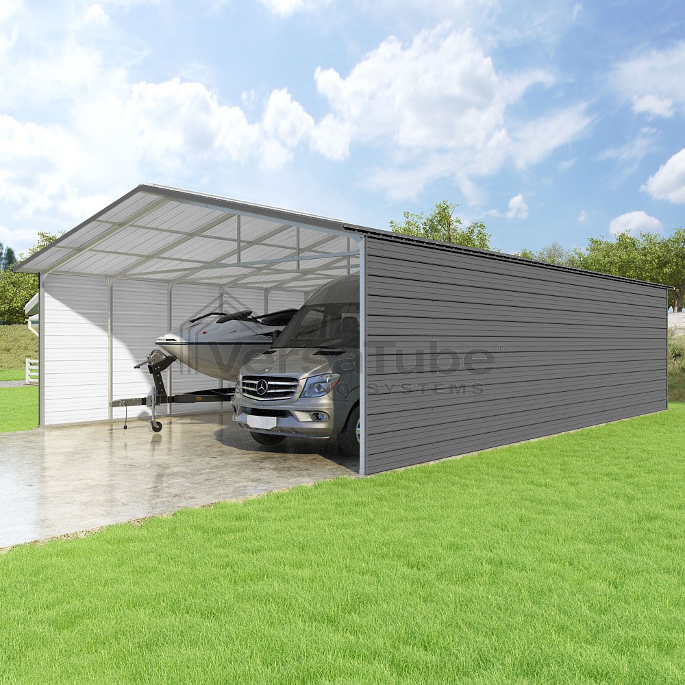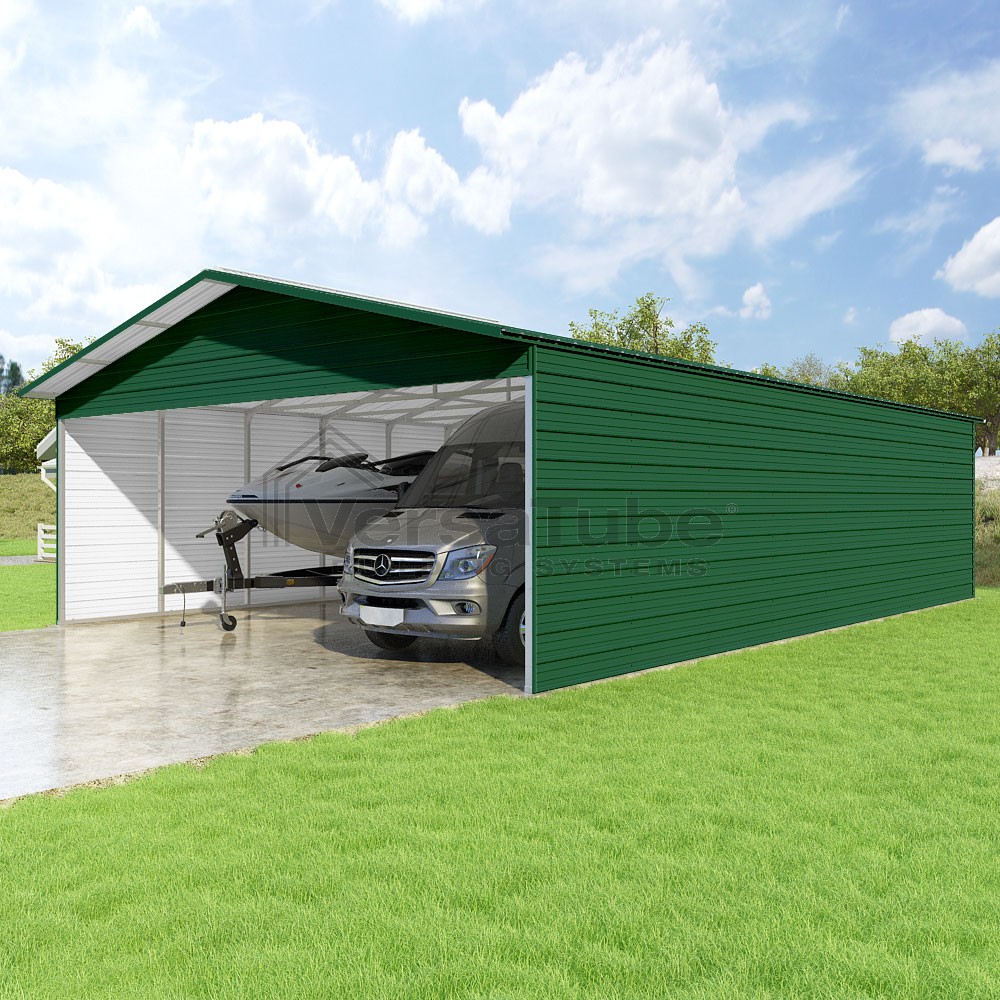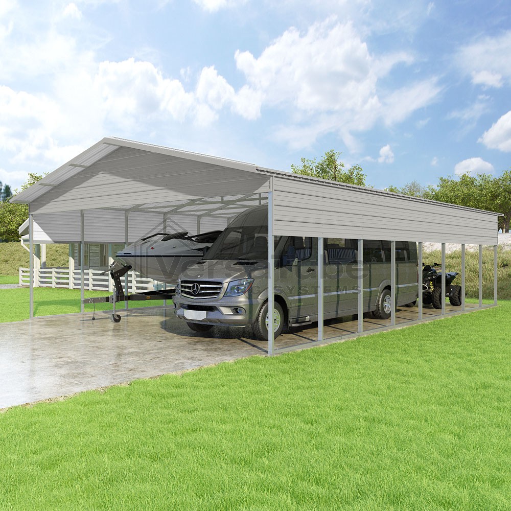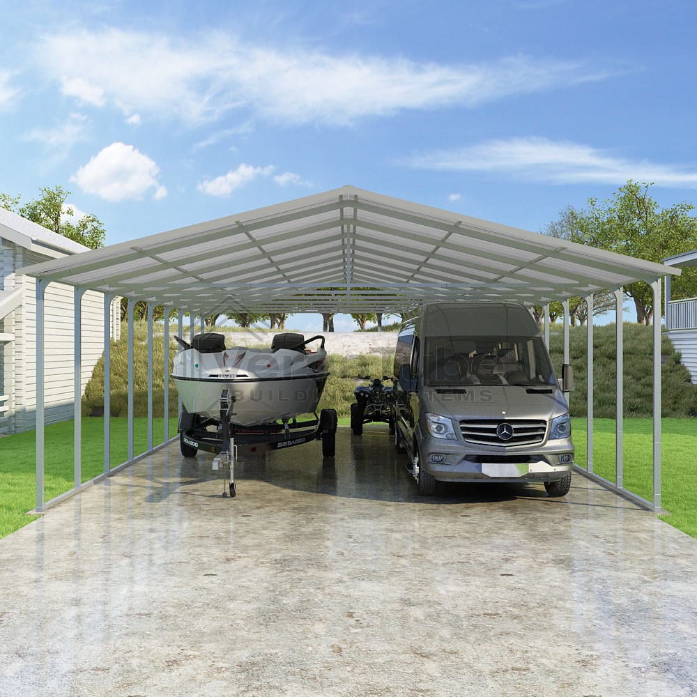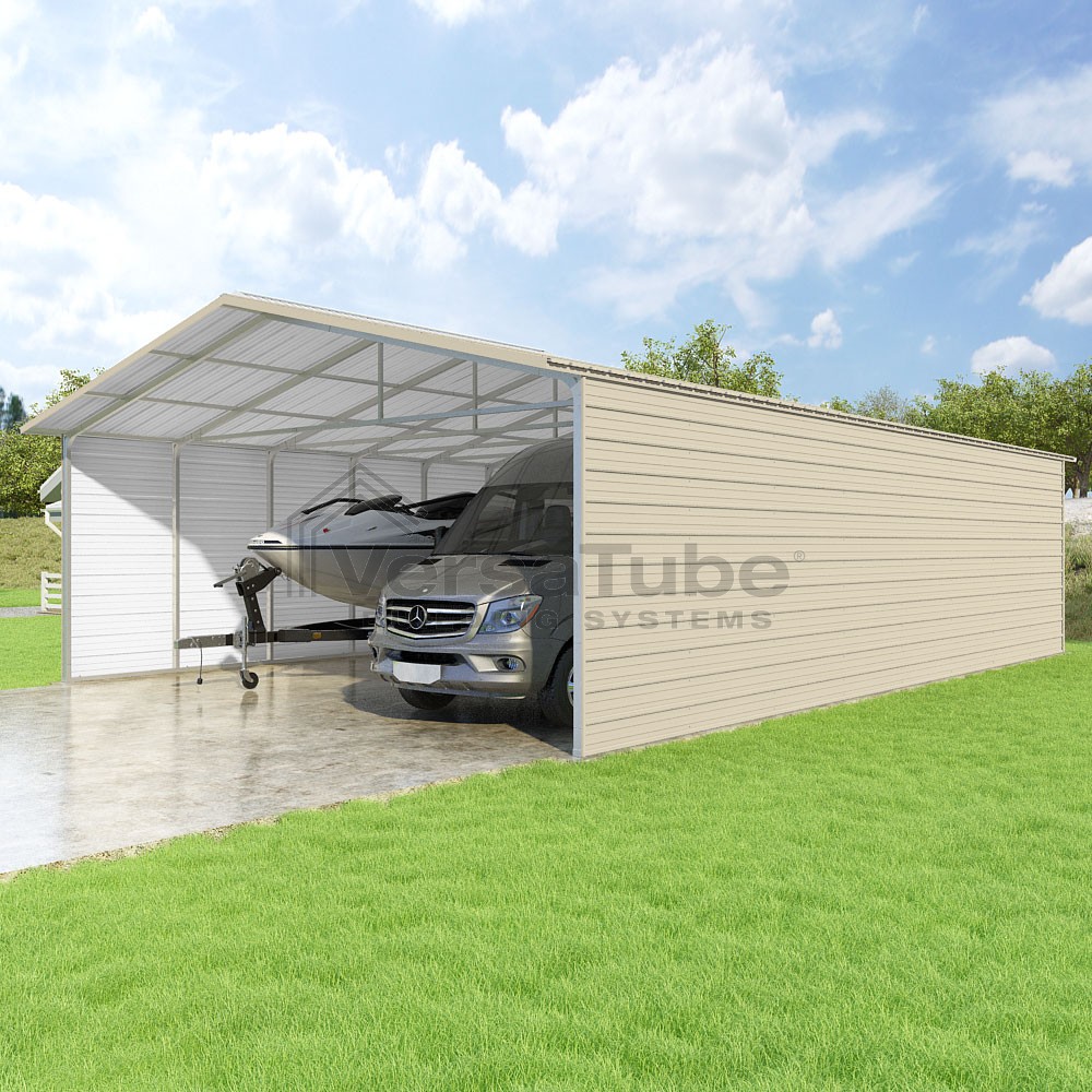 Pinnacle Series DIY carport kit features vertical sheet metal roof panels with ridge cap, gable and eave trim for an A-frame roof style and extended coverage on both ends.