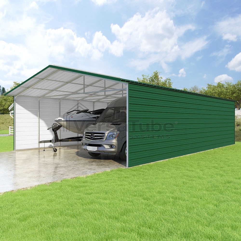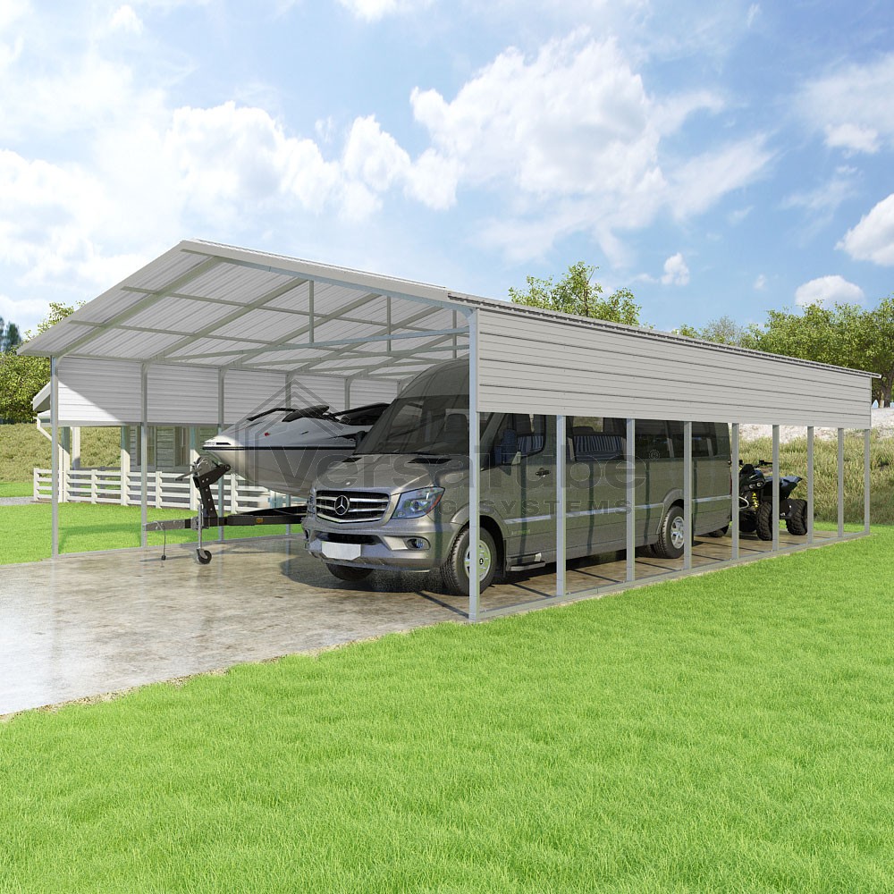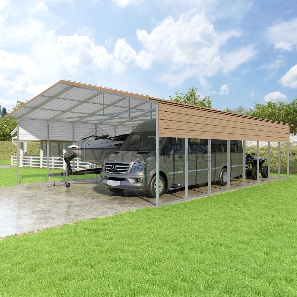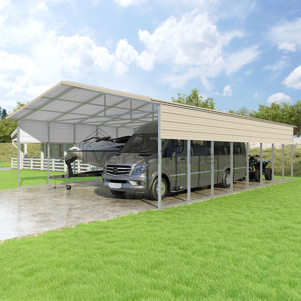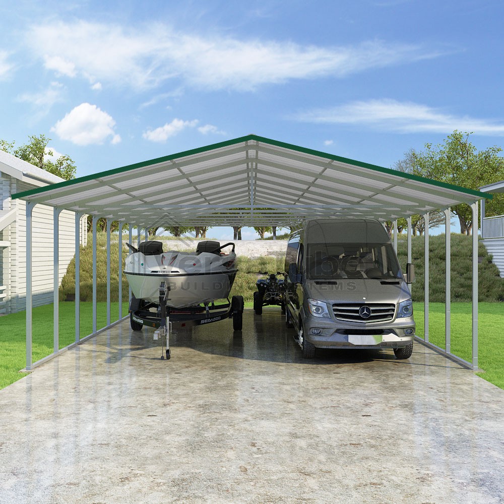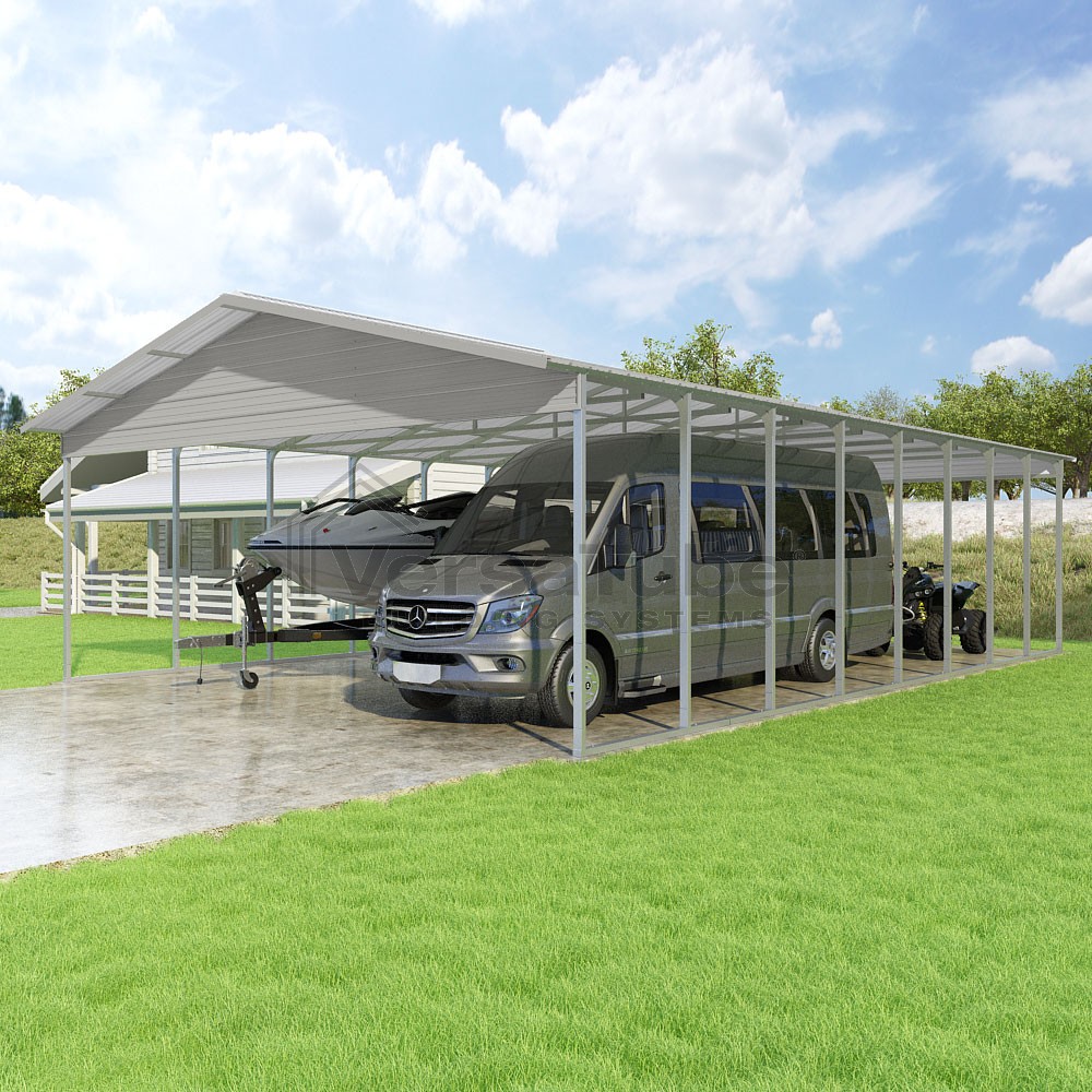 Pinnacle Series DIY carport kit features vertical sheet metal roof panels with ridge cap, gable and eave trim for an A-frame roof style and extended coverage on both ends.