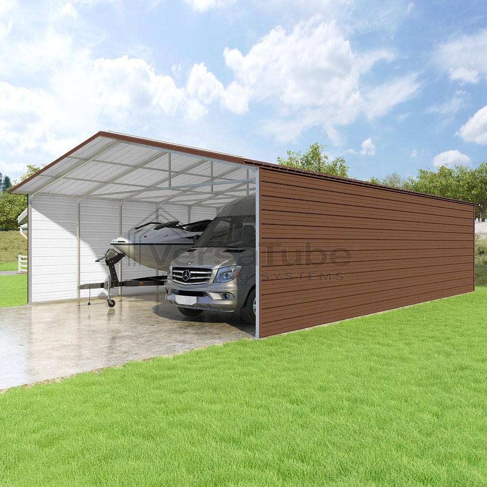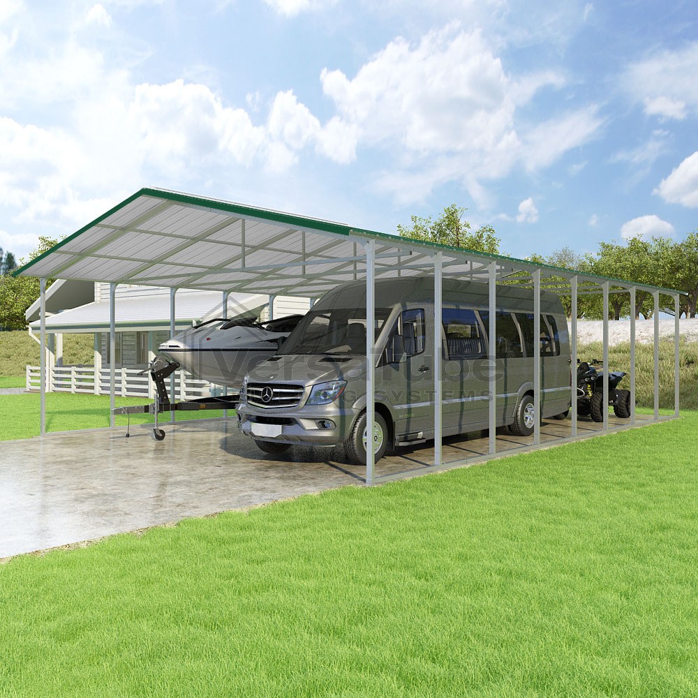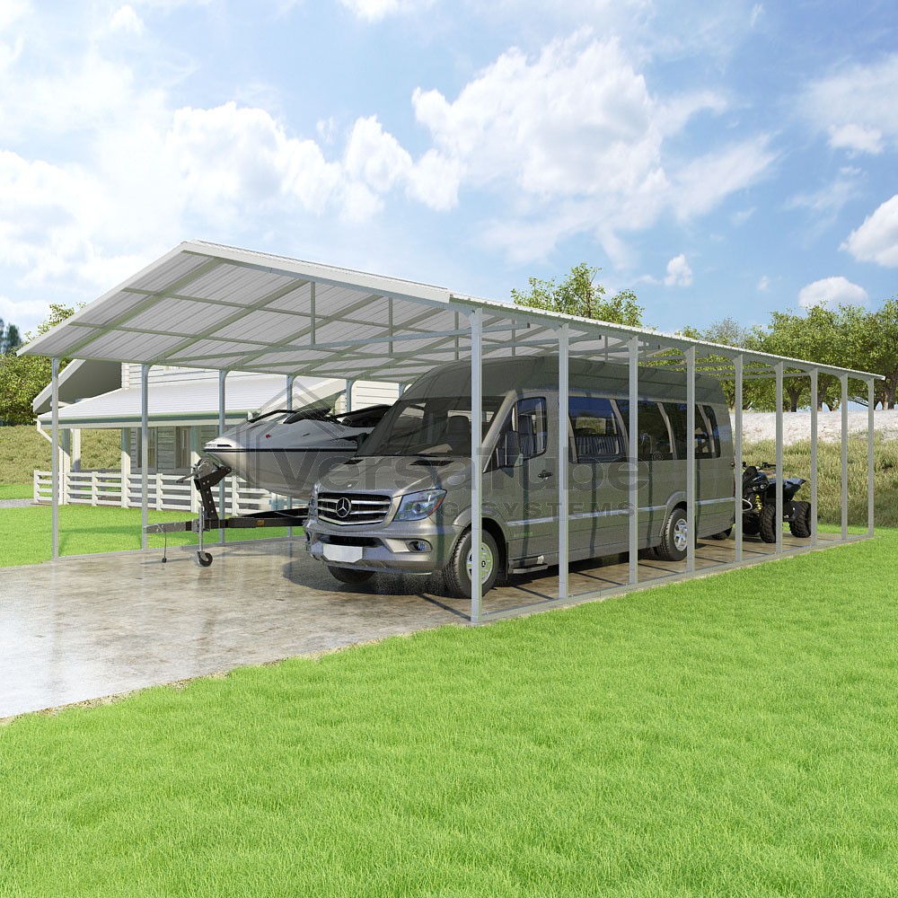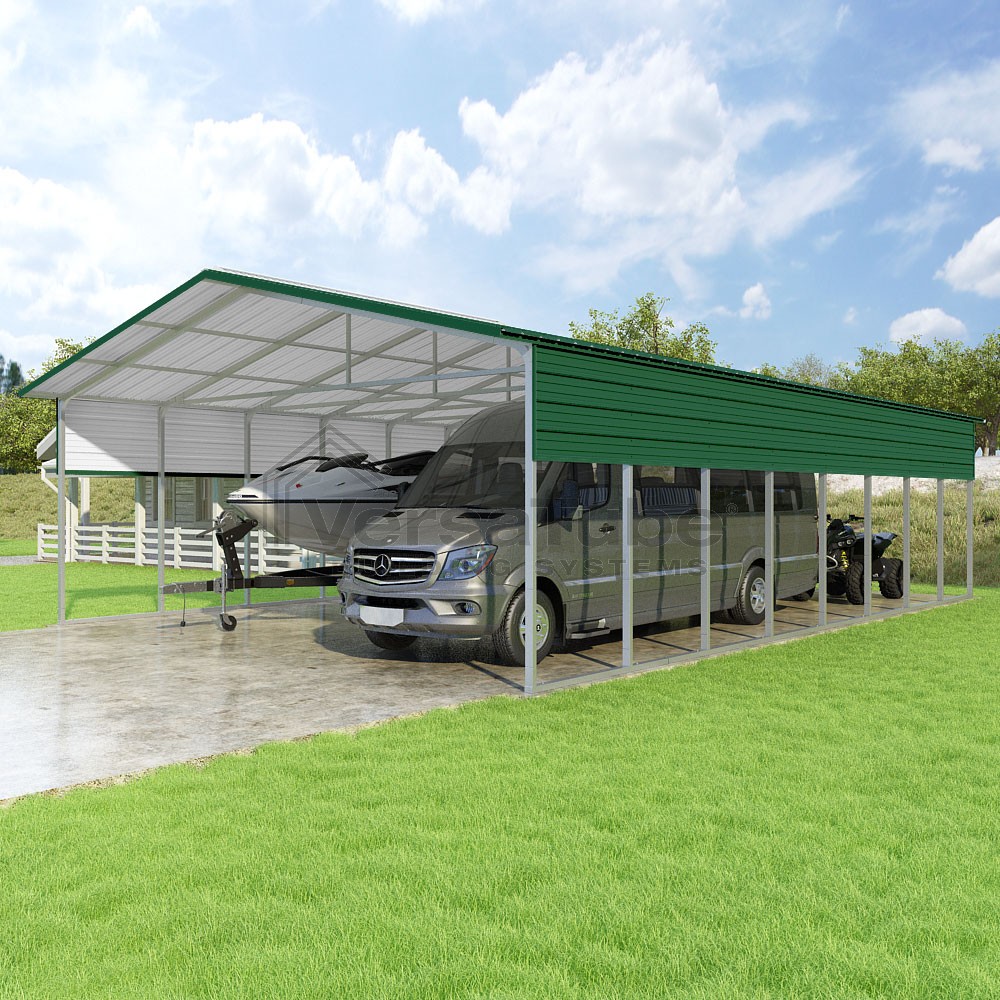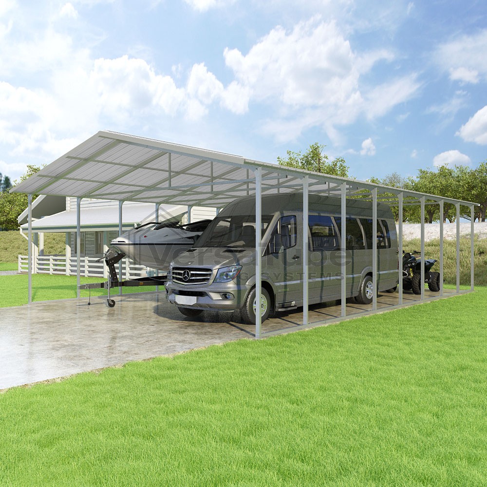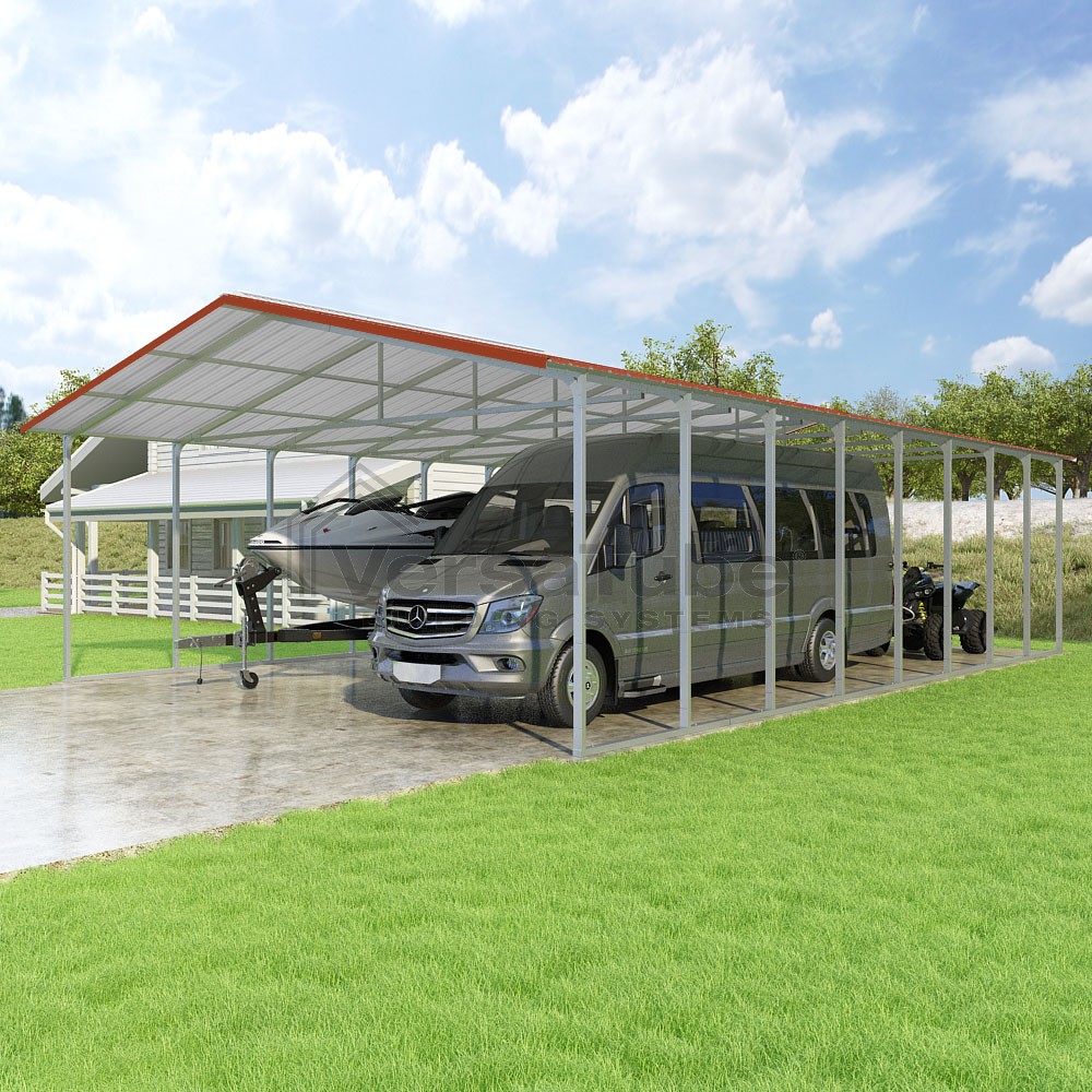 Pinnacle Series DIY carport kit features vertical sheet metal roof panels with ridge cap, gable and eave trim for an A-frame roof style and extended coverage on both ends.