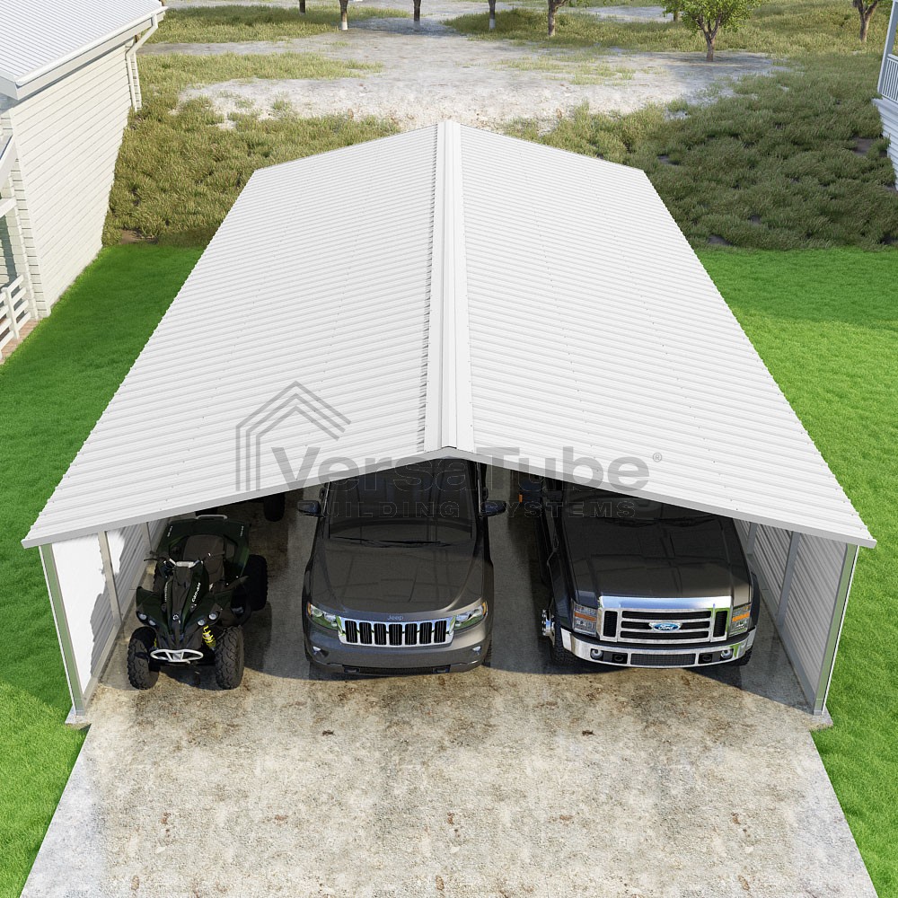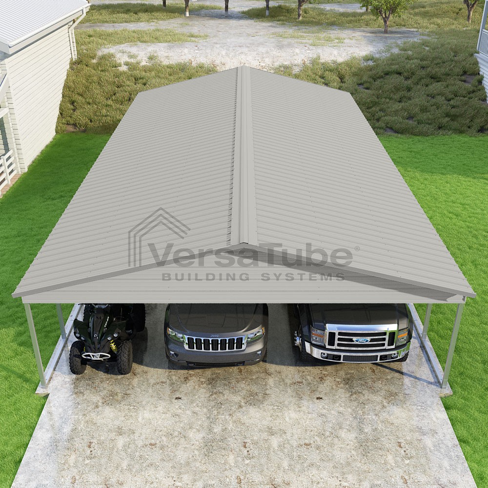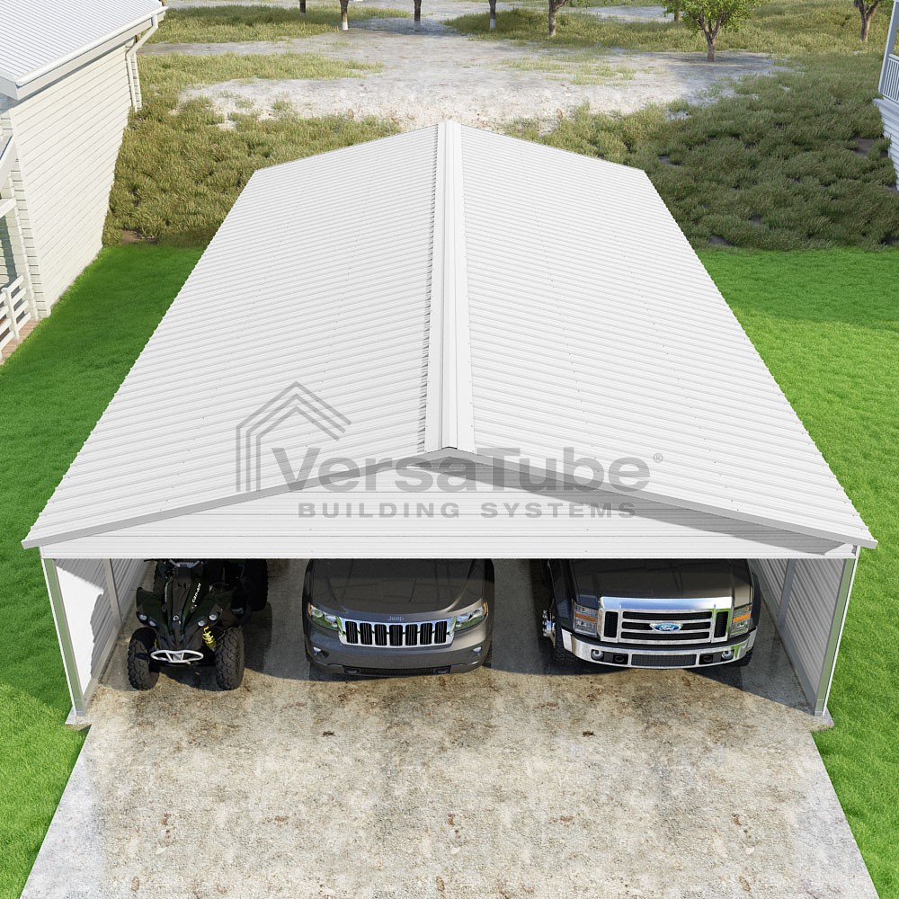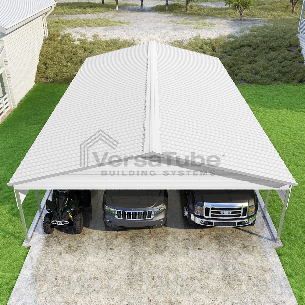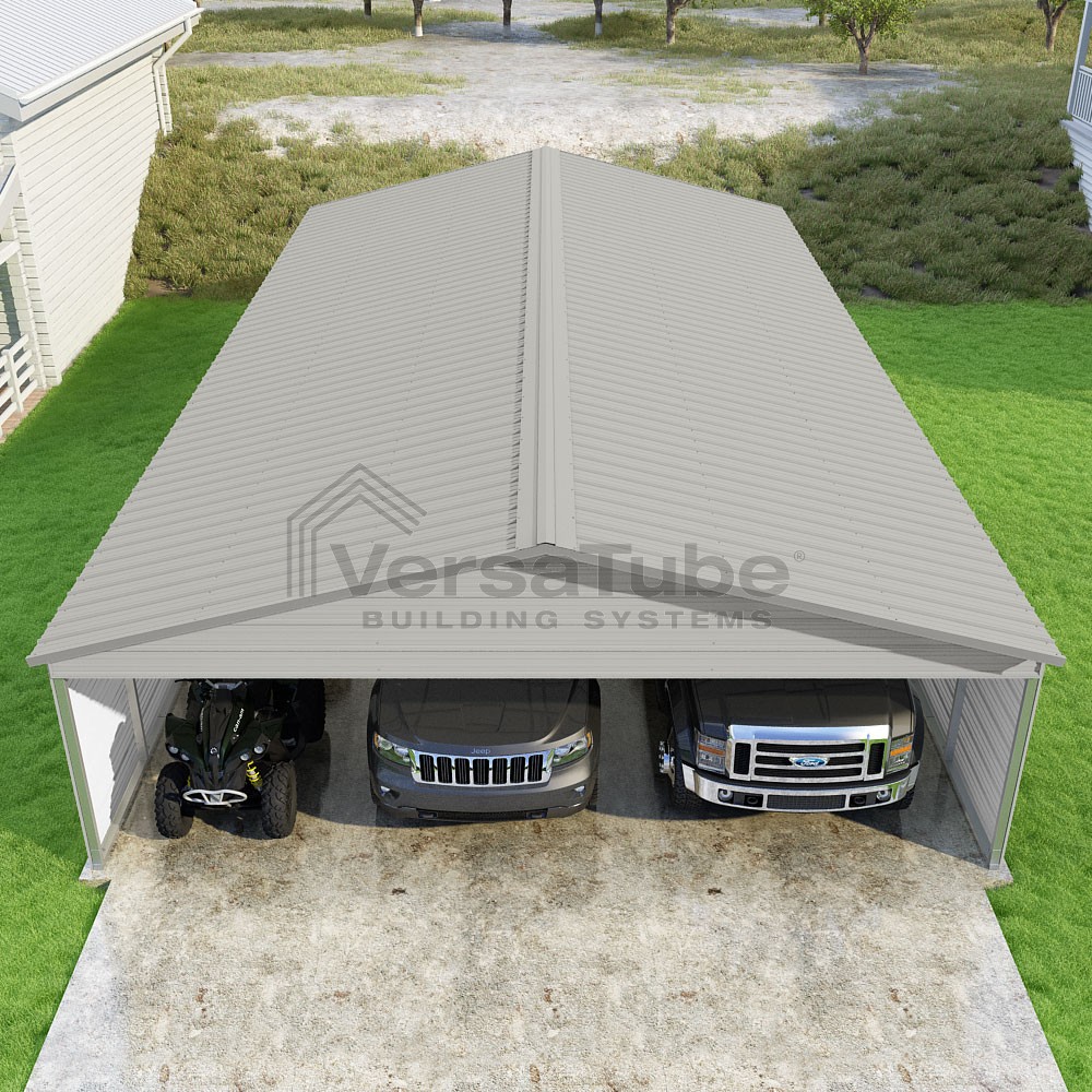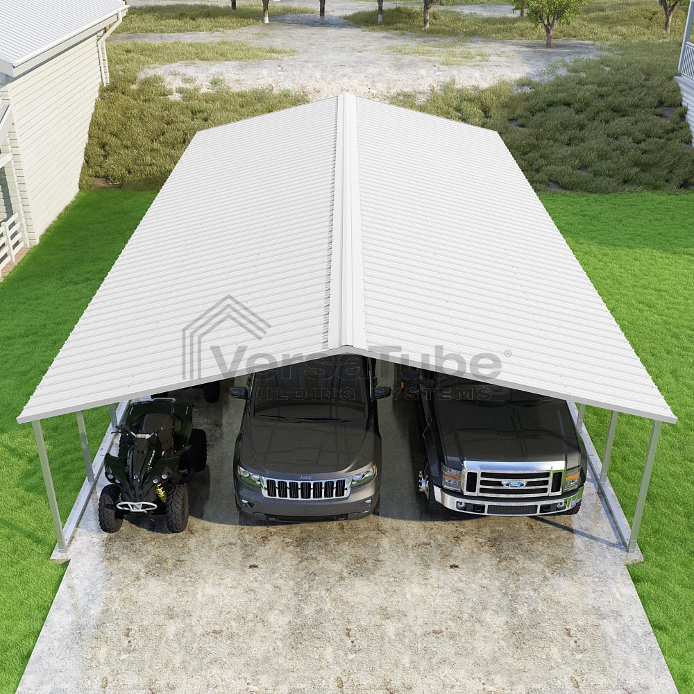Pinnacle Series DIY carport kit features vertical sheet metal roof panels with ridge cap, gable and eave trim for an A-frame roof style and extended coverage on both ends.
