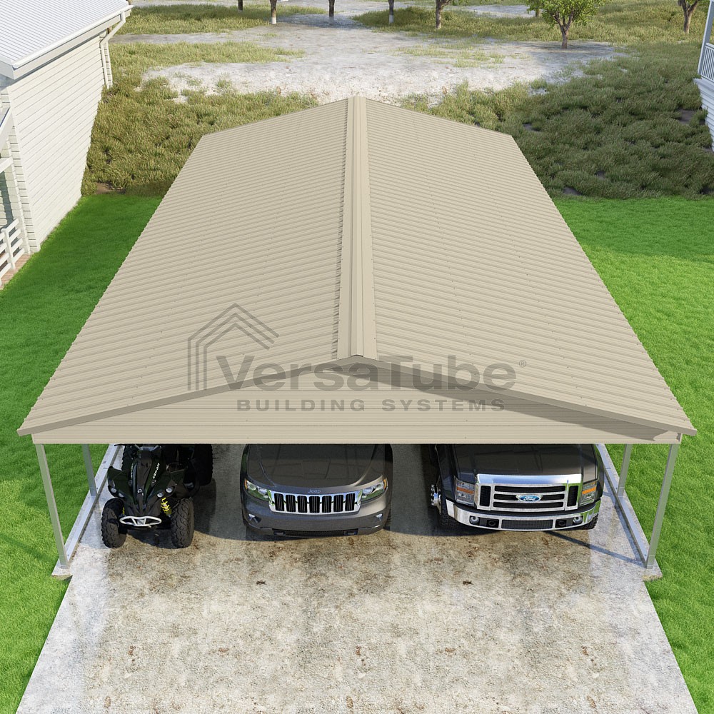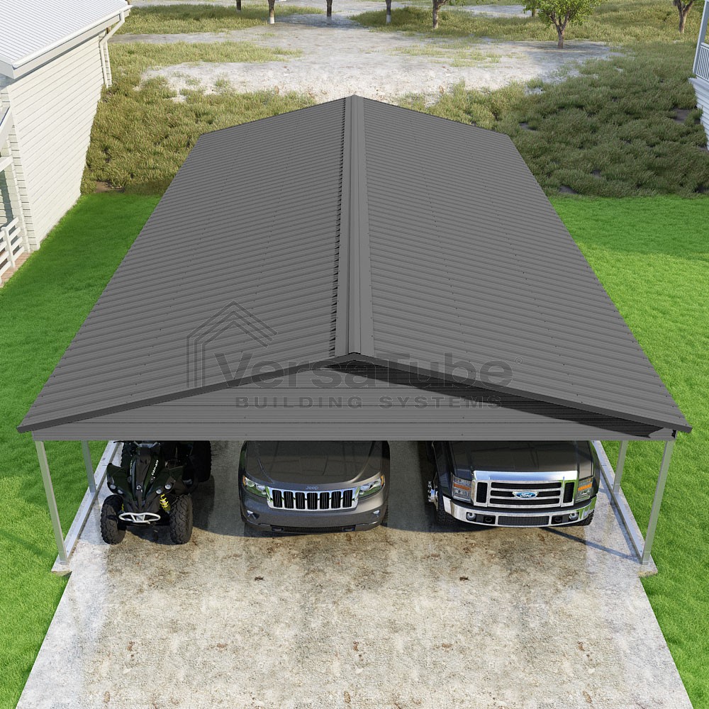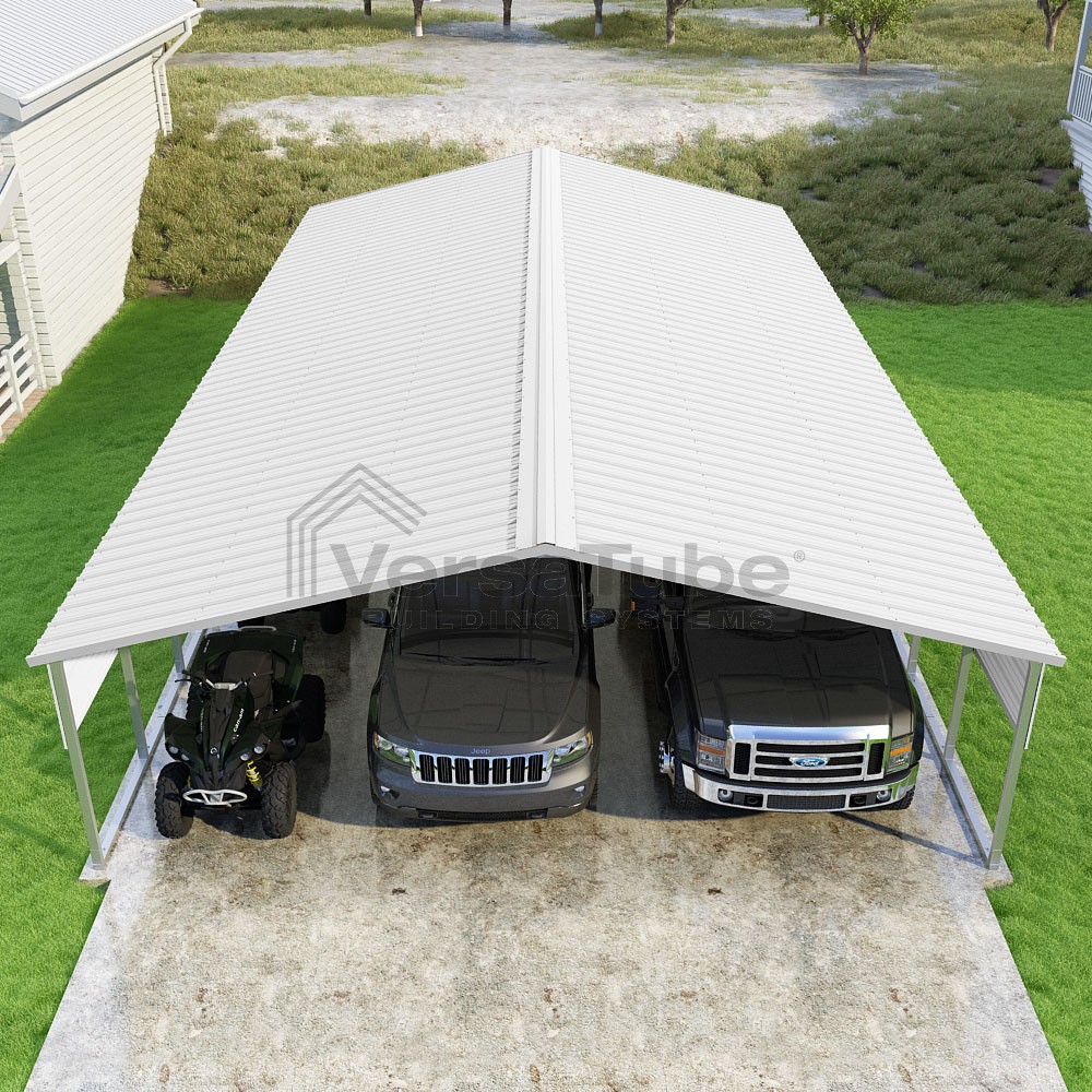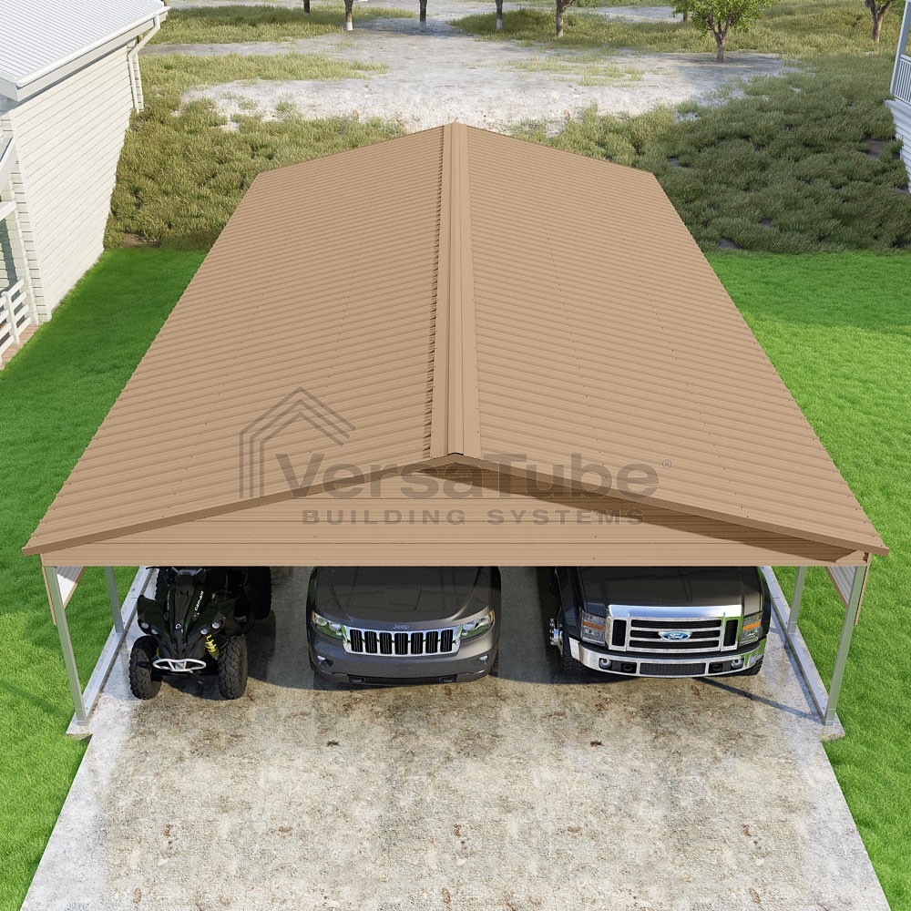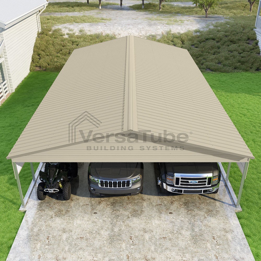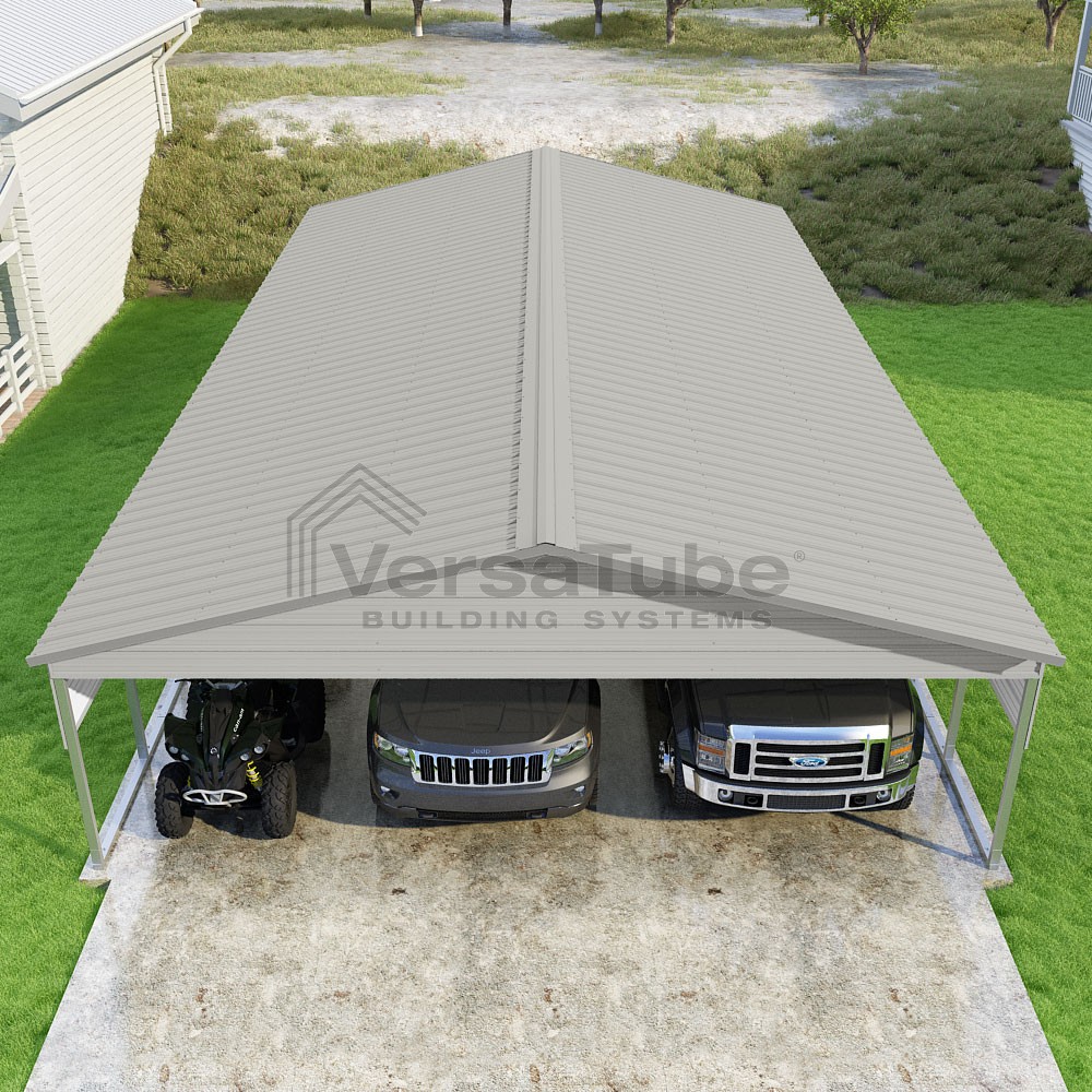 Pinnacle Series DIY carport kit features vertical sheet metal roof panels with ridge cap, gable and eave trim for an A-frame roof style and extended coverage on both ends.
