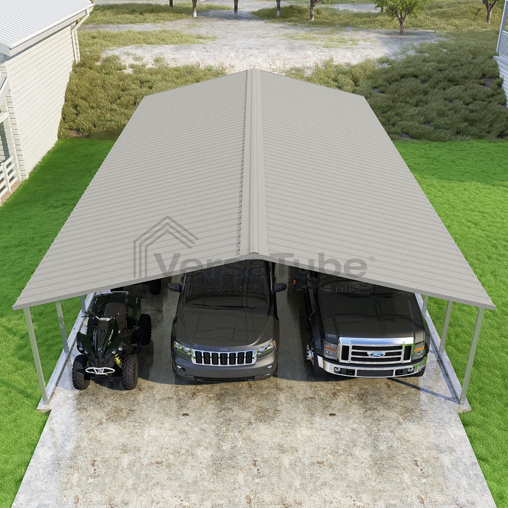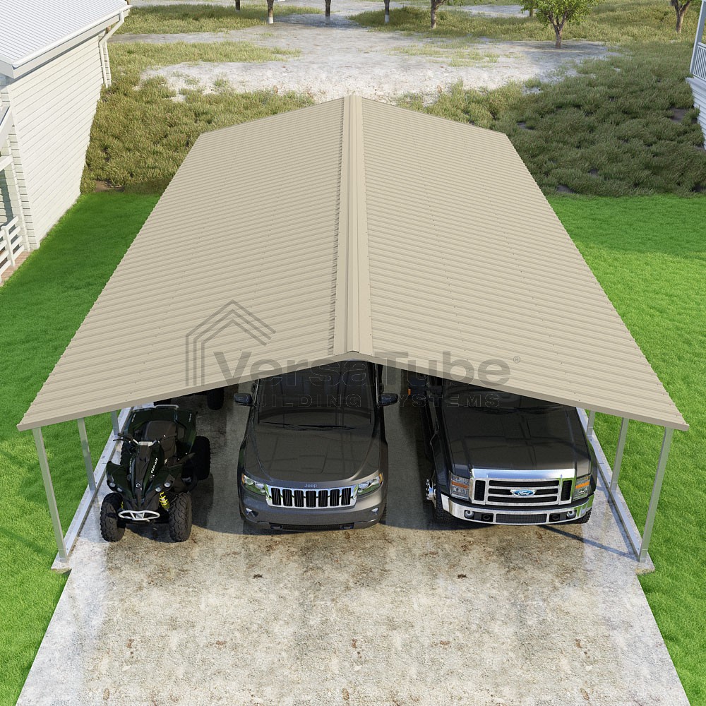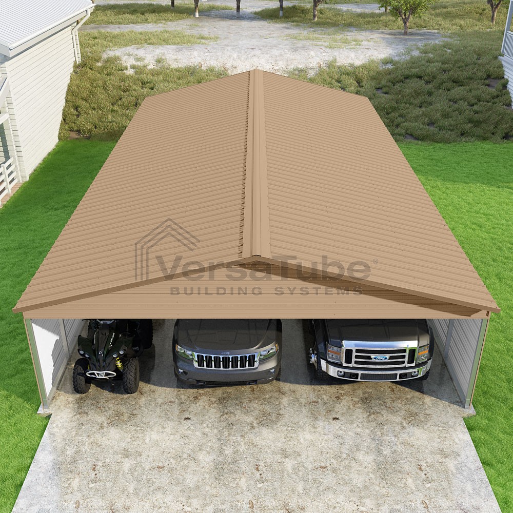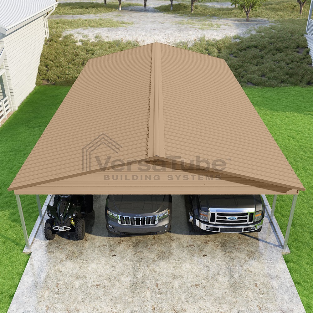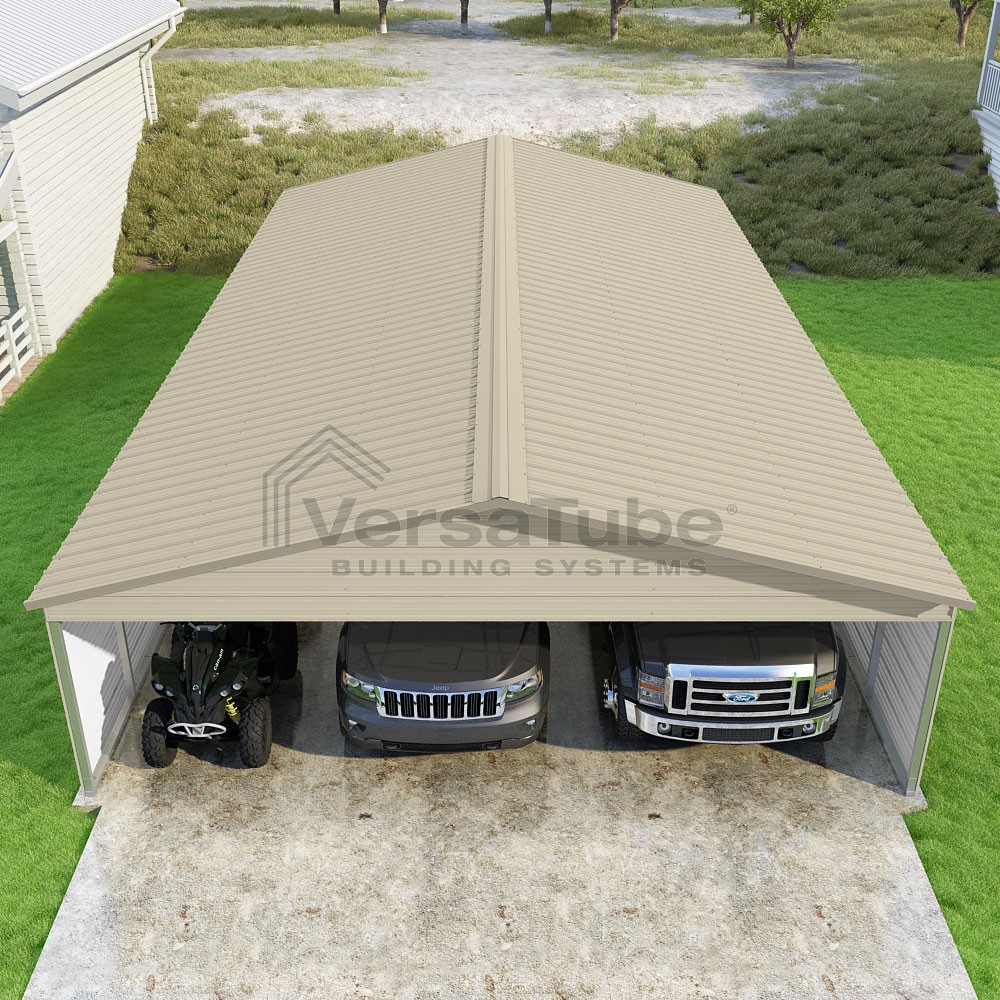 Pinnacle Series DIY carport kit features vertical sheet metal roof panels with ridge cap, gable and eave trim for an A-frame roof style and extended coverage on both ends.