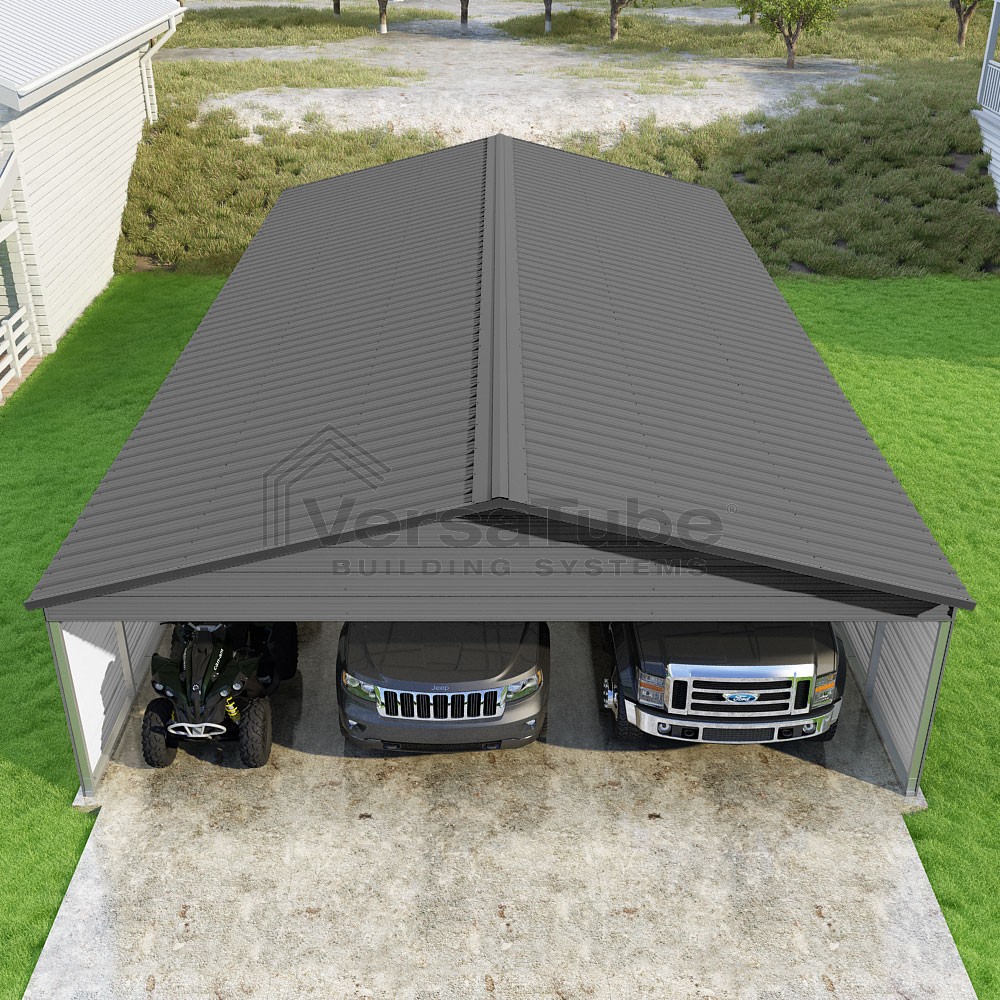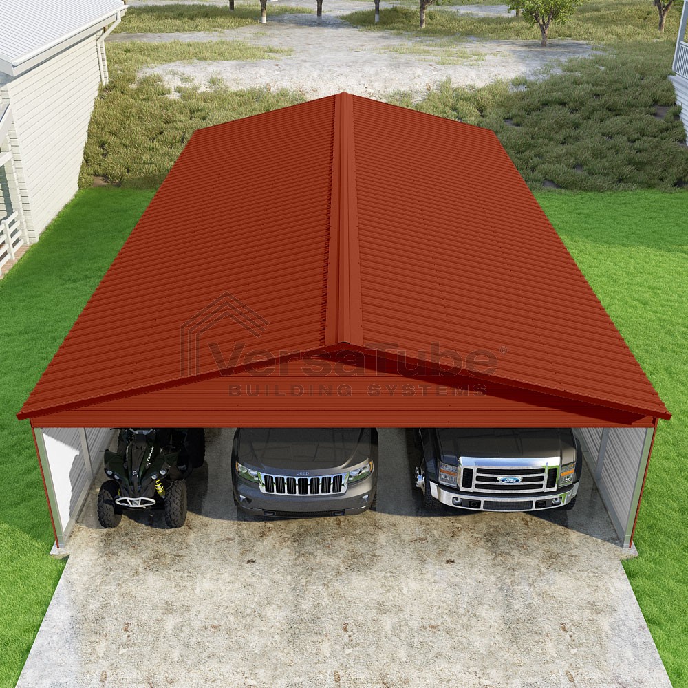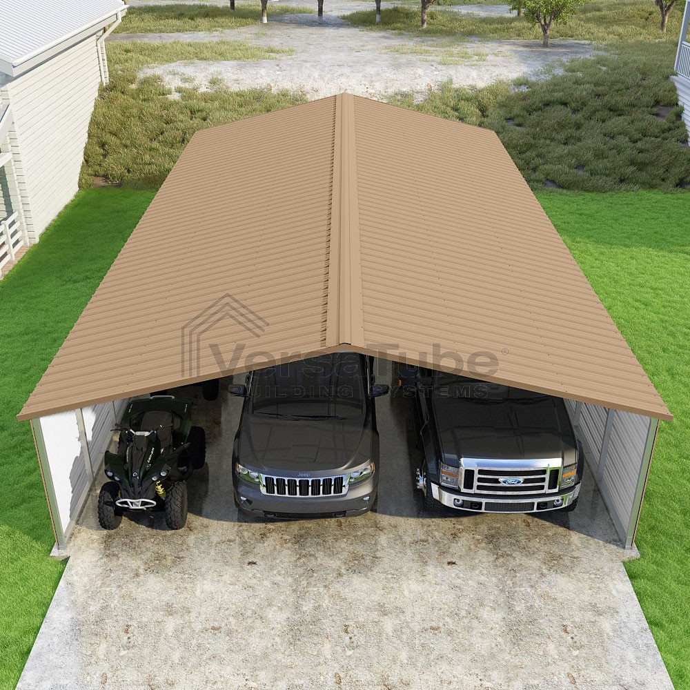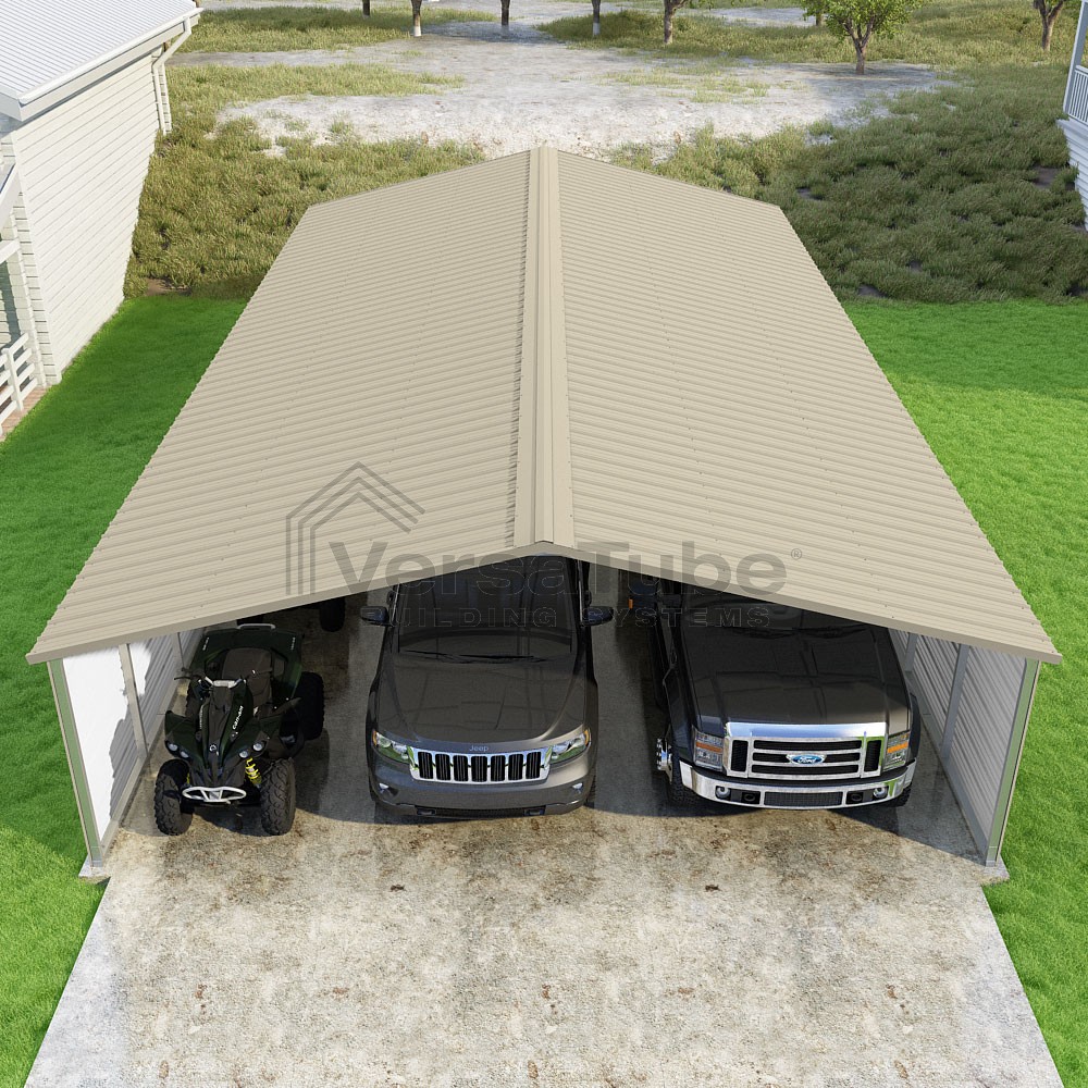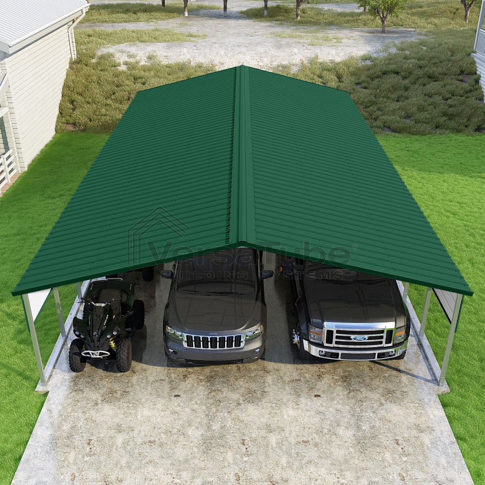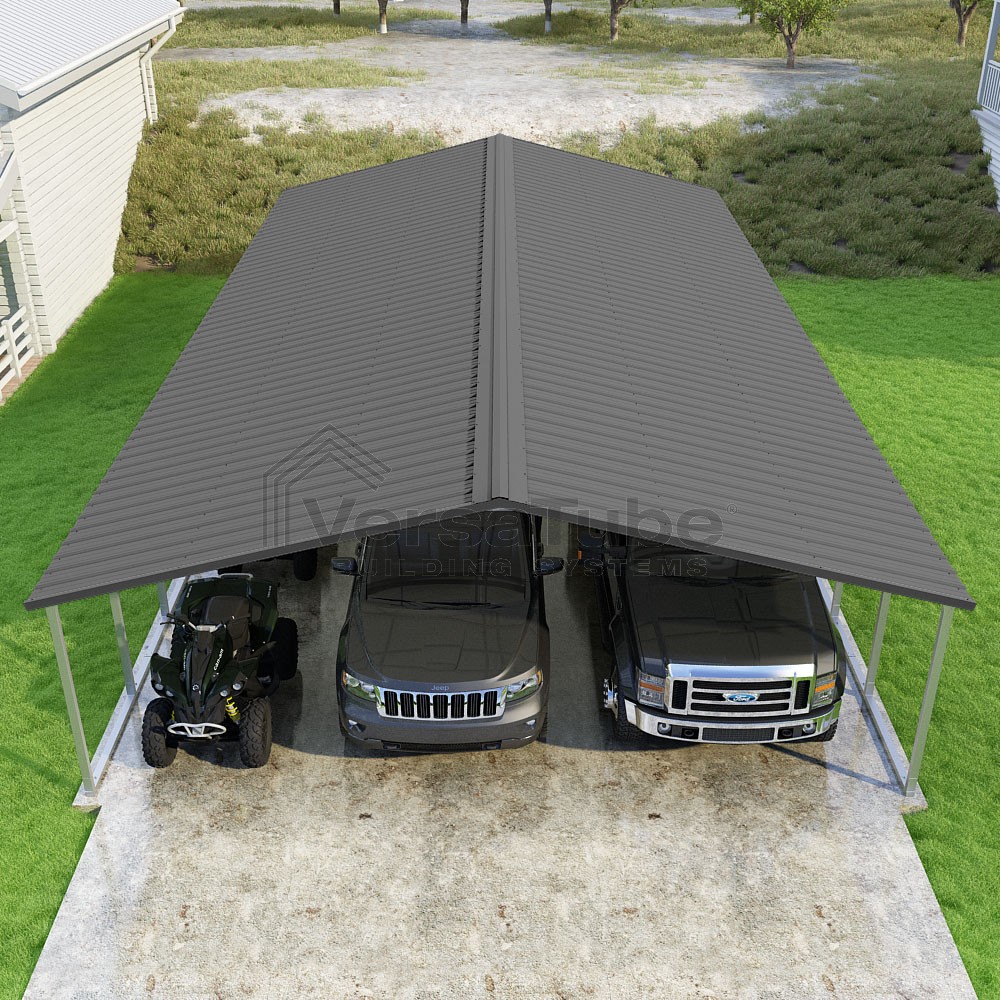 Pinnacle Series DIY carport kit features vertical sheet metal roof panels with ridge cap, gable and eave trim for an A-frame roof style and extended coverage on both ends.