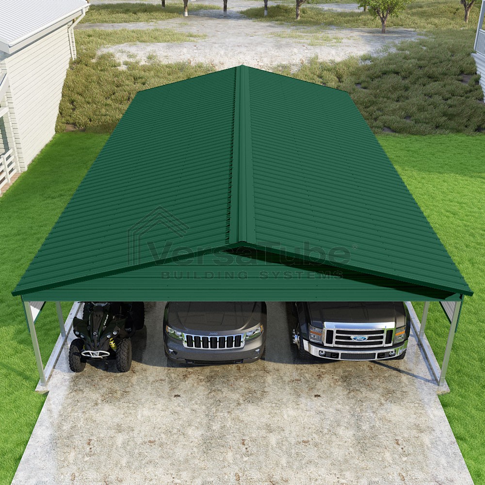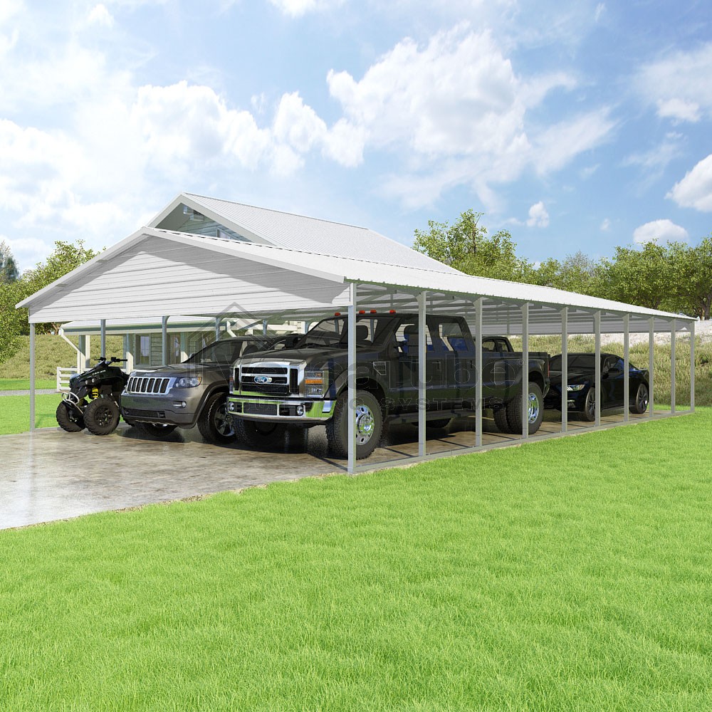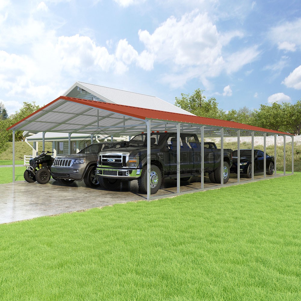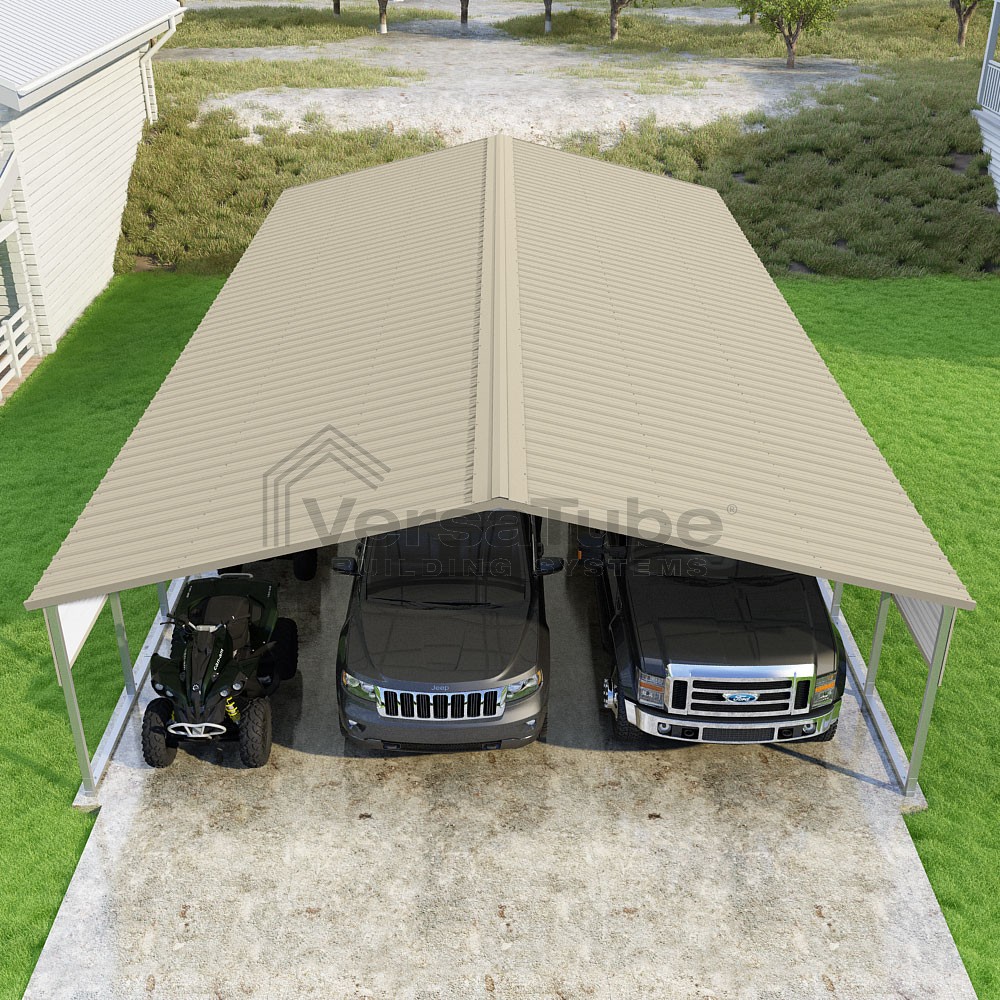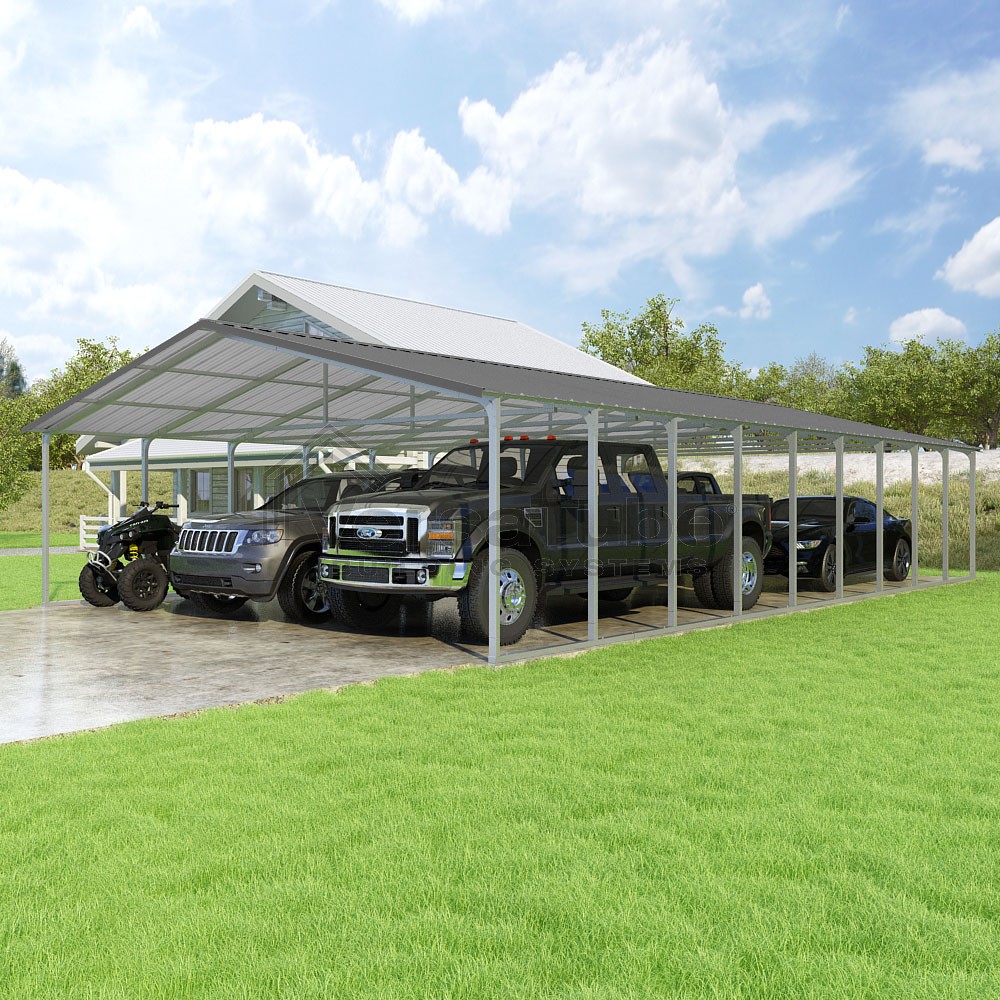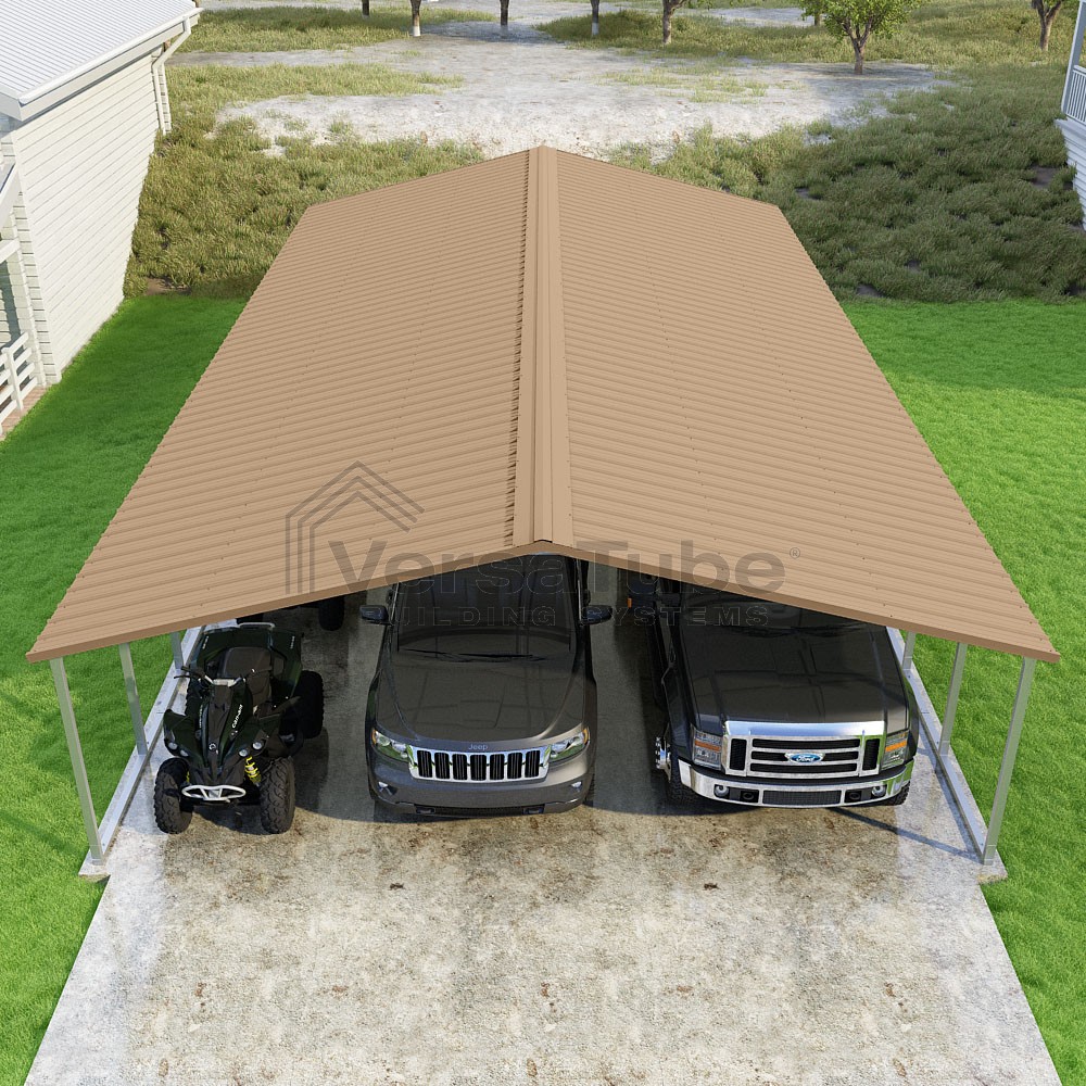 Pinnacle Series DIY carport kit features vertical sheet metal roof panels with ridge cap, gable and eave trim for an A-frame roof style and extended coverage on both ends.