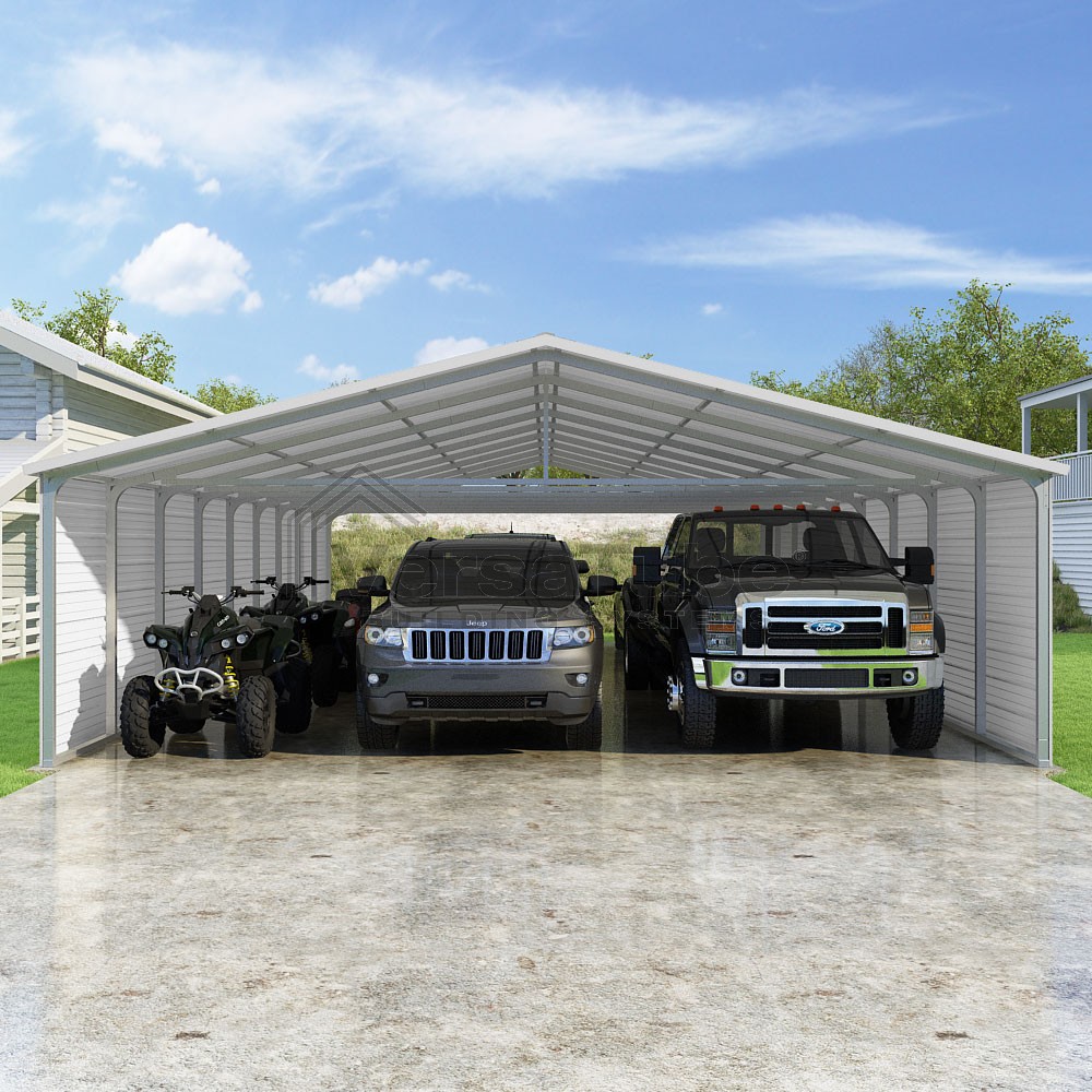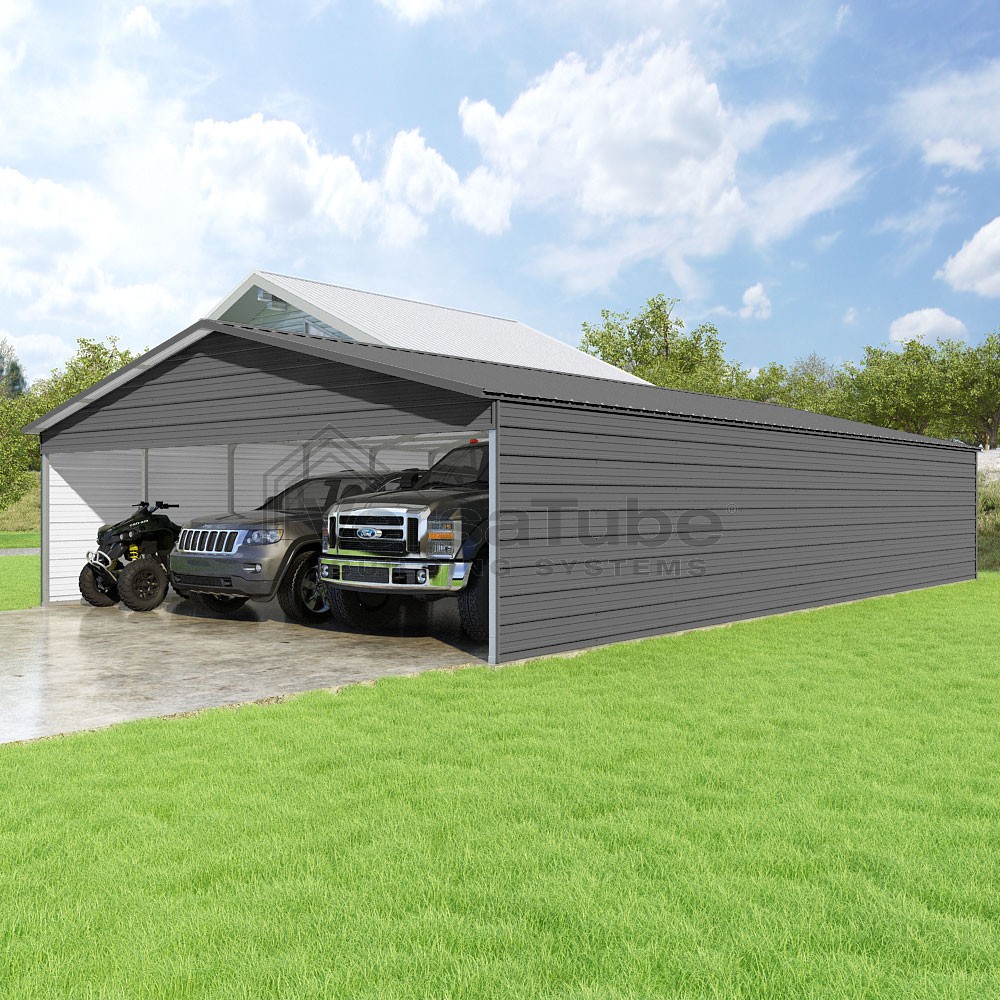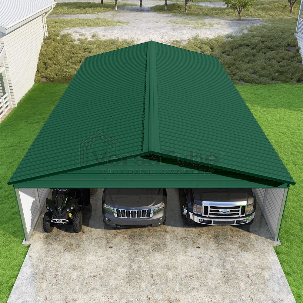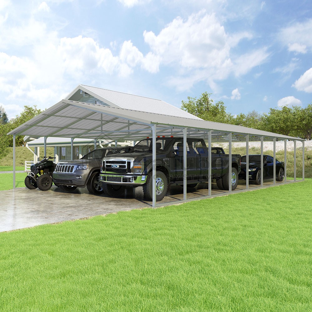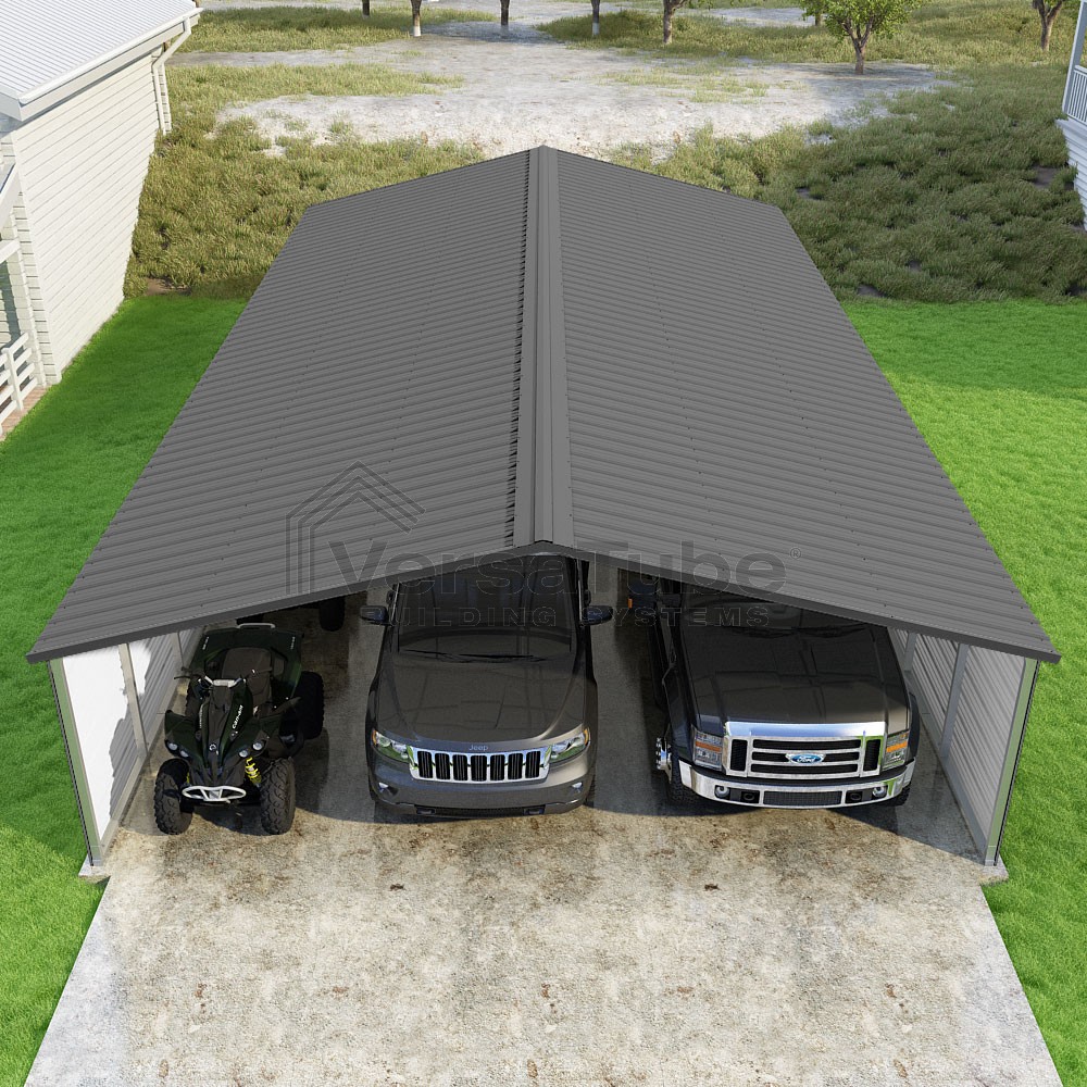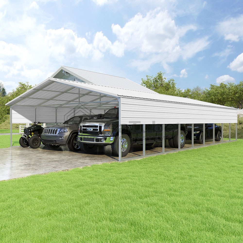 Pinnacle Series DIY carport kit features vertical sheet metal roof panels with ridge cap, gable and eave trim for an A-frame roof style and extended coverage on both ends.