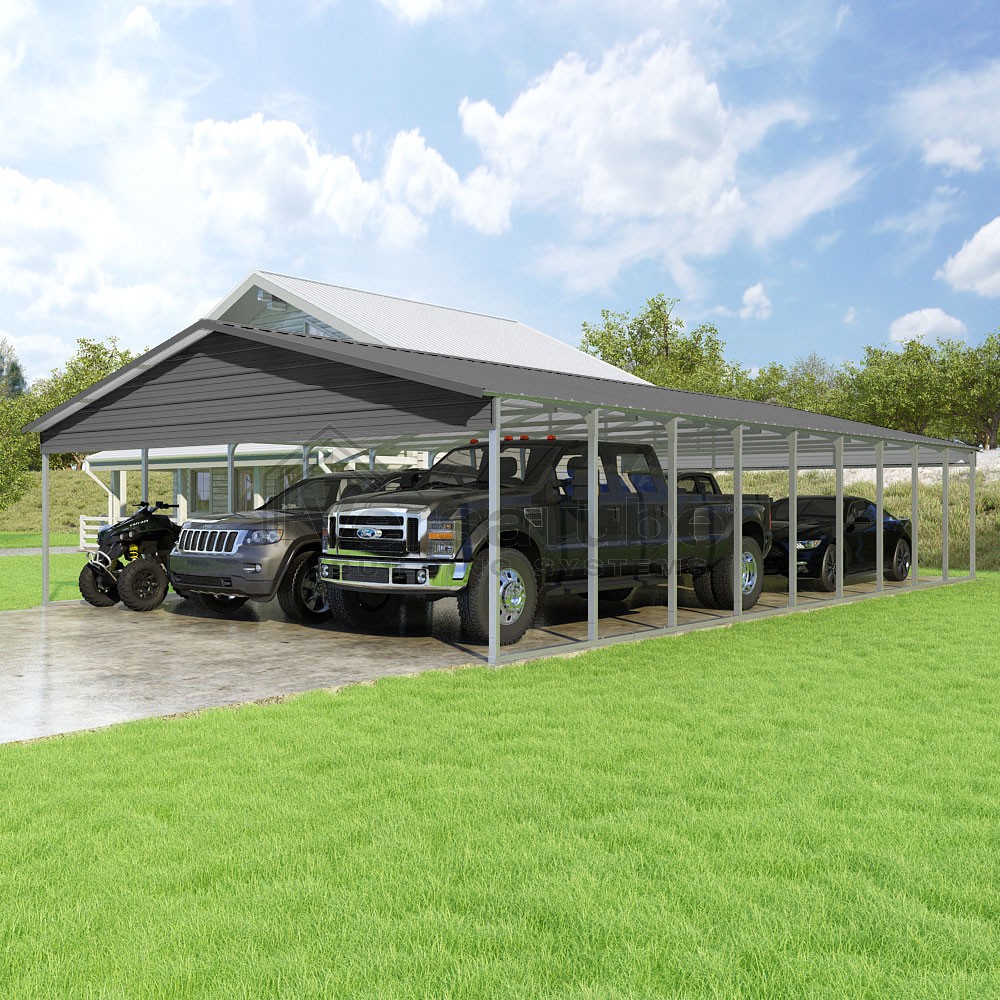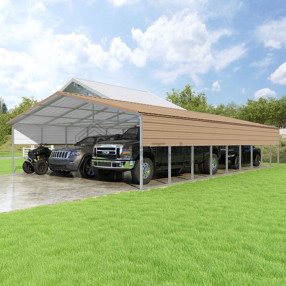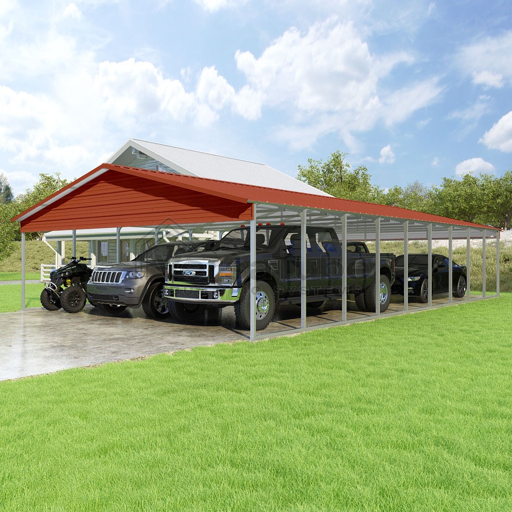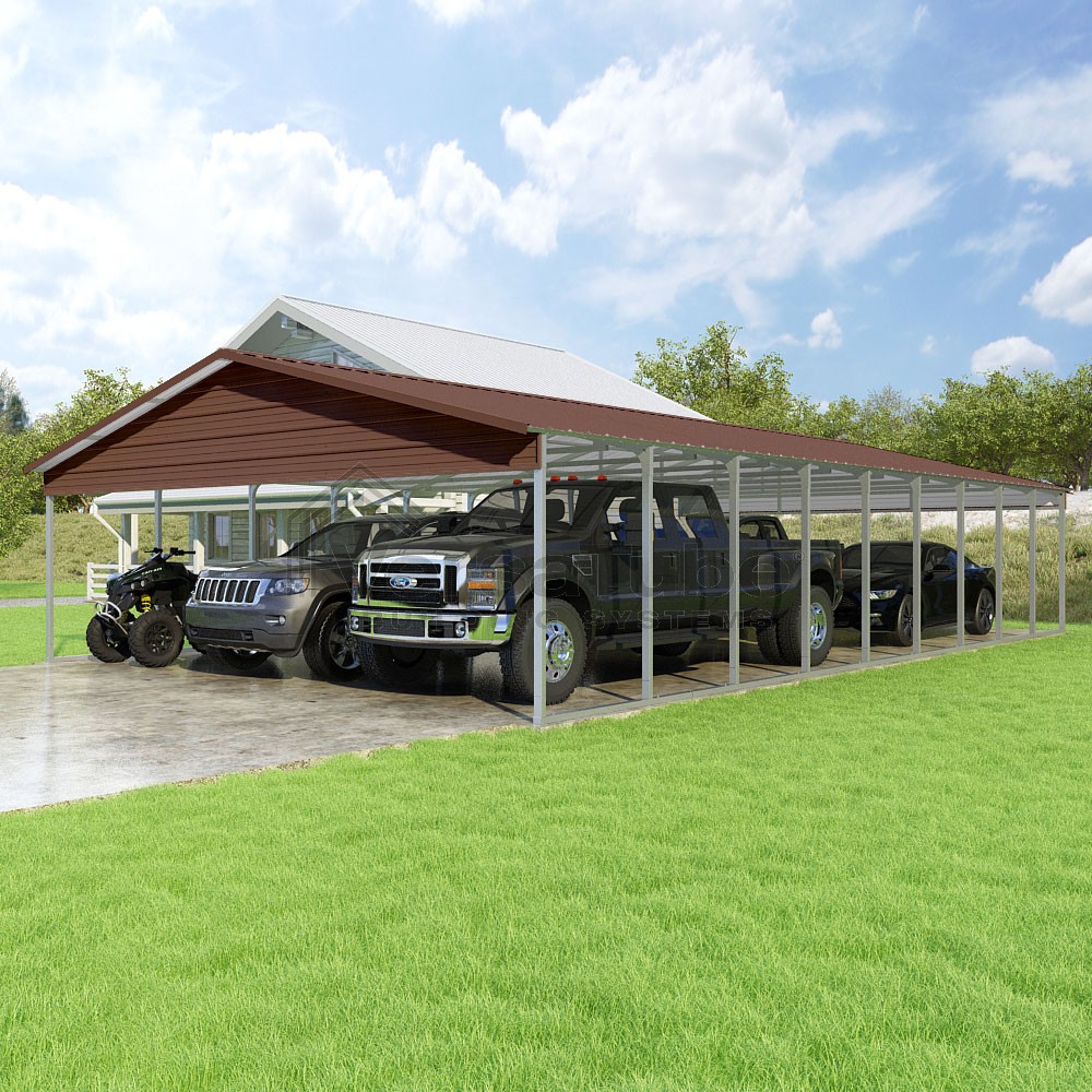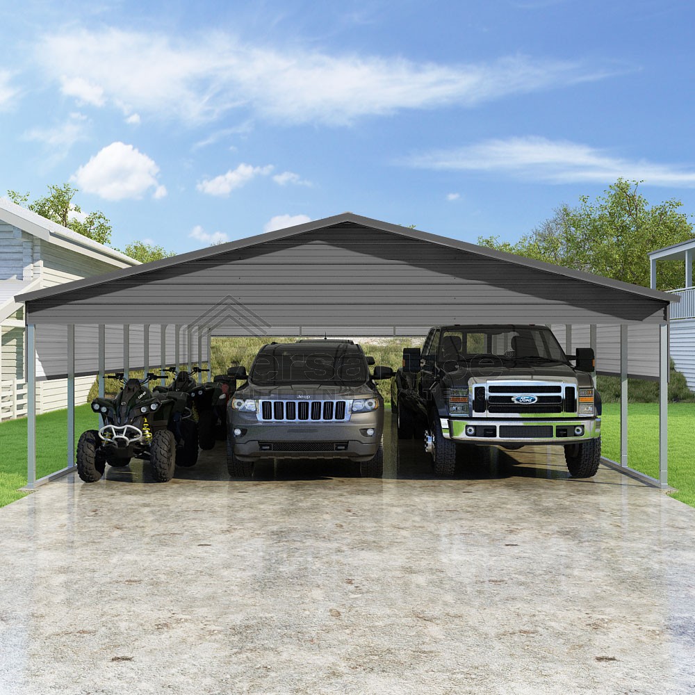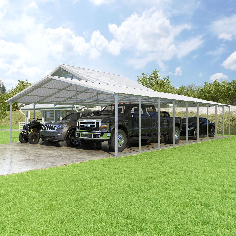 Pinnacle Series DIY carport kit features vertical sheet metal roof panels with ridge cap, gable and eave trim for an A-frame roof style and extended coverage on both ends.