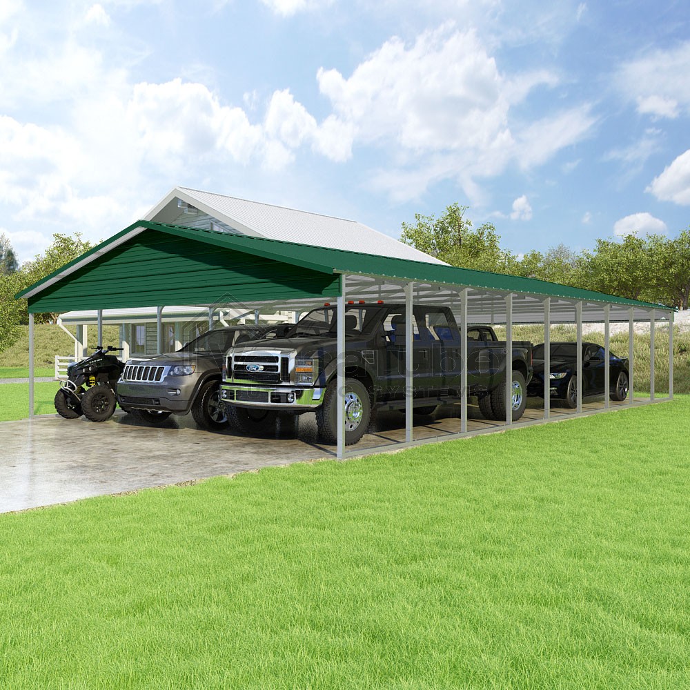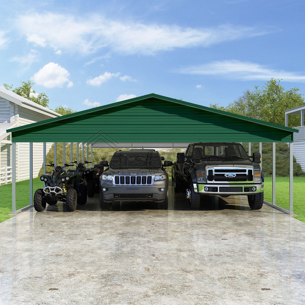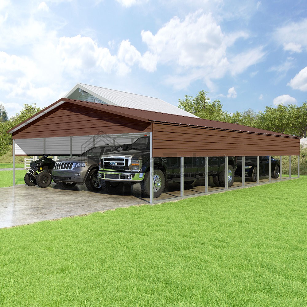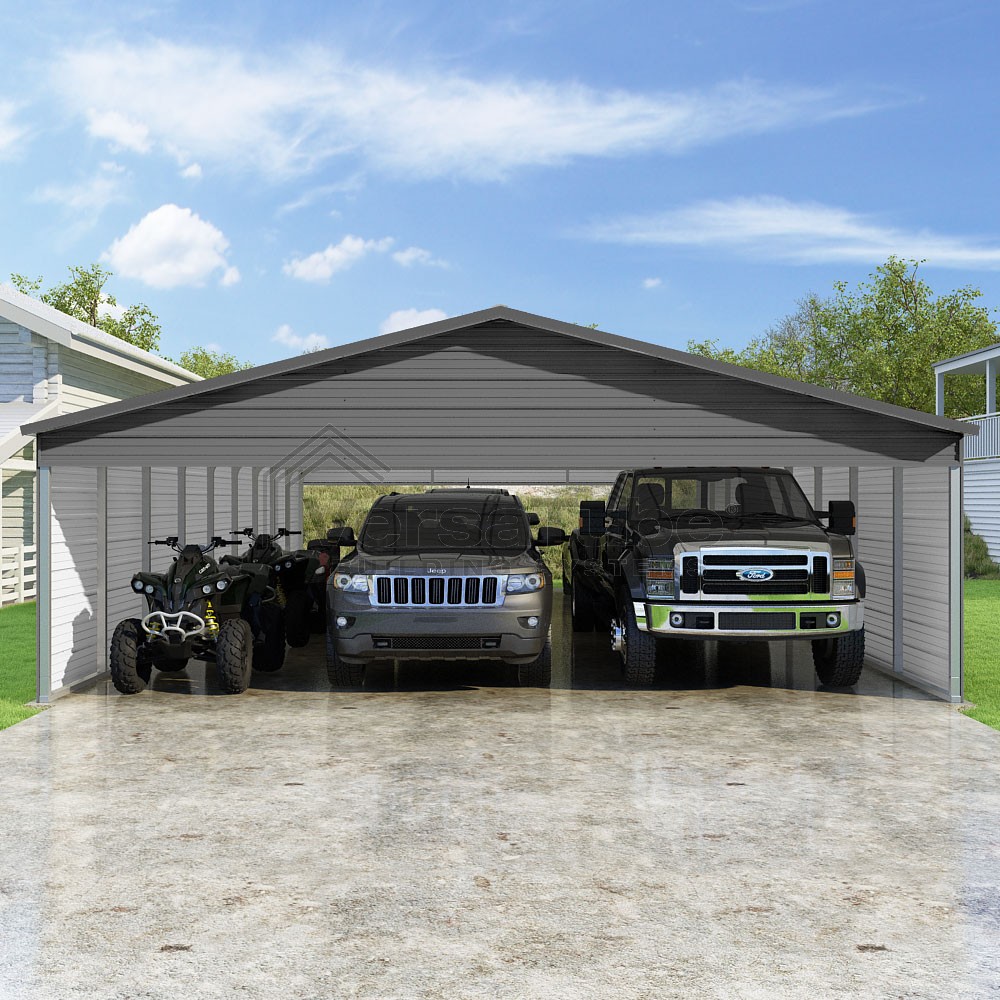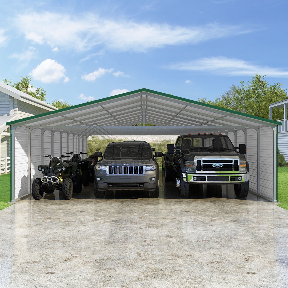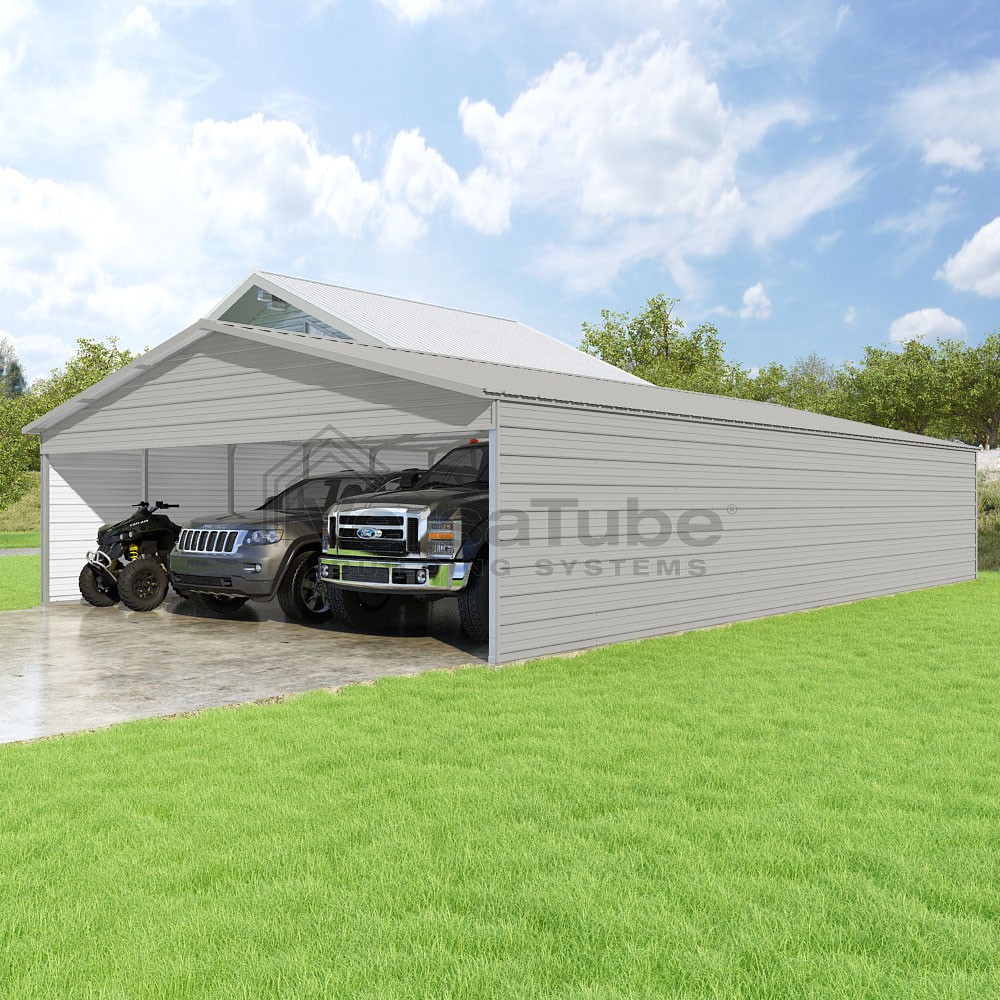 Pinnacle Series DIY carport kit features vertical sheet metal roof panels with ridge cap, gable and eave trim for an A-frame roof style and extended coverage on both ends.