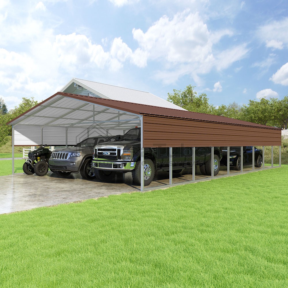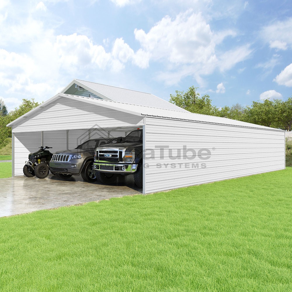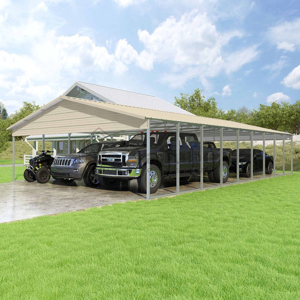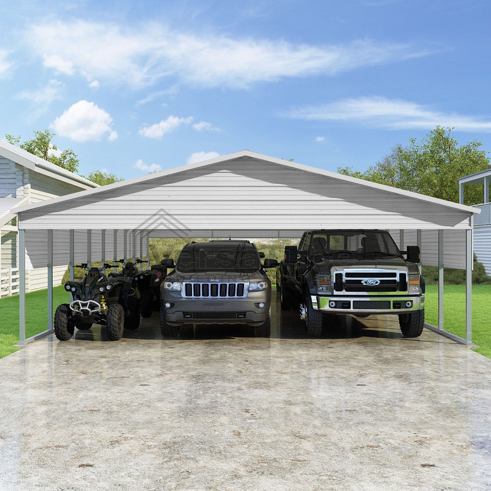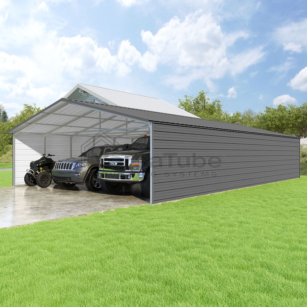 Pinnacle Series DIY carport kit features vertical sheet metal roof panels with ridge cap, gable and eave trim for an A-frame roof style and extended coverage on both ends.