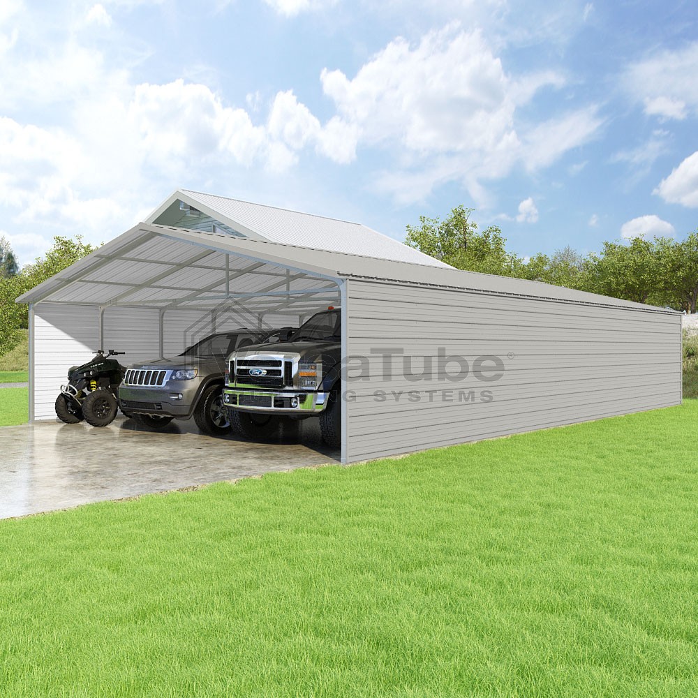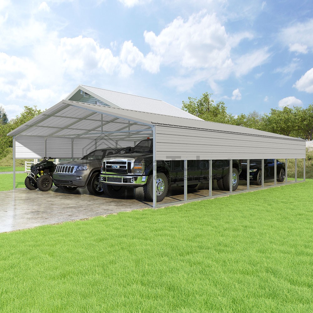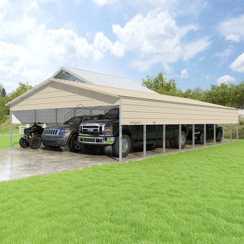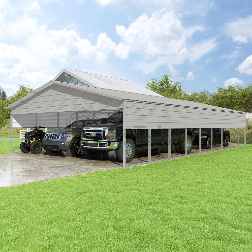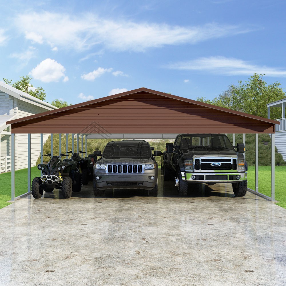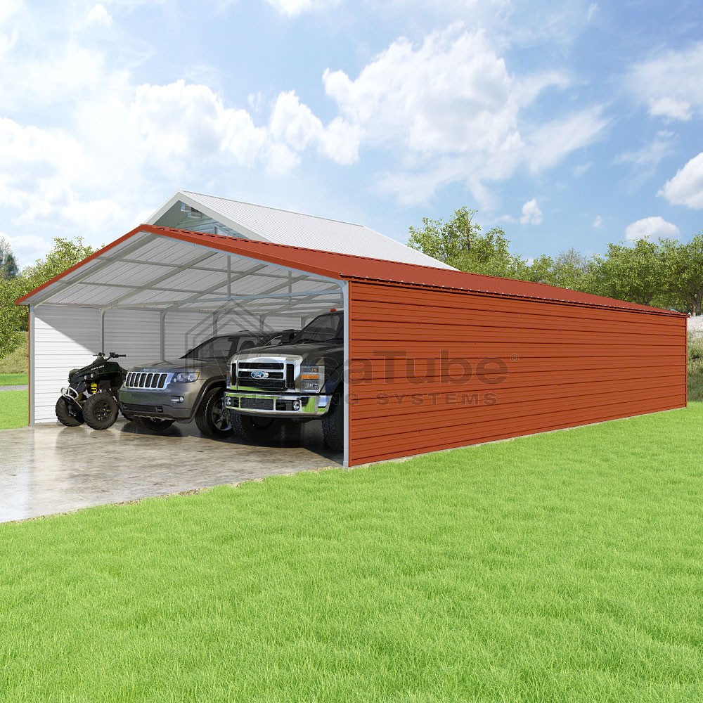 Pinnacle Series DIY carport kit features vertical sheet metal roof panels with ridge cap, gable and eave trim for an A-frame roof style and extended coverage on both ends.