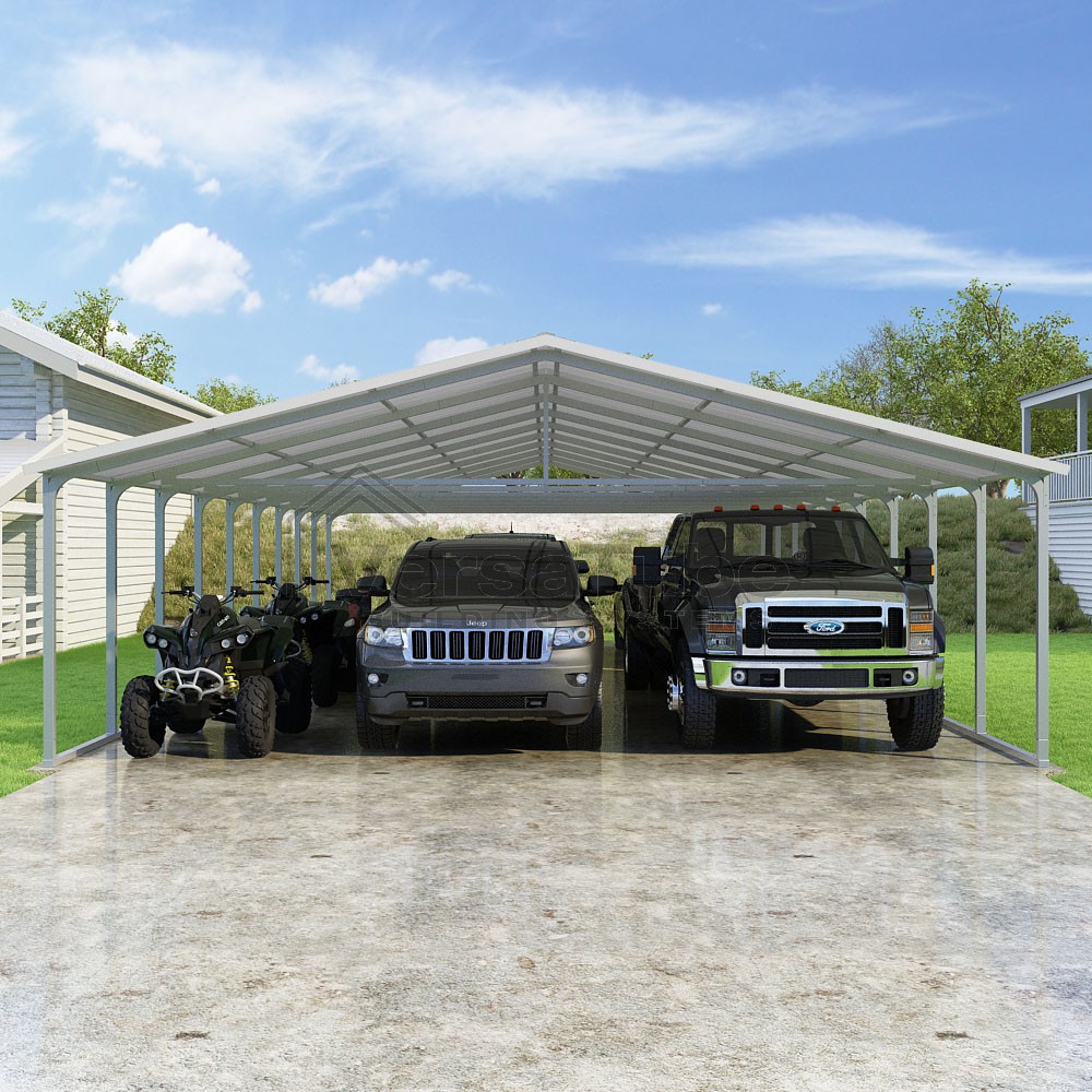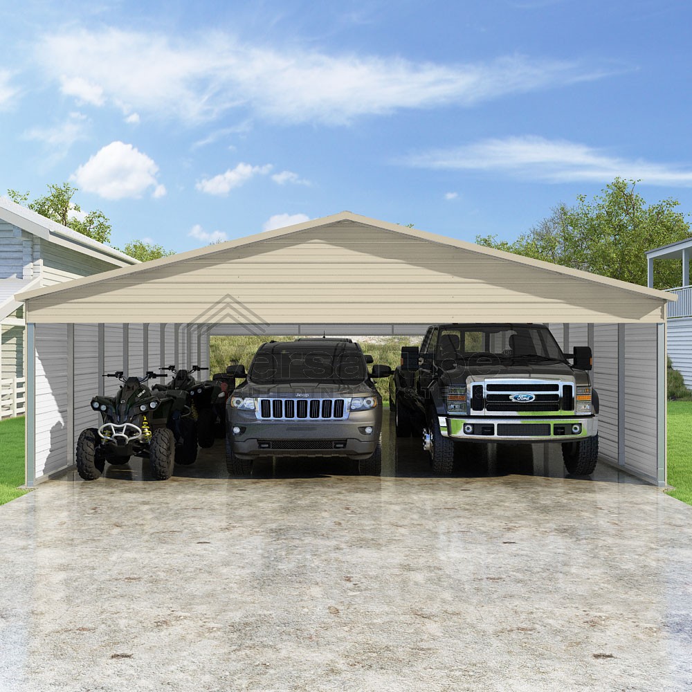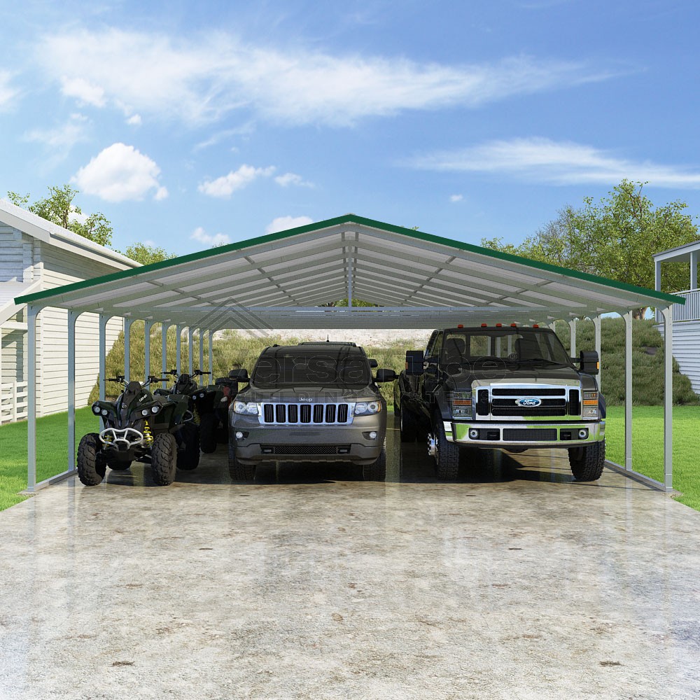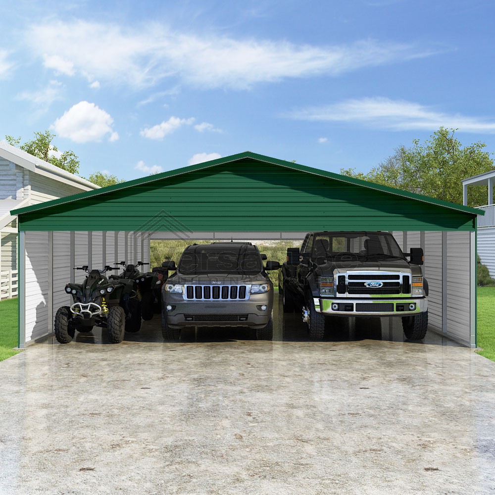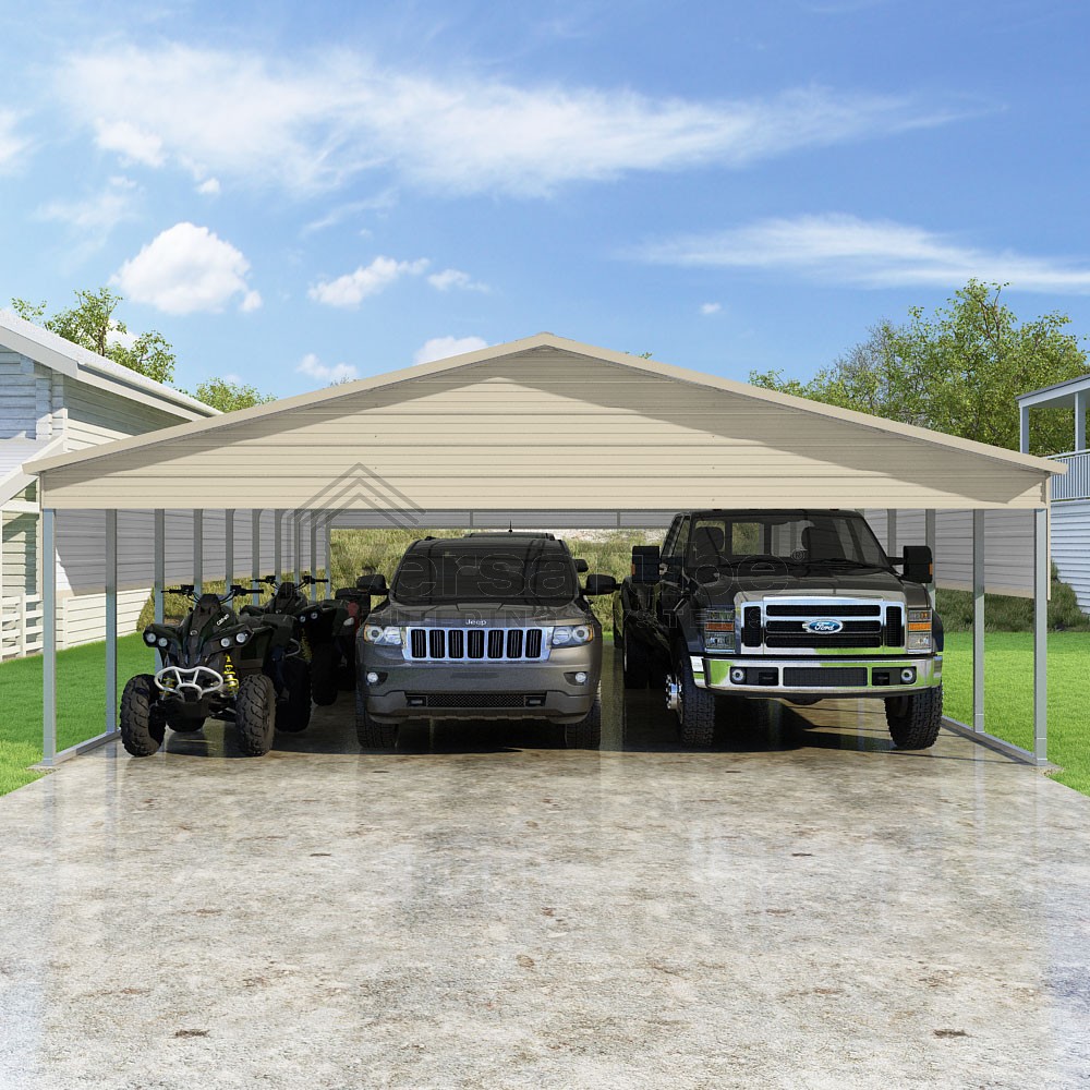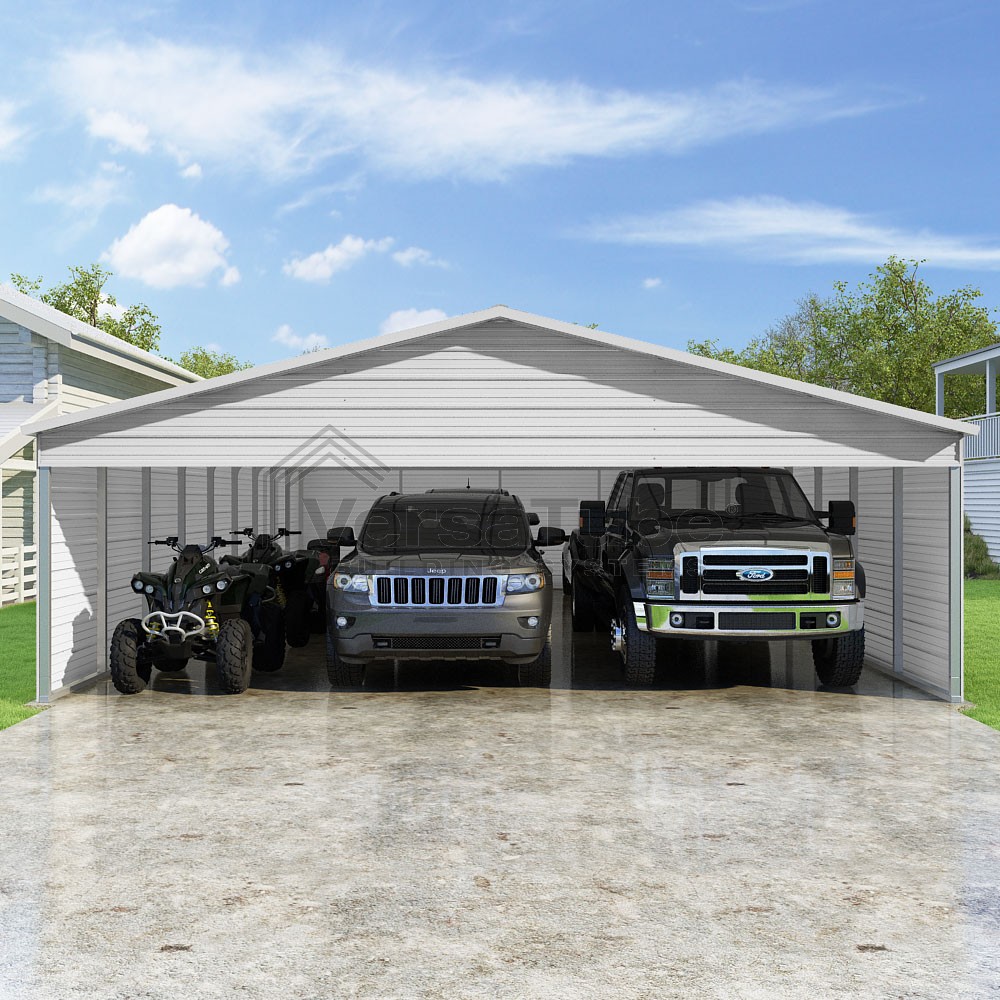 Pinnacle Series DIY carport kit features vertical sheet metal roof panels with ridge cap, gable and eave trim for an A-frame roof style and extended coverage on both ends.