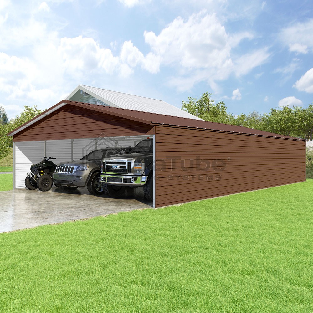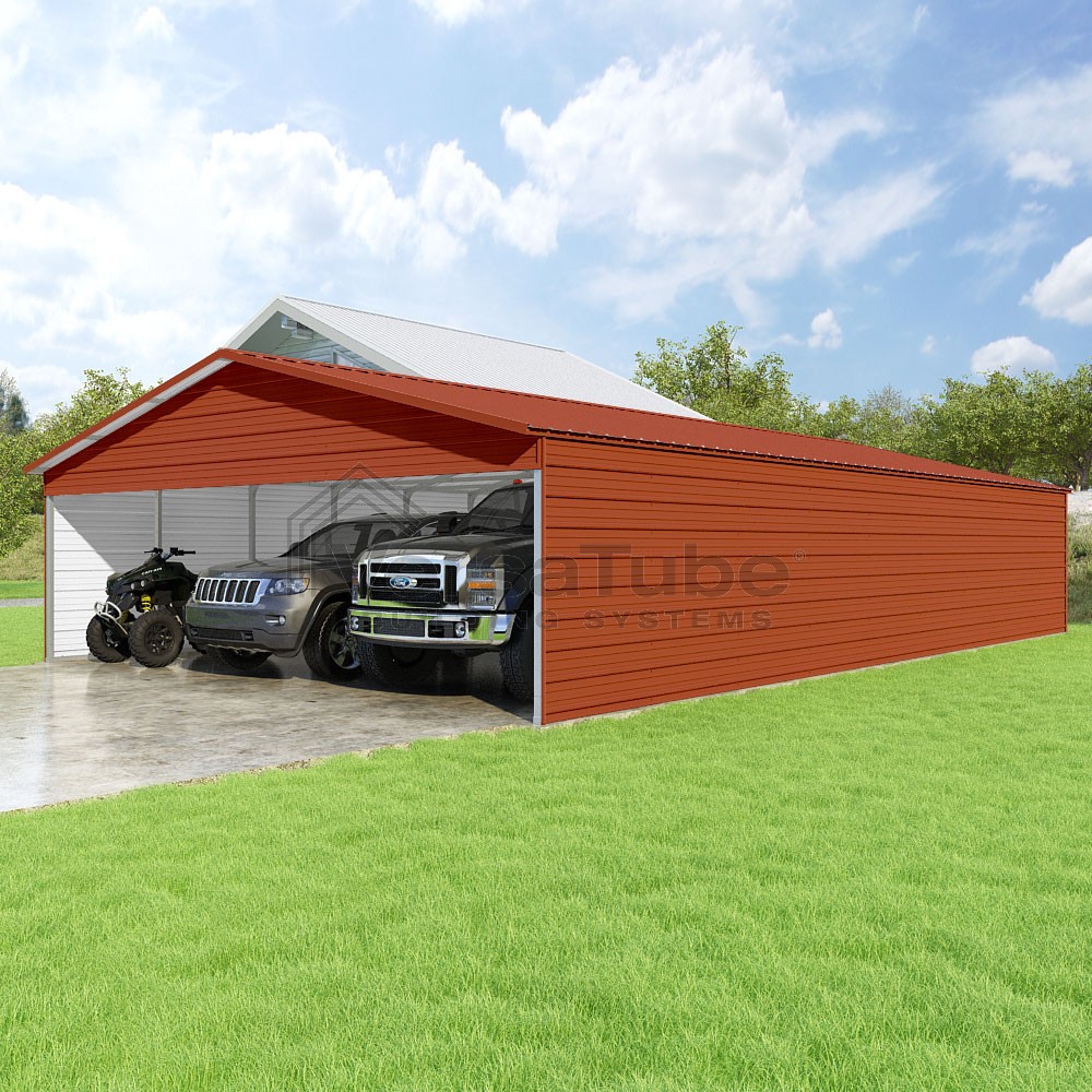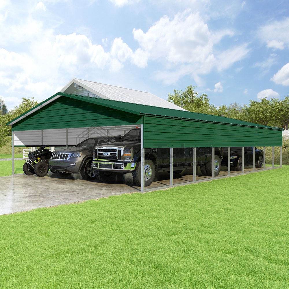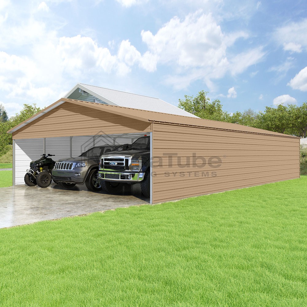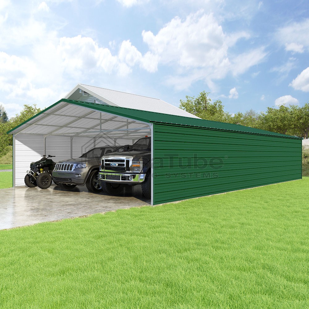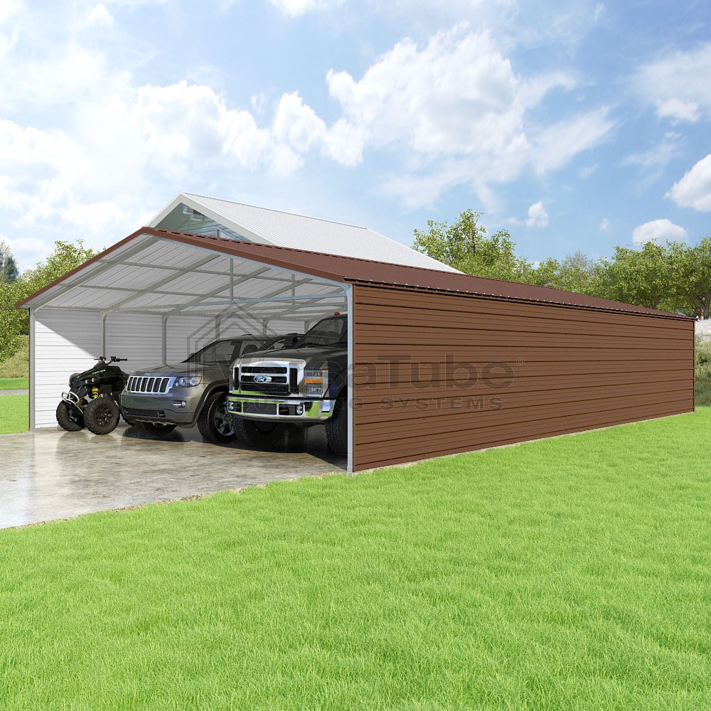Pinnacle Series DIY carport kit features vertical sheet metal roof panels with ridge cap, gable and eave trim for an A-frame roof style and extended coverage on both ends.