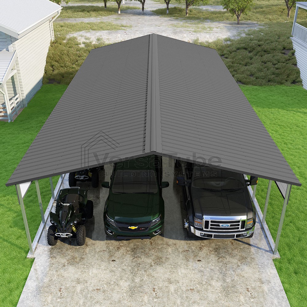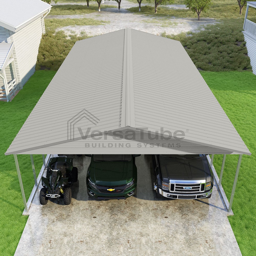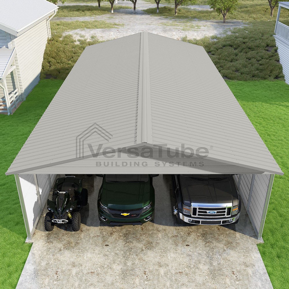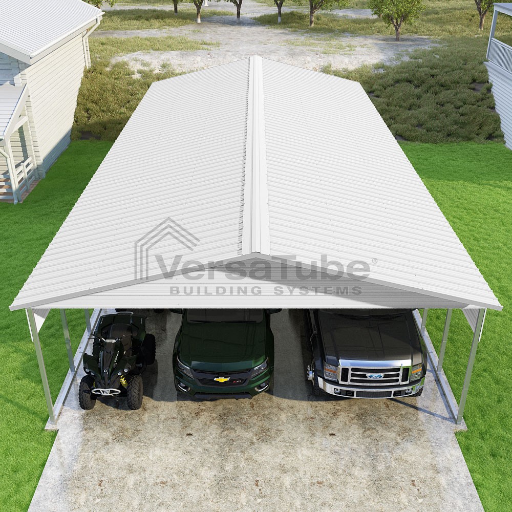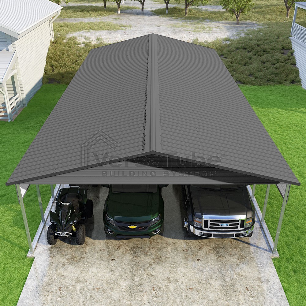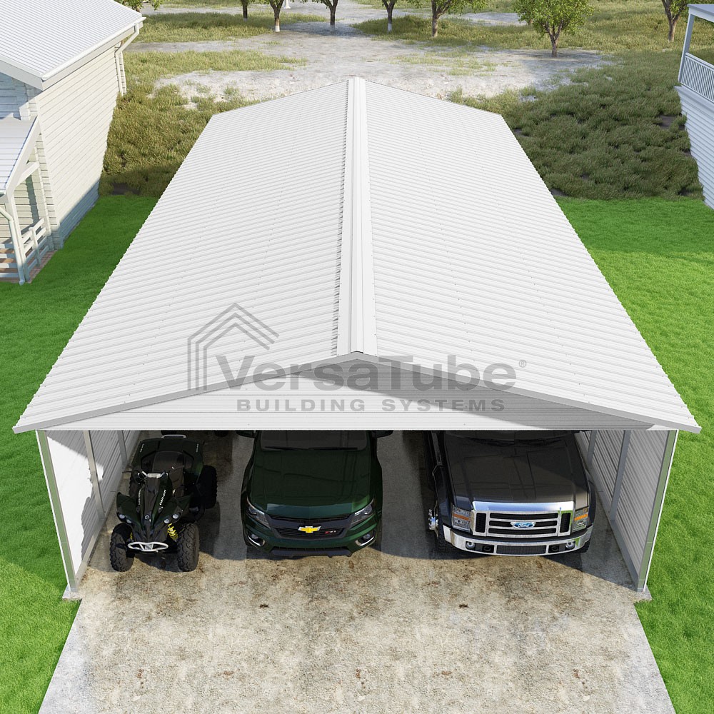 Pinnacle Series DIY carport kit features vertical sheet metal roof panels with ridge cap, gable and eave trim for an A-frame roof style and extended coverage on both ends.