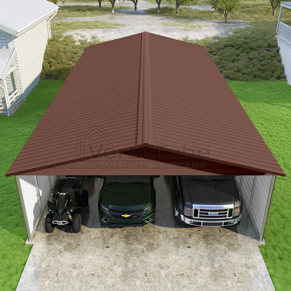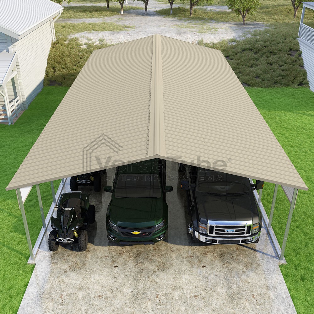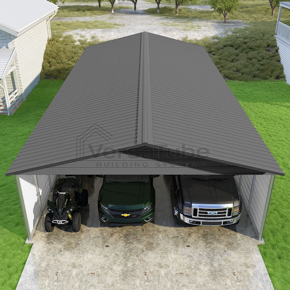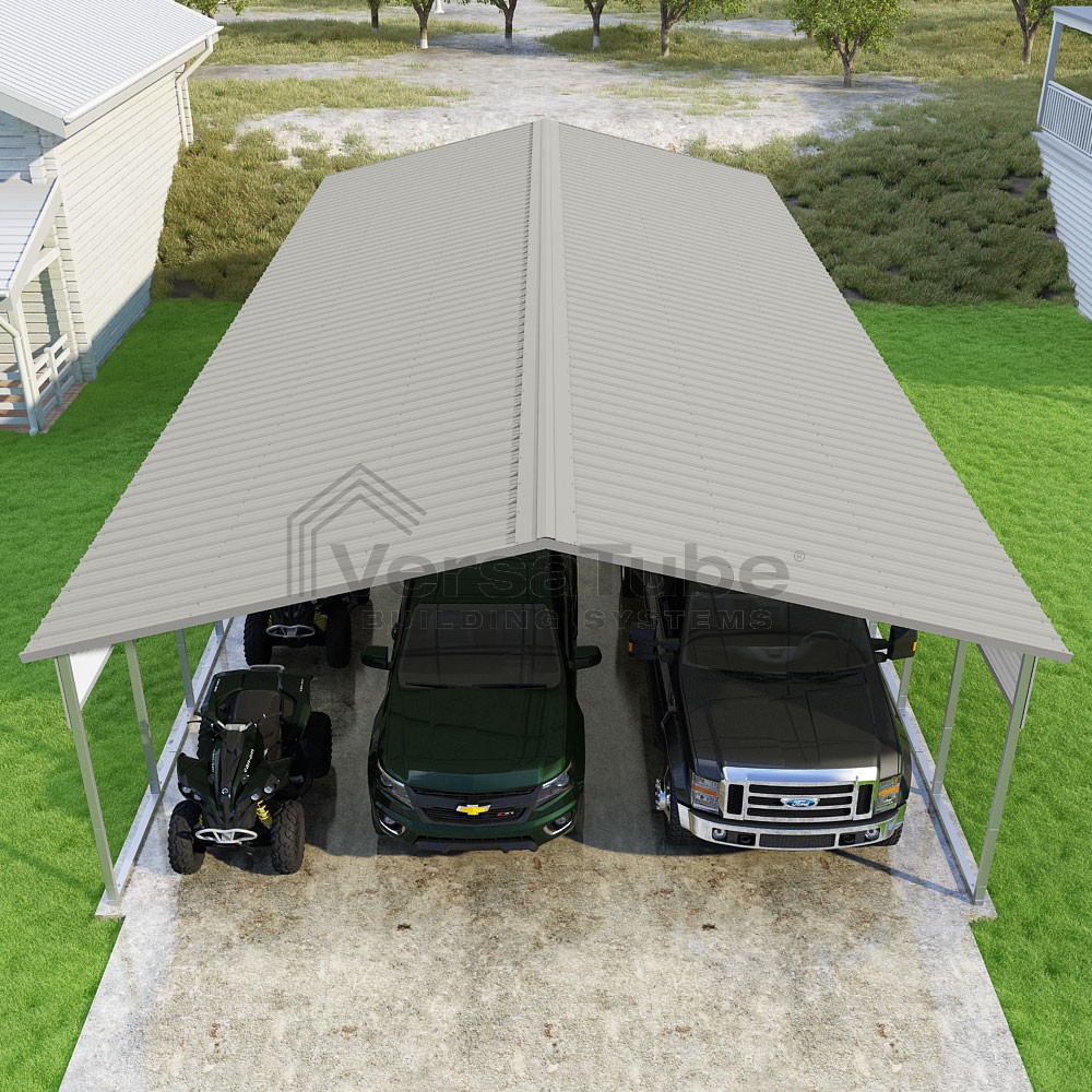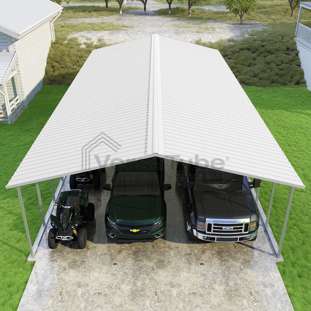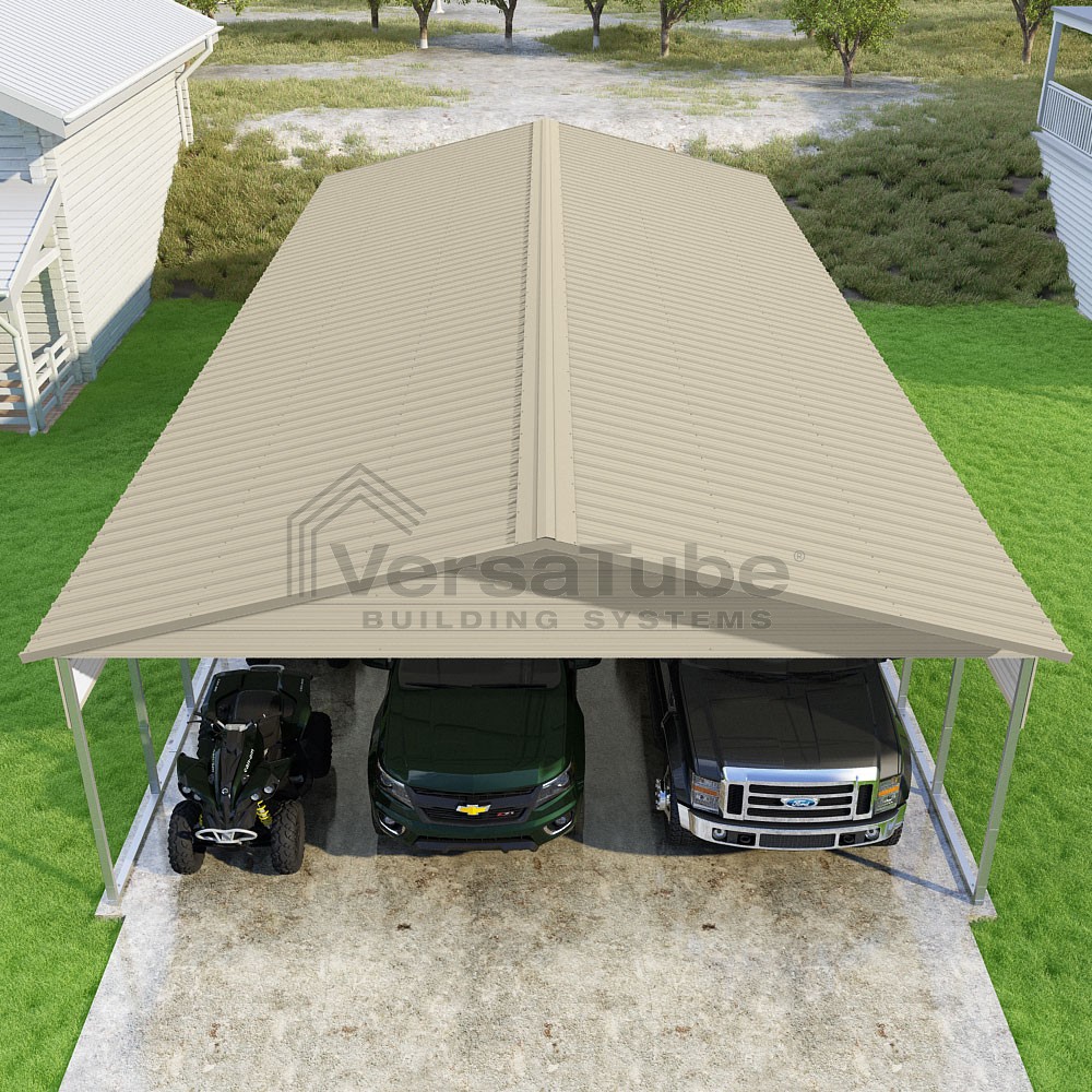 Pinnacle Series DIY carport kit features vertical sheet metal roof panels with ridge cap, gable and eave trim for an A-frame roof style and extended coverage on both ends.