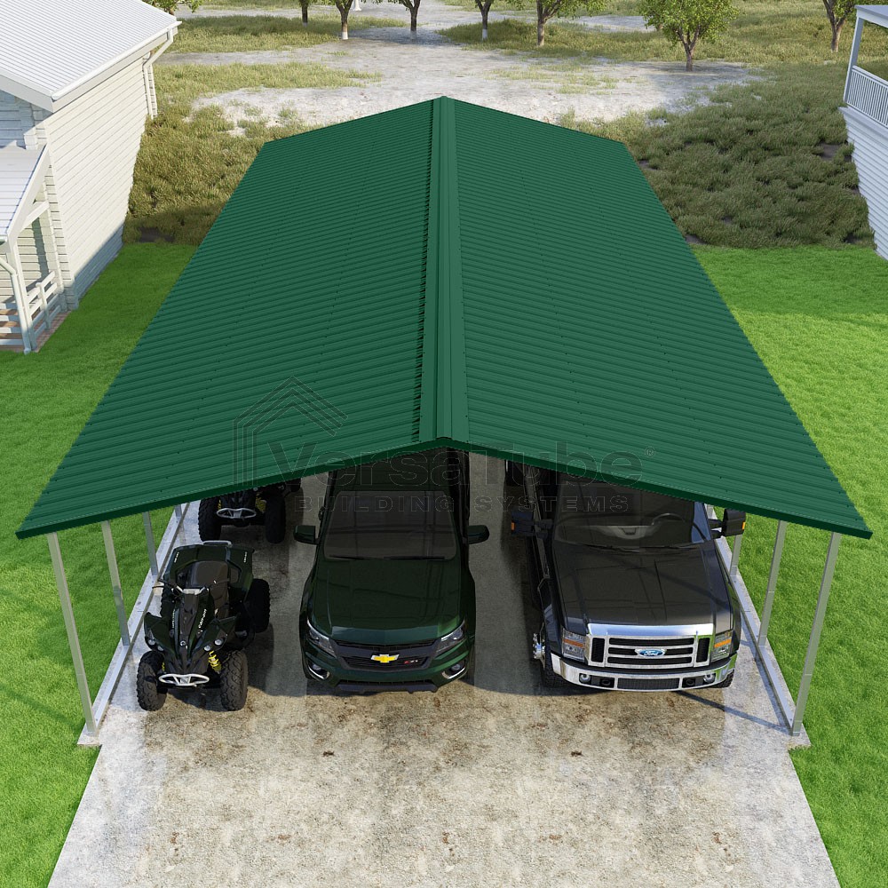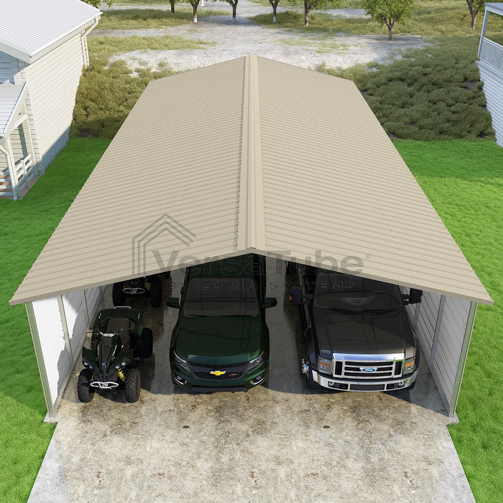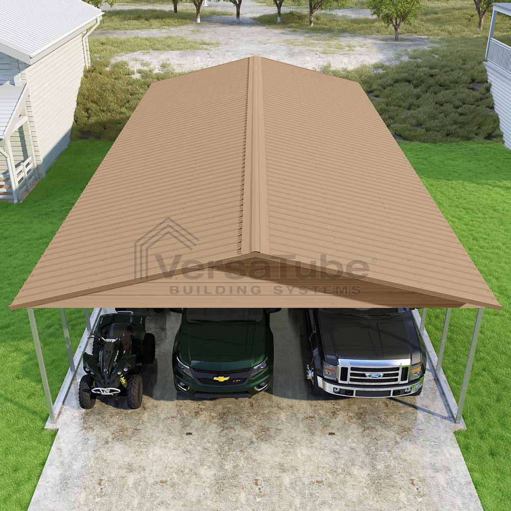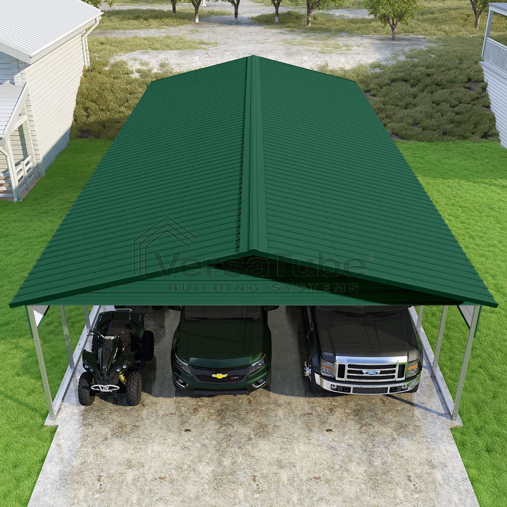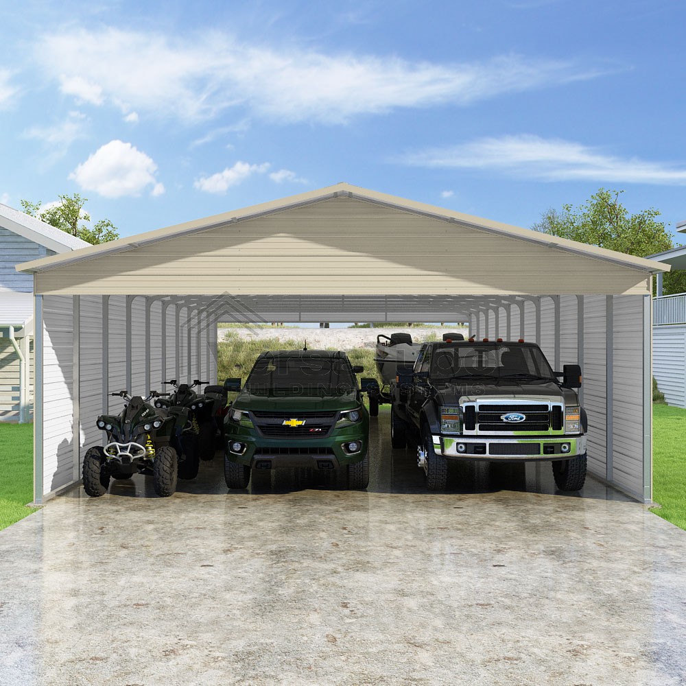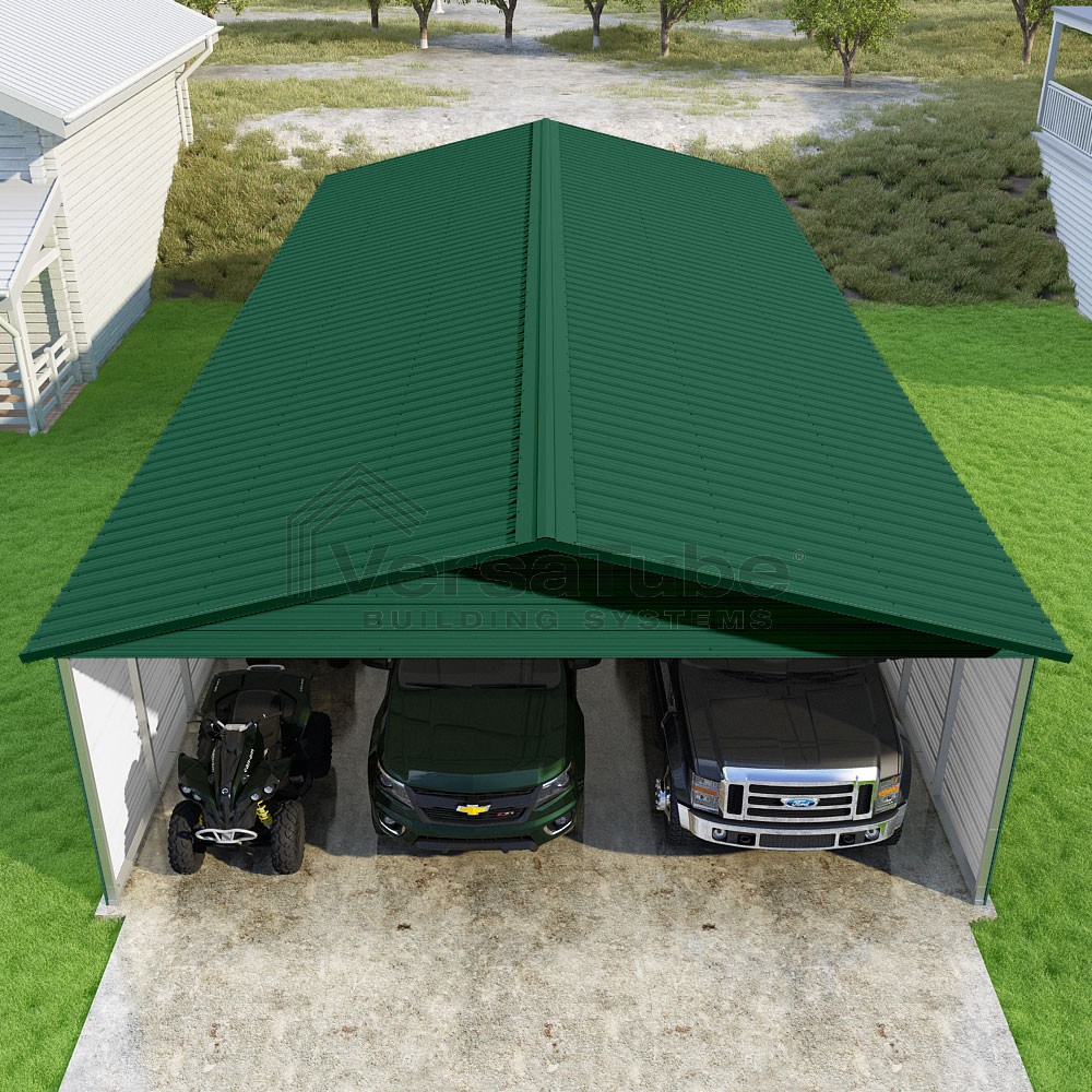 Pinnacle Series DIY carport kit features vertical sheet metal roof panels with ridge cap, gable and eave trim for an A-frame roof style and extended coverage on both ends.