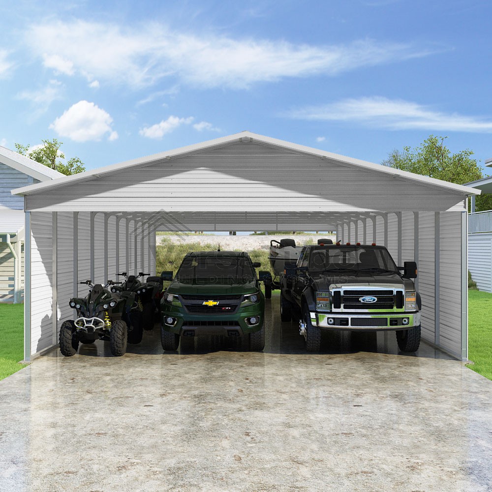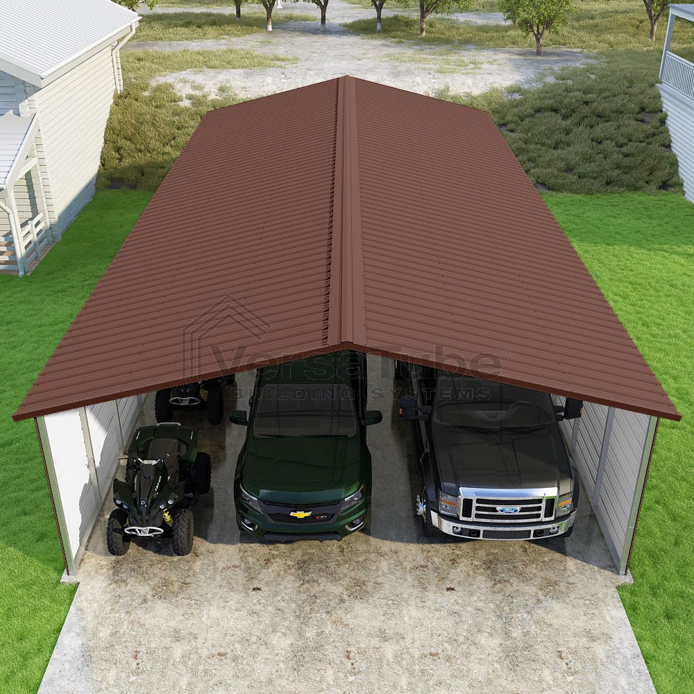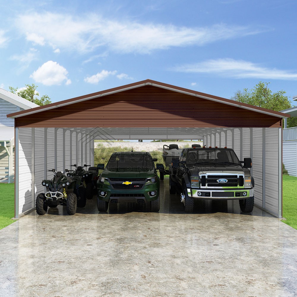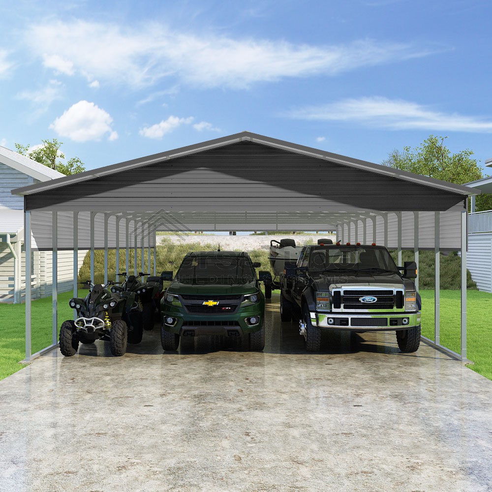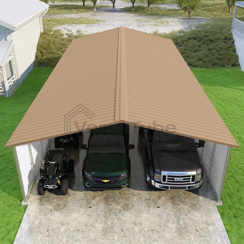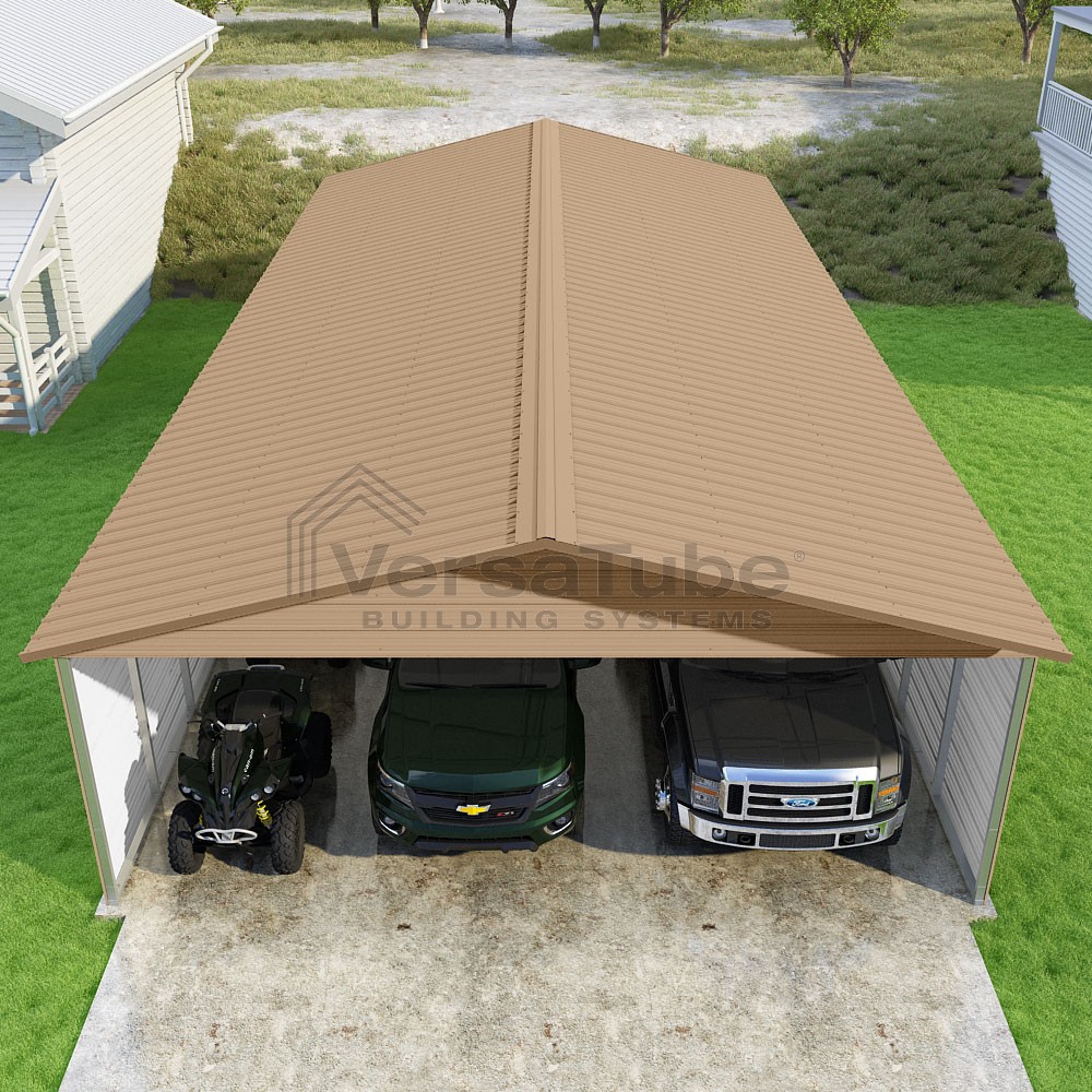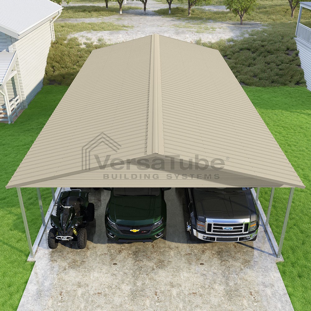 Pinnacle Series DIY carport kit features vertical sheet metal roof panels with ridge cap, gable and eave trim for an A-frame roof style and extended coverage on both ends.