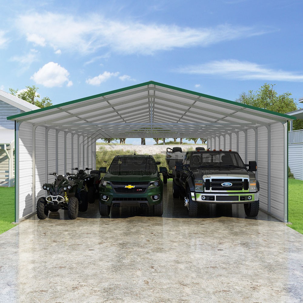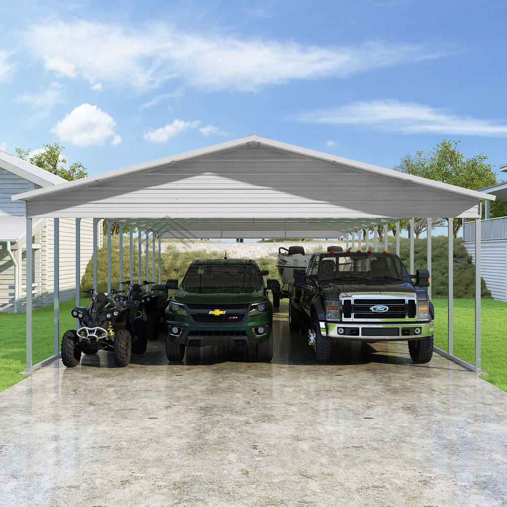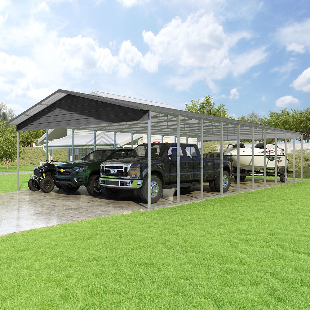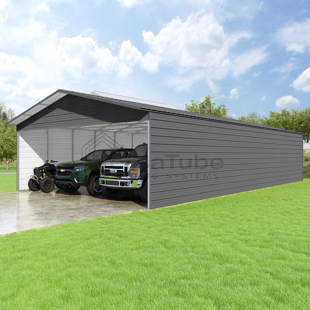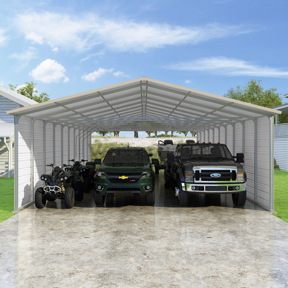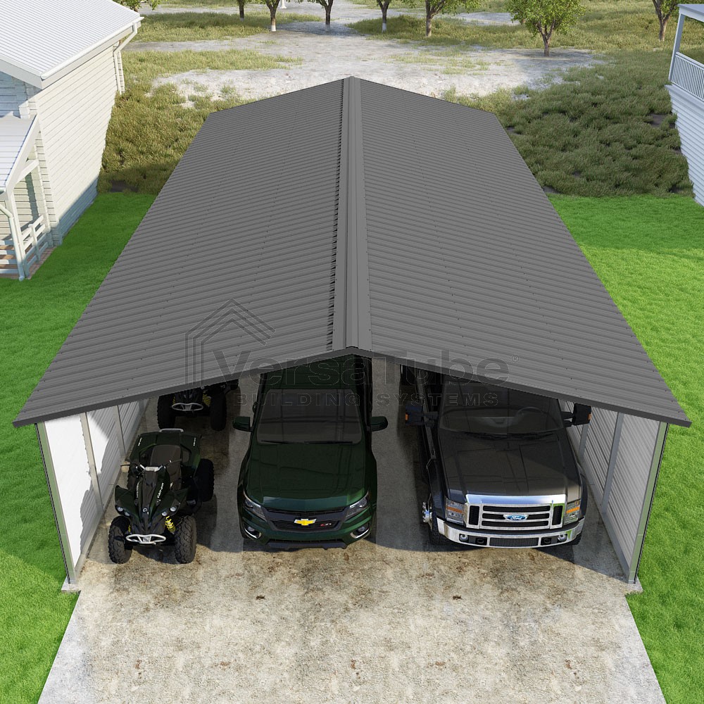 Pinnacle Series DIY carport kit features vertical sheet metal roof panels with ridge cap, gable and eave trim for an A-frame roof style and extended coverage on both ends.
