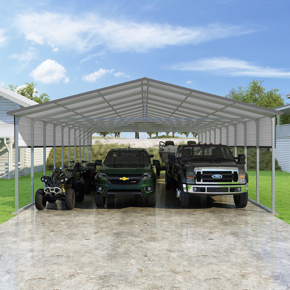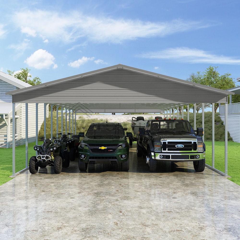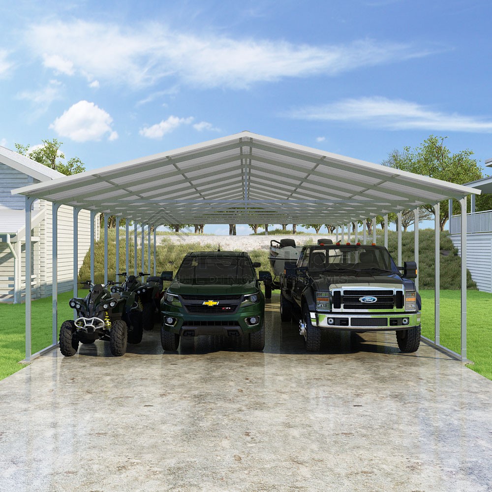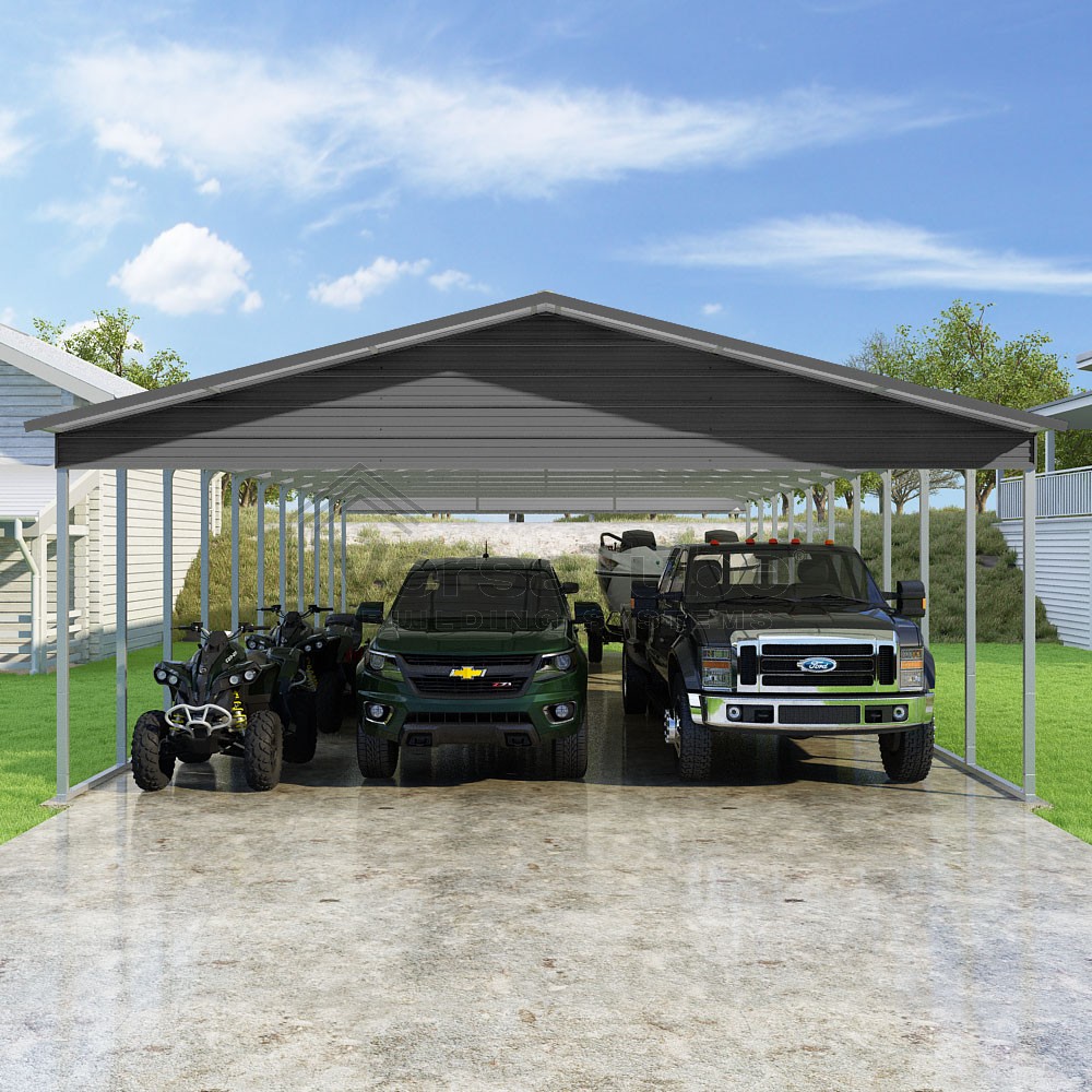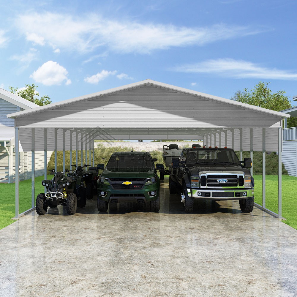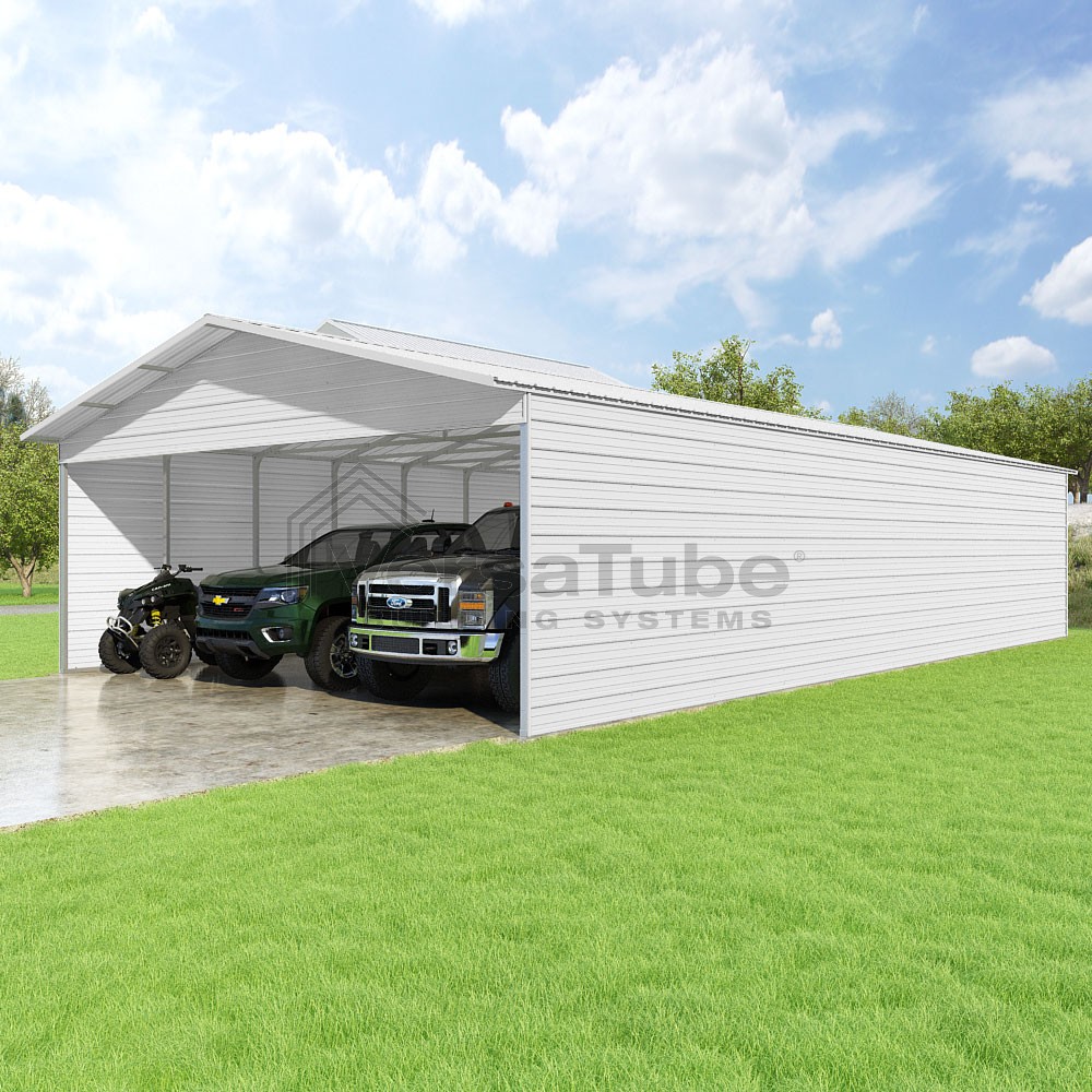 Pinnacle Series DIY carport kit features vertical sheet metal roof panels with ridge cap, gable and eave trim for an A-frame roof style and extended coverage on both ends.
