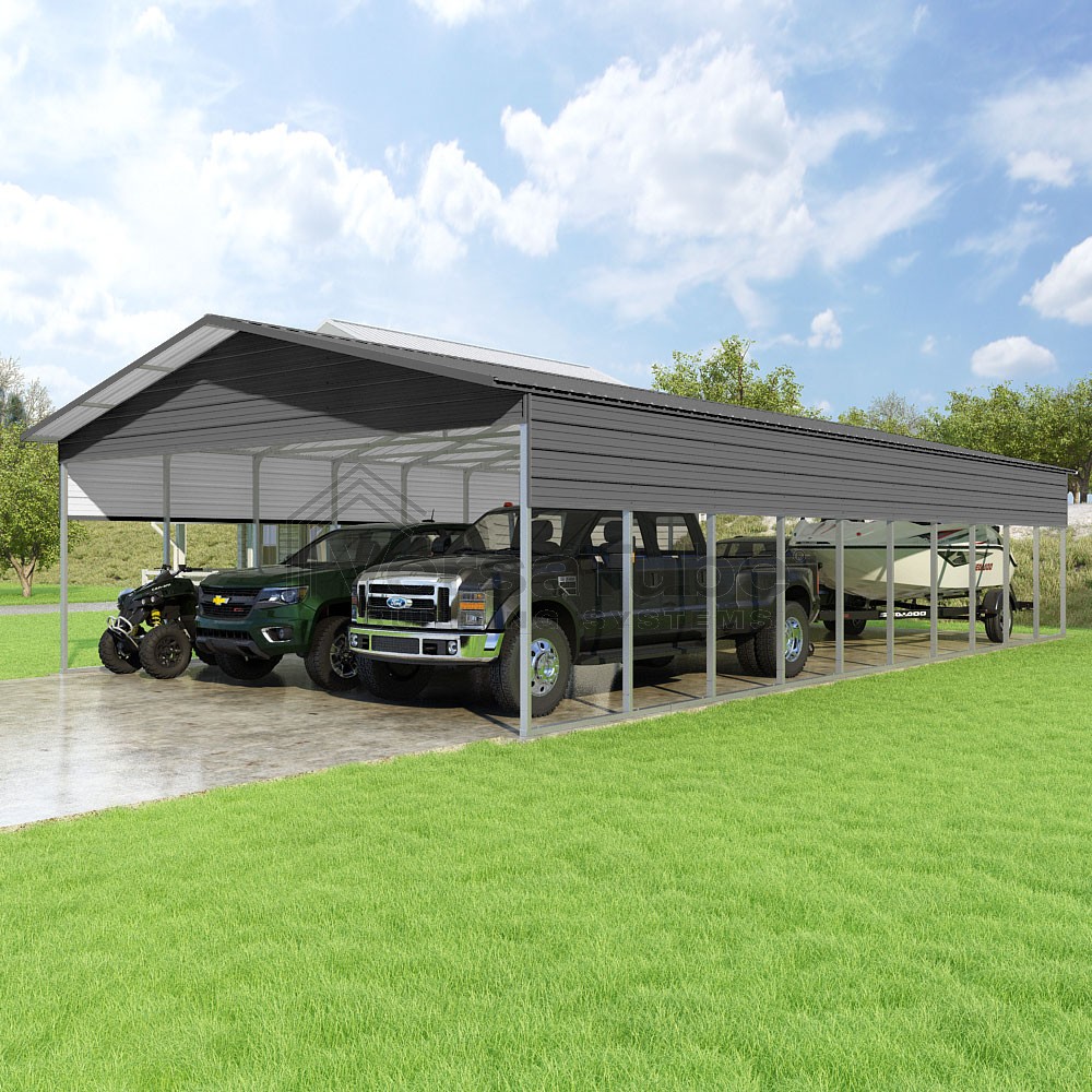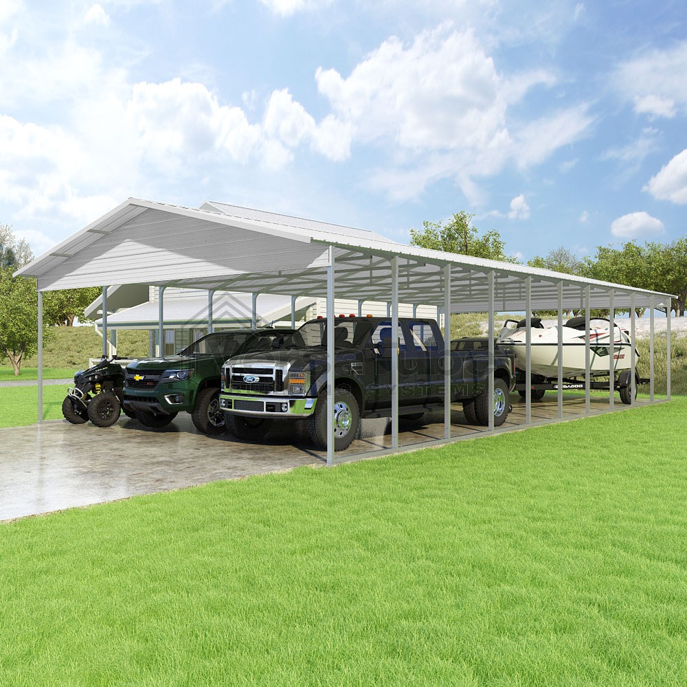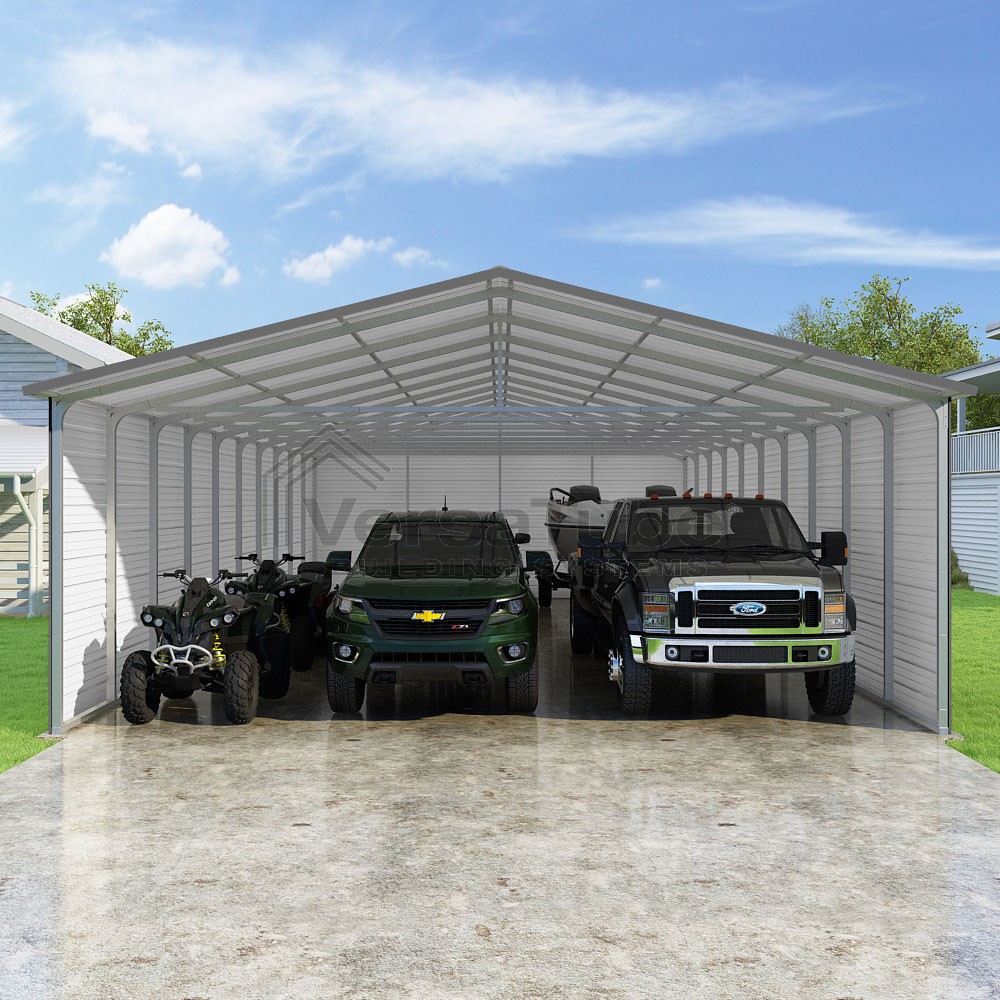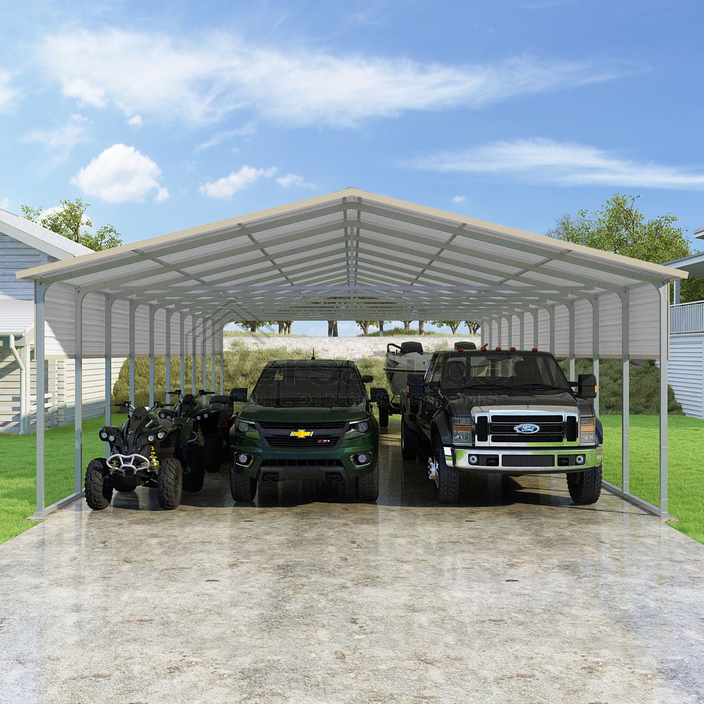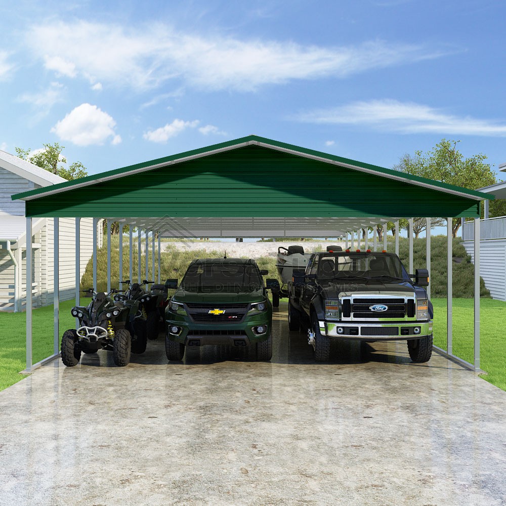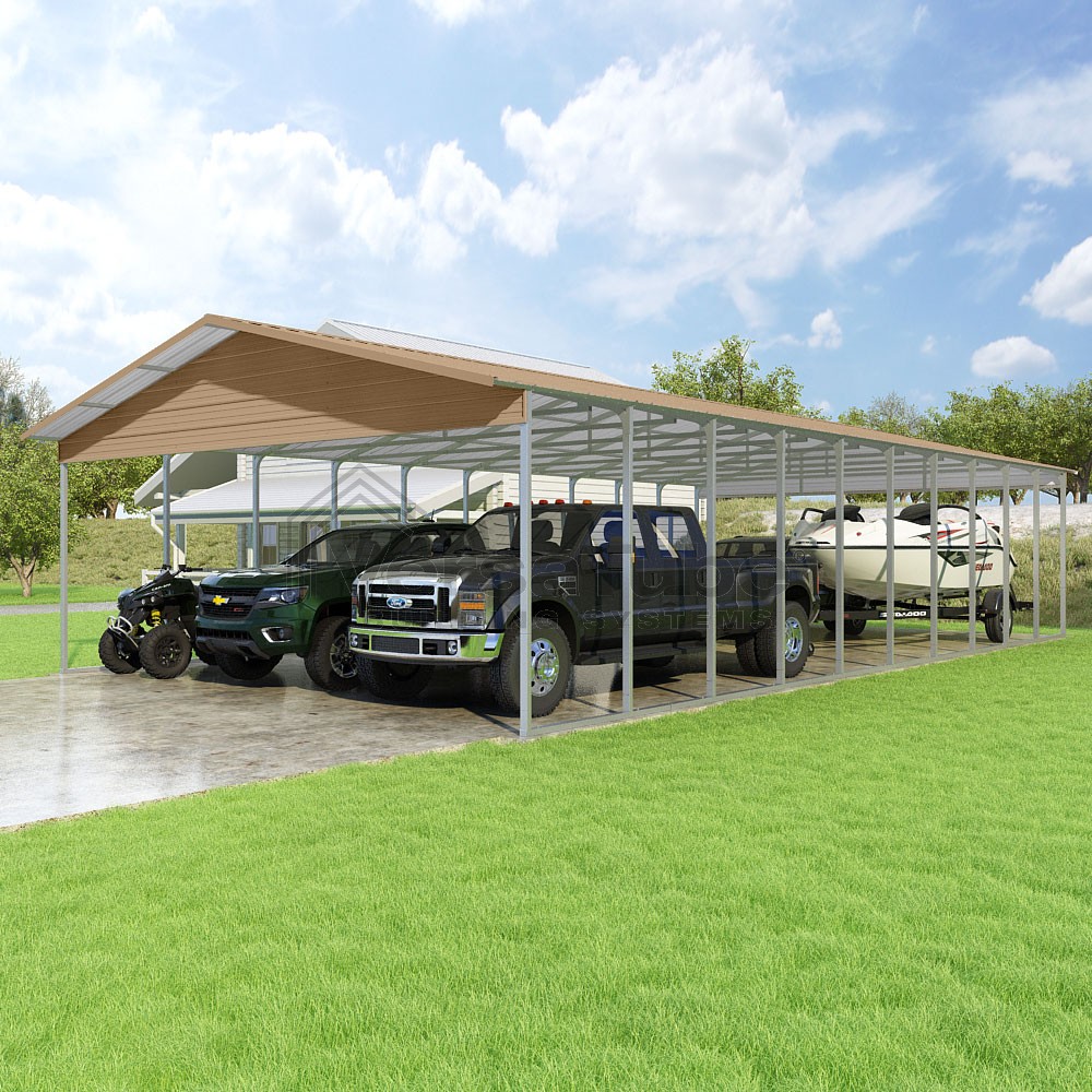Pinnacle Series DIY carport kit features vertical sheet metal roof panels with ridge cap, gable and eave trim for an A-frame roof style and extended coverage on both ends.