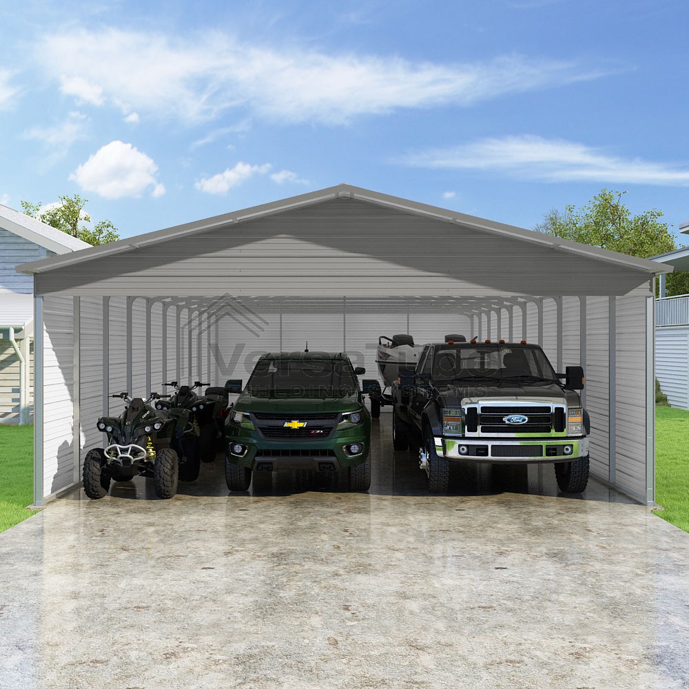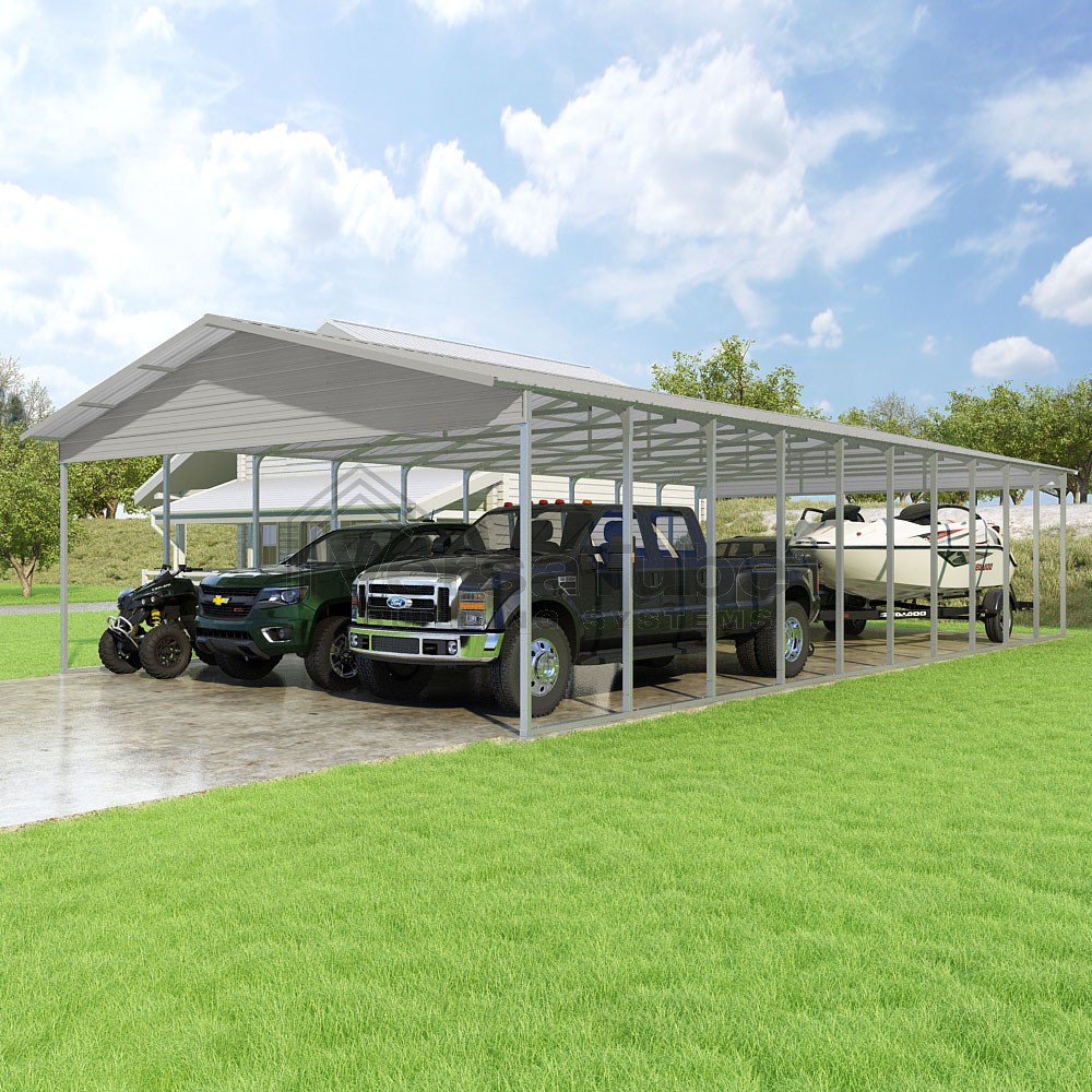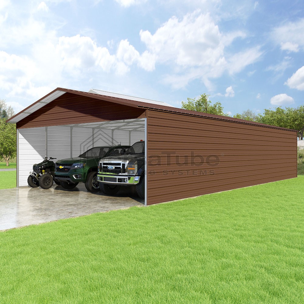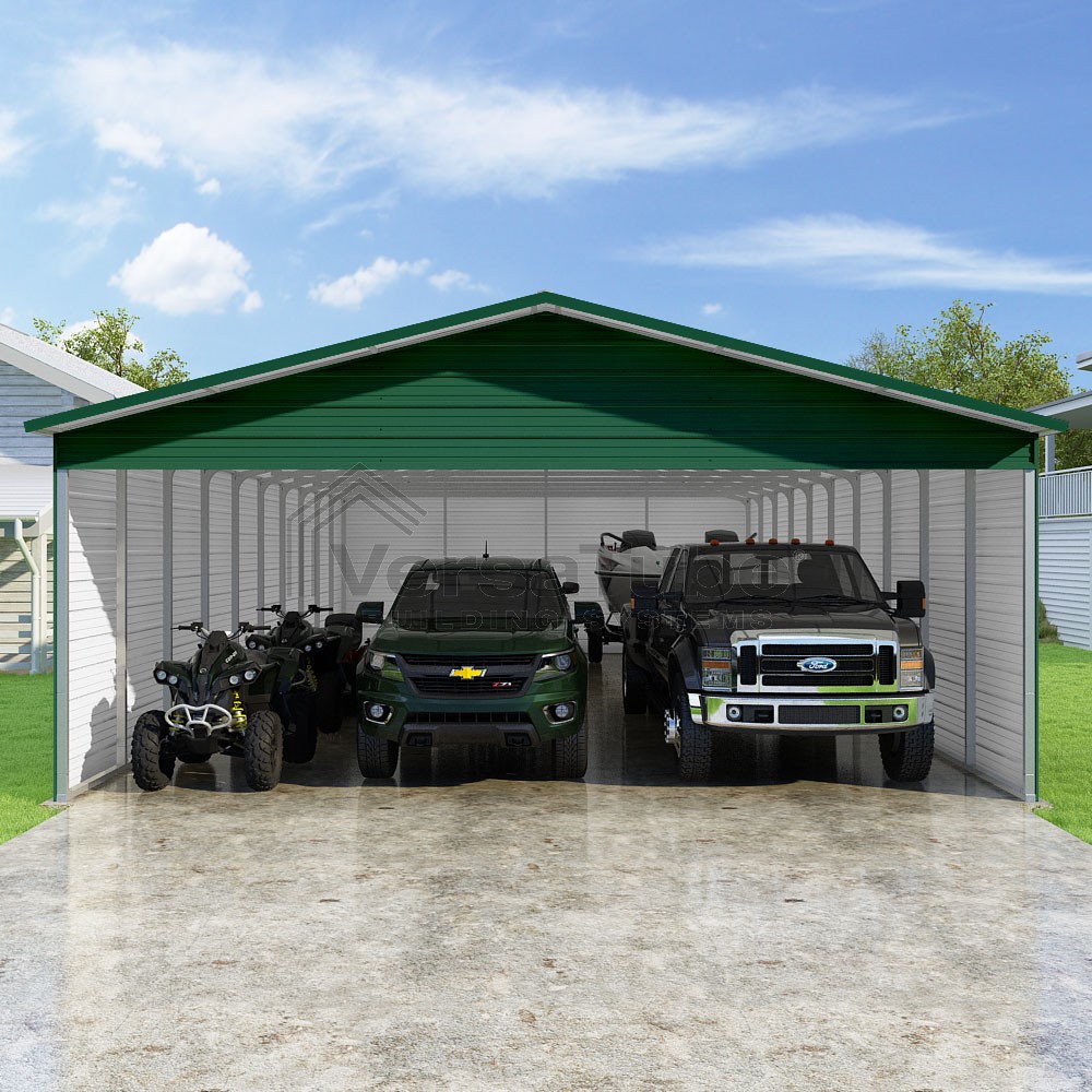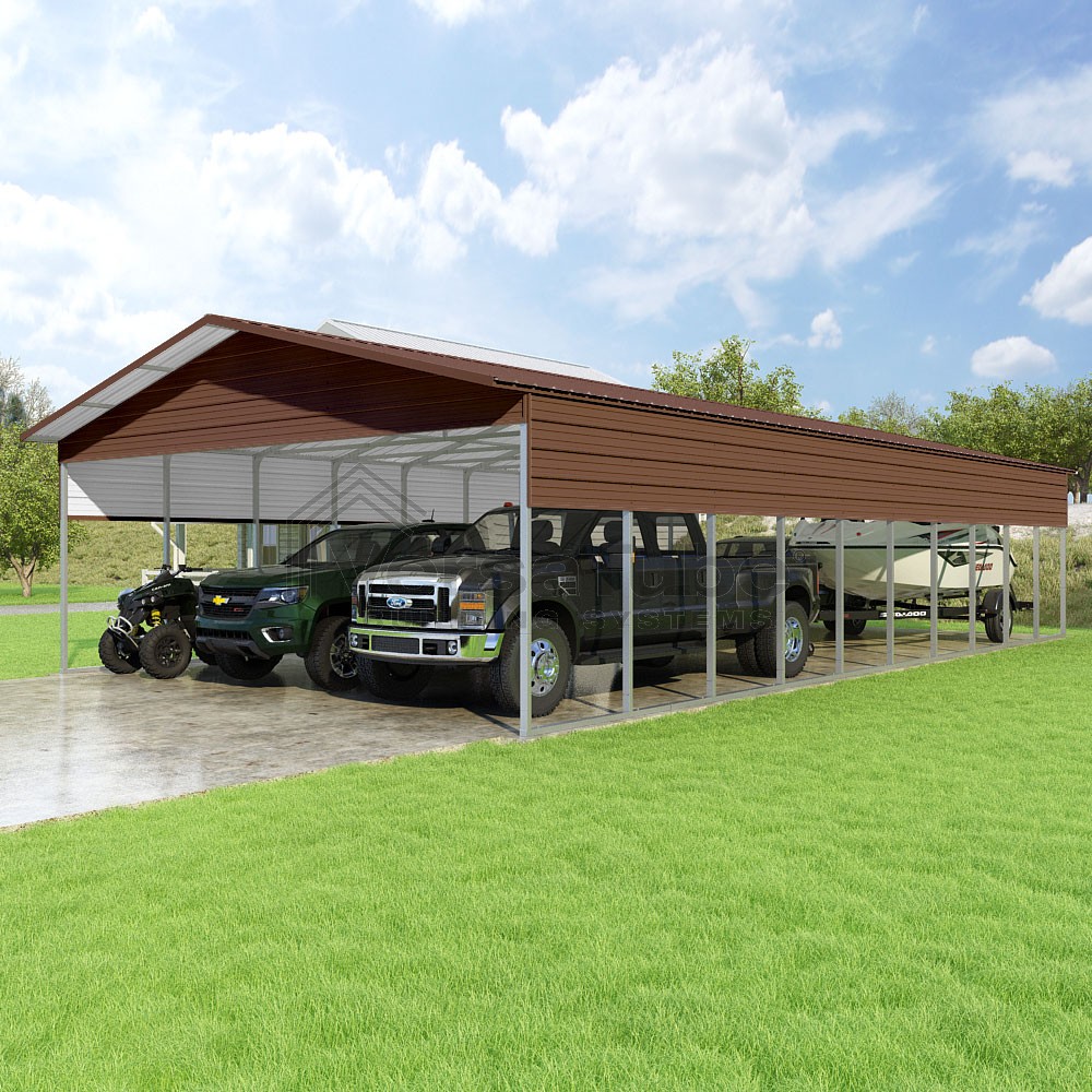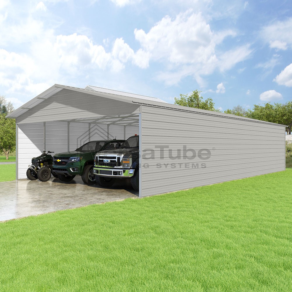 Pinnacle Series DIY carport kit features vertical sheet metal roof panels with ridge cap, gable and eave trim for an A-frame roof style and extended coverage on both ends.