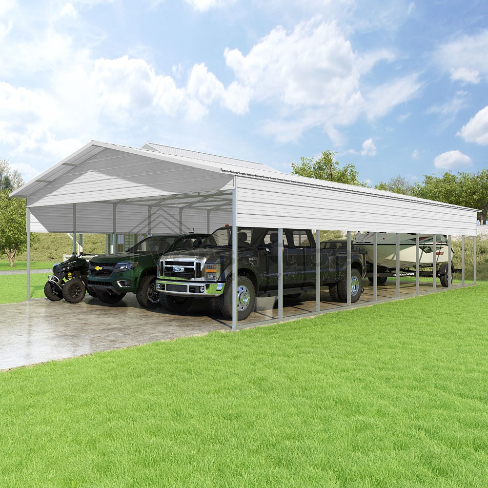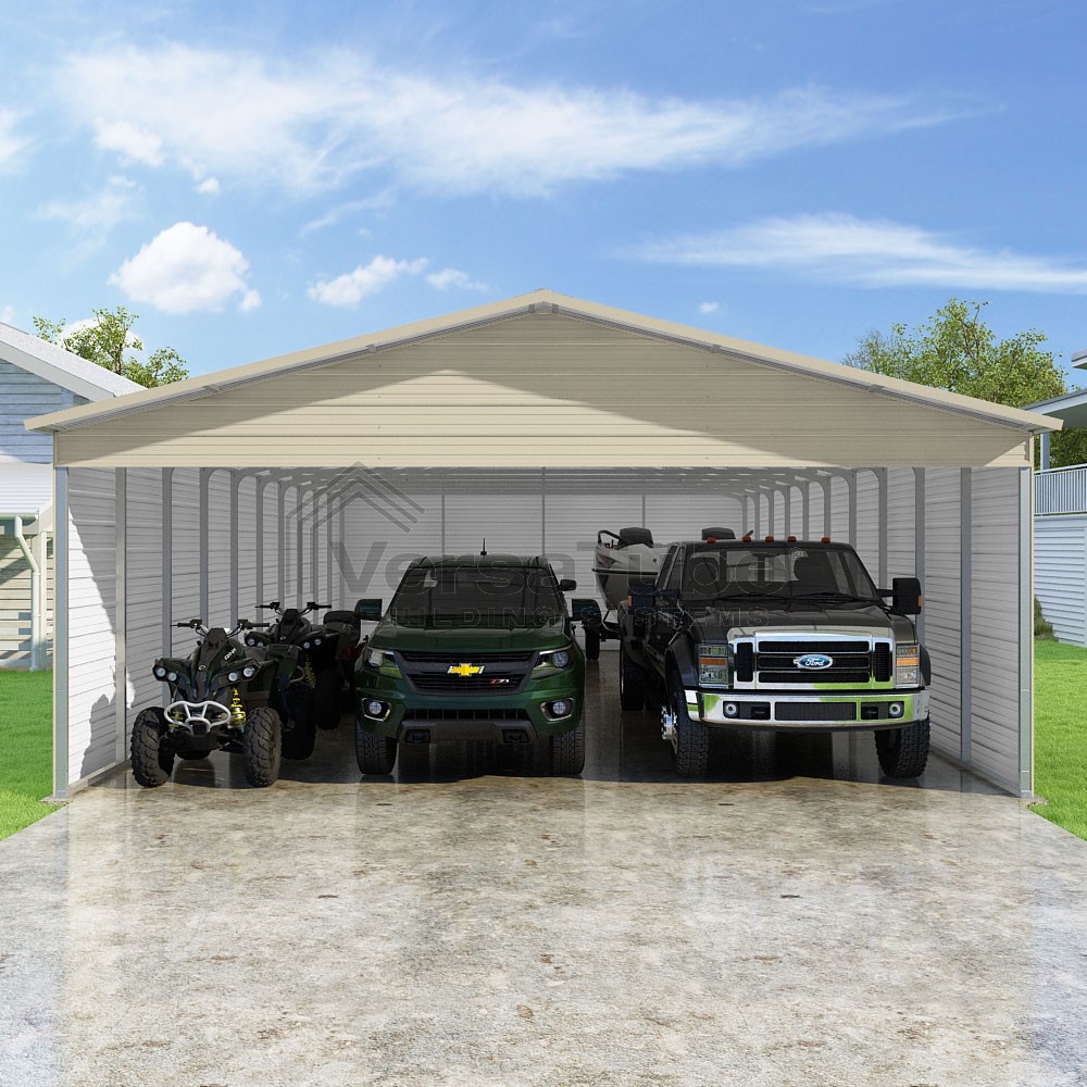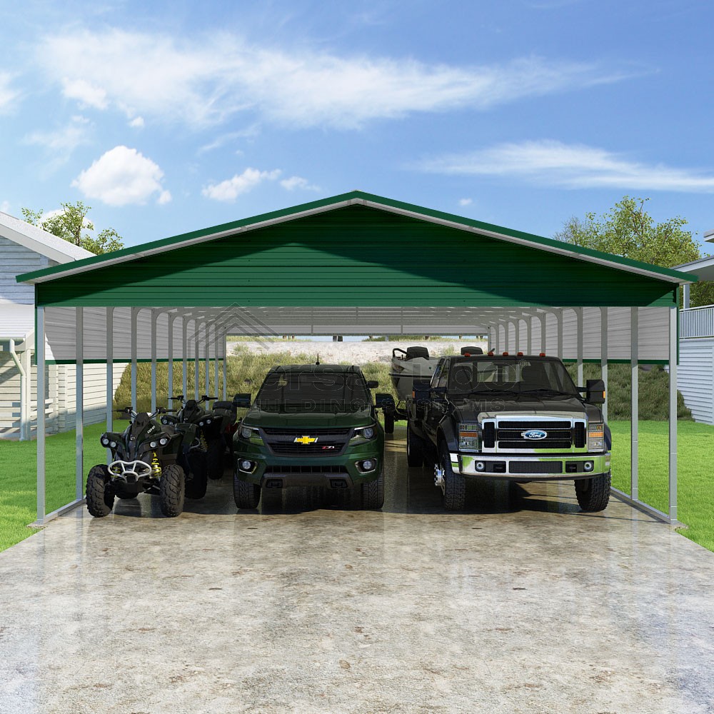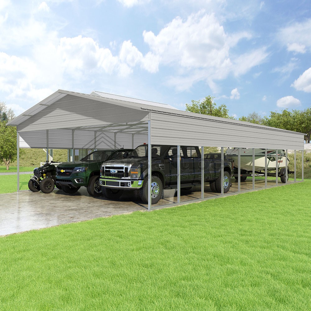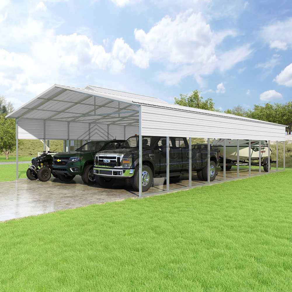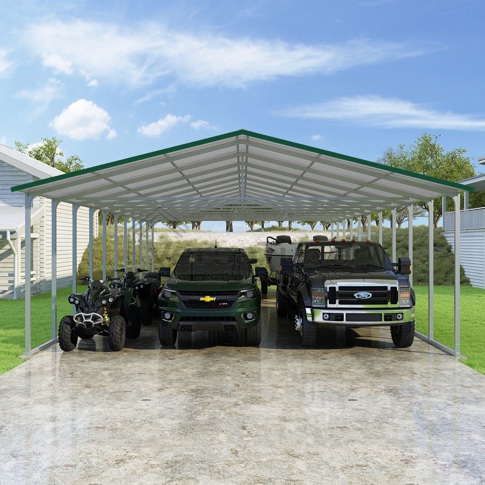 Pinnacle Series DIY carport kit features vertical sheet metal roof panels with ridge cap, gable and eave trim for an A-frame roof style and extended coverage on both ends.
