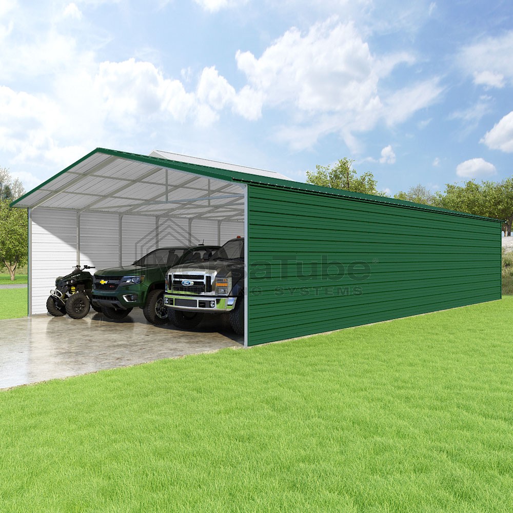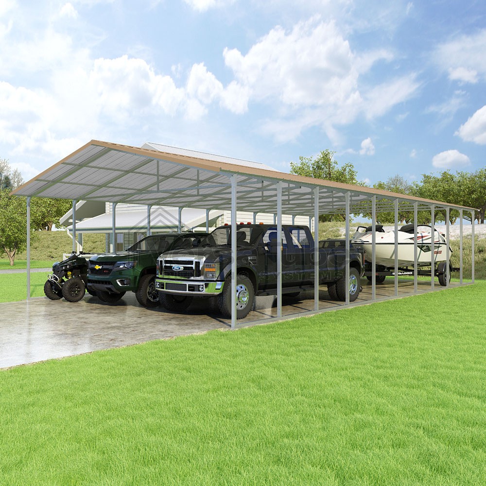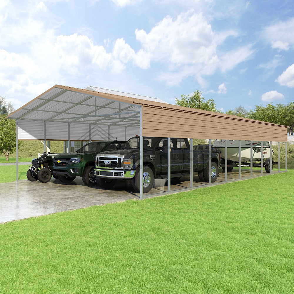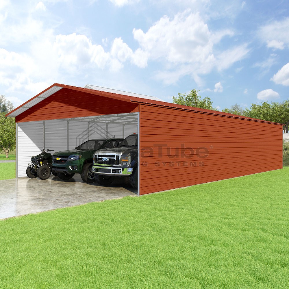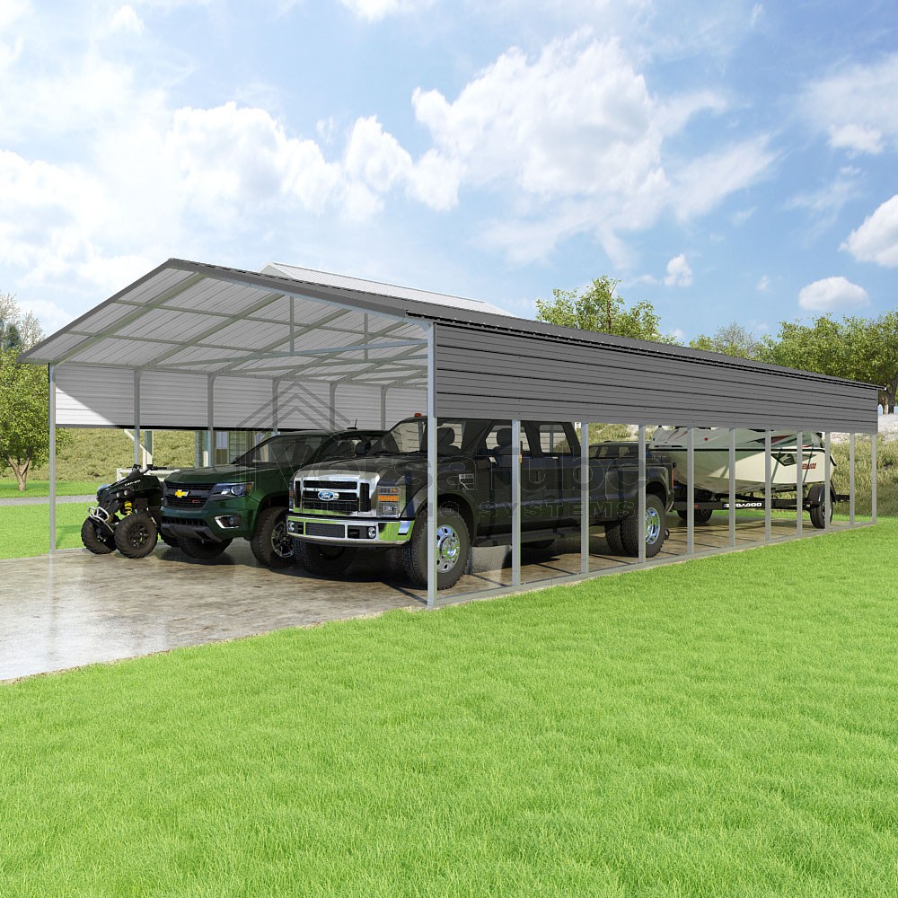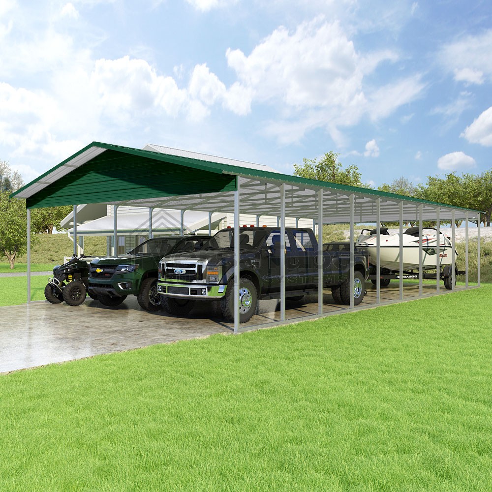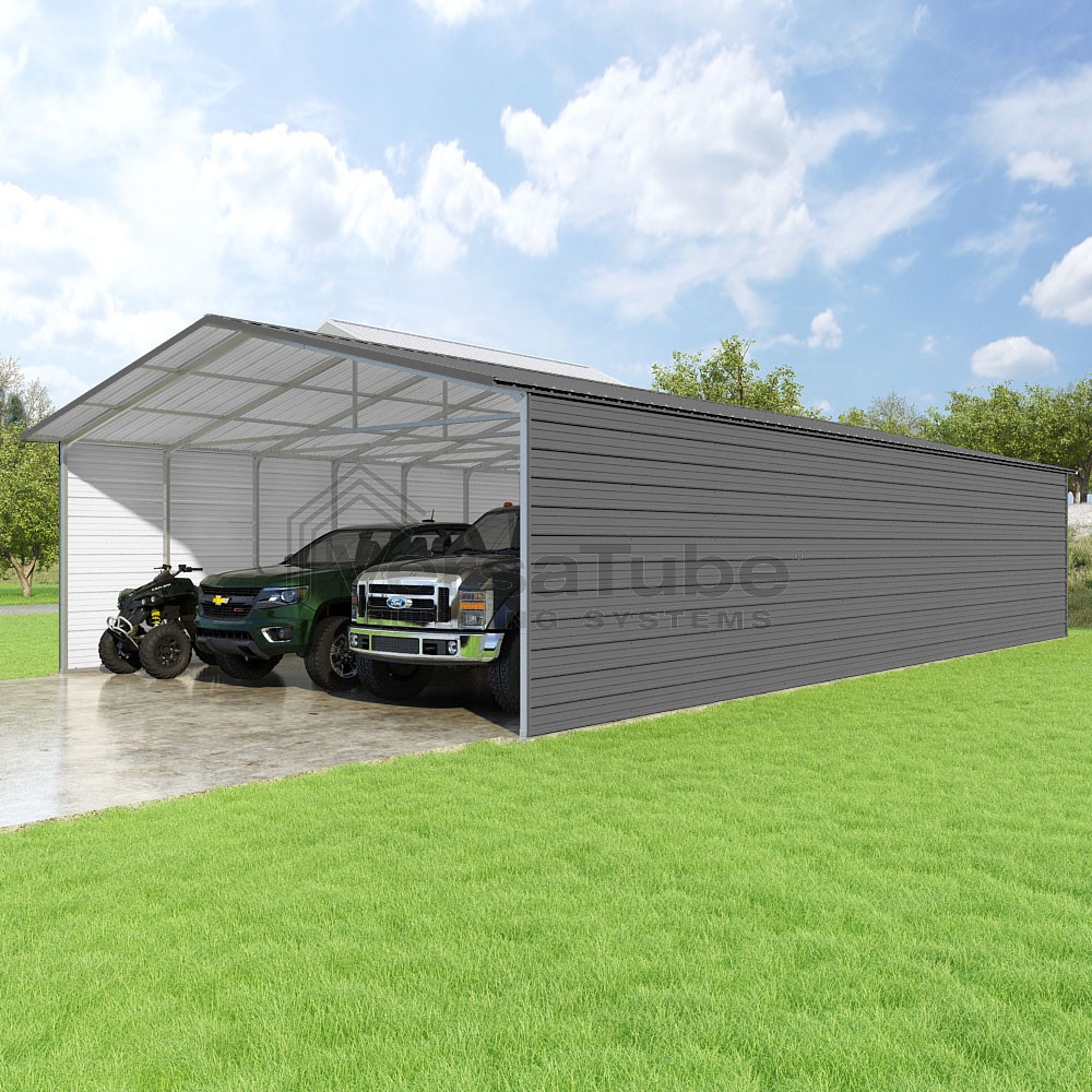 Pinnacle Series DIY carport kit features vertical sheet metal roof panels with ridge cap, gable and eave trim for an A-frame roof style and extended coverage on both ends.