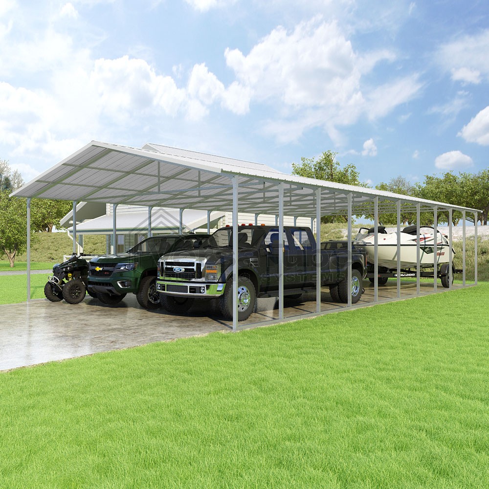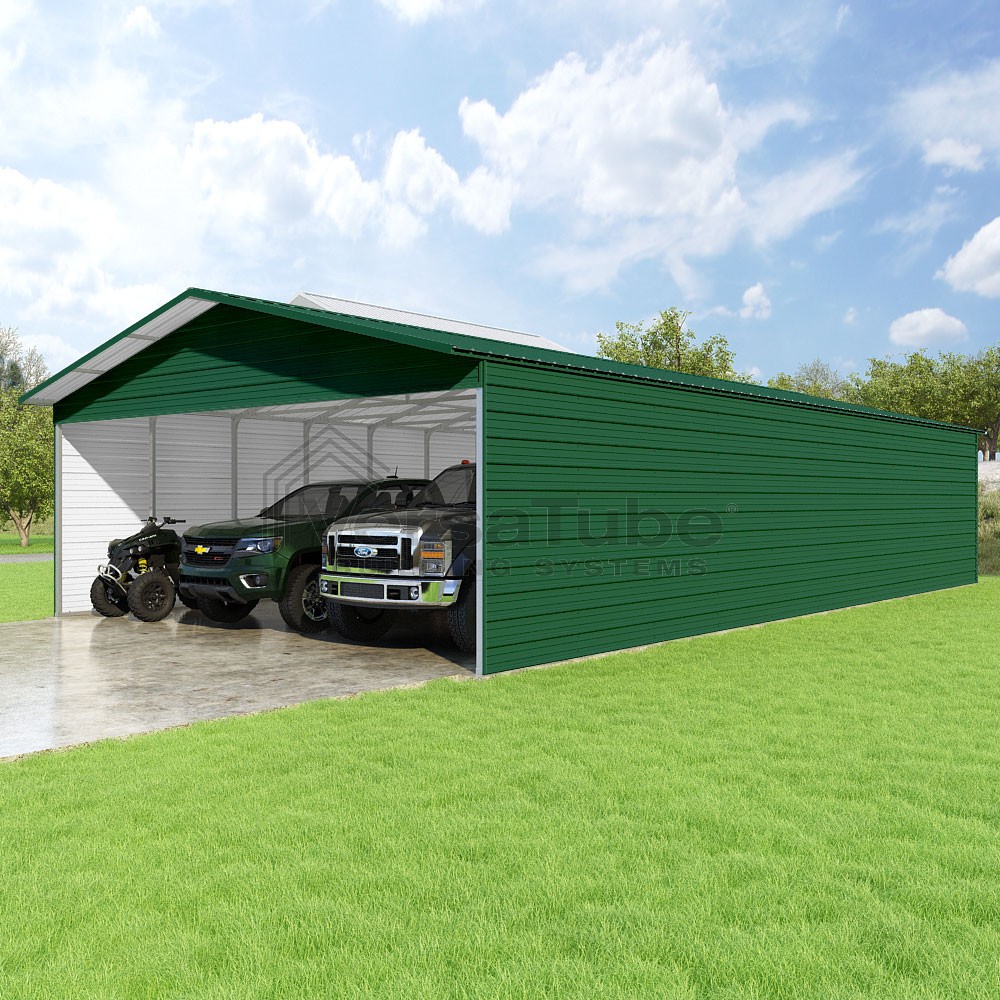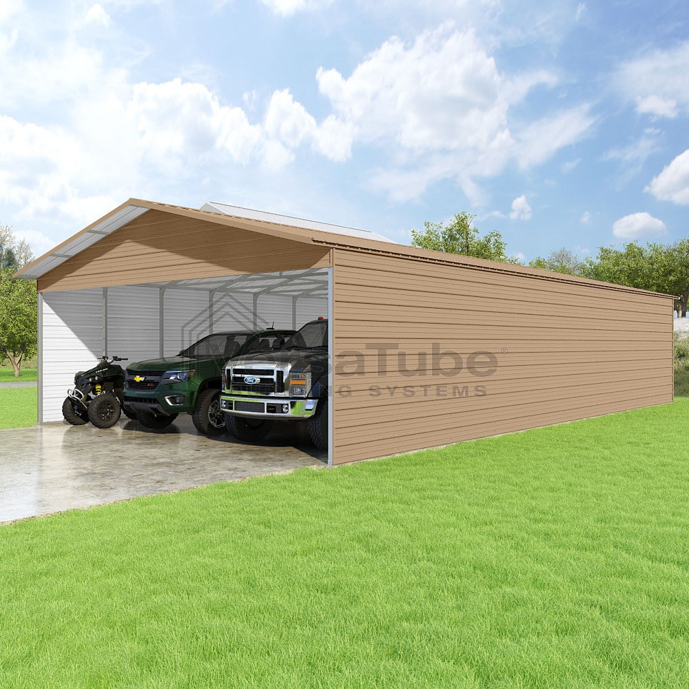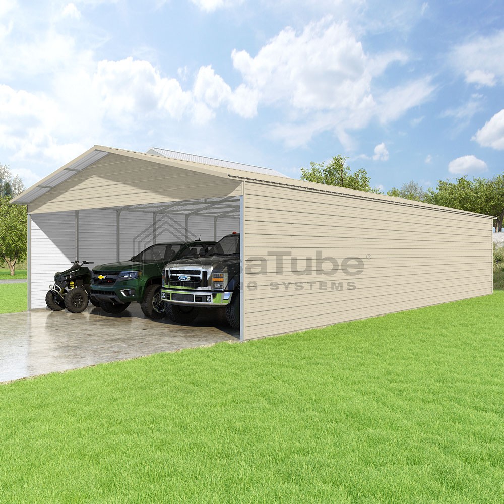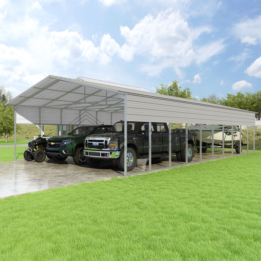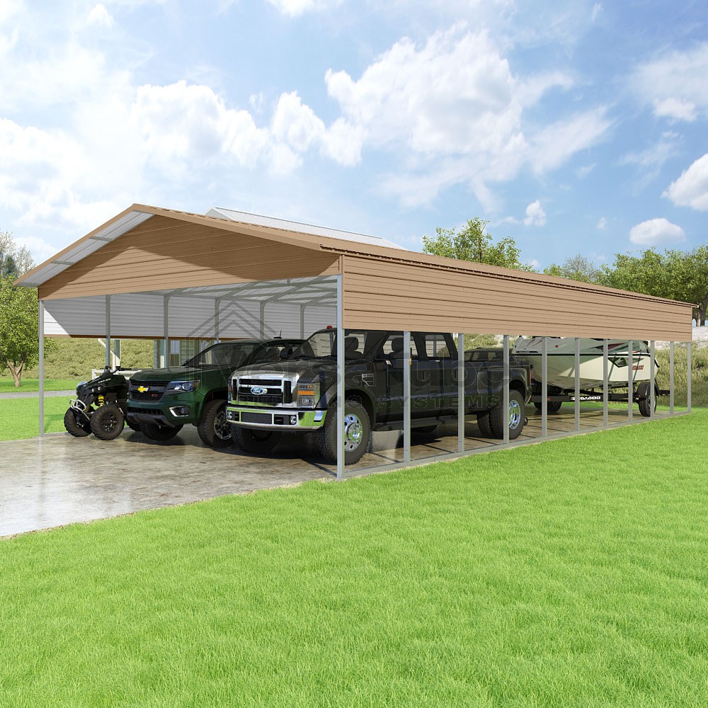Pinnacle Series DIY carport kit features vertical sheet metal roof panels with ridge cap, gable and eave trim for an A-frame roof style and extended coverage on both ends.