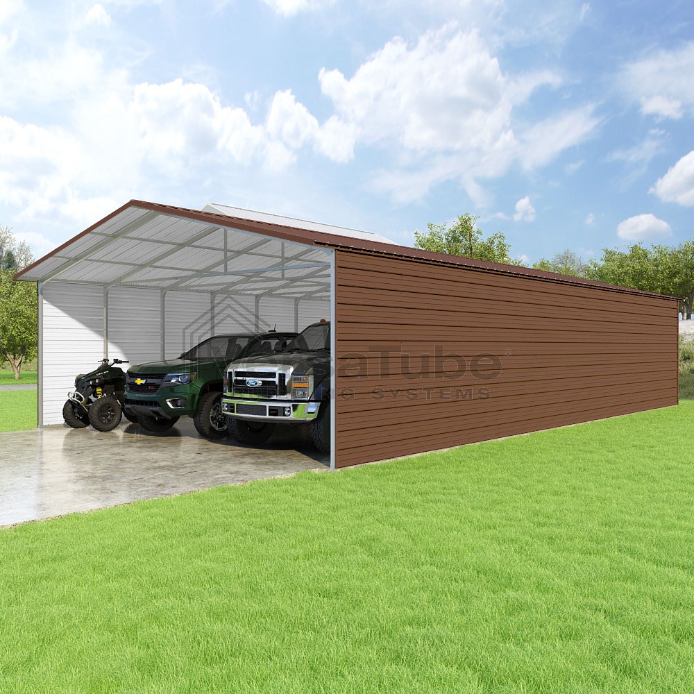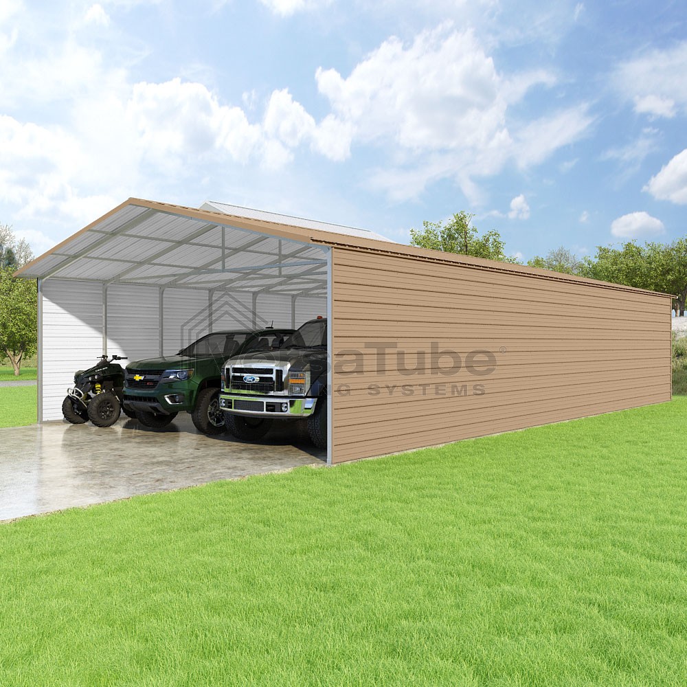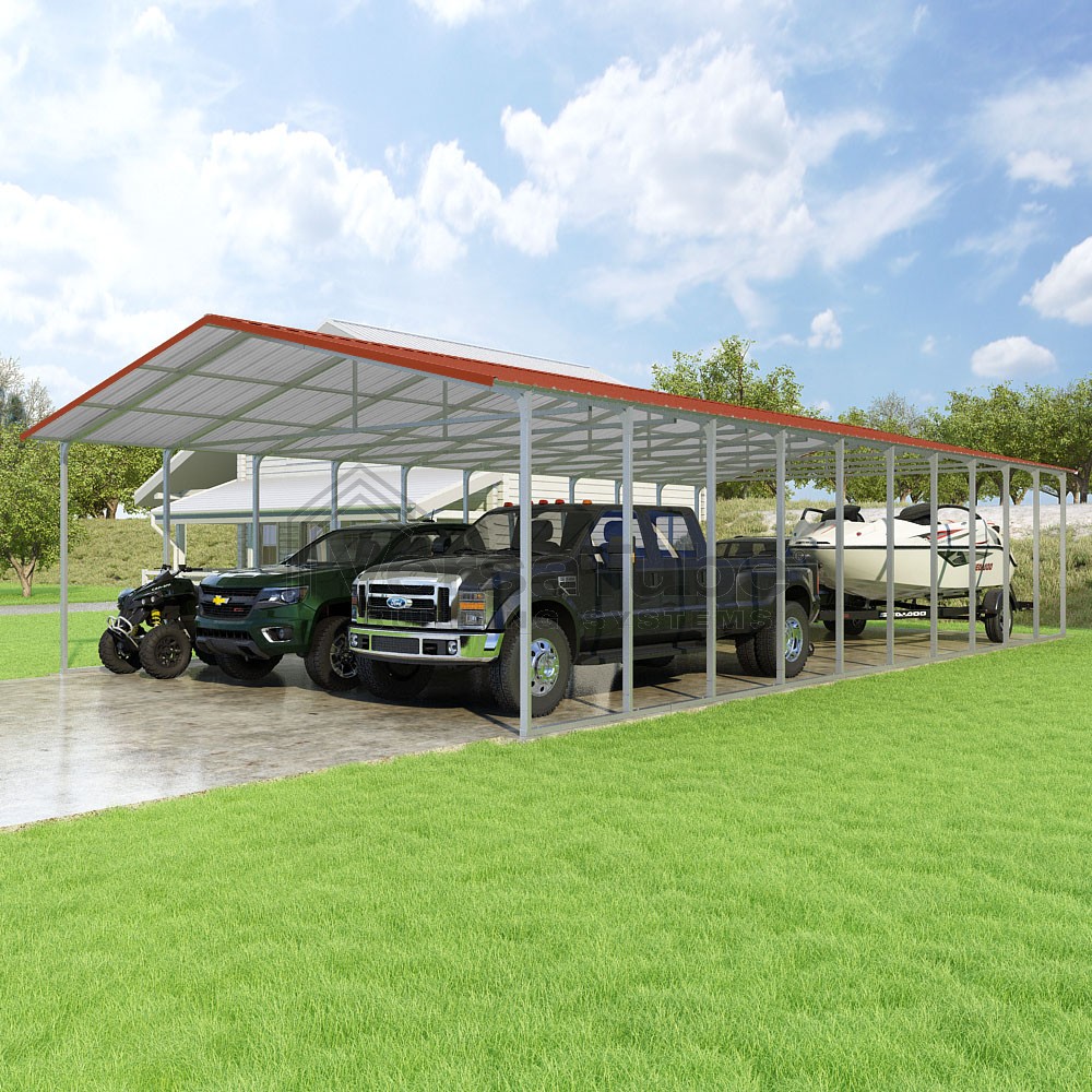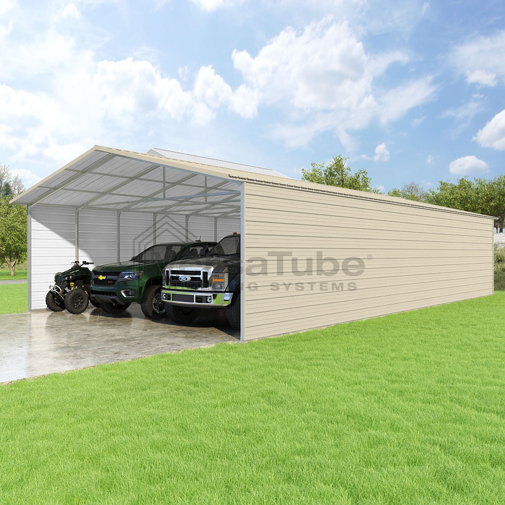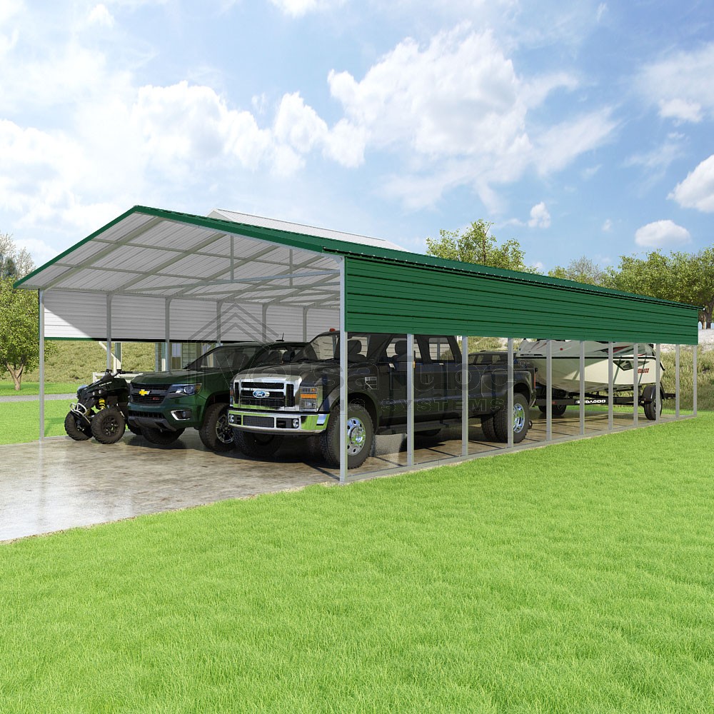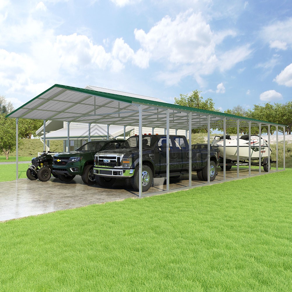 Pinnacle Series DIY carport kit features vertical sheet metal roof panels with ridge cap, gable and eave trim for an A-frame roof style and extended coverage on both ends.